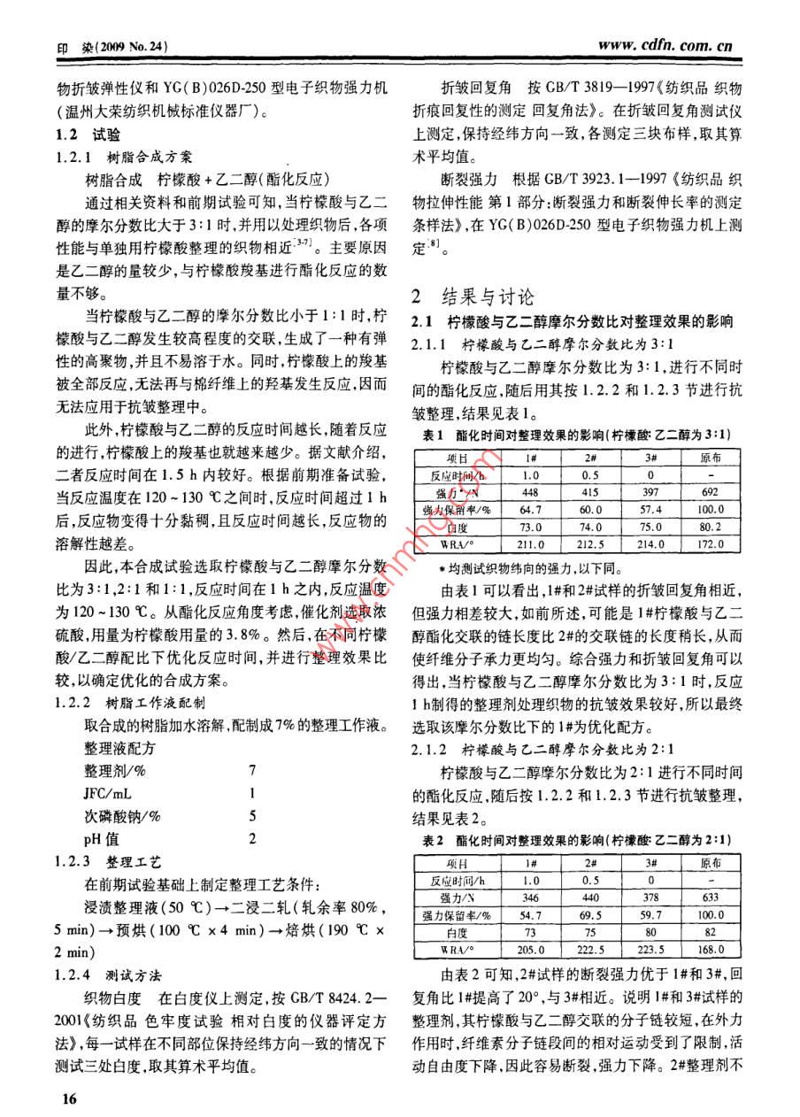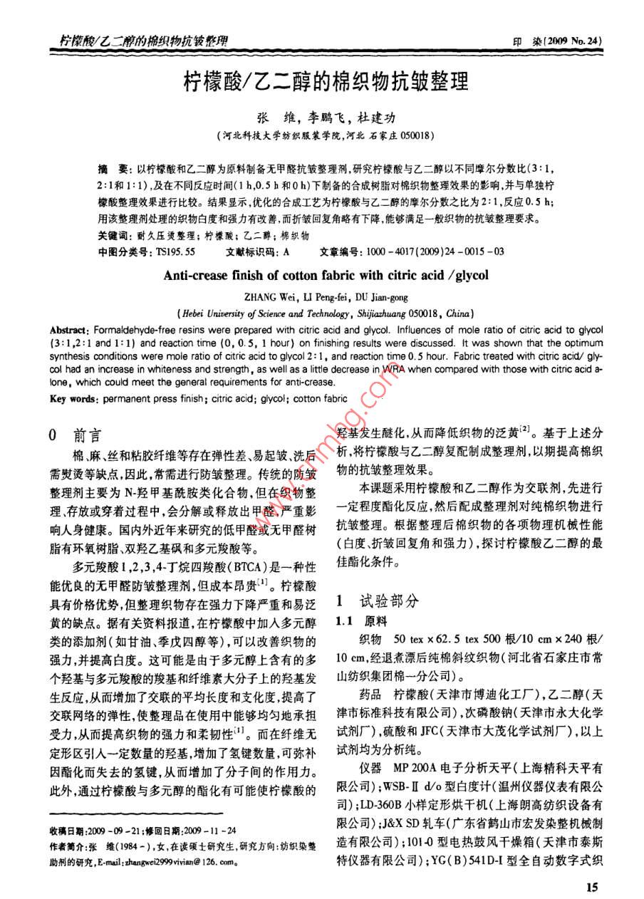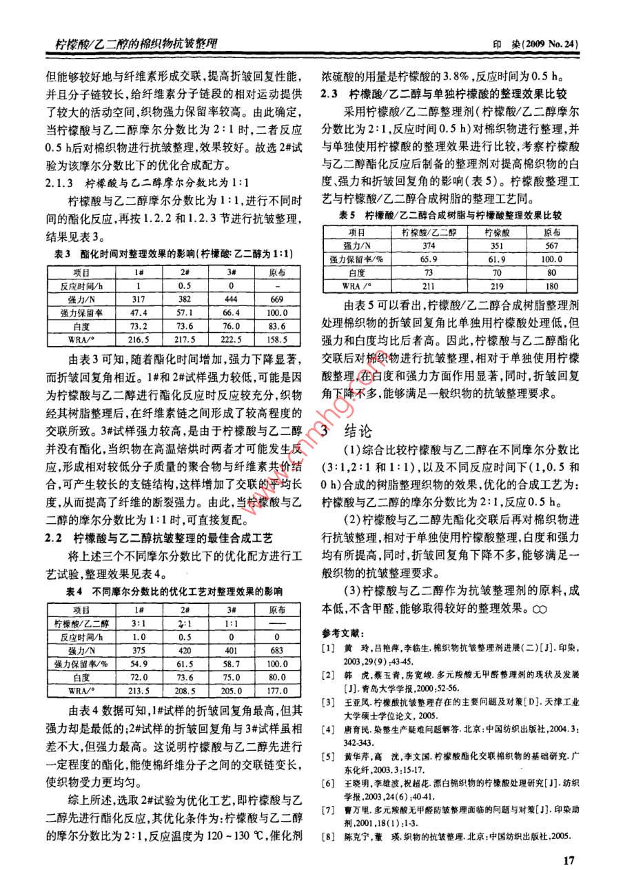 檸檬酸/乙二醇的棉織物抗皺整理