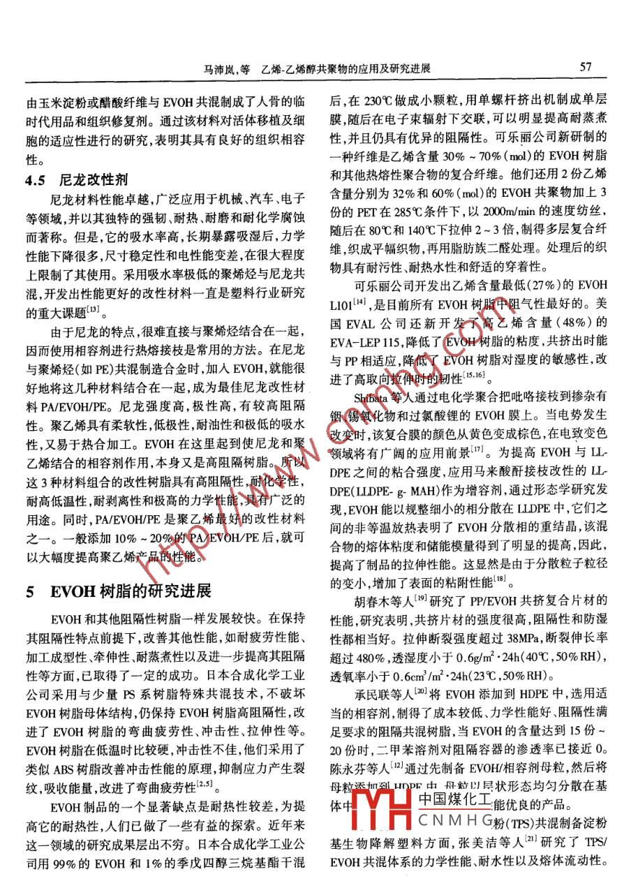 塑料科技No3(Sum. 167)54PLASTICS SCI. & TECHNOLOGYJune 2005文章編號: 105-3360200300505乙烯~乙烯醇共聚物的應(yīng)用及研究進展馬沛嵐' ,苑會林(1.蘭州石化公司石油化工研究院,甘肅蘭州730060;2.北京化工大學(xué)材料科學(xué)與工程學(xué)院,北京100029)摘要:綜述了EVOH樹脂的制備、性質(zhì)成型加工方法,總結(jié)了EVOH樹脂的主要用途和研究開發(fā)動向,介紹了該樹脂的國內(nèi)發(fā)展趨勢。關(guān)鍵詞: EVOH;制 備方法;加工;應(yīng)用中圖分類號: TQ325.12文獻標識碼: A乙烯~乙烯醇共聚物(EV0H)是由乙烯=醋酸乙烯研究所已開發(fā)成功了EVOH薄膜,確定了制備EVOH共聚物經(jīng)皂化或部分皂化反應(yīng)而得的醇解產(chǎn)物,其比薄膜的最佳工藝和配方。通過涂布或共擠制成的例通常為20%~40%的乙烯,60%~80%的乙烯醇,可EVOH復(fù)合膜已應(yīng)用于食品包裝4。江西阿特斯化工以看成是聚乙烯醇(PVA)的改性物,其生產(chǎn)工藝流程有限公司也能提供適合我國國情的EVOH薄膜產(chǎn)品,與PVA相似。它與聚偏二氯乙烯(PVDC)和聚酰胺可用于鮮奶、肉類包裝等。江蘇省昆山市華億塑料有(PA)并稱為三大阻隔材料,是-一種集乙烯聚合物的加限公司則獨家代理進口EVOH樹脂。國內(nèi)目前尚無廠工性和乙烯醇聚合物的氣體阻隔性于-體的新型高分家工業(yè)化生產(chǎn)EVOH樹脂,所需EVOH樹脂基本靠進子合成材料([.2]??凇5胁簧購S家已具備了加工EVOH樹脂的能力。EVOH是高度結(jié)晶體,它的性質(zhì)主要取決于其共聚單體的相對濃度。一般來講,當(dāng)乙烯含量增加時,氣1EVOH樹脂的制備體阻隔性下降,防潮性能改進,樹脂更易于加工。工業(yè)生產(chǎn)EVOH樹脂可分為聚合、醇解兩步15.6)。EVOH最顯著的特點是它對氣體的阻隔作用,可以有在4MPa - 5MPa的壓力下,以叔丁醇作溶劑,乙烯和醋效地阻止氧氣、二氧化碳和其他氣體的滲透。EVOH酸乙烯發(fā)生自由基共聚反應(yīng),生成乙烯_醋酸乙烯共聚除具有極好的加工性和對氣味、溶劑等超常的阻隔性物(EVA)。然后以甲醇為溶劑,強堿為催化劑,醇解得外,還有透明性、光澤性、伸縮性、耐磨性和耐候性好、到EVOH。機械強度高等特點。EVOH薄膜具有高光澤和低濁在制備EVOH樹脂過程中,乙烯含量應(yīng)控制在度,因而高度透明。EVOH是阻隔性樹脂中熱穩(wěn)定性25% ~ 45% (mol)為宜。若乙烯含量大于50% (mol), .最高的,廢料可以再生和再利用5)。20世紀50年代,美國杜邦公司首次通過共聚、醇EVOH不再是阻隔性樹脂;當(dāng)乙烯含量低于20%解反應(yīng)得到了EVOH。 1972 年,日本可樂麗公司最早(mol),EVOH中親水基團的比例增加,由于吸濕性增實現(xiàn)了EVOH樹脂的工業(yè)化生產(chǎn)。目前全球僅有兩家加,降低了阻隔性,透氧系數(shù)也急劇增加。公司生產(chǎn)EVOH樹脂一日本可樂麗公司 和日本合成2 EVOH 樹脂的性能化學(xué)公司,產(chǎn)品牌號分別為Eval 和Soamol。在國內(nèi),中國林業(yè)科學(xué)研究院下屬林產(chǎn)化學(xué)工業(yè)EVqH作為高陽隔件材料,和LDPE、LLDPE、PP、中國煤化工作者簡介:馬沛嵐(1969-),男,甘肅通渭縣人,工程師,主要YHCNMHG從事聚合物加工改性工作,已發(fā)表論文10余篇。收稿日期: 20-11-23馬沛嵐,等乙烯乙烯醇共聚 物的應(yīng)用及研究進展55PA等樹脂用共擠出工藝制成復(fù)合薄膜或片材,然后再材料相比要低,但比PE、PP等非極性材料要高的多。做成包裝袋或杯、盤等容器,也可以吹制成多層復(fù)合因此在包裝EVOH樹脂時要注意密封,未拆封的顆粒瓶、桶。EVOH作為阻隔性包裝容器的主要性能如樹脂保存期為一.年,而拆封放置的顆粒樹脂有效期為下[7-9]:24h~ 48h。表2為各種塑料薄膜的透濕性比較。(1)防透氣性既能有效地防止氧氣等不利于包表2_各種塑料薄膜的透濕性裝物的氣體的透人,又能防止充氣包裝內(nèi)氮氣、二氧化薄膜名稱透濕度碳等保護氣體的逸出。表1為各種塑料薄膜的氧透過EVOH-F5率。EVOH-E19擠出PVDC3表1各種塑料薄膜的氧透過率雙向拉伸PP氧氣透過率(m.20pn/um2 .24h. atm)HDPE薄膜類型C209C23C35CLDPE15EVOH-F型0.030.150.2雙向拉伸PET1SEVOH- E型0.311.1.8硬質(zhì)PVC40擠出型PVDC0.742..2112雙向拉伸尼龍6.7283365134未延伸尼龍600雙向拉伸聚酯4(461024020037290032003 EVOH 樹脂的加工1000109003.1加工方法(2)耐油、耐有機溶劑性可 以阻止油類、有機溶制備EVOH時,含水量小于0.3% (mol)。若在貯劑的滲透,所以適用于油性食品、食油、礦物油、農(nóng)藥以存和運輸中與水接觸,含水量超過0.3% (mol) ,應(yīng)在真及包括有機溶劑在內(nèi)的藥品類的包裝??諚l件下(666.61Pa,不大于80C)干燥,為避免水蒸汽(3)非帶電性因為它 是帶電(靜電)性小的樹脂,冷凝在粒子上,要確保打開包前,樹脂溫度大于或等于如果用于表層就能防止灰塵等的附著。周圍環(huán)境溫度'5)。(4)易印刷由 于它帶有羥基,所以不用特別的表在復(fù)合材料中,使用EVOH做阻隔層有3種基本面處理,就能進行良好的印刷。方法:通過EVOH樹脂與聚烯烴或聚酰胺共混而形成(5)耐候性即使長期暴露 于室外,也不會發(fā)生變的結(jié)構(gòu);EVOH薄膜層復(fù)合到其他基質(zhì)上或?qū)⑵渌锷蜃铓庑越档同F(xiàn)象。力學(xué)性能的變化也很小,具有質(zhì)涂覆到EVOH薄膜上;用EVOH樹脂涂覆各種基質(zhì)良好的耐候性?;蚨鄬尤萜?。(6)光澤度和透明性如果用于外層 ,能使容器外上述3種方法均可在普通設(shè)備上進行加工,而不觀光澤;