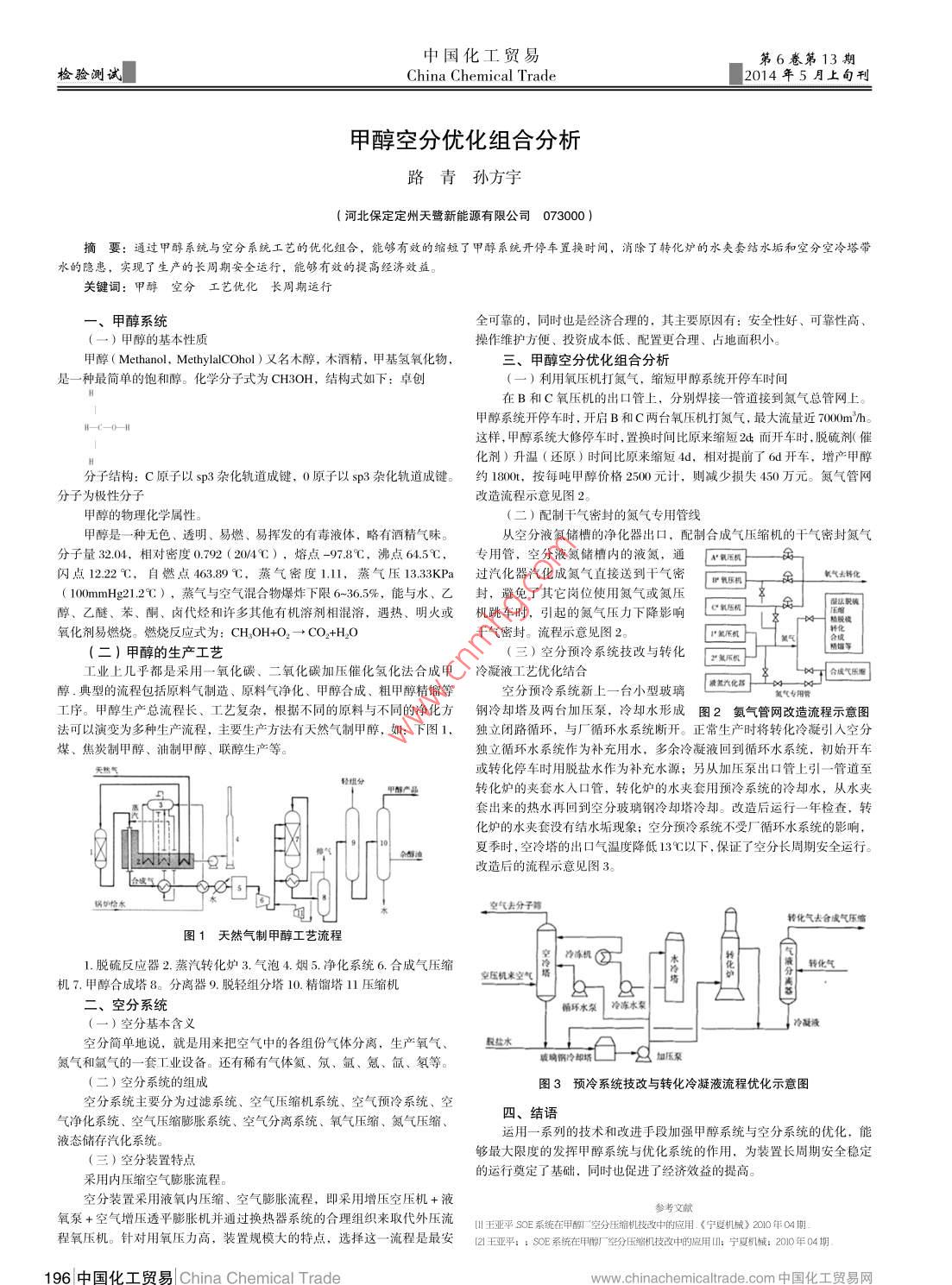 中國(guó)化工貿(mào)易笫6卷第13期檢驗(yàn)測(cè)試China chemical trade2014年5月上甸刊甲醇空分優(yōu)化組合分析路青孫方宇河北保定定州天鷺新能源有限公司073000)摘要:通過(guò)甲醇系統(tǒng)與空分系統(tǒng)工藝的優(yōu)侻組合,能夠有效的縮短了甲醇系統(tǒng)開(kāi)停車(chē)置換時(shí)間,消除了轉(zhuǎn)化爐的水夾套結(jié)水垢和空分空冷塔帶水的隱患,實(shí)現(xiàn)了生產(chǎn)的長(zhǎng)周期安全運(yùn)行,能夠有效的提高經(jīng)濟(jì)效益關(guān)鍵詞:甲醇空分工藝優(yōu)化長(zhǎng)周期運(yùn)行甲醇系統(tǒng)全可靠的,同時(shí)也是經(jīng)濟(jì)合理的,其主要原因有:安全性好、可靠性高(→)甲醇的基本性質(zhì)操作維護(hù)方便、投資成本低、配置更合理、占地面積小甲醇( Methanol, MethylalCOhol)又名木醇,木酒精,甲基氫氧化物三、甲醇空分優(yōu)化組合分析是一種最簡(jiǎn)單的飽和醇。化學(xué)分子式為CH3OH,結(jié)構(gòu)式如下:卓創(chuàng))利用氧壓機(jī)打氮?dú)?縮短甲醇系統(tǒng)開(kāi)停車(chē)時(shí)間在B和C氧壓機(jī)的出口管上,分別焊接一管道接到氮?dú)饪偣芫W(wǎng)上。HC-0-1甲醇系統(tǒng)開(kāi)停車(chē)時(shí),開(kāi)啟B和C兩臺(tái)氧壓機(jī)打氮?dú)?最大流量近70m/h這樣,甲醇系統(tǒng)大修停車(chē)時(shí),置換時(shí)間比原來(lái)縮短2而開(kāi)車(chē)時(shí),脫硫劑(催化劑)升溫(還原)時(shí)間比原來(lái)縮短4d,相對(duì)提前了d開(kāi)車(chē),增產(chǎn)甲醇分子結(jié)構(gòu):C原子以sp3雜化軌道成鍵,原子以sp3雜化軌道成鍵。約 1800t,按每噸甲醇價(jià)格2500元計(jì),則減少損失450萬(wàn)元。氮?dú)夤芫W(wǎng)分子為極性分子改造流程示意見(jiàn)圖2。甲醇的物理化學(xué)屬性。(二)配制干氣密封的氮?dú)鈱?zhuān)用管線甲醇是一種無(wú)色、透明、易燃、易揮發(fā)的有毒液體,略有酒精氣味。從空分液氮儲(chǔ)槽的凈化器出口,配制合成氣壓縮機(jī)的干氣密封氮?dú)夥肿恿?2.0,相對(duì)密度0.τ92(204℃),熔點(diǎn)-978℃,沸點(diǎn)645℃,專(zhuān)用管,空分液氮儲(chǔ)槽內(nèi)的液氮,通A·氧上抗閃點(diǎn)122℃,自燃點(diǎn)46389℃,蒸氣密度1.11,蒸氣壓13.33KPa過(guò)汽化器汽化成氮?dú)庵苯铀偷礁蓺饷苎鯕馊マD(zhuǎn)化P壓機(jī)1 Mmhg21.2℃),蒸氣與空氣混合物爆炸下限6-36.5%,能與水、乙封,避免了其它崗位使用氮?dú)饣虻獕簼穹ù?、乙醚、苯、酮、鹵代烴和許多其他有機(jī)溶劑相混溶,遇熱、明火或機(jī)跳車(chē)時(shí),引起的氮?dú)鈮毫ο陆涤绊慬C壓精脫硫氧化劑易燃燒。燃燒反應(yīng)式為:CHOH+O2→CO2+HO千氣密封。流程示意見(jiàn)圖2氮壓(二)甲醇的生產(chǎn)工藝(三)空分預(yù)冷系統(tǒng)技改與轉(zhuǎn)化工業(yè)上幾乎都是采用一氧化碳、二氧化碳加壓催化氫化法合成甲冷凝液工藝優(yōu)化結(jié)合醇.典型的流程包括原料氣制造、原料氣凈化、甲醇合成、粗甲醇精餾等空分預(yù)冷系統(tǒng)新上一臺(tái)小型玻璃液置汽化器氮?dú)鈱?zhuān)用管工序。甲醇生產(chǎn)總流程長(zhǎng)、工藝復(fù)雜,根據(jù)不同的原料與不同的凈化方鋼冷卻塔及兩臺(tái)加壓泵,冷卻水形成圖2氫氣管網(wǎng)改造流程示意圖法可以演變?yōu)槎喾N生產(chǎn)流程,主要生產(chǎn)方法有天然氣制甲醇,如:下圖1,獨(dú)立閉路循環(huán),與廠循環(huán)水系統(tǒng)斷開(kāi)。正常生產(chǎn)時(shí)將轉(zhuǎn)化冷凝引入空分煤、焦炭制甲醇、油制甲醇、聯(lián)醇生產(chǎn)等。獨(dú)立循環(huán)水系統(tǒng)作為補(bǔ)充用水,多余冷凝液回到循環(huán)水系統(tǒng),初始開(kāi)車(chē)天然氣或轉(zhuǎn)化停車(chē)時(shí)用脫鹽水作為補(bǔ)充水源;另從加壓泵出口管上引一管道至甲醇產(chǎn)品轉(zhuǎn)化爐的夾套水入口管,轉(zhuǎn)化爐的水夾套用預(yù)冷系統(tǒng)的冷卻水,從水夾套出來(lái)的熱水再回到空分玻璃鋼冷卻塔冷卻。改造后運(yùn)行一年檢查,轉(zhuǎn)化爐的水夾套沒(méi)有結(jié)水垢現(xiàn)象;空分預(yù)冷系統(tǒng)不受廠循環(huán)水系統(tǒng)的影響g雜醇油夏季時(shí),空冷塔的出口氣溫度降低13℃以下,保證了空分長(zhǎng)周期安全運(yùn)行改造后的流程示意見(jiàn)圖3感氣空氣去分子等轉(zhuǎn)化氣去合成氣壓圖1天然氣制甲醇工藝流程車(chē)機(jī)1.脫硫反應(yīng)器2.蒸汽轉(zhuǎn)化爐3.氣泡4.煙5.凈化系統(tǒng)6.合成氣壓縮轉(zhuǎn)化氣空壓機(jī)來(lái)空氣塔機(jī)7.甲醇合成塔8。分離器9.脫輕組分塔10.精餾塔11壓縮機(jī)二、空分系統(tǒng)環(huán)水泵冷凍水)空分基本含義空分簡(jiǎn)單地說(shuō),就是用來(lái)把空氣中的各組份氣體分離,生產(chǎn)氧氣R鹽水氮?dú)夂蜌鍤獾囊惶坠I(yè)設(shè)備。還有稀有氣體氦、氖、氬、氪、氙、氡等。玻璃冷卻壞加壓泵(二)空分系統(tǒng)的組成圖3預(yù)冷系統(tǒng)技改與轉(zhuǎn)化冷凝液流程優(yōu)化示意圖空分系統(tǒng)主要分為過(guò)濾系統(tǒng)、空氣壓縮機(jī)系統(tǒng)、空氣預(yù)冷系統(tǒng)、空氣凈化系統(tǒng)、空氣壓縮膨脹系統(tǒng)、空氣分離系統(tǒng)、氧氣壓縮、氮?dú)鈮嚎s、四、結(jié)語(yǔ)液態(tài)儲(chǔ)存汽化系統(tǒng)。運(yùn)用一系列的技術(shù)和改進(jìn)手段加強(qiáng)甲醇系統(tǒng)與空分系統(tǒng)的優(yōu)化,能(三)空分裝置特點(diǎn)夠最