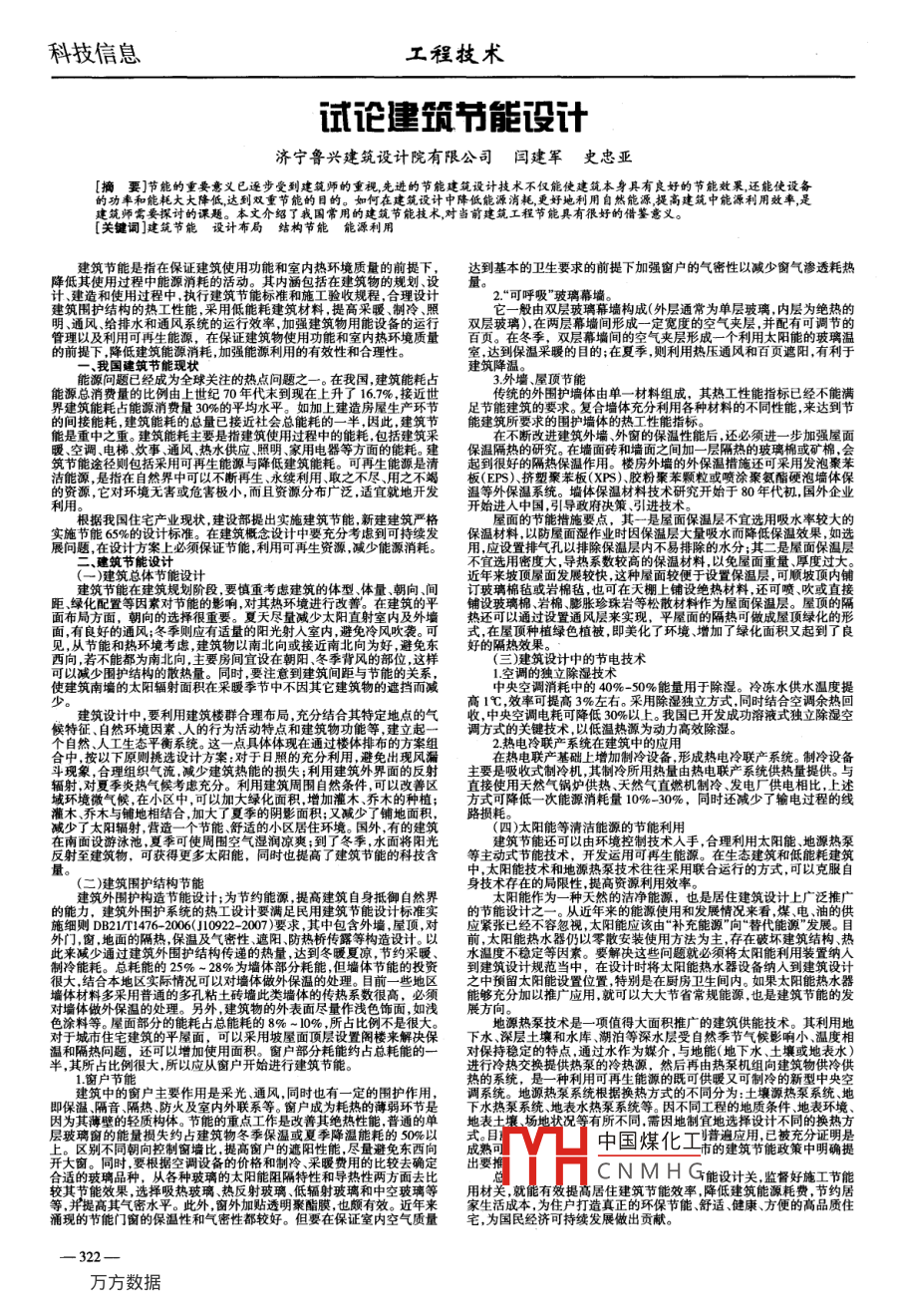 科技信息工程技術(shù)試論建節(jié)能設(shè)計(jì)濟(jì)寧魯興建筑設(shè)計(jì)院有限公司閆建軍史忠亞[摘要]節(jié)能的重要意義已逐步受到建筑師的重視先進(jìn)的節(jié)能建筑設(shè)計(jì)技術(shù)不僅能使建筑本身具有良好的節(jié)能效果,還能使設(shè)備的功率和能耗大大降低達(dá)到雙重節(jié)能的目的。如何在建筑設(shè)計(jì)中降低能源消耗更好地利用自然能源,提高建筑中能源利用效率,是建筑師需要探討的課題。本文介紹了我國常用的建筑節(jié)能技術(shù),對(duì)當(dāng)前建筑工程節(jié)能具有很好的借鑒意義鍵詞]建筑節(jié)能設(shè)計(jì)布局結(jié)構(gòu)節(jié)能能源利用建筑節(jié)能是指在保證建筑使用功能和不境質(zhì)量的前提達(dá)到基本的衛(wèi)生要求的前提下加強(qiáng)窗戶的氣密性以減少窗氣滲透耗熱降低其使用過程中能源消耗的活動(dòng)在建筑物的規(guī)劃規(guī)程,合理設(shè)計(jì)2.“可呼吸”玻璃幕墻建筑圍護(hù)結(jié)構(gòu)的熱用低能耗建般由雙層玻璃幕墻構(gòu)成(外層通常為單層玻璃,內(nèi)層為絕熱的加強(qiáng)建筑物用能設(shè)雙層玻璃),在兩層幕墻間形成再生能源,在保證建筑物使用功能和室內(nèi)熱環(huán)的前提下,降低建筑能源消耗加強(qiáng)能源利用的有效性和合理性室,達(dá)到保溫采暖的目的;在夏季熱壓通風(fēng)和百頁遮陽,有利于能源問題已經(jīng)成為全球關(guān)注的熱點(diǎn)問題之一。在我國建筑能耗占3外墻、屋頂節(jié)能能源總消費(fèi)量的比例由上世紀(jì)70年代末到現(xiàn)在上升了16.7%,接近世傳統(tǒng)的外圍護(hù)墻體由單一材料組成,其熱工性能指標(biāo)已經(jīng)不能滿建筑能耗占能源消費(fèi)量30加上建造房屋生產(chǎn)環(huán)足節(jié)能建筑的要求。復(fù)合墻體充分利用各種材料的不同性能,來達(dá)到節(jié)的間接能耗,建筑能耗的總量已接近社會(huì)總能耗的一半,因此,建筑節(jié)能建筑所要求的圍護(hù)墻體的熱之重。建要是指建筑使用過程中的能耗,包括建筑采性能后,還必須步加強(qiáng)屋面暖、空調(diào)、電梯、炊事、通風(fēng)、熱水供應(yīng)、照明、家用電器等方面E建保溫隔熱的研究。在墻面磚和墻面之間加一層隔熱的玻璃棉或礦棉,會(huì)筑節(jié)能途徑則包括采用可再生能源與降低建筑能耗??稍偕迤鸬胶芎玫母魺岜刈饔?。樓房外墻的外保溫措施還可采用發(fā)泡聚潔能源,是指在自然界中可以不斷再生、永續(xù)利用、取之不盡板(EPS)擠塑聚苯板(膠粉聚苯顆?;驀娡烤郯滨ビ才輭w保資源,它對(duì)環(huán)境無害或危害極小,而且資源分布廣泛,適宜就地開發(fā)溫等外保溫系統(tǒng)。墻體保溫材料技術(shù)研究開始于80年代初,國外企業(yè)根據(jù)我國住宅產(chǎn)業(yè)現(xiàn)狀建設(shè)部提出實(shí)施建筑節(jié)能新建建筑嚴(yán)格中國,引導(dǎo)政府決策、引進(jìn)技術(shù)保溫層不宜選用吸水率較大的展同就計(jì)姜計(jì)必須保證節(jié)能,利用可再生資源,減少能源消耗:食這沒用排度大,導(dǎo)熱除餐屬的材除的水免續(xù)高重屋面保溫月保溫層,可順坡頂內(nèi)鋪建筑節(jié)能在建筑規(guī)劃階段,要慎重考慮建筑的向、間訂玻璃棉氈或巖棉毛天棚上鋪設(shè)絕熱材料,還可玻璃棉、巖棉、膨脹珍珠巖料作為屋面保溫層面布局方面,朝向的選擇很重要。夏天盡量減少太熱還可以的隔熱可做成屋有良好的通風(fēng);冬季則應(yīng)有適襲??墒?在屋頂種植綠色植被,即美化了環(huán)境、增加了綠化面積又起到了節(jié)能和熱環(huán)境考慮,建筑物以南北向或接近避免東好的隔熱效果都為南北向,主要房間宜設(shè)在朝陽、冬季背位,這樣(三)建筑設(shè)計(jì)中的節(jié)電技術(shù)使建筑南墻的太陽輻射面積在采暖季節(jié)中不因其它建筑物的遮擋而減消耗中的40%-50%能量高1℃,效率可提高3%左右。采用除濕建筑設(shè)計(jì)中,要利用建筑樓群合理布局,充分結(jié)合其特定地點(diǎn)的氣收,中央空調(diào)電耗可候特征、自然環(huán)境因素、人的行為活動(dòng)特點(diǎn)和建筑物功能等,建立起挑選設(shè)計(jì)方美體現(xiàn)在通過樓體排布的方來熱電冷聯(lián)產(chǎn)系統(tǒng)在建筑日照的充分利用,避免出現(xiàn)風(fēng)基礎(chǔ)上增加制冷設(shè)備,形成熱電冷聯(lián)產(chǎn)系統(tǒng)。制冷設(shè)備合理組織氣流,減少建筑熱能的損失;利用建筑外界面的反射主要是吸域環(huán)境微氣候,在小區(qū)中,可以加大綠化面積增加灌木、喬木的種植;方式可降低一次能源消耗量10%-30%,同時(shí)還減少了輸電過程的線灌木、喬木與結(jié)合,加大了夏季的陰影面積;又減少了鋪地面路損耗減少了太陽輻射舒適的小區(qū)居住環(huán)境。國外,有的建筑(四)太陽能等清潔能源的節(jié)能利用在南面設(shè)游泳池,夏季可使周圍空氣濕潤涼爽;到了冬季,水面將陽光反射至建筑物,可獲得更多太陽能,同時(shí)也提高了建筑節(jié)能的科技含等主動(dòng)式節(jié)能技術(shù),開發(fā)運(yùn)用可再生能源。在生態(tài)建筑和低能耗建筑地源熱泵技術(shù)往往采用聯(lián)合運(yùn)行的方式,可以克服自二)建筑圍護(hù)結(jié)構(gòu)節(jié)能身技術(shù)存在的局限性,提高資源利用效率建筑外圍護(hù)構(gòu)造節(jié)能設(sh