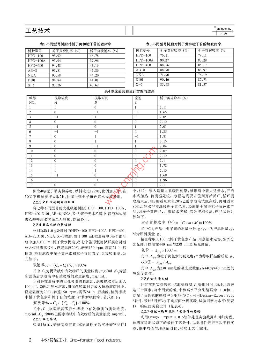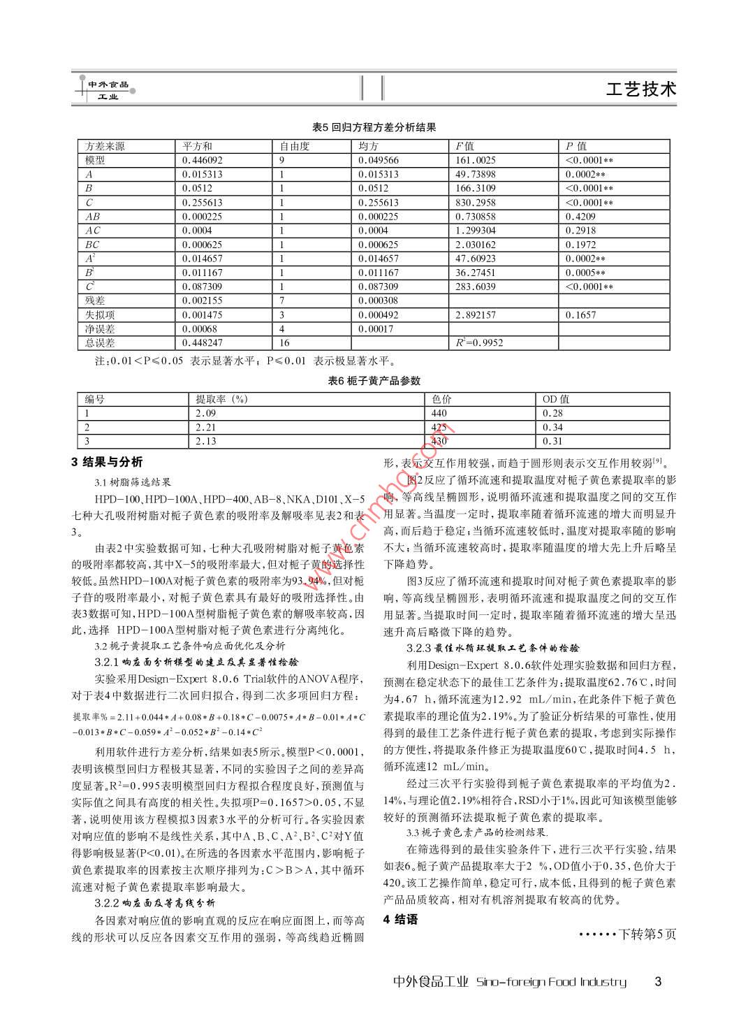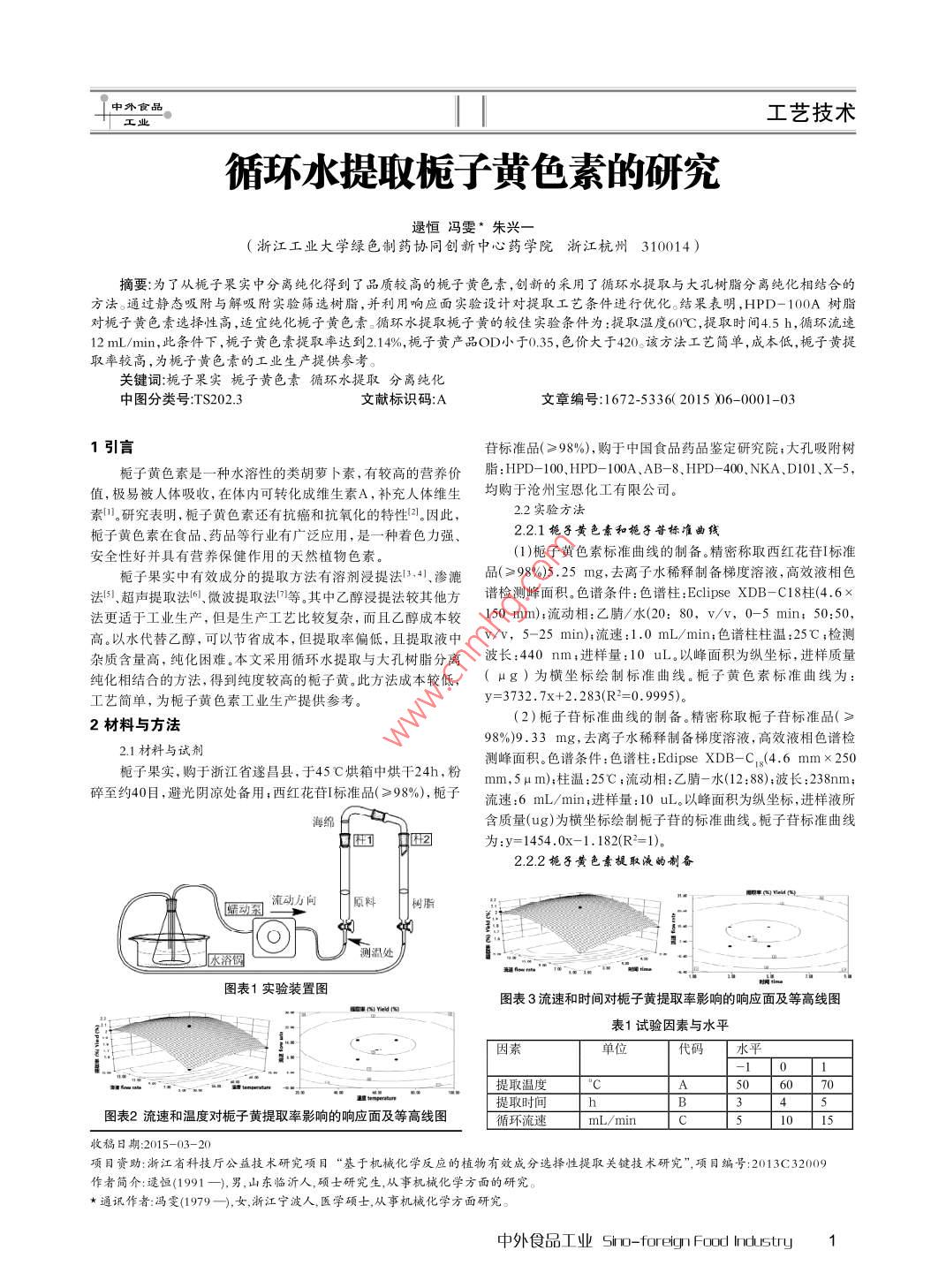 中外食品工藝技術(shù)循環(huán)水提取梔子黃色素的研究逯恒馮雯*朱興(浙江工業(yè)大學(xué)綠色制藥協(xié)同創(chuàng)新中心藥學(xué)院浙江杭州310014)摘要:為了從梔子果實(shí)中分離純化得到了品質(zhì)較高的梔子黃色素,創(chuàng)新的采用了循環(huán)水提取與大孔樹脂分離純化相結(jié)合的方法。通過靜態(tài)吸附與解吸附實(shí)驗(yàn)篩選樹脂,并利用響應(yīng)面實(shí)驗(yàn)設(shè)計(jì)對提取工藝條件進(jìn)行優(yōu)化。結(jié)果表明,HPD-100A樹脂對梔子黃色素選擇性高,適宜純化梔子黃色素循環(huán)水提取梔子黃的較佳實(shí)驗(yàn)條件為:提取溫度6℃,提取時(shí)間4.5h,循環(huán)流速12ml/min,此條件下,梔子黃色素提取率達(dá)到2.14%,梔子黃產(chǎn)品OD小于0.35,色價(jià)大于420該方法工藝簡單,成本低,梔子黃提取率較高,為梔子黃色素的工業(yè)生產(chǎn)提供參考。關(guān)鍵詞:梔子果實(shí)梔子黃色素循環(huán)水提取分離純化中圖分類號TS2023文獻(xiàn)標(biāo)識碼:A文章編號:1672-5336(201506-0001-031引言苷標(biāo)準(zhǔn)品(≥98%),購于中國食品藥品鑒定研究院;大孔吸附樹梔子黃色素是一種水溶性的類胡蘿卜素,有較高的營養(yǎng)價(jià)脂:HPD-100HPD-100A、AB-8,HPD-400NKA,D101、X-5值,極易被人體吸收,在體內(nèi)可轉(zhuǎn)化成維生素A,補(bǔ)充人體維生均購于滄州寶恩化工有限公司素。研究表明,梔子黃色素還有抗癌和抗氧化的特性。因此2.2實(shí)驗(yàn)方法梔子黃色素在食品、藥品等行業(yè)有廣泛應(yīng)用,是一種著色力強(qiáng)2.2.1梔子黃色素和梔子苷標(biāo)準(zhǔn)曲線安全性好并具有營養(yǎng)保健作用的天然植物色素(1)梔子黃色素標(biāo)準(zhǔn)曲線的制備。精密稱取西紅花苷I標(biāo)準(zhǔn)梔子果實(shí)中有效成分的提取方法有溶劑浸提法3,41、滲漉品(≥98%)5.25mg,去離子水稀釋制備梯度溶液,高效液相色法、超聲提取法微波提取法等。其中乙醇浸提法較其他方譜檢測峰面積。色譜條件:色譜柱: Eclipse XDB-Cl8柱(4,6×法更適于工業(yè)生產(chǎn),但是生產(chǎn)工藝比較復(fù)雜,而且乙醇成本較150mm);流動相:乙腈/水(20:80,v/v,0-5min;50:50高。以水代替乙醇,可以節(jié)省成本,但提取率偏低,且提取液中VV,5-25min;流速:1.0mL/min;色譜柱柱溫:25℃;檢測雜質(zhì)含量高,純化困難。本文采用循環(huán)水提取與大孔樹脂分離波長:440mm;進(jìn)樣量:10uL。以峰面積為縱坐標(biāo),進(jìn)樣質(zhì)量純化相結(jié)合的方法,得到純度較高的梔子黃。此方法成本較低,(Hg)為橫坐標(biāo)繪制標(biāo)準(zhǔn)曲線。梔子黃色素標(biāo)準(zhǔn)曲線為工藝簡單,為梔子黃色素工業(yè)生產(chǎn)提供參考y=3732.7x+2.283(R2=0.9995)2材料與方法(2)梔子苷標(biāo)準(zhǔn)曲線的制備。精密稱取梔子苷標(biāo)準(zhǔn)品(≥98%)9.33mg,去離子水稀釋制備梯度溶液,高效液相色譜檢21材料與試劑測峰面積。色譜條件:色譜柱: Edipse XDB-C1s(4.6mm×250梔子果實(shí),購于浙江省遂昌縣,于45℃烘箱中烘干24h,粉mm,5μm);柱溫:25℃;流動相:乙腈一水(12:8》;波長:238nm碎至約40目,避光陰涼處備用;西紅花苷標(biāo)準(zhǔn)品(≥98%),梔子流速:6mL/min;進(jìn)樣量:10uL。以峰面積為縱坐標(biāo),進(jìn)樣液所含質(zhì)量(ug)為橫坐標(biāo)繪制梔子苷的標(biāo)準(zhǔn)曲線。梔子苷標(biāo)準(zhǔn)曲線團(tuán)團(tuán)2.2.2梔子黃色素提取液的制備魔動到流動向原料樹脂浴圖表1實(shí)驗(yàn)裝置圖圖表3流速和時(shí)間對梔子黃提取率影響的響應(yīng)面及等高線圖表1試驗(yàn)因素與水平因素單位代碼[水平L提取時(shí)間h圖表2流速和溫度對梔子黃提取率影響的響應(yīng)面及等高線丨〖循環(huán)流速mL/m項(xiàng)目資助:浙江省科技廳公益技術(shù)研究項(xiàng)目“基于杋械侻學(xué)反應(yīng)的植物有效成分選擇性提取關(guān)鍵技術(shù)研究”,項(xiàng)目編號:2013℃32009作者簡介:逯恒(1991—),男,山東臨沂人,碩士研究生,從事機(jī)械化學(xué)方面的研究。★通訊作者:馮雯(1979—),女,浙江寧波人,醫(yī)學(xué)碩士,從事機(jī)械化學(xué)方面研究中外食品工業(yè)5n- foreign Food Industru工藝技術(shù)中外宦品工業(yè)表2不同型號樹脂對梔子黃和梔子苷的吸附率表3不同型號樹脂對梔子黃和梔子苷的解吸附率樹脂型號梔子黃吸附率(%)梔子苷吸附率(%)樹脂型號梔子黃解吸率(%)杞子苷解吸率(%)HPD-100HPD-10076.11HPD-100A93.94HPD=100AD90.2783.29HPD40094.48HPD-40088,26AB-896.81AB-8888.97NKaNKA71.96DIOL87.73972685.9881.57表4響應(yīng)面實(shí)驗(yàn)設(shè)計(jì)方案與結(jié)果提取溫度提取時(shí)間梔子黃提取率(%)ABC.6512345678902.120-0000000102.050000001001.852.15100002.1B4567000196稱取40g梔子果實(shí)粉碎物,以料液比1:20的比例加入水,在中,柱2中裝入適量大孔吸附樹脂,錐形瓶中裝人適量水。開啟50℃下機(jī)械攪拌提取2h。抽濾得到梔子黃色素水提液備用浴加熱,待測溫處流岀水溫達(dá)到要求值則開始循環(huán)。循環(huán)提2.2.3大孔吸附樹脂預(yù)處取結(jié)東后,柱2用適量水和20%乙醇水溶液洗脫雜質(zhì),再用適量將七種不同型號的大孔吸附樹脂(HPυ-Ⅷ.HPD-100A、80%乙醇水溶液洗脫梔子黃色素,經(jīng)濃縮干燥得梔子黃色素產(chǎn)PD4001AB-8NKA、X-5)置于無水乙醇中浸泡241,濾品。取梔子黃產(chǎn)品,用蒸餾水溶解,高效液相檢測。產(chǎn)品參數(shù)計(jì)HI去