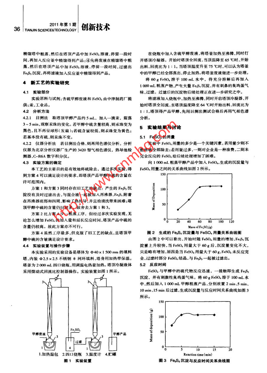 創(chuàng)新技術(shù)2011年第1期| TIANJIN SCIENCE&TECHNOLOGY 3孫玉春康明艷(天津渤海職業(yè)技術(shù)學(xué)院 天津300402)胡文艷(天津國(guó)韻生物材料有限公司 天津 300462)甲醇脫硫新工藝的研究[摘要]生產(chǎn)維生素B,的過(guò)程中產(chǎn)生大量的含硫甲醇廢液,某制藥廠的舊工藝脫硫效果不好,所得產(chǎn)品仍舊含有大量的硫。通過(guò)自制的反應(yīng)精餾裝置,經(jīng)過(guò)大量的實(shí)驗(yàn),得到成功的方案,現(xiàn)已用于指導(dǎo)工業(yè)生產(chǎn)。[關(guān)鍵訶]甲醇脫硫精餾甲醇是重要的有機(jī)化工產(chǎn)品,廣泛應(yīng)用于有機(jī)合成、染料、頂粗產(chǎn)品中加入3%(質(zhì)量百分?jǐn)?shù))的FeSO.,精餾后得產(chǎn)品甲醫(yī)藥、農(nóng)藥.涂料、汽車和國(guó)防等工業(yè)。甲醉在生產(chǎn)維生素B, .醇。此工藝的缺點(diǎn)為:①由于加人FeSO。后產(chǎn)生大量的沉淀,沉的過(guò)程中主要作為有機(jī)溶劑,在生產(chǎn)過(guò)程中產(chǎn)生大量的含硫甲淀沒(méi)有過(guò)濾出去,因此在粗蒸和精餾過(guò)程中.再沸器底部有一醇廢液(硫以硫代物的形式存在),若將甲醇循環(huán)利用,不僅可層厚厚的沉淀物,嚴(yán)重影響了傳熱.也使再沸器的使用壽命大以降低企業(yè)成本.而且可以減少環(huán)境污染。由于硫的存在影響大降 低;②沉淀物受熱后粘度變大,附著在再沸器上,給清洗帶了甲醇的循環(huán)利用,如何有效地將甲醇中的硫除去是工業(yè)生產(chǎn)來(lái)很大的困難 ;③塔頂產(chǎn)品中仍含有大量的硫;④操作為間歇中的-個(gè)難點(diǎn)。筆者就如何有效地去除硫做了大量的試驗(yàn)研精餾。.究,得到一個(gè)較為成功的方案??紤]到塔頂產(chǎn)品中仍存在硫,認(rèn)為可能存在的原因有:①FeSO.加入量不夠;②工藝流程本身存在缺陷;③精餾時(shí)塔設(shè)1脫硫方法備分離效果所限,不能達(dá)到分離要求。脫硫方法的選擇是甲醇項(xiàng)目脫硫技術(shù)的關(guān)鍵之- - .工業(yè)生針對(duì)可能存在的原因,作者分別對(duì)①和②做了實(shí)驗(yàn)研究。產(chǎn)中脫硫有很多方法。唣者根據(jù)某制藥廠提供的脫硫方法,結(jié)果表明,當(dāng)增大FeSO,的用量時(shí).塔頂仍未得到合格的甲醇,結(jié)合其實(shí)際生產(chǎn)情況,著重研究了用FeSO.脫硫的方法:FeSO.故推斷可能是工藝本身存在缺陷。與甲醇廢液中的硫代物反應(yīng)生成FeS,沉淀,過(guò)濾出FeS,沉3新工藝構(gòu)想淀,然后將濾液精餾得到高純度的甲醇。實(shí)驗(yàn)證明:由于FeSO,在甲醇廢液中的濱解度較小, FeSO..2舊工藝簡(jiǎn)介與甲醇中的硫代物反應(yīng)緩慢.若將FeSO.溶于水中,則反應(yīng)迅某制藥廠的脫硫舊工藝為:將- -定量的甲醇廢液加入貯槽速,故試驗(yàn)時(shí)先將FeSO。 溶于水。中,然后再加入3%(質(zhì)量百分?jǐn)?shù))的FeSO.,攪拌并停留一段時(shí)實(shí)驗(yàn)過(guò)程擬定了4套方案:①直接在甲醇廢液中加FeSO4間,將混合液加入再沸器中,粗蒸,得塔頂粗產(chǎn)品;然后再向塔溶液,停留一段時(shí)間后將混合液加入反應(yīng)釜,然后精餾得到產(chǎn)品;②直接在廢液中加FeSO。溶液,停留一段時(shí)間,過(guò)濾出收稿日期:2011-01-05FeS,沉淀,將濾液加入反應(yīng)釜中精餾得到產(chǎn)品;③先將廢液在[2]Takeda K,Akiyama A. Dicarbonates: covenient 4-[7]陸平波,莫芬珠。丙鬧酸酯的合成[J].化工時(shí)刊,2002dimethylaminopyridinecatalyzed esterif ication(4):48-49. .reagents[J]. Synthesis, 1 994(10):1063-1066.[8]Kayser M. M.. Mihovilovic M. D. et al. Baker's Yeast-Me-[3)oppenheim. Ein Aether der Brenztraubensure[J1.Chemis-diated Reductions of a-Keto Esters and an a -Ke-che Berichte, 1 872,5(2):1051-1052.to- β -Lactam. TwO Routes to the Paclitaxe1 Side Chain[4]weissberger A,Kibler C. J. Methy1 pryuvate [J]. Organic[J]. Journal of organic chemsitry,1999,64 (18): .Syntheses, 1994(24):72-75.6603-6608.[5]Clinton R.0.. Laskowski S. C. The Preparation of Methy1 [9]Rodriguez A Nomen M. Selective Method for the Prepa-Esters [J]. Journal of the American Chemical Society,ration of Aliphatic Methy1 Esters in the Presence of1948,70(9):31 35-31 36.Aromatic Carboxylic Acids [J]. Tetrahedron Letters6]丘方利.丙闌酸甲酯的合成[J]. 化學(xué)工程師,2007(2):1998(39):8563-8566.48-50.2011年第1期,創(chuàng)新技術(shù).36 TANJIN SCIENCE&TECHNOLOGY精餾塔中粗蒸.然后在塔頂產(chǎn)品中加FeSO,溶液.停留-段時(shí)在燒瓶中加入含硫甲醇廢液,將塔爸加熱至沸騰.同時(shí)打間,再加入反應(yīng)爸中精餾得到產(chǎn)品;④先將廢液在精餾塔中粗開(kāi)塔頂冷凝器。開(kāi)始時(shí)塔頂全回流,當(dāng)頂溫降至65 C時(shí),開(kāi)始蒸,然后在塔頂產(chǎn)品中加FeS0。溶液.停留一段時(shí)間,過(guò)濾出出料.回流比為1: 1。當(dāng)塔頂溫度升至75 C時(shí),可以認(rèn)為塔釜FeSs沉淀,再將濾液加入反應(yīng)釜中精餾得到產(chǎn)品。中的甲醇已經(jīng)全部蒸出,停止加熱。將塔釜廢液做進(jìn)-步處理。將60gFeSO.溶于100 mL水中,待充分溶解后再加入4新工藝的實(shí)驗(yàn)研究1 000 mL粗蒸產(chǎn)物,產(chǎn)生大量FeS,沉淀.并有刺鼻的臭雞蛋氣4.1 實(shí)驗(yàn)部分味,過(guò)濾。過(guò)濾后的沉淀物后續(xù)處理正在進(jìn)一步研究之中。實(shí)驗(yàn)原料與試劑:含硫甲醇廢液和FeSO。由中津制藥廠提將濾液加入燒瓶中.加熱至沸騰,同時(shí)開(kāi)啟塔頂冷凝器,開(kāi)供;汞,工業(yè)品。始時(shí
