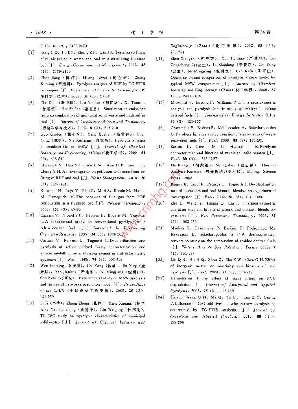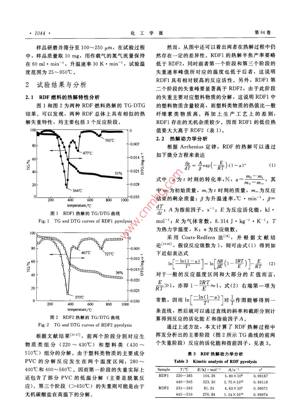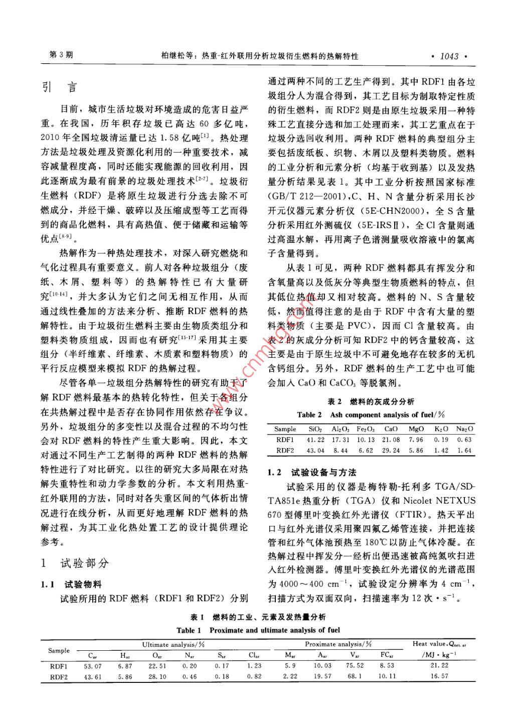 第64卷第3期化工學(xué)報(bào)Vol. 64 No. 32013年3月CIESC JournalMarch 201研究論文 資熱重-紅外聯(lián)用分析垃圾衍生燃料的熱解特性柏繼松,余春江,吳鵬,方夢(mèng)樣,駱仲泱(能源清沽利用國(guó)家重點(diǎn)實(shí)驗(yàn)室(浙江大學(xué)), 浙江杭州310027)摘要:利用熱重紅外分析儀(TG-FTIR)研究了兩種不同垃圾衍生燃料(RDF) 的熱解特性。研究發(fā)現(xiàn),盡管兩種RDF的來(lái)源不同,但卻具有相似的熱解特性,其熱解過(guò)程主要分為3個(gè)階段:生物質(zhì)組分(220~430C)、塑料類物質(zhì)(430~520C)以及無(wú)機(jī)碳酸鹽(>650C)的分解。利用Coats-Redfern法,求得了RDF熱解前兩個(gè)階段的表觀動(dòng)力學(xué)參數(shù),計(jì)算結(jié)果表明高溫段的反應(yīng)活化能要高于低溫段。通過(guò)FTIR對(duì)RDF熱解析出的氣體進(jìn)行了在線分析,發(fā)現(xiàn)兩種RDF熱解過(guò)程中的氣相產(chǎn)物析出規(guī)律基本一致,析出的氣體主要包括H2O、CO3、CO以及CH,等烴類。HCI 在低溫階段(230~400C) 即析出完畢。相比之下,NH開(kāi)始析出的溫度較高(260C),并且整個(gè)析出溫度范圍較廣,高溫下仍有少量析出。SO2 在熱解條件下仍有相當(dāng)量的生成,其析出主要集中在300~600C的溫度范圍內(nèi).關(guān)鍵詞:垃圾衍生燃料;熱重紅外聯(lián)用:熱解;動(dòng)力學(xué)參數(shù);氣相產(chǎn)物DOI: 10. 3969/j. issn. 0438- 1157. 2013. 03. 036中圖分類號(hào): X705文獻(xiàn)標(biāo)志碼: A文章編號(hào): 0438-1157 (2013) 03- 1042-07TG-FTIR analysis on pyrolysis characteristics of refuse-derived fuelBAI Jisong, Y∪Chunjiang, WU Peng, fang Mengxiang, LUO Zhongyang(State Key Laboratory of Clean Energy Urilization,Zhejiang University, Hangzhou 310027, Zhejiang, China)Abstract: The pyrolysis characteristics of two different kinds of refuse derived fuels (RDF) wereinvestigated using thermogravimetric analysis Fourier transform infrared spectrometer (TG-FTIR). Iwas found that the pyrolysis characteristics of two RDFs were similar. The pyrolysis process could bedivided into three main stages, corresponding to the decomposition of biomass components (220一 430C),plastic substances (430- 520°C) and carbonates (> 650°C). The Coats-Redfern method was used toanalyze the apparent kinetic parameters of the first two stages, and the results showed that the activationenergy was higher for the middle- temperature stage than for the low-temperature stage. By FTIR analysis,it was found that the major volatile gases released from the two RDFs were similar, mainly includingH2O,CO2, CO,CH, and other hydrocarbons. The release of gaseous pollutants was paid specialattention. The emission of HCI is completed at the low temperature stage (230- - -400C). In contrast, therelease of NH3 begins at 260C and goes through a much wider temperature range, and there is still a smallamount of NH: release at much higher temperature. In pyrolysis condition investigated, it was surprised todetect large amount of SO2, mainly released in the temperature range of 300- -600C.Key words: refuse-derived fuel; TG-FTIR; pyrolysis; kinetic parameters; gas products2012- -05 - 22收到初稿,2012-07-06收到修改稿。Received date: 2012-05- 22.聯(lián)系人:余春江。第一作者:柏繼松(1985),男,博士研Corresponding author: YU Chunjiang, chunjiang@ zju, edu. cn究生。Foundation item: supported by the National Natural Science基金項(xiàng)目:國(guó)家自然科學(xué)基金項(xiàng)目(50976102); 中央高校基Foundation of China (50976102). the Fundamental Research Funds本科研業(yè)務(wù)費(fèi)專項(xiàng)資金項(xiàng)目;國(guó)際科技合作項(xiàng)目(2011DFA61060).for the Central Universities and the International Science &Technology Cooperation Progratn of China (2011DFA61060).第3期柏繼松等:熱重紅外聯(lián)用分析垃圾衍生燃料的熱解特性●1043.引言通過(guò)兩種不同的工藝生產(chǎn)得到。其中RDF1由各垃圾組分人為混合得到,其工藝目標(biāo)為制取特定性質(zhì)目前,城市生活垃圾對(duì)環(huán)境造成的危害日益嚴(yán)的衍生燃料,而RDF2則是由原生垃圾采用- -種特重。在我國(guó),歷年積存垃圾已高達(dá)60多億噸,殊工藝直接分選和加工處理而來(lái),其工藝重點(diǎn)在于2010年全國(guó)垃圾清運(yùn)量已達(dá)1.58億噸甲。熱處理垃圾分選回收利用。兩種RDF燃料的典型組分主方法是垃圾處理及資源化利用的一種重要技術(shù),減要包括廢紙板、織物、木屑以及塑料類物質(zhì)。燃料容減量程度高,同時(shí)還能實(shí)現(xiàn)能源的回收利用,因的工業(yè)分析和元素分析(均基于收到基)以及發(fā)熱此逐漸成為最有前景的垃圾處理技術(shù)(27]。垃圾術(shù)量分析結(jié)果見(jiàn)表1。其中工業(yè)分析按照國(guó)家標(biāo)準(zhǔn)生燃料(RDF) 是將原生垃圾進(jìn)行分選去除不可(GB/T 212- -2001),C、 H、N含量分析采用長(zhǎng)沙燃成分,并經(jīng)干燥、破碎以及壓縮成型等工藝而得開(kāi)元儀器元素分析儀(5E-CHN2000), 全S含量到的商品化燃料,具有高熱值、便于儲(chǔ)藏和運(yùn)輸?shù)确治霾捎眉t外測(cè)硫儀(5E-IRSI), 全CI含量則通優(yōu)點(diǎn)(8-9]。過(guò)高溫水解,再用離子色譜測(cè)量吸收溶液中的氯離熱解作為一種熱處理技術(shù),對(duì)深入研究燃燒和子含量得到。氣化過(guò)程具有重要意義。前人對(duì)各種垃圾組分(廢從表1可見(jiàn),兩種RDF燃料都具有揮發(fā)分和紙、木屑、塑料等)的熱解特性已有大量研含氧量高以及低灰分等典型生物質(zhì)燃料的特點(diǎn),但究([0.14], 并大多認(rèn)為它