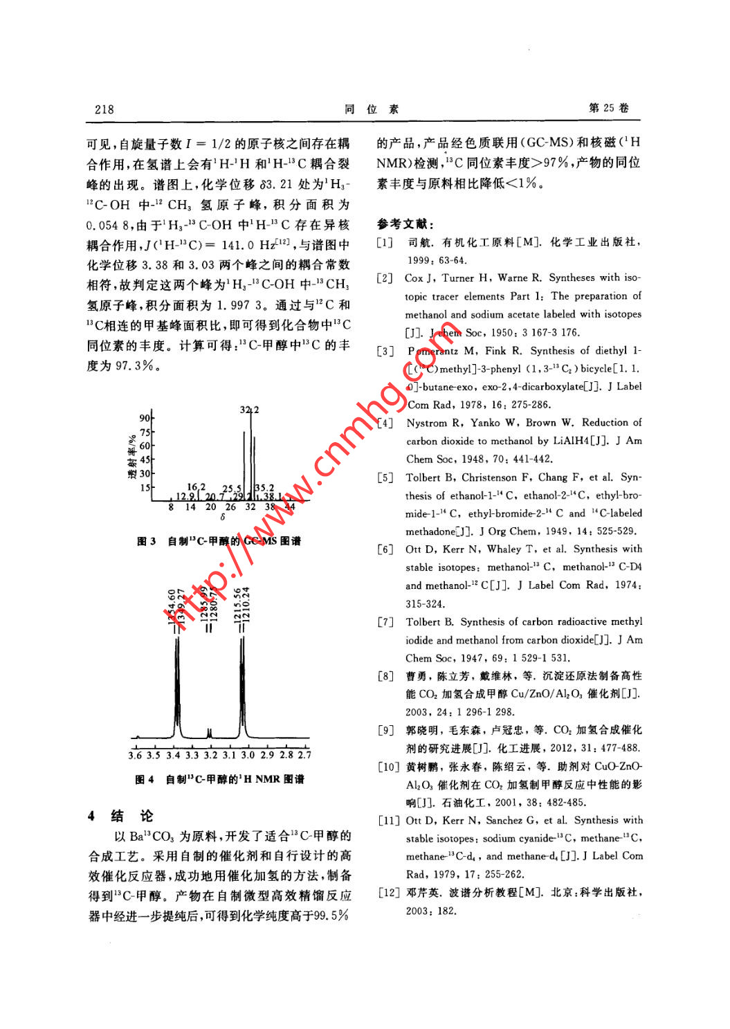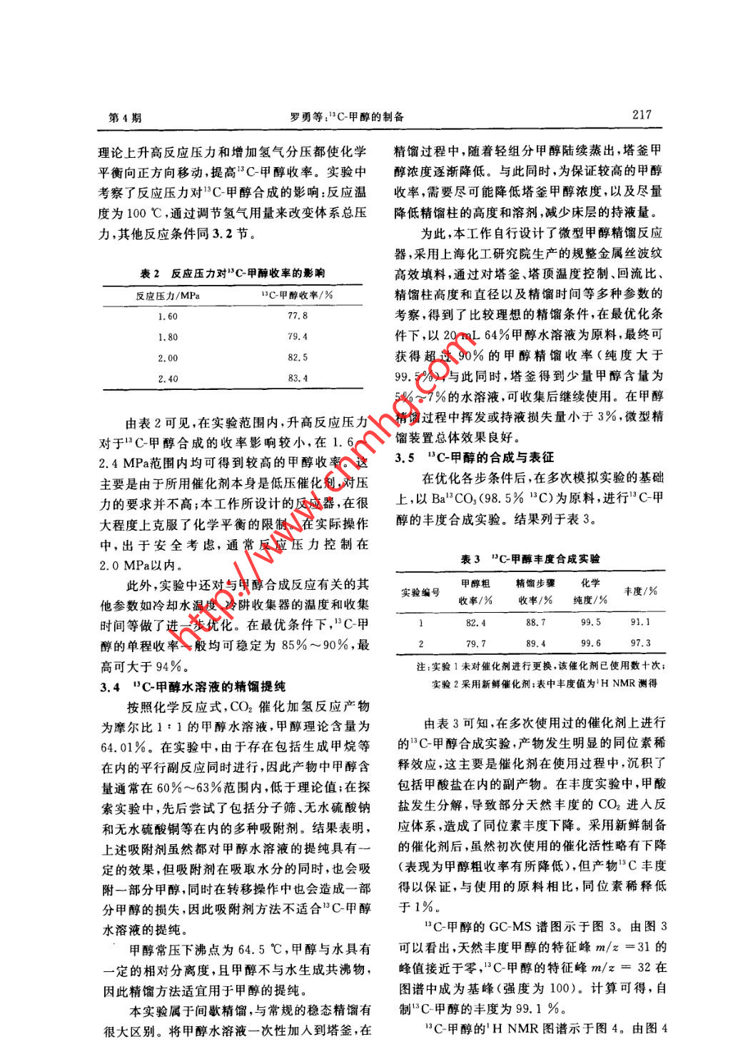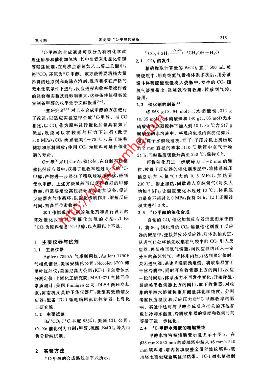 第25卷第4期司位素Vol. 25 No. 4Nov.20122012年11月.Journal of IsotopesB3C-甲醇的制備羅勇,杜曉寧,宋家龍,陸平曄,李美華(上?;ぱ芯吭?上海200062)摘要:采用自制的催化劑和自行設(shè)計的高效催化反應(yīng)器,用催化加氫的方法,以Be"CO3為原料制備了C甲醇。所得甲醇水溶液在微型高效精餾反應(yīng)器中進一步提純后,得到的“C-甲醇化學(xué)純度>99.5%。實驗設(shè)計的合成路線反應(yīng)條件溫和,同位素利用率>90%."C甲酶經(jīng)色質(zhì)聯(lián)用(GC-MS)和核磁('H NMR)檢測,"C同位素豐度>97% ,"C甲醇的同位素豐度與原料相比降低<1%.以上結(jié)果表明,采用自制的催化劑和自行設(shè)計的高效催化反應(yīng)器.成功地用催化加氫的方法制備得到了”C-甲醇。關(guān)鍵詞:"C標(biāo)記;甲醇;催化加氫中圖分類號: O628. 2文獻標(biāo)志碼: A文章編號: 1000-7512(2012)04-0214-05Synthesis of "C-labeled MethanolLUO Yong, DU Xiao ning, SONG Jia-long, LU Ping-ye, LI Mei-hua(Shanghai Research Instiute of Chemical Industry ,Shanghai 20062, China)Abstract: A novel convenient method for the synthesis of "3C methanol was described.methanol was prepared by means of catalytic hydrogenation, and then as-synthesized metha-nol solution was further purified in a microscale high eficient rectification column. Thechemical purity of "C-methanol was more than 99. 5%. The synthetic route was featured bymild conditions and high yields of more than 90% based on isotopic substrate consumed.The product was characterized by GC-MS and 'H NMR, and the "C abundance of "C-methanol was more than 97%. Compared with the raw materials, the reduction of relativeisotopic abundance of product was less than 1%.Key words: "C-label; methanol; catalytic hydrogenation穩(wěn)定同位素*C標(biāo)記甲醇(}C-甲醇)是合目前在工業(yè)上,甲醇的合成有許多成熟工成'C標(biāo)記產(chǎn)品的基礎(chǔ)試劑,將其作為前體,可藝°,包括高壓、中壓和低壓工藝流程,這些合成以在化合物中引入C標(biāo)記的甲基,進而得到一工藝生產(chǎn)設(shè)備投資大,生產(chǎn)工藝復(fù)雜,產(chǎn)物甲醇的系列$C標(biāo)記的化合物。單程轉(zhuǎn)化率低,不適合實驗室中C甲醇的合成。收稿日期: 2012-04-23;慘回日期: 2012-05-29基金項目:“+-五”國家科技支撐計劃(2009BAK61B04);科技部轉(zhuǎn)制院所專項(201E116066)作者簡介:羅勇(1974 -),男,甘肅人,高級工程師(博士),主要從事精細(xì)有機合成及工業(yè)催化等研究215第4期羅勇等:"C甲醇的制備13C-甲醇的合成通??梢苑譃橛袡C化學(xué)試18CO2 + 3H2Cu-Zn. 13CH,OH+H2O劑還原法和催化加氫法,其中前者采用氫化鋁鋰2.1 CO2 的發(fā)生等強還原劑,在高沸點溶劑如乙二醇二乙醚中,精確稱取計算量的BaCO3置于500 mL玻將"CO2還原為C-甲醇。該方法需要消耗大量璃燒瓶中,用高純氮氣置換體系多次后,用分液昂貴的還原劑和高沸點溶劑,反應(yīng)要求在嚴(yán)格的漏斗將稀硫酸緩慢滴人燒瓶中,發(fā)生的CO2隨無水無氧條件下進行,反應(yīng)進程和收率受操作者氦氣緩慢帶出,經(jīng)液氮冷阱收集,轉(zhuǎn)移到氣袋,的經(jīng)驗和實驗技能影響很大,這些條件使得實驗備用。室制備甲醇的收率低于文獻報道[241。2.2 催化劑的制備[°0]-些研究者[5°]對工業(yè)合成甲醇的方法進行將868 g(2. 94 mol)三水硝酸銅、312 g了改進,以適應(yīng)實驗室中合成C甲醇。與CO(0. 35 mol)六水硝酸鋅和140 g(1. 05 mol)無水相比,以CO2作為原料進行催化加氫具有如下硝酸鉻在劇烈攪拌下加人到10L85 C含547 g優(yōu)點:反應(yīng)可以在較低的壓力下進行(低于碳酸鈉的水溶液中。將反應(yīng)生成的沉淀過濾后,3. 0 MPa);CO2沸點較高(-78 C),易于轉(zhuǎn)移用去離子水徹底清洗,瀝干,于壓片機上擠壓成儲存和原料回收;使用CO2為原料可延長催化約2 mm直徑的棒狀,110心烘箱中空氣干燥劑的壽命。24 h,同時溫度緩慢升高至250 C ,保持6 h.Ott等[0]采用Cu-Zn催化劑,在自制不銹鋼再將催化劑進- -步破碎為1~2 mm的顆催化劑反應(yīng)器中,獲得了粗收率超過90%的“C粒,放置于反應(yīng)器的催化劑床層中,將體系減壓甲醇,產(chǎn)物進-一步經(jīng)分子篩聯(lián)球減壓轉(zhuǎn)移,得到抽空后加人氦氣(大約0. 8 MPa),加熱到無水甲醇。上述方法雖然可以獲得良好的甲醇230C。停止加熱,間歇通人高純氫氣(每次大收率,但需要增設(shè)高壓循環(huán)泵等附加設(shè)備,促進約加7 kPa,讓溫度變化不超過10 C),體系壓反應(yīng)器內(nèi)氣體循環(huán),以強化傳質(zhì)作用,縮短反應(yīng)力最高不超過2.0 MPa,保持24 h。以上還原過時間,提高同位素收率。程共進行3次。本工作擬采用自制的催化劑和自行設(shè)計的2.3 BC-甲醇的催化合成高效催化反應(yīng)器,用催化加氫的方法,以Ba自制的CO2催化加氫反應(yīng)器示意圖示于圖"CO3為原料制備"C-甲醇,以克服以上不足。1。將80g活化后的CO2加氫催化劑置于反應(yīng)器的床層中,連接并安裝反應(yīng)器,對體系抽真空,1主要儀器與試劑從進氣口處將預(yù)先收集在氣袋中的CO2引人反1.1主要儀器應(yīng)器,再切換至氫氣鋼瓶,向反應(yīng)器內(nèi)壓人一定Agilent 7890A氣質(zhì)聯(lián)用儀Agilent 1790F分壓的高純氫氣。待體系內(nèi)壓力達到預(yù)定值時,氣相色譜儀:美國安捷倫公司;Nocolet6700傅關(guān)閉進氣閥,迅速升溫到預(yù)定值。將收集器置于里葉紅外儀:美國尼高力公司;KF-1卡爾費休水干冰冷阱中,同時開啟收集器上方的閥門,反應(yīng)分測定儀:上?;ぱ芯吭?MAT-271氣體