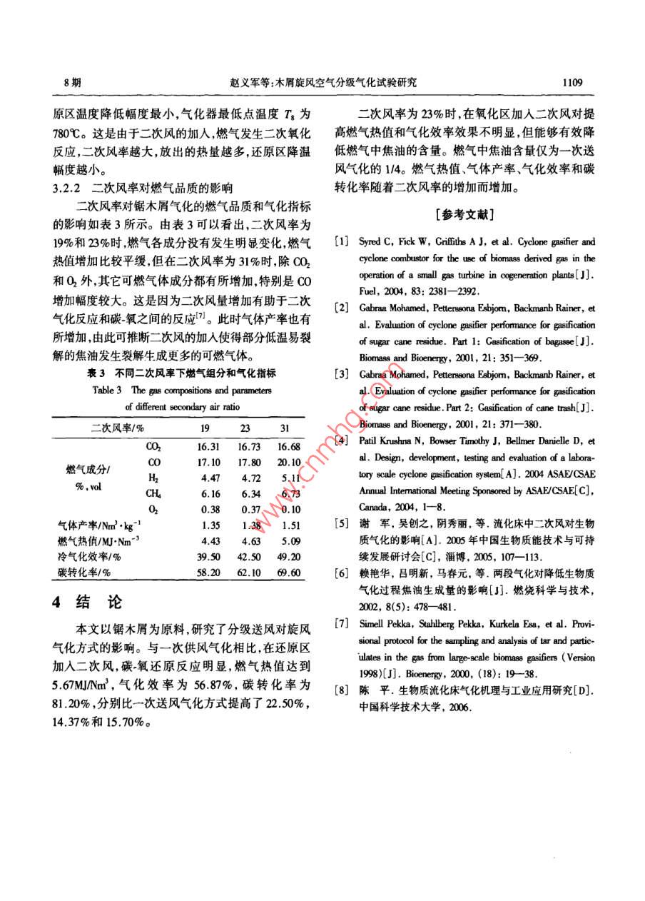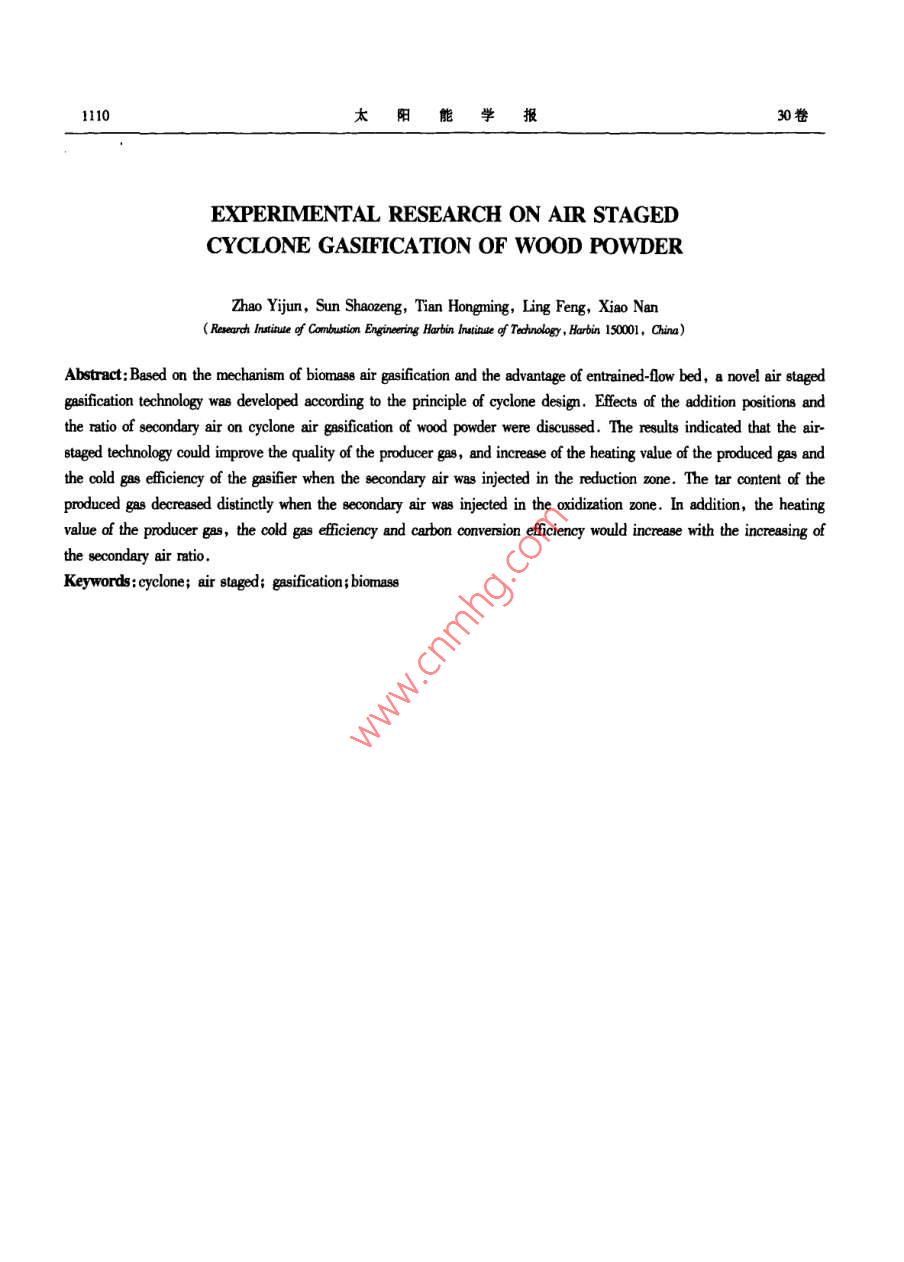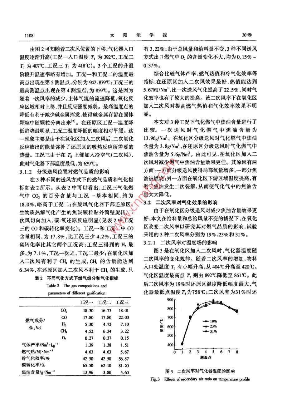 第30卷第8期太陽能學(xué)報Vol.30, No.82009年8月ACTA ENERGLAE SOLARIS SINICAAug.,2009文章編號: 02540096(2009)08-1106-05木屑旋風(fēng)空氣分級氣化試驗研究趙義軍,孫紹增,田洪明,凌峰,肖難(哈爾濱工業(yè)大學(xué)燃燒工程研究所,哈爾濱10001)摘要:基于生物質(zhì)空氣氣化機理,結(jié)合氣流床氣化工藝的優(yōu)點,參考旋風(fēng)分離器的設(shè)計原理,提出了生物質(zhì)旋風(fēng)空氣分級氣化工藝。對不同的位置加人二次風(fēng)和改變二次風(fēng)率進行了試驗研究。研究結(jié)果表明,分級氣化能夠改善燃氣品質(zhì)。在還原區(qū)加入二次風(fēng)有利于提高燃氣熱值和氣化效率,在氧化區(qū)加入二次風(fēng)有利于減少燃氣中焦油的含量。燃氣熱值、氣體產(chǎn)率氣化效率和碳轉(zhuǎn)化率隨著二次風(fēng)率的增加而增加。關(guān)鍵詞:旋風(fēng);分級;氣化;生物質(zhì)中圖分類號: TQ038.1文獻標(biāo)識碼: A通過一一個錐體連接,如圖1所示。進料口布置在氣0引言化器的上部,生物質(zhì)燃料顆粒由氣流攜帶通過進料生物質(zhì)氣化是生物質(zhì)利用的一種很有前途的方口切向進 人氣化器,經(jīng)過干燥和熱解,生物質(zhì)內(nèi)部結(jié)式。氣化器是生物質(zhì)氣化工藝中最核心的設(shè)備,目構(gòu)在吸熱的不可逆 條件下發(fā)生熱分解反應(yīng),析出揮前國內(nèi)生物質(zhì)氣化器的形式以固定床和流化床為發(fā)份。熱解過程在氧化性氣氛中完成,熱解反應(yīng)的主。生物質(zhì)旋風(fēng)氣化器是氣流床氣化方式的一種。同時伴隨著揮發(fā)份的燃燒反應(yīng),這樣在固體顆粒周英國卡迪夫大學(xué)、瑞典呂勒奧大學(xué)、美國俄克拉何馬圍形 成揮發(fā)份燃燒火焰的包圍狀態(tài),部分氧氣滲透州立大學(xué)等在生物質(zhì)旋風(fēng)氣化方面做了大量科學(xué)研到固體顆粒表面與固定碳反應(yīng)。氧化反應(yīng)放出熱究。研究表明生物質(zhì)旋風(fēng)氣化,能通過組織氣固兩量,為物料的熱解、干燥和還原區(qū)的吸熱反應(yīng)提供必相旋流空氣動力場完成生物質(zhì)氣化過程,同時能有要的熱量。同時在高溫環(huán)境下,熱解氣中的焦油會效降低燃氣中堿金屬含量,防止氣化器內(nèi)結(jié)渣1-4)。發(fā)生二次裂解。進入還原區(qū)后,生成的CO2與固定分級送風(fēng)氣化方式是改善氣化效果,提高燃氣品質(zhì)的重要手段。中科院廣州能源研究所和山東大煙氣出口學(xué)分別對流化床氣化器和固定床氣化器采用了分級送風(fēng)方式,試驗結(jié)果表明可燃氣中焦油含量明顯降接觸器低,燃氣熱值顯著提高[s.6。←二次風(fēng)(1)本文基于生物質(zhì)空氣氣化機理,結(jié)合氣流床氣一二次風(fēng)(2)化工藝的優(yōu)點,參考旋風(fēng)分離器的設(shè)計原理,提出了生物質(zhì)旋風(fēng)空氣分級氣化工藝,得到了該新型氣化器分級送風(fēng)氣化的規(guī)律,為今后進- -步的研究提供i灰了重要的理論依據(jù)。溫控儀溫度巡檢儀1旋風(fēng)空氣氣化原理 ,圖1旋風(fēng)空氣分級氣化器實驗 系統(tǒng)圖旋風(fēng)氣化器的主體部分包括外旋風(fēng)簡和內(nèi)旋風(fēng)Fig.1 The schemaic diagram of the cyclone air staged gasifer筒(也稱為中心管、上升管)。外旋風(fēng)簡和灰斗之間收稿日期: 208-01-24基金項目:黑龍江省自然科學(xué)基金(1307396)通訊作者:孫紹增(1963- -),男,博士生導(dǎo)師,主要從事煤粉燃燒和生物質(zhì)能利用方面的研究。umsxhi.edu.o8期趙義軍等:木屑旋風(fēng)空氣分級氣化試驗研究1107碳接觸發(fā)生反應(yīng)生成Co,同時伴隨著水蒸氣與Co、斗則。CO2反應(yīng)生成CH,焦油發(fā)生進-一步裂解、重整等反2試驗應(yīng),形成含有大量CO、CH、H、C, H.等可燃成分和CO2、N2等不可燃成分組成的混合燃氣。2.1原料在完成氣化反應(yīng)的同時,,氣化燃氣與飛灰自動試驗原料為鋸木屑,取自哈爾濱興隆鎮(zhèn)林場,表分離,氣體經(jīng)過內(nèi)旋風(fēng)簡排出,飛灰顆粒落入灰1給出了鋸木屑的元素分析和工業(yè)分析數(shù)據(jù)。表1鋸木屬的工業(yè)分析和元素分析Table I Utimate and proximate analysis of wood powder工業(yè)分析/%元素分析/%低位熱值/MJ+kg"'FCMAa[C] [H][o]a[N]。[S]。15.09 !75.46 .13.809.20.1.5443.016.4239.64 .0.170.022.2系統(tǒng)點和第5測溫點之間以及第7測溫點和第8測溫點試驗系統(tǒng)(如圖1)主要由主體氣化器、供風(fēng)系之間加入二次風(fēng),具體位置如圖1所示。通過二次統(tǒng)、給料系統(tǒng)預(yù)熱及溫控系統(tǒng)和取樣系統(tǒng)5部分組風(fēng)送人位置以及二次風(fēng)率的變化研究二次風(fēng)對氣化成。主體氣化器采用耐高溫的不銹鋼材料加工而器溫度場和燃氣品質(zhì)的影響。成,外旋風(fēng)簡內(nèi)徑200mm,高1300mm。試驗所需的3.1分級送風(fēng)位 對氣化效果的影響空氣由空氣壓縮機提供,為保證空氣氣流的穩(wěn)定性,試驗工況選取給料速率為l5kg/h, 總給風(fēng)量為壓縮空氣在進入氣化器之前先經(jīng)儲氣罐穩(wěn)壓。物料13m'/h,空氣當(dāng)量比為0.24,送人的二次風(fēng)率為23%。顆粒由調(diào)速螺旋給料機送入物料混合器,與空氣混分別比較- -次送風(fēng)氣化在第4.5測溫點之間加入二合進入氣化器,給料量由調(diào)速電機控制。在尾部煙次風(fēng)氣化在第7.8測溫點之間加入二次風(fēng)氣化這3道布置引風(fēng)機,通過調(dià
