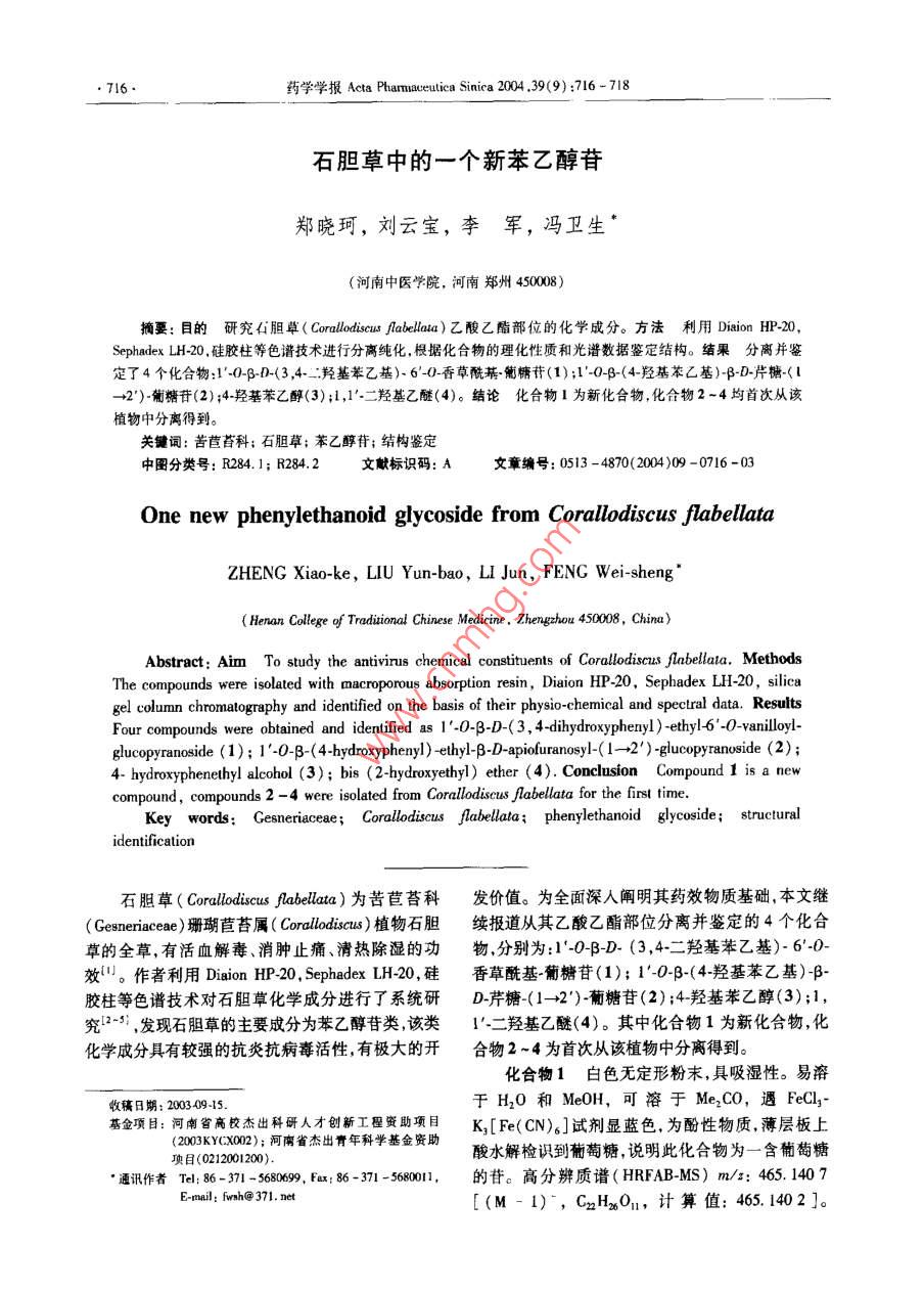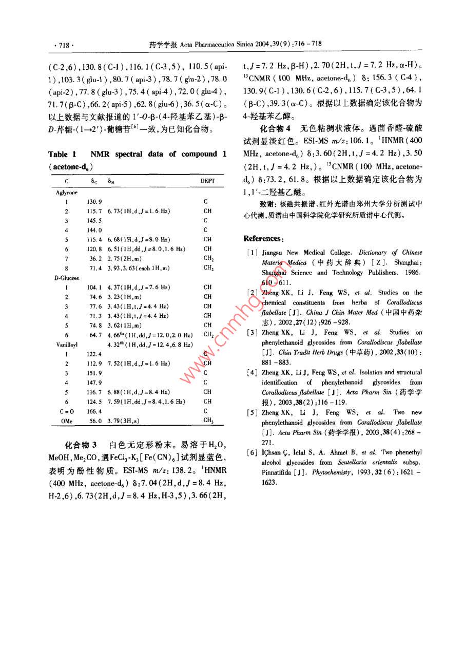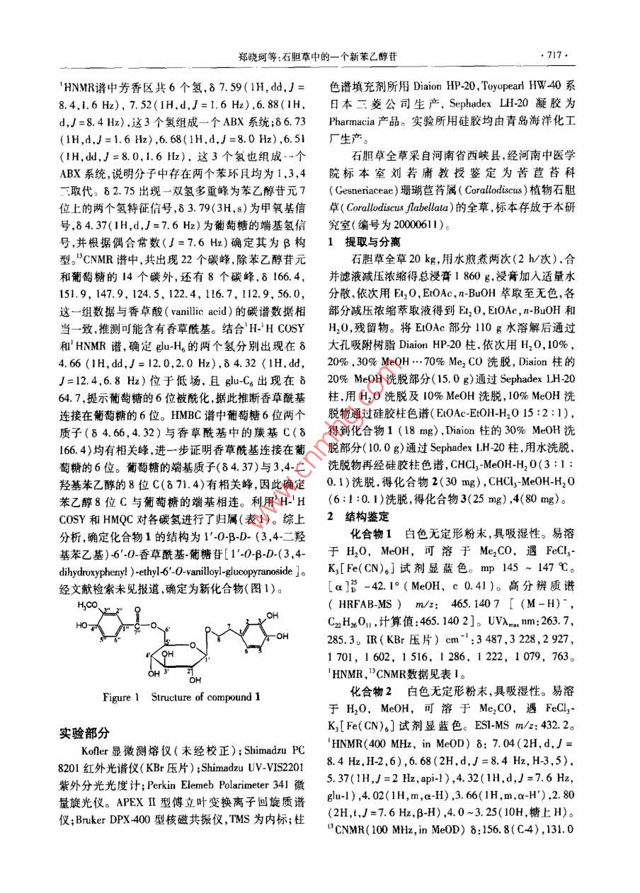 716藥學(xué)學(xué)報(bào) Acta Pharmaceutica Sinica2004,39(9):716-718石膽草中的一個(gè)新苯乙醇苷鄭曉珂,劉云寶,李軍,馮衛(wèi)生(河南中醫(yī)學(xué)院,河南鄭州450008)摘要:目的研究石膽草( Corallodiscus flabellata)乙酸乙酯部位的化學(xué)成分。方法利用 Diaion HP-20Sephadex凵H20,硅膠柱等色譜技術(shù)進(jìn)行分離純化,根據(jù)化合物的理化性質(zhì)和光譜數(shù)據(jù)鑒定結(jié)構(gòu)。結(jié)果分離并鑒定了4個(gè)化合物:1·04βD(3,4二羥基苯乙基)60-香草?;咸擒?1);1·O-9-(4羥基苯乙基)βD芹糖-(L→2)葡糖苷(2);4羥基苯乙醇(3);,1’·二羥基乙醚(4)。結(jié)論化合物1為新化合物,化合物2-4均首次從該植物中分離得到。關(guān)鍵詞:苦苣苔科;石膽草;苯乙醇背;結(jié)構(gòu)鑒定中圖分類號(hào):R284.1;R284.2文獻(xiàn)標(biāo)識(shí)碼:A文章編號(hào):0513-4870(2004)09-0716-03One new phenylethanoid glycoside from Corallodiscus flabellataZHENG Xiao-ke, LIU Yun-bao, LI Jun, FENG Wei-shengHenan College of Traditiona Chinese Medicine, Zhengzhou 450008, ChiAbstract:Aim to study the antivirus chemical constituents of Corallodiscus flabellata. MethodsThe compounds were isolated with macroporous absorption resin, Diaion HP-20, Sephadex LH-20, silicagel column chromatography and identified on the basis of their physio-chemical and spectral data. ResultsFour compounds were obtained and identified as 1-0-B-D-(3, 4-dihydroxyphenyl )-ethyl-6-0-vanilloylglucopyranoside(1); 1'-0-B-(4-hydroxyphenyl)-ethyl-B-D-apiofuranosyl-(1-2)-glucopyranNside(2);compound, compounds 2-4 were isolated from Corallodiscus flabellata for the first time ound 1 is a new4. hydroxyphenethyl alcohol (3) bis(2-hydroxyethyl)ether(4). Conclusion CompKey words: Gesneriaceae; Corallodiscus flabellata: phenylethanoid glycoside; structuralidentification石膽草( Corallodiscus flabellata)為苦苣苔科發(fā)價(jià)值。為全面深人闡明其藥效物質(zhì)基礎(chǔ),本文繼( Gesneriaceae珊瑚苣苔屬( Corallodiscus)植物石膽續(xù)報(bào)道從其乙酸乙酯部位分離并鑒定的4個(gè)化合草的全草,有活血解毒、消腫止痛、清熱除濕的功物,分別為:1·0BD(3,4·二羥基苯乙基)60效{。作者利用 Diaion HP20, Sephadex LH20,硅香草?;咸擒?1);l·OB-(4羥基苯乙基)β膠柱等色譜技術(shù)對(duì)石膽草化學(xué)成分進(jìn)行了系統(tǒng)研D芹糖(1→2)葡糖苷(2);4羥基苯乙醇(3);1究2-”,發(fā)現(xiàn)石膽草的主要成分為苯乙醇苷類該類1二羥基乙醚(4)。其中化合物1為新化合物,化化學(xué)成分具有較強(qiáng)的抗炎抗病毒活性,有極大的開合物2~4為首次從該植物中分離得到。化合物1白色無定形粉末,具吸濕性。易溶收稿日期:200309-15于H2O和MeOH,可溶于Me2CO,遇FeCl2基金項(xiàng)日:河南省高校杰出科研人才創(chuàng)新工程資助項(xiàng)目K[Fe(CN)6]試劑顯藍(lán)色,為酚性物質(zhì)薄層板上(2003KY(XO02);河南省杰出青年科學(xué)基金資助項(xiàng)目(0212001200)酸水解檢識(shí)到葡萄糖,說明此化合物為一含葡萄糖通訊作者Tel:86-371-568069,fax:86-371-568001,的苷。高分辨質(zhì)譜( HRFAB-Ms)m/:465.1407[(M-1)-,C2H2O1,計(jì)算值:465.1402]。鄭曉珂等:石膽草中的一個(gè)新苯乙醇苷717HNMR譜中芳香區(qū)共6個(gè)氫,87.59(1H,d,J=色譜填充劑所用 Diaion HP20, Toyupearl HW40系84,1.6Hz),7.52(1H,d,J=1.6Hz),6.88(1H,日本三菱公司生產(chǎn), Sephadex Li20凝膠為d,J=8.4Hz)這3個(gè)氫組成一個(gè)ABX系統(tǒng);86.73 Pharmacia產(chǎn)品。實(shí)驗(yàn)所用硅膠均由青島海洋化工(1H,d,J=1.6H),6.68(1H,d,J=8.0Hz),6.51廠生產(chǎn)(IH,dd,J=8.0,1,6H),這3個(gè)氫也組成-個(gè)石膽草全草采自河南省西峽縣,經(jīng)河南中醫(yī)學(xué)ABX系統(tǒng),說明分子中存在兩個(gè)苯環(huán)且均為1,3,4院標(biāo)本室劉若庸教授鑒定為苦苣苔科三取代。δ2.75出現(xiàn)一雙氫多重峰為苯乙醇苷元7( Gesneriaceae)珊瑚苣苔屬( Corallodiscus)植物石膽位上的兩個(gè)氫特征信號(hào),8379(3H,s)為甲氧基信草( Corallodiscus abellata)的全草,標(biāo)本存放于本研號(hào),84.37(IH,d,J=7.6Hz)為葡萄糖的端基氫信究室(編號(hào)為200001號(hào),并根據(jù)偶合常數(shù)(J=7.6Hx)確定其為β構(gòu)1提取與分離型。"CNMR譜中,共出現(xiàn)22個(gè)碳峰除苯乙醇苷元石膽草全草20kg,用水煎煮兩次(2h/次),合和葡萄糖的14個(gè)碳外,還有8個(gè)碳峰,δ166.4,并濾液減壓濃縮得總浸膏1860g,浸膏加入適量水151.9,147.9,124.5,122.4,116.7,12.9,56.0,分散,依次用E2O,EOAc,n-BuOH萃取至無色,各這一組數(shù)據(jù)與香草酸( vanillic acid)的碳譜數(shù)據(jù)相部分減壓濃縮萃取液得到E2O, EIOAc,n-BuOH和致,推測(cè)可能含有香草?;?。結(jié)合 H-H COSY H2O,殘留物。將EOAc部分110g水溶解后通過和HNMR譜,確定gH的兩個(gè)氫分別出現(xiàn)在8大孔吸附樹脂 Diaion HP20柱依次用H2O,10%,466(1H,dd,y=12.0,2.0H2),δ4.32(1H,d,20%,30%MeOH…70%Me2CO洗脫,Dion柱的」=124,6.8Hz)位于低場(chǎng),且guC6出現(xiàn)在820%MeOH洗脫部分(15.0g)通過 Sephadex LH2064.7,提示葡萄糖的6位被?;瘬?jù)此推斷香草酰基柱,用H2O洗脫及10%MeOH洗脫,10%MeOH洗連接在葡萄糖的6位。HMBC譜中葡萄糖6位兩個(gè)脫物通過硅膠柱色譜( EtOAc-EtOH-H2O15:2:1)質(zhì)子(84.64.32)與香草酰基中的羰基C(6得到化合物1(18mg), Diaion柱的30%MeOH洗166.4)均有相關(guān)峰,進(jìn)一步證明香草?;B接在葡脫部分(10.0g)通過 Sephadex LH20柱,用水洗脫萄糖的6位。葡萄糖的端基質(zhì)子(δ4.37)與3,4-二洗脫物再經(jīng)硅膠柱色譜,CHCl3-MeOH-H2O(3:1羥基苯乙醇的8位C(871.4)有相關(guān)崢,因此確