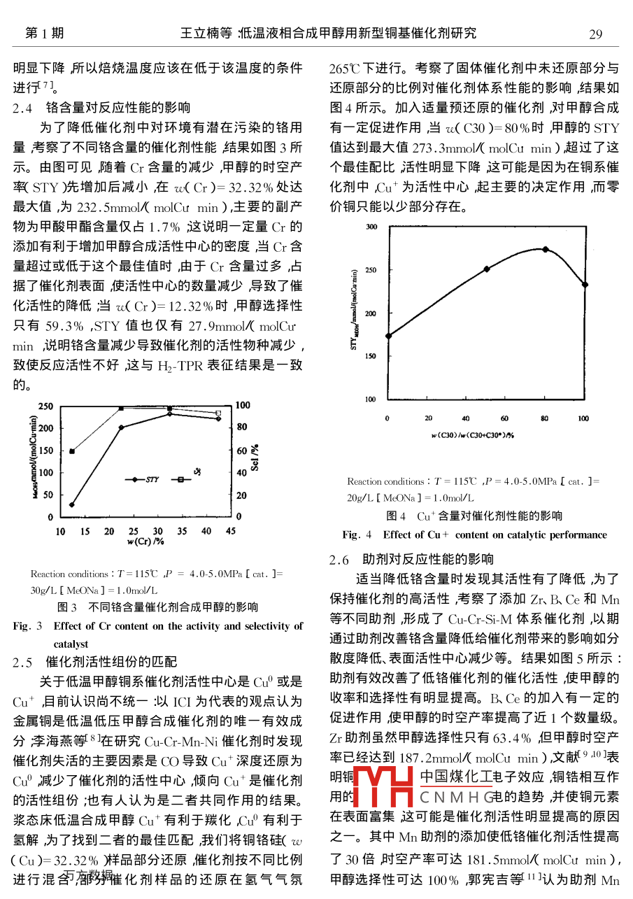 第1期王立楠等牴溫液相合成甲醇用新型銅基催化劑研究27低溫液相合成甲醇用新型銅基催化劑研究王立楠儲(chǔ)偉張雄偉徐士偉戴曉雁(四川大學(xué)化工學(xué)院四川成都610065)摘要應(yīng)用絡(luò)合共沉淀法制備了低溫液相合成甲醇用新型銅鉻硅催化劑并采用TPR、XRD和TG等表征手段對(duì)催化劑的結(jié)構(gòu)進(jìn)行了表征考察了鉻含量、催化助劑以及活性中心價(jià)態(tài)對(duì)催化劑活性影響。結(jié)果表明,當(dāng)α(Cr)=32.32%時(shí)最優(yōu)甲醇的時(shí)空產(chǎn)率可達(dá)232.5mmol( molCu min)減Cr)=12.32%時(shí)助劑Zr、Mn的添加使甲醇收率提高30倍。關(guān)鍵詞πuCrS催化劑泜溫甲醇合成湶態(tài)床摧化助劑結(jié)構(gòu)表征中圖分類號(hào)643文獻(xiàn)標(biāo)識(shí)碼文章編號(hào):1001-92192005)1-27-040前言1實(shí)驗(yàn)部分甲醇作為消費(fèi)量?jī)H次于乙烯、丙烯和苯的第41.1催化劑的制備大有機(jī)基本化工原料有著廣泛的用途。據(jù)預(yù)計(jì),由銅氨絡(luò)離子出發(fā)采用絡(luò)合共沉淀法制備催2005年全球市場(chǎng)需求量為3190萬(wàn)t2010年將達(dá)化劑36,定量的硅酸鈉和重鉻酸氨混合溶液在4266萬(wàn)。大規(guī)模使用甲醇所面臨的主要問(wèn)題是降電磁攪拌器上加熱到50℃將銅氨絡(luò)合溶液緩慢滴低生產(chǎn)成本而現(xiàn)有工業(yè)合成工藝都采用ICI技術(shù)加至混合溶液中,然后加入的助劑鹽(按氧化物為基礎(chǔ)的氣相法操作條件相當(dāng)苛刻單程轉(zhuǎn)化率10%計(jì)量)強(qiáng)力攪拌沉淀45min后用體積比1:1的低且產(chǎn)品含水分離能耗高導(dǎo)致甲醇的成本較高。稀硝酸調(diào)節(jié)pH值為6.0左右常溫下攪拌老化4h而低溫液相合成甲醇克服了上述缺點(diǎn)、O單程轉(zhuǎn)再經(jīng)抽濾、洗滌、干燥、研磨最后在氮?dú)鈿夥?50℃化率達(dá)到90%以上,且甲醇選擇性好、投資與電耗焙燒4h即得反應(yīng)用催化劑。低、產(chǎn)品純度高因而可以顯著降低生產(chǎn)成本提高表1催化劑一覽表市場(chǎng)競(jìng)爭(zhēng)力13。Table I The listing of catalysts目前低溫液相合成甲醇研究較多的是鎳系和催化劑鉻含量助劑及含量銅系催化劑銅系催化劑克服了鎳系易中毒的缺點(diǎn)編號(hào)樣品mass %omass %o受到了廣泛重視。銅鉻催化劑雖然初活性高但不CuRv asi12.32夠穩(wěn)定儲(chǔ)偉等45成功研制了攙雜第3組份Si或A的復(fù)合氧化物催化劑改善了銅鉻催化劑的穩(wěn)定32.32C30CuCr33Si還原性。本文在前期工作的基礎(chǔ)上添加Zr、Mn、Ce、BCuCra2 3?Si等不同助劑降低了環(huán)境不友好的鉻用量改善了催uCri. 32Si化劑的活性同時(shí)研究了活性物種匹配對(duì)催化劑性C10-Ce12.32C10-Mn能的影響。C10-Zv凵中國(guó)煤化工CNMHG催化劑的活性評(píng)價(jià)在三相漿態(tài)床帶有磁力驅(qū)動(dòng)收稿日期:2004-09-09;基金來(lái)源:國(guó)家自然科學(xué)基金攪拌器的250m間歇反應(yīng)釜中進(jìn)行,二甲苯作溶(299301.973國(guó)家重點(diǎn)基礎(chǔ)研究發(fā)展規(guī)劃項(xiàng)目分題資劑。所用合成氣n(H2yn(CO)=2.0,反應(yīng)溫度助推惹酒鄱密、100)1生聯(lián)系人電話03115℃、反應(yīng)壓力4.0~5.0MPa。反應(yīng)產(chǎn)物用28天然氣化工2005年第30卷〔C200氣相色譜儀分析色譜柱為GDX-103,甲醇形式存在焙燒后的催化劑表面有較弱的CuO和收率及產(chǎn)物選擇性根據(jù)物料平衡計(jì)算。CuCao2的衍射峰,說(shuō)明催化劑中Cu主要以Cu2O1.3催化劑的表征和CuCO2晶體存在而用氫氣還原后的催化劑只催化劑程序升溫還原H2-TPR在固定床流動(dòng)檢測(cè)到少量的CuCO2其余銅大部分都被還原了。反應(yīng)器中進(jìn)行將100mg的催化劑樣品置于內(nèi)徑為結(jié)合文獻(xiàn)認(rèn)為在低溫液相合成甲醇中起主要活性5mm的石英管中,載氣為體積含量2.69%H的的物種是 CuCaoH/N2混合氣流量為23ml/min,以5℃/min的升溫速率從室溫升至480℃。XRD表征在日本理學(xué)株o-C.CO式會(huì)社 X pert pro MPD飛利浦X射線衍射儀上進(jìn)行Cu靶,石墨單色器,管電壓40kV,管電流40mA測(cè)試范圍2θ=20~70°。熱重分析在 PerkinElmer Tga7型熱重分析儀上進(jìn)行升溫速率為2/10℃/min樣品用量為14-20mgN2氣氛中進(jìn)行,溫度范圍為50℃到650℃。圖1銅鉻硅催化劑還原前后的RD圖譜Fig. 1 XRD curves of Cu-Cr-Si catalysts2結(jié)果與討論2.3熱重分析2.1不同鉻含量催化劑的H2TPR表征圖2為干燥后未焙燒的c(Cr)=32.32%和表2為不同鉻含量催化劑的TPR表征數(shù)據(jù)當(dāng)12.32%的兩個(gè) Cu-Cr-Si催化劑熱重曲線,二者很α((r)=42.32%和32.32%時(shí)峰面積較大且峰較相似:均有3個(gè)失重峰,其中第1個(gè)失重峰都在高同時(shí)鉻的加入改變了銅和載體二氧化硅的作用70℃左右,其失重質(zhì)量分?jǐn)?shù)分別為4.730%和狀態(tài)當(dāng)x(Cr)=32.32%時(shí)具其還原溫度降低說(shuō)9,95%該峰可能是催化劑前體失去內(nèi)部水所致;明銅和載體的相互作用減弱還原活化能降低使催第2個(gè)失重峰為催化劑的主要分解峰,可能是催化化劑更容易還原了。隨著Cr含量的進(jìn)一步降低催劑前體CuCr2O分解時(shí)放出氧氣而引起的失重,此化劑的還原峰面積大幅度減小催化劑還原峰明顯階段失重量的大小將直接影響催化劑的性能該峰后移。文獻(xiàn)6認(rèn)為催化劑的還原峰與催化劑的活分別為284℃、307℃,其失重質(zhì)量分?jǐn)?shù)分別為