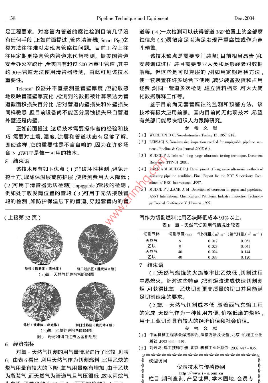 2004年技本5設(shè)奮2004第6期Pipeline Technique and EquipmentNo 6氧-天然氣切割工藝的研究與應(yīng)用楊國(guó)輝湖南工學(xué)院機(jī)械工程系湖南衡陽(yáng)421011)摘要炌介紹了氧-天然氣切割各項(xiàng)工藝指標(biāo)的試驗(yàn)情況。試驗(yàn)結(jié)果表明:采用合適的切割噴嘴及割前預(yù)熱等措施氧-天然氣切割工藝能滿足一般的切割質(zhì)量和切割效率要求且切斷成本較低與氧乙炔切斷工藝相比在經(jīng)濟(jì)效益方面具有顯著的優(yōu)勢(shì)。關(guān)鍵詞氧-天然氣切割江藝中圖分類號(hào)貍G482.3文獻(xiàn)標(biāo)識(shí)碼文章編號(hào):1004-96142004)6-0031-02Study and Application of Oxygen/Natural Gas Cutting TechniqueYang Guo-hiDeparment of Mechanical Engineering Hunan Institute of Technology Hengyang 421011 China)Abstract Introduced the test circumstance of various technological targets in the process of cutting with oxygen-natural gas. The re-sult shows that the cutting quality and efficiency can generally be obtained through selecting the suitable spray nozzle and using preheatng measure before cutting and the cost is so lower that the cost of oxygen/natural gas has the notable popularized and applied value inconlonKey words .Oxygen/ Natural Gas tuttingProcess1引言2天然氣與乙炔的比較鋼材的切割工藝除氧乙炔外還有等離子、氧丙天然氣是一種無(wú)色無(wú)味透明的可燃?xì)怏w,其主烷等但采用夭然氣做切割燃料的報(bào)道較少。國(guó)內(nèi)天要成分是甲烷CH4)取樣分析的結(jié)果見(jiàn)表1。然氣資源非常豐富價(jià)格低廉。隨著西氣東輸工程的表1天然氣的成分表建成天然氣在工業(yè)上的大量應(yīng)用將成為可能用天然氣代替耗能大、成本高的乙炔進(jìn)行鋼材的切割,可89.98-∞.86.6-5.691.72-1.540.560.40.070.170.3以產(chǎn)生較好的經(jīng)濟(jì)效益和社會(huì)效益。天然氣的主要性能與乙炔的比較見(jiàn)表2。表2天然氣、乙炔的主要性能體積質(zhì)量最低發(fā)熱值1m3氣體燃燒所需氧化量/爆炸限度/%與氧混合的氣體(×10-4gcm-3)(kJm-3)在焊炬中完全燃燒在空氣中在氧化中火焰溫度/℃天然氣6.156-6.154376817500-8500)5.2-13.81152963(12600)2.52.8-80.72.8-933100-3350由表2可知天然氣的有效熱值比乙炔低火焰能降低氣體的流出速度增加單位時(shí)間內(nèi)所燃燒的天然率比乙炔小燃燒速度比乙炔慢這給使用天然氣氣氣數(shù)量提高燃燒溫度。改進(jìn)方法有二種:擴(kuò)大混合割造成一定的困難。另一方面天然氣在空氣中的爆室的孔徑及擴(kuò)大外噴嘴內(nèi)徑。現(xiàn)采用第二種方法根炸范圍小燃燒速度慢。因此爆炸、回火的可能性比據(jù)切割厚度將外噴嘴內(nèi)徑擴(kuò)成不同旳孔徑。結(jié)構(gòu)形乙炔小使用天然氣的安全性比乙炔高。狀及有關(guān)尺寸見(jiàn)圖1。3割炬的改進(jìn)穩(wěn)定段、收縮段由于天然氣火焰能率小,溫度低。而一般割炬氧(初始膨脹《過(guò)渡)孔道為直孔型其允許工作壓力低氧流出口速度慢渦流大不能滿足使用要求必須加以改進(jìn)。割炬改進(jìn)的方法比較簡(jiǎn)單主要是擴(kuò)大混合室的噴口截面圖1改進(jìn)的切割噴嘴Pipeline Technique and EquipmentDec.2004噴嘴改制后,天然氣切斷火焰燃燒正常,沒(méi)有表4切割規(guī)范參數(shù)時(shí),切割口太寬;而采用小口徑噴嘴切割大厚度鋼氣體試件板慶外嘜嘴天然氧氣氧氣預(yù)熱切割切口脫火現(xiàn)象。試驗(yàn)表明:當(dāng)采用大口徑噴嘴切割薄板孔徑氣流量流量壓力時(shí)間速度寬度編號(hào)/mm板時(shí),預(yù)熱加切割時(shí)間減慢,切口不齊,甚至不能11400正常切割,因此,噴嘴孔徑必須與切割厚度相適應(yīng)1-294.06.33143-4124302-3才能獲得良好的切割質(zhì)量。為了提高切割效率,試4.06,4012.33~4用了如圖2所示的快速切割噴嘴。該割嘴芯周圍深淺4.56.32184-6404.55,42184-6251424~5切割氧孔道是利用了拉瓦爾噴管形的原理里當(dāng)具有乙2-:0421233502:3定壓力的氣流經(jīng)穩(wěn)定段均化、并經(jīng)收縮段加速后,4.511.23204~68160至喉部時(shí)達(dá)到臨界速度,然后氣流在擴(kuò)散段擴(kuò)散及注管道天然氣壓力很低故未列出僅以流量表示。膨脹可使高壓切割氧流加速而獲得接近于音速的高5切口質(zhì)量速度。這樣,預(yù)熱時(shí)間大為縮短,切割速度明顯加1外觀檢查快,切割質(zhì)量顯著改善。以切割厚度為40m的低碳切口表面比較光滑拖線稍有凹凸,上部邊緣銳鋼為例,預(yù)熱時(shí)間縮短為10s左右,切割速度達(dá)到利,下部熔渣氧化物容易清除。與氧-乙炔切割相比切口表面光潔度可提高一級(jí)達(dá)ⅴ4~5級(jí)沏口寬240 mm/min度與氧-乙炔切口寬度相同。氧-天然氣切割用于切割焊接坡口,可獲得良好的切割質(zhì)量。5.2切口表面硬度及含碳量氧-天然氣切割的切口表面硬度及含碳量見(jiàn)表5。氧-天然氣切割的切口硬度比氧-乙快切割的切口表面硬度略低而切口表面含碳量也低于基本金屬2快速割嘴結(jié)構(gòu)圖的含碳量。由于氧-天然氣切割時(shí)火焰氧化性較強(qiáng),切割氧孔道的直徑取決于鋼板厚度鋼板厚度越碳的燒損較大因而切口表面硬度和含碳量都有所降大則切割氧孔道的直徑也應(yīng)越大見(jiàn)表3。切割氧的低出囗流速用馬赫數(shù)M表示∶氣流速度與音速之比)表5切口表面硬度及含量則取決于切割氧供氣壓力和切割速度,般M=2.0或以下當(dāng)要求切割速度更高時(shí)可選M=2.5