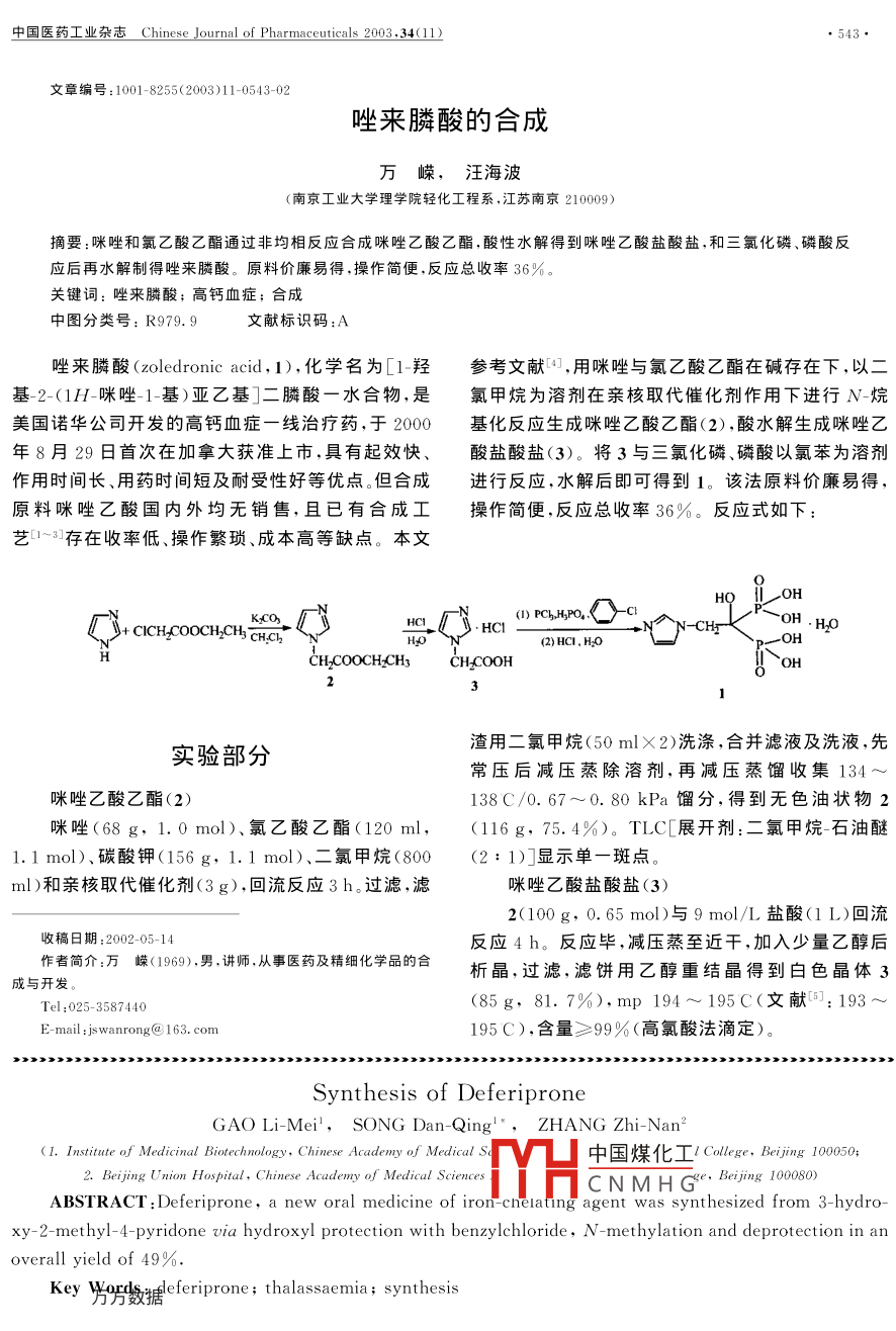 中國(guó)醫(yī)藥工業(yè)雜志Chinese Journal of Pharmaceuticals 2003.34(11)●543●文章編號(hào):1001-8255(2003)11-0543-02唑來(lái)膦酸的合成萬(wàn)嶸,汪海波(南京工業(yè)大學(xué)理學(xué)院輕化工程系,江蘇南京210009)摘要:咪唑和氯乙酸乙酯通過(guò)非均相反應(yīng)合成咪唑乙酸乙酯,酸性水解得到咪唑乙酸鹽酸鹽,和三氯化磷、磷酸反應(yīng)后再水解制得唑來(lái)膦酸。原料價(jià)廉易得.操作簡(jiǎn)便,反應(yīng)總收率36%。關(guān)鍵詞:唑來(lái)膦酸;高鈣血癥;合成中圖分類號(hào): R979. 9文獻(xiàn)標(biāo)識(shí)碼:A唑來(lái)膦酸(zoledronic acid,1),化學(xué)名為[1-羥參考文獻(xiàn)[4],用咪唑與氯乙酸乙酯在堿存在下,以二基-2-(1H-咪唑- 1基)亞乙基]二膦酸- -水合物,是氯甲烷為溶劑在親核取代催化劑作用下進(jìn)行N-烷美國(guó)諾華公司開(kāi)發(fā)的高鈣血癥-線治療藥,于2000 .基化反應(yīng)生成咪唑乙酸乙酯(2),酸水解生成咪唑乙年8月29日首次在加拿大獲準(zhǔn)上市,具有起效快、酸鹽酸鹽(3)。將3與三氯化磷、磷酸以氯苯為溶劑作用時(shí)間長(zhǎng)、用藥時(shí)間短及耐受性好等優(yōu)點(diǎn)。但合成進(jìn)行反應(yīng),水解后即可得到1。該法原料價(jià)廉易得,原料咪唑乙酸國(guó)內(nèi)外均無(wú)銷(xiāo)售,且已有合成工操作簡(jiǎn)便,反應(yīng)總收率36%。反應(yīng)式如下:藝[~3]存在收率低、操作繁瑣、成本高等缺點(diǎn)。本文HQOHK_CO,CyHC() PC,Hro.(_)-a:N- -CH5. H20H2O.(2)HCI. H2OHCH2COOCHLCH3CHCO0H23渣用二氯甲烷(50 mlX2)洗滌,合并濾液及洗液,先實(shí)驗(yàn)部分常壓后減壓蒸除溶劑,再減壓蒸餾收集134~咪唑乙酸乙酯(2)138C/0.67~0. 80 kPa餾分,得到無(wú)色油狀物2咪唑(68 g,1. 0 mol)、氯乙酸乙酯(120 ml,(116 g, 75. 4%)。TLC[展開(kāi)劑:二氯甲烷石油醚1.1 mol)、碳酸鉀(156 g, 1.1 mol)、二氯甲烷(800(2:1)]顯示單一斑點(diǎn)。ml )和親核取代催化劑(3g),回流反應(yīng)3h。過(guò)濾,濾咪唑乙酸鹽酸鹽(3)2(100g, 0.65 mol)與9 mol/L鹽酸(1 L)回流收稿日期:2002 05-14.反應(yīng)4 h。反應(yīng)畢,減壓蒸至近干,加入少量乙醇后作者簡(jiǎn)介:萬(wàn)嶸(1969),男. 講師,從事醫(yī)藥及精細(xì)化學(xué)品的合析晶,過(guò)濾,濾餅用乙醇重結(jié)晶得到白色晶體3成與開(kāi)發(fā)。Tel :025- 3587440(85g,81. 7%),mp 194~ 195C(文獻(xiàn)印]: 193 ~E- mail :jswanrong@ 163. com195 C),含量≥99% (高氯酸法滴定)。Synthesis of DeferiproneGAO Li-Mei,SONG Dan- Qing'*ZHANG Zhi-Nan2(1. Institute of Medicinal Biotechnology, Chinese Academy of Medical S中國(guó)煤化工1 College, Beijing 100050;2 Beijing Union Hospital,Chinese Academy of Medical Sciences .MHCNMHG*. Brjin 100ABSTRACT:Deferiprone, a new oral medicine of iron-cnelauing agent was synthesized from 3- -hydro-xy- 2- methyl-4- pyridone via hydroxyl protection with benzylchloride, N- methylation and deprotection in anoverall yield of 49%.Key Weferiprone ; thalassaemia; synthesis●544●中國(guó)醫(yī)藥工業(yè)雜志Chinese Journal of Pharmaceuticals 2003 .34(11)唑來(lái)膦酸(1)大學(xué)學(xué)報(bào)(自然科學(xué)版), 1987 , 26<6):723-727.3(80g, 0.5 mol)、磷酸(40ml, 0. 6 mol)、三氯[2] Gil s, Zaderenzo P, Cruz F, et al. lmidazol-1-ylalka-化磷(80 ml, 0. 9 mol)和氯苯(240 ml),于100C反noic acids as extrinsic HNMR probes for the determi-nation of intracellular pH,extracellular pH and cell .應(yīng)2 h。分液除去氯苯,加入9 mol/L鹽酸(240 ml,volume[J ]. Bioorg Med Chem ,1994,2(5):305-314.2.16 mol),回流3h。反應(yīng)畢加入活性炭脫色,濾液鄭志兵,謝云德,李松.2-(1- 咪唑基)乙酸的新法合冷卻后加入丙酮(1500ml),析晶后過(guò)濾,得白色粉成[J].中國(guó)醫(yī)藥工業(yè)雜志.2003.34(10):494.末狀粗品,用水重結(jié)晶后干燥至恒重,得白色晶體1汪海波.反應(yīng)型阻燃劑四氯對(duì)苯二酚衍生物的合成及(84.8 g, 58. 5%),mp 237~239C(文獻(xiàn)[6]:收率在不飽和樹(shù)脂中的應(yīng)用[J].精細(xì)化工,2000,17:729-41%,mp 239C),含量≥99%(HPLC歸一化法)。732.元素分析(C;HpN2O,Pe●H.O)實(shí)測(cè)值(理論值)/%:C20. 71(20. 70), H 4. 15(4. 17),N 9. 56(9.66),P 21. 35(21.proved and convenient procedure for the synthesis of35)。HNMR(0. 01 mol/L NaOH的D.O溶液)8:4.30(t,1-substituted imidazoles[J]. Chem Pharm Bull, 1983,2H,CH2) ,6.72(s,1H,"CH),7. 08(s,1H, 'CH),7.58(s,1H,31(4):1213- 1221."CH)。[6] Jaeggi KA, Widler L. Preparation of substitutedheterocyclylalkylidenediphos phonic acid as calcium參考文獻(xiàn):metabolism regulators [P]. US: 4939130, 1990- 07-03.[1]陳安齊,廖聯(lián)安.N-1-烷基咪唑衍生物的合成[J].廈門(mén)(CA 1991,114:P62355)Synthesis of Zoledronic AcidWAN Rong,WANG Hai-Bo(Dept. of Light Chemical Engineering, College of Sciences, Nanjing University of Technology, Nanjing 210009)ABSTRACT:Zoledronic acid was synthesized from imidazole and ethyl chloroacetate by heterogeneousreaction and hydrolysis to give imidazol- 1 -acetic acid hydrochloride which reacted with phosphorus trichlo-ride and phosphoric acid followed by hydrolysis with an overall yield of 36%.Key Words : zoledronic acid; hypercalcemia of malignancy (HCM); synthesis消息世界制藥原料中國(guó)展(CPhIChina2003)吸引全球目光由歐洲博聞?dòng)邢薰竞椭袊?guó)醫(yī)藥保健品進(jìn)出口商會(huì)主辦、上海博華國(guó)際展覽有限公司協(xié)辦的“2003年世界制藥原料中國(guó)展(CPhI China 2003)”將于2003年12月8日至10日在上海光大會(huì)展中心隆重登場(chǎng)。現(xiàn)已有來(lái)自美國(guó)、法國(guó)、英國(guó)、德國(guó)、日本等20多個(gè)國(guó)家的近100