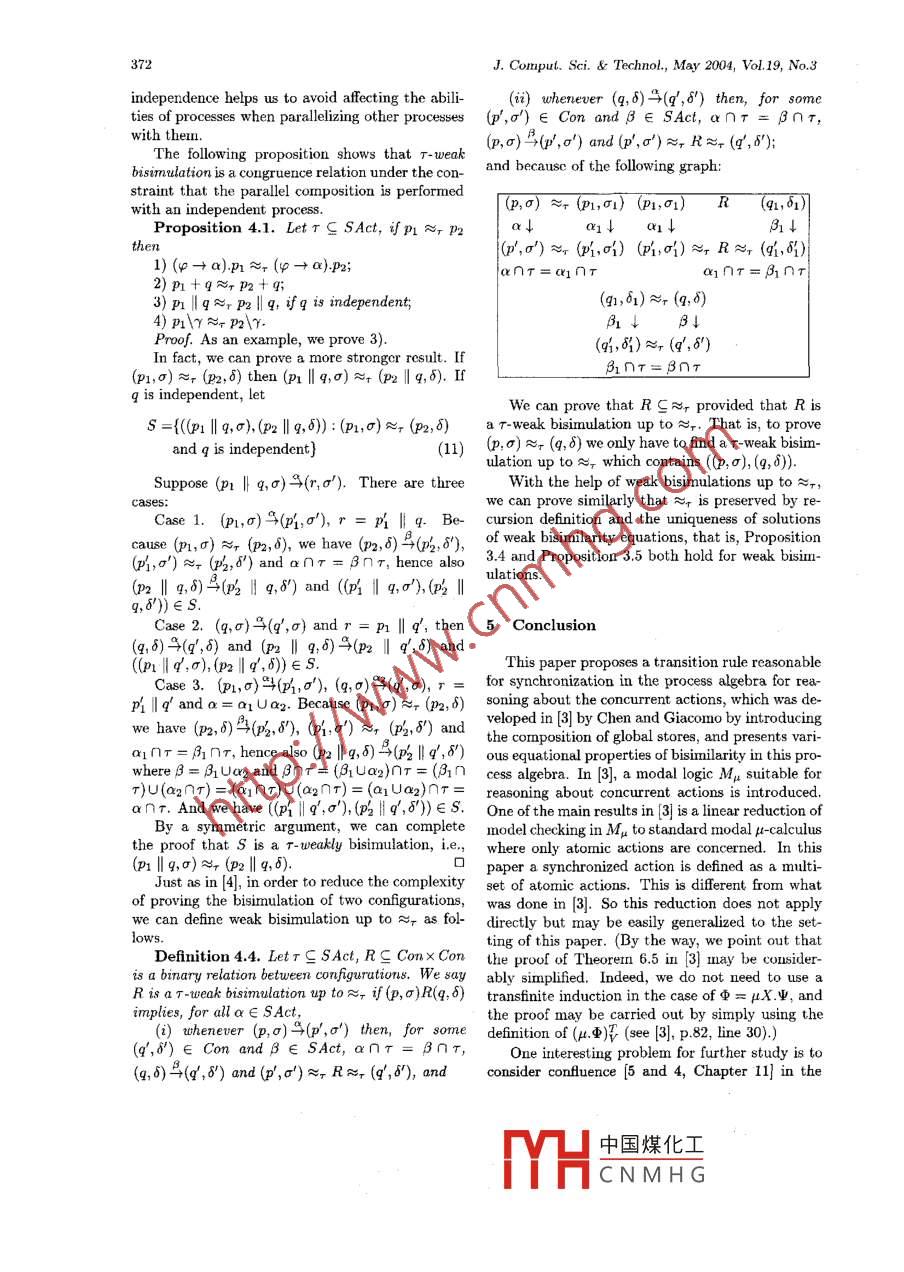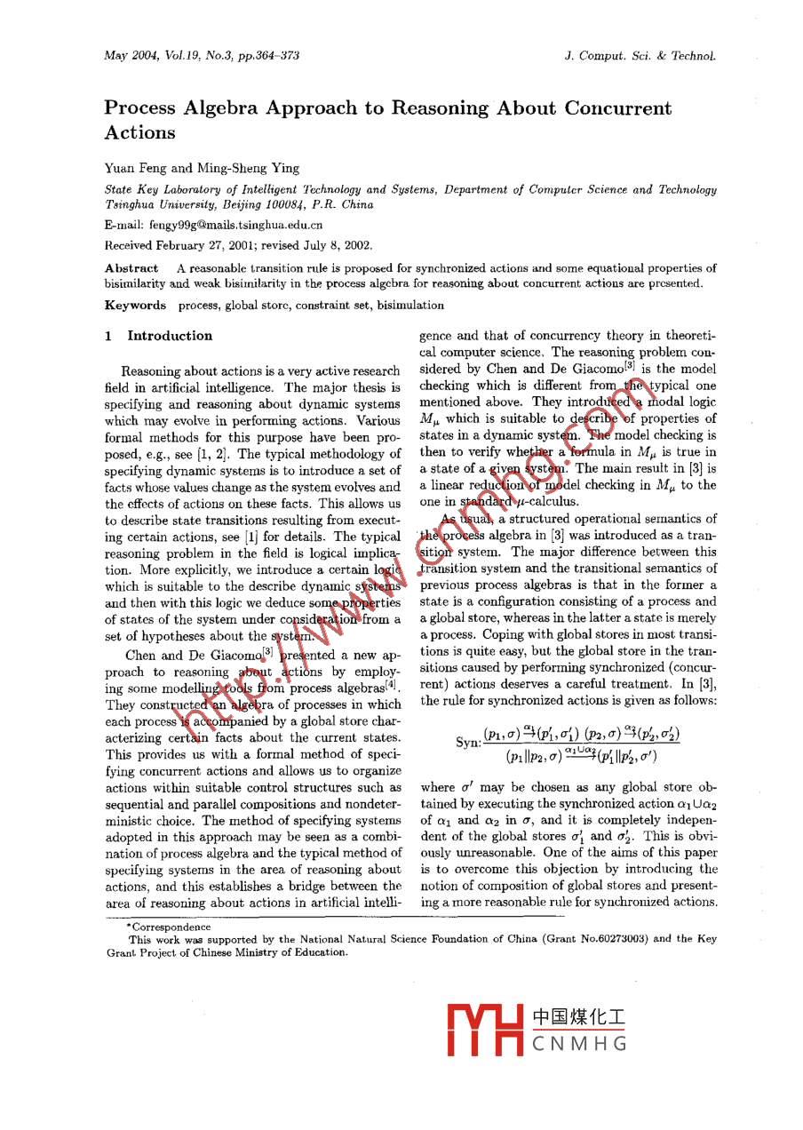 May 2004, Vol. 19, No.3, pp.364- 373J. Comput. Sci. & Technol.Process Algebra Approach to Reasoning About ConcurrentActionsYuan Feng and Ming Sheng YingState Key Laboratory of Inteligent Technology and Systemns, Department of Compuler Science and TechnologyTainghua University, Beijing 100084, P.R. ChinaE-mail: fengy99g@mails.tsinghua. edu.cnReceived February 27, 2001; revised July 8, 2002.Abstract A reasonable Lransition rule is proposed for synchronized actions and some equatioual properties ofbisimilarity and weak bisirnilarity in the process algebra for reasoning about concurrent actious are presented.Keywords process, global storc, constraint set, bisimulation1 Introductiongence and that of concurrency theory in theoreti-cal computer science. The reasoning problem con-Reasoning about actions is a very active research sidered by Chen and De Giacomol3) is the modelfield in artificial intelligence. The major thesis ischecking which is different from the typical onespecifying and reasoning about dynamic systersmentioned above. They introduced a modal logicwhich may evolve in perforning actions. Various Mμ which is suitable to describe of properties offormal methods for this purpose have been pro- states in a dynamic system. The model checking isposed, e.g., see [i, 2]. The typical methodology of then to verify whether a formula in Mu is true inspeifying dynamic systems is to introduce a set of a state of a given system. The main result in [3)] isfacts whose values change as the system evolves and a linear reduction of model checking in Mu to thethe cffects of actions on these facts. This allows usone in standard pu-calculus.to describe state transitions resulting from execut-As usual, a structured operational sermnantics ofing certain actions, see [1] for details. The typical' the process algebra in [3] was introduced as a tran-reasoning problem in the field is logical implica sition system. The major diference between thistion. More explicitly, we introduce a certain logic transition system and the transitional semantics ofwhich is suitable to the describe dynamic systemsprevious process algebras is that in the former aand then with this logic we deduce some properties state is a configuration consisting of a process andof states of the system under consideration from a a global store, whereas in the latter a state is merelyset of hypotheses about the system.a process. Coping with global stores in most transi-Chen and De Giacomols! presented a new ap-tions is quite easy, but the global store in the tran-proach to reasoning about actions by employ-sitions caused by performing synchronized (concur-ing some modelling tools from process algebrasA.rent) actions deserves a careful treatment. In [3],They constructed an algebra of proceses in which the rule for synchronized actions is given as folowseach process is accompanied by a global store char-acterizing certain facts about the current states.Sym: (n.,0)當(dāng)(0%,1) (02,0) (吆咀This provides us with a formal method of speci-(pl1lp2,0) of(I'p2,o°)fying concurrent actions and allows u8 to organizeactions within suitable control structures such as where σ' may be chosen a8 any global store ob-sequential and parallel compositions and nondeter-tained by executing the synchronized action 01 UQ2ministic choice. The method of specifying systems of a1 and a2 in σ, and it is completely indepen-adopted in this approach may be seen as a combi- dent of the global stores σ1 and 02. This is obvi-nation of process algebra and the typical method of ously unreasonable. One of the aims of this paperspecifying systems in the area of reasoning about is to overcome this objection by introducing theactions, and this establishes a bridge between thenotion of composition of global stores and present-area of reasoning about actions in artificial intelli- ing a more reasonable rule for synchronized actions.*CorrespondenceThis work was supported by the National Natural Science Foundation of China (Grant No.60273003) and the KeyGrant Project of Chinese Ministry of Education.中國(guó)煤化工MYHCNMHGYuan Feng et al: Reasoning About Concurrent Actions365A bisimulation equivalence between processes was cussed in the previous process algebras, which willintroduced in [3], but algebraic properties of this be briefly presented in Subsection 2.3. A globalequivalence were ignored because the main purpose store is intended to describe certain properties ofwas to give a reduction from model checking in Mp the current state, and it may change as the systemto model checking in standard pu-calculus. As an evolves. To describe the change of a global store,addendum, various algebraic properties of bisimu- the notion of update of global store is introduced inlation in the process algebra in [3] are exploited in Subsection 2.1. The evolution of a system happensthis paper.in performing an action. We assume a set of atomicThe issue of equivalent descriptions is very im- actions. A synchronized (concurrent) action exe-portant for the representation of and reasoning on cuted by a system composed of several (concurrent)dynamic systems. In the context of process alge- subsysterms is usully treated as a certain combina-bras, the equivalence of the two descriptions of the tion of some atomic actions. In [3], a synchronizedsame system has been well investigated and vari- action is defined as a set of atomic action, but inous tools have been implemented for verifying the this paper we need a slightly generalized conceptequivalences. A question that naturally arises is of synchronized action. In Subsection 2.2, a syn-when the two descriptions of a dynamic system can chronized action is defined as a multiset of atomicbe considered equivalent. We adopt here the most actions, and its effect on a global store is discussed.popular notion of equivalence that has been pro-posed in the process algebra: bisimulation equiva- 2.1 Updates of Global Storeslence. Roughly speaking, two systems 
