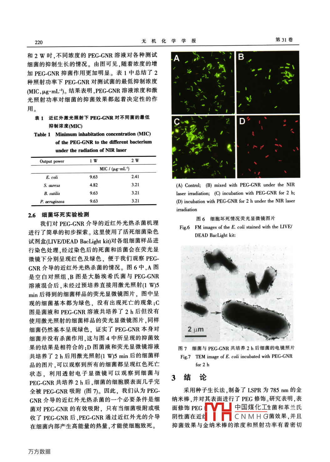 第31卷第2期Vol.31 No.22015年2月CHINESE JOURNAL OF INORCANIC CHEMISTRY215-221聚乙二醇-金納米棒介導(dǎo)的近紅外光熱抑菌作用馮曉燕陳瑩*劉玉鵬王春鵬儲富祥(中國林業(yè)科學(xué)研究院林產(chǎn)化學(xué)工業(yè)研究所;生物質(zhì)化學(xué)利用國家工程實驗室;國家林業(yè)局林產(chǎn)化學(xué)工程重點開放性實驗室;江蘇省生物質(zhì)能源與材料重點實驗室,南京210042)摘要:種子生長法合成縱向表面等離子體共振吸收峰為785nm的金納米棒,并對其表面進(jìn)行聚乙二醇(PEG)修飾,研究了表面修飾PEG的金納米樺(polyethylene glycol modifed gold nanorods , PEG-GNR)的光熱轉(zhuǎn)化效應(yīng),并測試了其細(xì)胞毒性。以革蘭氏陽性菌金黃色葡萄球菌蠟狀芽孢桿菌,革蘭氏陰性菌大腸埃希氏菌及銅綠假單胞菌為細(xì)菌模型,詳細(xì)研究了PEC-GNR在808nm波長近紅外激光照射下金納米棒濃度和照射功率對抑菌效果的影響。結(jié)果表明,PEG-CNR對革蘭氏陽性菌和革蘭氏陰性菌在近紅外照射下均有較好的抑菌效果,并且抑菌效果與金納米棒的濃度和照射功率有著密切的關(guān)系;結(jié)合熒光顯微鏡和透射電子顯微鏡對細(xì)菌壞死狀況的觀察,初步證實細(xì)菌對PEG-GNR有效吸收是近紅外光熱殺菌的關(guān)鍵因素。關(guān)鍵詞:金納米棒; PEG修飾;光熱抑菌中圖分類號: TQ131.2文獻(xiàn)標(biāo)識碼: A文章編號: 1001-4861(2015)02-0215-07DOI: 10.1 1862/CJIC.2015.059Near-IR Photothermal Antibacterial Effects of PolyethyleneGlycol (PEG) Modified Gold NanorodsFENG Xiao-Yan CHEN Ying* LU Yu-Peng WANG Chun-Peng CHU Fu-Xiang(Institute of Chemical Industry of Forestry Products, CAF China; Key Laboratory of Biomass Energy and Material,Jiangsu Province China; National Engineering Laboratory for Biomass Chemical Utilization China;Key and Open Laboratory on Forest Chemical Engineering, SFA, Nanjing 210042, China)Abstract: Gold nanorods (CNR) with longitudinal surface plasma resonance (LSPR) absorption at 785 nm weresynthesized by seed-mediated growth method and their surface was modified with polyethylene glycol (PEG)macromolecular (PEG-GNR). The photothermal conversion effect and cytotoxicity of PEG-GNR were investigated.Different bacteria, including gram-positive bacterium Staphylococcus aureus and Bacillus cereus, gram- negativebacterium Escherichia coli and Pse udomonas aeruginosa were used to analyze the influences of concentration ofPEG-GNR and laser output power on the inhibition effects. The results show that the PEG-GNR has goodantibacterial properties for both Gram positive and negative bacterium under the radiation of near-IR laser. Theconcentration of PEG-GNR and laser output power determined antibacterial effects of the PEG-GNR. Thepreliminary investigation on the antibacterial mechanism was explored by studying of bacteria apoptosis statuswith fluorescence microscope and transmission electronic microscope, suggesting that the effective absorption ofthe PEG GNR by the cells is one of the key factors in the process of photothermal antibiosis.Key words: gold nanorod; PEG modifed; photothermal antibacterial efet收稿日期:2014-04-21。收修改稿日期:2014-12-02。中國煤化工中央級公益性科研院所基本科研業(yè)務(wù)費專項資金(No.CAFINT2010K04),國家自然科然科學(xué)基金(No.BK20131071)資 助項目。TYHCNMHG“通訊聯(lián)系人。E-mail:yingchencaf@gmail.com216無機化學(xué)學(xué)報第31卷細(xì)菌的耐藥性已成為全球醫(yī)療領(lǐng)域中倍受關(guān)血酸、巰基化的聚乙二醇(mPEGoorSH)為國產(chǎn)分析注的問題,多藥耐藥性細(xì)菌的出現(xiàn)嚴(yán)重威脅著人類純試劑;活死細(xì)胞試劑盒(LIVE/DEAD BacLight kit,的健康12。人們?yōu)E用抗生素導(dǎo)致多藥耐藥細(xì)菌的種美國);金黃色葡萄球菌(Staphylococcus aureus ,S.類越來越多,現(xiàn)有抗菌藥物的療效越來越小,這是aureus ,CICC10384)、蠟狀芽孢桿菌(Bacillus cereus ,人類公共保健領(lǐng)域面臨的最大挑戰(zhàn)之---。激光光熱B. cereus ,CICC10352)、大腸埃希氏菌(Escherichia coli,療法是利用外加能量在含有病變的組織中產(chǎn)生一E. coli ,CICC10354)和銅綠假單胞菌(Pseudomonas定范圍的高溫,達(dá)到殺死病原體細(xì)胞而不傷害正常aeruginosa,P. aeruginosa,CICC10351)購自 中國工業(yè)細(xì)胞的目的30,由于沒有特異性的靶目標(biāo),因而不.微生物菌種保藏管理中心。易產(chǎn)生耐藥性。用于光熱療法的激光主要使用可見儀器:紫外可見分光光度計(UV-1800SPECT-光激光,但由于該波段激光對組織的穿透有限,因ROPHOTOMETER,上海美譜達(dá))、透射電子顯微鏡此激光熱療法具有一定的局限性[。近年來研究報(TEM JEOL-1010, 日本)、酶標(biāo)儀(ChroMa4300,美道,利用光熱轉(zhuǎn)換材料,如有機光熱染料吲哚菁綠國)、Zeta電位分析儀(Zetasizer nano zS,MALVERN,或者貴金屬和碳納米材料,能夠選擇性地增強病變英國)、近紅外光激光器(LE-LS-808-3000TFCA,深圳部位的熱損傷從而提高治療效果811。眾所周知,金理歐光電公司)、熒光顯微鏡(OlympusX81,日本)。納米棒是一類經(jīng)典的光熱轉(zhuǎn)換材料,具有合適比率1.2 聚乙二醇(PEG)修飾金納米棒(PEG-GNR)的的金納米棒在近紅外區(qū)域?qū)す饽芰坑袕娏业奈苽涫招?yīng),選擇與金納米棒縱向表面等離子共振金納米棒溶液的制備7:6.25mL二次蒸餾水(LSPR)波長相匹配的近紅外激光作為光源,能夠誘中分別加入100 μL HAuCL(0.01 mol.L~)溶液,1.88導(dǎo)皮下深層組織的金納米棒顆粒產(chǎn)生熱效應(yīng),促使mL CTAB(0.2 mol.L)溶液,混合均勻后,再加入0.5細(xì)胞致死1-1。由于生