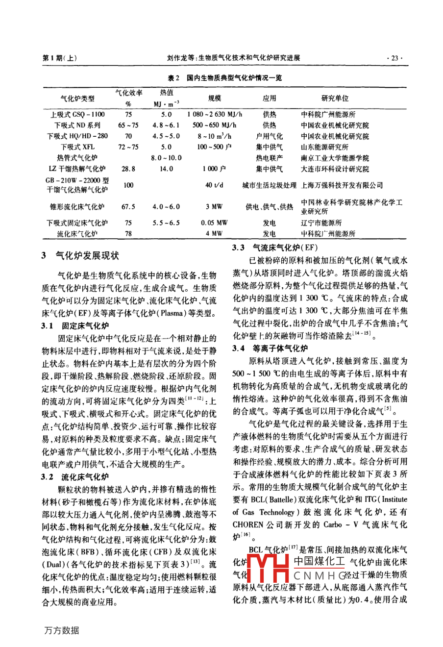 第1期(上)劉作龍等:生物質氣化技術和氣化爐研究進展21·綜述與述評·生物質氣化技術和氣化爐研究進展劉作龍,孫培勤,孫紹暉,陳俊武(鄭州大學化工與能源學院,河南鄭州450001)摘要:簡單介紹了生物質氣化的基本原理及生物質氣化爐的分類,闡逑了不同類型氣化爐的特點及技術指標。介紹了國內外生物質氣化技術在集中供氣、供熱和發(fā)電方面的發(fā)展現(xiàn)狀和應用情況,重點介紹了適用于大規(guī)模生物質氣化合成液體燃料的氣化爐;指出了生物質氣化技術需要解決的問題,提出了我國在生物質氣化領域的重點研究方向。關鍵詞:生物質;氣化爐;氣化;綜述中圖分類號:TK6文獻標識碼:A文章編號:1003-3467(2011)01-0021-04Present Research Status and Development of Biomass GasificationTechnologies and gasifiersLIU Zuo-long, SUN Pei-qin, SUN Shao-hui, CheN Jun-wuSchool of Chemical Engineering and Energy, Zhengzhou University 450001, China)Abstract: The basic principles and classification of biomass gasification are introduced, the characteristicsand technical indicators of different types of gasifiers are described. The technology research and applica-tion of biomas gasification in gas supply, heating supply, power generation domestic and overseas is illustrated. This paper focuses on the gasifier that can be used to large-scale biomass gasification syntheticiquid fuels. The problems that the biomass gasification technology needs to solve and the research direc-tion which the biomass gasification field at are pointed out.Key words: biomass; gasifier gasification review源是人類賴以生存和發(fā)展的基礎,隨著社會全燃燒使生物質裂解,變成小分子量的CO0、H2、經(jīng)濟的快速發(fā)展,人類對能源的需求也越來越大。CH4等可燃性氣體,在轉換過程中要加入氣化劑大量的開采和使用化石能源會污染環(huán)境和破壞生態(tài)(空氣、氧氣或水蒸氣)。由于生物質的特殊性質,平衡,開發(fā)和利用清潔的可再生能源已經(jīng)迫在眉睫,在氣化前還需要經(jīng)過干燥、破碎和切片等預處理過生物質是可以轉化為液體燃料的環(huán)境友好的可再生程。經(jīng)預處理的物質在氣化爐中約于600℃下能源,是僅次于煤炭、石油和天然氣而居于世界能源發(fā)生熱解反應,生成的氣體中包括解離氣體、氣化的消費總量第四位的能源。生物質氣化技術是清揮發(fā)分、H2、CO、CO2焦油和水蒸氣。由于生物質潔高效利用生物質能的有效途徑之一,生物質氣化中的揮發(fā)分含量(70%~80%,干基)遠高于煤炭技術除了可以用于發(fā)電供氣、供熱等方面外,還可(30%),所以生物質氣化的熱解反應比煤炭更為重以用于將各種生物質能轉化成為高品位的液體燃要。揮發(fā)分在氣相中的熱裂化反應可降低焦油料熱解反應的副產(chǎn)物是生成不揮發(fā)的焦炭和灰分。在氣化爐中的第二反應為焦炭與氧氣蒸汽反應,生成1生物質氣化原理H2、C算氣體土姑化的住巖燃燒為熱解反應生物質氣化是指將固體生物質加熱,進行不完提供中國煤化工CNMHG收稿日期:2010作者簡介:劉作龍(1984-),男碩士研究生;通訊作者:孫培勤(1963-),女教授電話:(0371)67781755河南化工22HENAN CHEMICAL INDUSTRY2011年第28卷廠和商業(yè)應用規(guī)模的氣化爐(見表1)。生物質氣化2生物質氣化技術的國內外發(fā)展現(xiàn)狀領域處于領先世界水平的國家有瑞典、丹麥、奧地2.1國外生物質氣化技術發(fā)展概況利、德國美國和加拿大等。瑞典和丹麥正在實行利生物質氣化技術早在18世紀就已出現(xiàn)第二次用生物質進行熱電聯(lián)產(chǎn)的計劃使生物質能在轉換世界大戰(zhàn)期間,為解決石油燃料的短缺,用于內燃機為高品位電能的同時滿足供熱的需求,可以大幅度的小型氣化裝置得到廣泛使用。20世紀五六十年提高其轉換效率。美國在利用生物質能發(fā)電方面處代,煤炭和石油等化石能源的廣泛應用,使能源短缺于世界領先地位。目前,美國生物質發(fā)電裝機總容問題得到暫時性的緩解。由于生物質氣化技術的不量已達10500MW,70%為生物質一煤混合燃燒氣完善和利用率低等原因,生物質氣化技術的發(fā)展和化技術,單機容量30-100MW發(fā)電成本3-6美應用產(chǎn)生了延滯。20世紀70年代,受石油危機的分/(kW·h),預計到2015年美國生物質發(fā)電裝機影響,世界各國再一次深該認識到化石能源的不可總容量將達16300MW。美國在生物質氣化合成再生性,重新開始了對生物質能源的開發(fā)和研究乙醇方面取得了很大的成就。歐盟國家在生物質氣經(jīng)過幾十年的發(fā)展歐美等國的生物質氣化技化合成柴油方面取得了很大的成就。2004年歐盟術取得∫很大的成就。生物質氣化設備規(guī)模較大,國家的生物質氣化合成柴油的產(chǎn)量達到224萬t,德自動化程度高,工藝較復雜,主要以供熱、發(fā)電和合國是歐盟最大的生物質氣化合成柴油生產(chǎn)國,2004成液體燃料為主,目前開發(fā)了多系列已達到示范工年的生產(chǎn)能力達到了109.7萬t。表1國外氣化爐應用情況一覽氣化爐類型原料效率/%規(guī)模/t·d-l應用美國 Taylor雙流化床氣化爐可降解垃圾和廢木料發(fā)電效率35~40300~400熱電聯(lián)產(chǎn)美國 Salvages雙流化床氣化爐發(fā)電效率35~40熱電聯(lián)產(chǎn)和柴油美國 Range Fuels氣流床氣化爐林業(yè)廢棄物、木材熱效率75乙醇或混合醇美國 Pearson氣流床氣化爐廢木料、鋸末、稻桿等熱效率70.5乙醇或混合醇德國 CHOREN氣流床氣化爐能