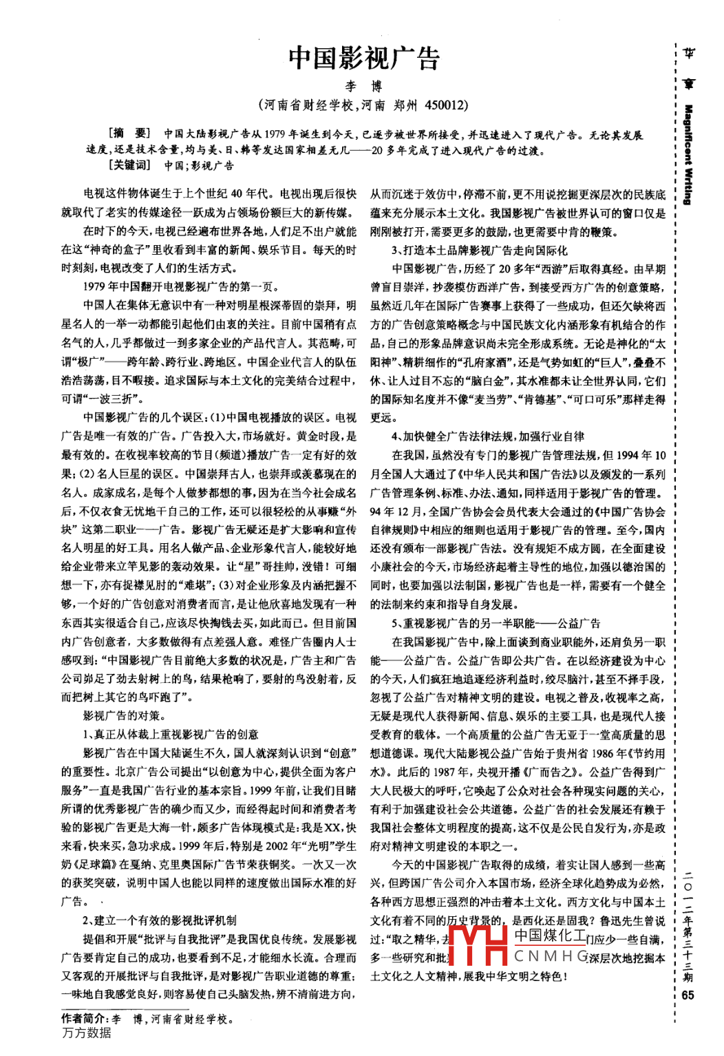 中國影視廣告李博(河南省財經(jīng)學(xué)校,河南鄭州450012)[摘要]中國大陸影視廣告從1979年誕生到今天,已逐步被世界所接受,并迅速進(jìn)入了現(xiàn)代廣告。無論其發(fā)展速度,還是技術(shù)含量,均與美、日、韓等發(fā)達(dá)國家相差無幾—20多年完成了進(jìn)入現(xiàn)代廣告的過渡。[關(guān)鍵詞]中國;影視廣告電視這件物體誕生于上個世紀(jì)40年代。電視出現(xiàn)后很快從而沉迷于效仿中停滯不前,更不用說挖掘更深層次的民族底就取代了老實的傳媒途徑一躍成為占領(lǐng)場份額巨大的新傳媒。蘊來充分展示本土文化。我國影視廣告被世界認(rèn)可的窗口僅是在時下的今天,電視已經(jīng)遍布世界各地,人們足不出戶就能剛剛被打開,需要更多的鼓勵,也更需要中肯的鞭策在這“神奇的盒子”里收看到豐富的新聞、娛樂節(jié)目。每天的時3打造本土品牌影視廣告走向國際化時刻刻,電視改變了人們的生活方式中國影視廣告,歷經(jīng)了20多年“西游后取得真經(jīng)。由早期1979年中國翻開電視影視廣告的第一頁。曾盲目崇洋,抄襲模仿西洋廣告,到接受西方廣告的創(chuàng)意策略,中國人在集體無意識中有一種對明星根深蒂固的崇拜,明雖然近幾年在國際廣告賽事上獲得了一些成功,但還欠缺將西星名人的一舉一動都能引起他們由衷的關(guān)注。目前中國稍有點方的廣告創(chuàng)意策略概念與中國民族文化內(nèi)涵形象有機結(jié)合的作名氣的人,幾乎都做過一到多家企業(yè)的產(chǎn)品代言人。其范疇,可品自己的形象品牌意識尚未完全形成系統(tǒng)。無論是神化的“太謂“極廣”—跨年齡、跨行業(yè)、跨地區(qū)。中國企業(yè)代言人的隊伍陽神”、精耕細(xì)作的“孔府家酒”,還是氣勢如虹的“巨人”疊疊不浩浩蕩蕩,目不暇接。追求國際與本土文化的完美結(jié)合過程中,休、讓人過目不忘的“腦白金”,其水準(zhǔn)都未讓全世界認(rèn)同,它們可謂“一波三折”。的國際知名度并不像“麥當(dāng)勞”、“肯德基”“可口可樂”那樣走得中國影視廣告的幾個誤區(qū):(1)中國電視播放的誤區(qū)。電視更遠(yuǎn)。廣告是唯一有效的廣告。廣告投入大,市場就好。黃金時段,是4、加快健全廣告法律法規(guī),加強行業(yè)自律最有效的。在收視率較高的節(jié)目(頻道)播放廣告一定有好的效在我國,雖然沒有專門的影視廣告管理法規(guī),但1994年10果;(2)名人巨星的誤區(qū)。中國崇拜古人,也崇拜或羨慕現(xiàn)在的月全國人大通過了《中華人民共和國廣告法》以及頒發(fā)的一系列名人。成家成名,是每個人做夢都想的事因為在當(dāng)今社會成名廣告管理條例標(biāo)準(zhǔn)、辦法、通知同樣適用于影視廣告的管理后,不僅衣食無憂地干自己的工作,還可以很輕松的從事賺“外94年12月,全國廣告協(xié)會會員代表大會通過的《中國廣告協(xié)會塊”這第二職業(yè)—廣告。影視廣告無疑還是擴大影響和宜傳自律規(guī)則》中相應(yīng)的細(xì)則也適用于影視廣告的管理。至今,國內(nèi)名人明星的好工具。用名人做產(chǎn)品、企業(yè)形象代言人,能較好地還沒有頒布一部影視廣告法。沒有規(guī)矩不成方圓,在全面建設(shè)給企業(yè)帶來立竿見影的轟動效果。讓“星”哥掛帥,沒錯!可細(xì)小康社會的今天,市場經(jīng)濟起著主導(dǎo)性的地位,加強以德治國的想一下,亦有捉襟見肘的“難堪”;(3)對企業(yè)形象及內(nèi)涵把握不同時,也要加強以法制國,影視廣告也是一樣,需要有一個健全夠,一個好的廣告創(chuàng)意對消費者而言是讓他欣喜地發(fā)現(xiàn)有一種的法制來約束和指導(dǎo)自身發(fā)展。東西其實很適合自己,應(yīng)該盡快掏錢去買,如此而已。但目前國5、重視影視廣告的另一半職能—公益廣告內(nèi)廣告創(chuàng)意者,大多數(shù)做得有點差強人意。難怪廣告圈內(nèi)人士在我國影視廣告中,除上面談到商業(yè)職能外,還肩負(fù)另一職感嘆到:“中國影視廣告目前絕大多數(shù)的狀況是,廣告主和廣告能—公益廣告。公益廣告即公共廣告。在以經(jīng)濟建設(shè)為中心公司峁足了勁去射樹上的鳥,結(jié)果槍響了,要射的鳥沒射著,反的今天,人們瘋狂地追逐經(jīng)濟利益時絞盡腦汁甚至不擇手段,而把樹上其它的鳥嚇跑了”忽視了公益廣告對精神文明的建設(shè)。電視之普及,收視率之高,影視廣告的對策。無疑是現(xiàn)代人獲得新聞、信息、娛樂的主要工具,也是現(xiàn)代人接1、真正從體裁上重視影視廣告的創(chuàng)意受教育的載體。一個高質(zhì)量的公益廣告無亞于一堂高質(zhì)量的思影視廣告在中國大陸誕生不久,國人就深刻認(rèn)識到“創(chuàng)意”想道德課?,F(xiàn)代大陸影視公益廣告始于貴州省1986年《節(jié)約用的重要性。北京廣告公司提出“以創(chuàng)意為中心,提供全面為客戶水》。此后的1987年,央視開播《廣而告之》。公益廣告得到廣服務(wù)”一直是我國廣告行業(yè)的基本宗旨。199年前讓我們目睹大人民極大的呼吁,它喚起了公眾對社會各種現(xiàn)實問題的關(guān)心,所謂的優(yōu)秀影視廣告的確少而又少,而經(jīng)得起時間和消費者考有利于加強建設(shè)社會公共道德。公益廣告的社會發(fā)展還有賴于驗的影視廣告更是大海一針頗多廣告體現(xiàn)模式是:我