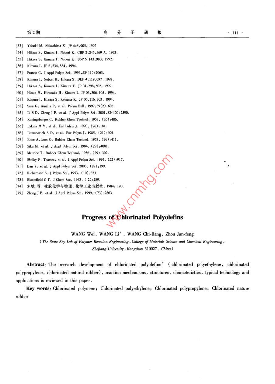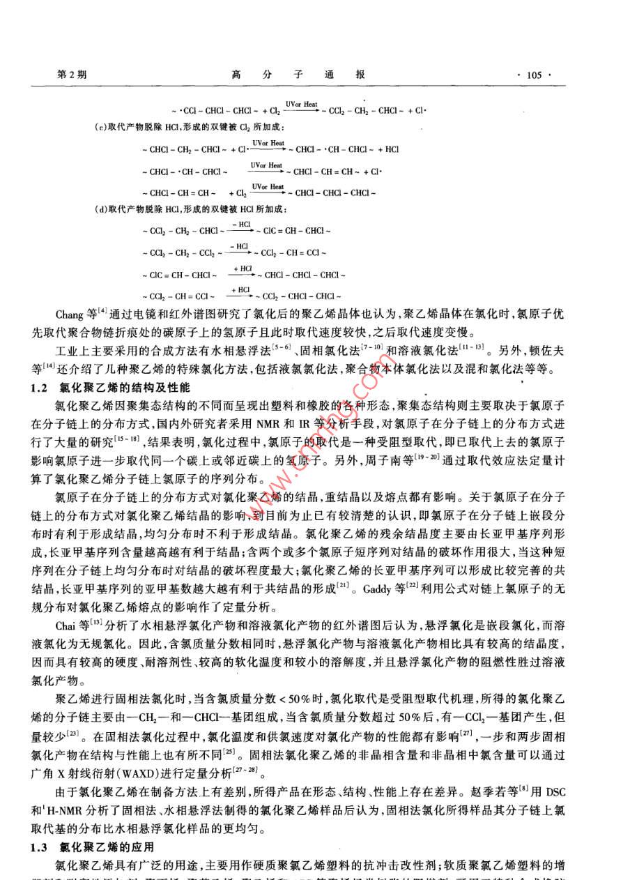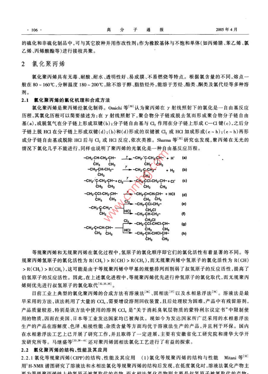 104.高分振2005年4月氯化聚烯烴的研究進(jìn)展王葦,王 立*,王馳亮,周峻峰(浙江大學(xué)材化學(xué)院聚合反應(yīng)工程國家重點實驗室,杭州310027)摘要:綜述了氯化聚烯烴(氯化聚乙烯、氯化聚丙烯、氯化天然橡膠)的制備反應(yīng)機理、結(jié)構(gòu)、性能、典型工藝及其應(yīng)用方面的研究進(jìn)展。關(guān)鍵詞:氯化聚合物;氯化聚乙烯;氯化聚丙烯;氯化天然橡膠氯化聚烯烴是各種聚烯烴的氯化產(chǎn)品,其分子鏈結(jié)構(gòu)中不含雙鍵,氯原子呈無規(guī)則分布,分子無序排列,分子間締合力很低,基本為低結(jié)晶或無結(jié)晶聚合物。由于氯化聚烯烴的制備反應(yīng)機理的復(fù)雜性及影響因素的多樣性,使得有許多問題仍不是很清楚;并且隨著人們環(huán)保意識的增強,原來常用的溶劑型氯化工藝面臨淘汰,新的工藝開發(fā)又帶來了許多新的問題。因此氯化聚烯烴的制備、和新工藝的開發(fā)研究是目前非常活躍的研究領(lǐng)域。氯化聚烯烴種類很多,本文著重介紹氯化聚乙烯、氯化聚丙烯、氯化天然橡膠這三種物質(zhì)的制備反應(yīng)機理、結(jié)構(gòu)及典型的生產(chǎn)工藝等方面的研究進(jìn)展。1氯化聚乙烯氯化聚乙烯具有良好的化學(xué)穩(wěn)定性以及一-系列的優(yōu)良特性,如:耐候、耐油、耐老化、耐化學(xué)藥品等。由于氯化聚乙烯的鏈上含有鹵原子,使其具有良好的阻燃性能,此外氯化聚乙烯是通過聚乙烯氯化制得的,因此高分子鏈中含有未氣化的聚乙烯鏈段,整個材料呈現(xiàn)出介于橡膠和塑料之間的性能,可以用作塑料和橡膠的優(yōu)良改性劑和添加劑等。.1 聚乙烯的氯化機理及合成方法氯化聚乙烯是由聚乙烯氯化而得到的。聚乙烯在氯化過程中,分子鏈上將有多種構(gòu)型、構(gòu)象出現(xiàn)",Shimanouchi等(2研究聚氯乙烯時發(fā)現(xiàn):不同構(gòu)型的分子鏈會出現(xiàn)不同的C- -C 鏈構(gòu)象。例如對于聚氯乙烯間規(guī)立構(gòu)構(gòu)型,當(dāng)C-C鏈旋轉(zhuǎn)構(gòu)象為反式時最穩(wěn)定,原因是這種構(gòu)象避免了相鄰兩個氯原子的近距離排斥;而對于全同立構(gòu)構(gòu)型,則需要2個連續(xù)的C- -C鏈構(gòu)象為反式+旁式時最穩(wěn)定?;诖?Quenum .等[3]提出了聚乙烯在光氯化和熱氯化過程中的反應(yīng)機理,氯化過程可描述為:(a)鏈引發(fā),(b)自由基取代,(c)取代產(chǎn)物脫HCl后形成的雙鍵被Cl2加成或(d)被HCl所加成。(a)鏈引發(fā): .1 UVor H2R.1, UYor H2c1.R.+ah VrHe-RCl+a.(b)自由基取代:.- CH2- CH2-CH2- +2Cl.~ CHCI- CH2- CHCI- + 2HCl. CHCl- CH2 - CHCI ~UYarHe - CHa- .CH- CHC1- +HCl~ CHCI- CH - CHCl- +C.-0 +- .CCl- CHCI-CHC1- +HCI- CHCl- .CH- CHC1- +C2WortHeu。cHa- cHc1- CHc1- +a.基金項目:寧波市科技計劃資助項目;作者簡介:王葦(1980-),男,河南鄲城入,浙江大學(xué)材化學(xué)院聚合反應(yīng)工程國家重點實驗室碩士研究生,主要從事聚烯烴等方面的改性工作;*通訊聯(lián)系人:E-mail:opl. wl @ dial. zju . edu.cn第2期商分子通報--CC1- CHCI- CHCI- +C2Ouote-CCl2 - CHh - CHC1- +Cl.(c)取代產(chǎn)物脫除HC1,形成的雙鍵被Cl2 所加成:~ CHCl-CH2 - CHCl- +Cl.Vor Heu_ CHCI-.CH- CHC1- +HC1~ CHC1- .CH- CHCl -WVarHert - CHCI . CH=CH- +a.~ CHCl-CH=CH~ +Cl2 TrOr~ CHCl- CHCl - CHC1-(d)取代產(chǎn)物脫除HCI,形成的雙鍵被HCI所加成:~ CCl- cH, - CHC1---- cIc= CH- CHCI-~ CCI2 -CH2 - CCh~~- CCl2 -CH= CCI~-aIC=CH-CHCl--心-CHCl-CHCl-CHCI~-CCl2- CH=Ca1- . ccl2 - CHCI- CHC1-Chang等[4]通過電鏡和紅外譜圖研究了氯化后的聚乙烯晶體也認(rèn)為,聚乙烯晶體在氯化時,氯原子優(yōu)先取代聚合物鏈折痕處的碳原子上的氫原子且此時取代速度較快,之后取代速度變慢。工業(yè),上主要采用的合成方法有水相懸浮法[5-61、固相氯化法(7-10]和溶液氯化法"1-3。另外,頓佐夫.等[4)還介紹了幾種聚乙烯的特殊氯化方法,包括液氯氯化法,聚合物本體氯化法以及混和氯化法等等。1.2 氯化聚乙烯的結(jié)構(gòu)及性能氯化聚乙烯因聚集態(tài)結(jié)構(gòu)的不同而呈現(xiàn)出塑料和橡膠的各種形態(tài),聚集態(tài)結(jié)構(gòu)則主要取決于氯原子在分子鏈上的分布方式,國內(nèi)外研究者采用NMR和IR等分析手段,對氯原子在分子鏈上的分布方式進(jìn)行了大量的研究['5-18) ,結(jié)果表明,氯化過程中,氯原子的取代是一種受阻型取代,即已取代上去的氯原子影響氯原子進(jìn)一步取代同- 一個碳上或鄰近碳上的氫原子。另外,周子南等[19-20]通過取代效應(yīng)法定量計算了氯化聚乙烯分子鏈上氯原子的序列分布。氯原子在分子鏈上的分布方式對氯化聚乙烯的結(jié)晶,重結(jié)晶以及熔點都有影響。關(guān)于氯原子在分子鏈上的分布方式對氯化聚乙烯結(jié)晶的影響,到目前為止已有較清楚的認(rèn)識,即氯原子在分子鏈上嵌段分布時有利于形成結(jié)晶,均勻分布時不利于形成結(jié)晶。氯化聚乙烯的殘余結(jié)晶度主要由長亞甲基序列形成,長亞甲基序列含量越高越有利于結(jié)晶;含兩個或多個氯原子短序列對結(jié)晶的破壞作用很大,當(dāng)這種短序列在分子鏈上均勻分布時對結(jié)晶的破壞程度最大;氯化聚乙烯的長亞甲基序列可以形成比較完善的共結(jié)晶,長亞甲基序列的亞甲基數(shù)越大越有利于共結(jié)晶的形成[”1。Gaddy等[2]利用公式對鏈上氯原子的無規(guī)分布對氯化聚乙烯熔點的影響作了定量分析。Chai等([3)分析了水相懸浮氣化產(chǎn)物