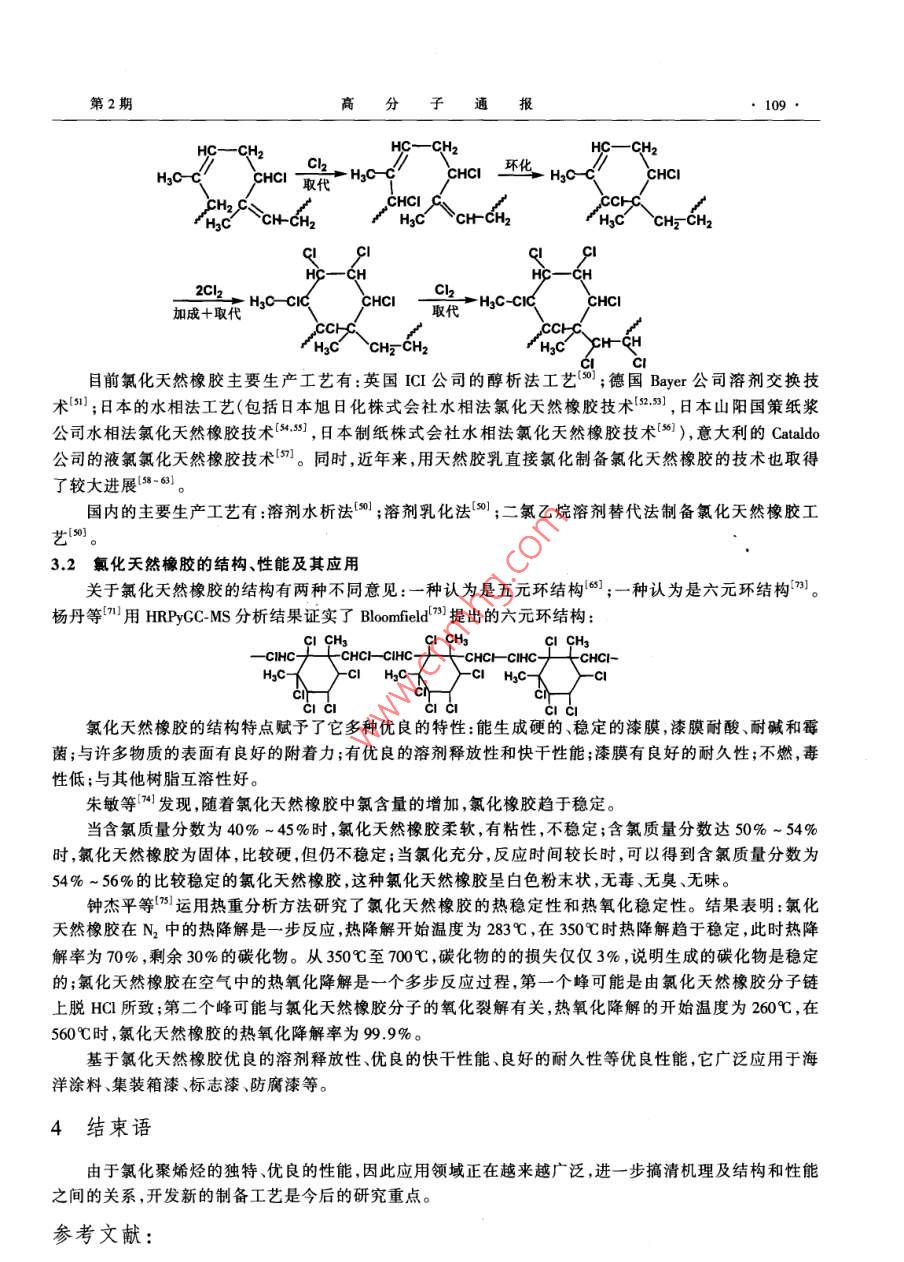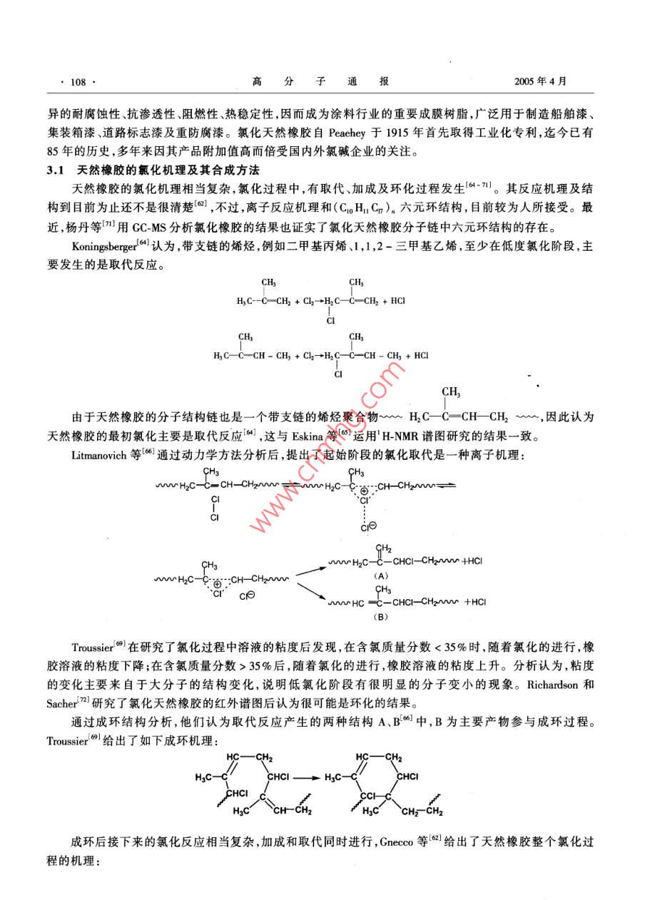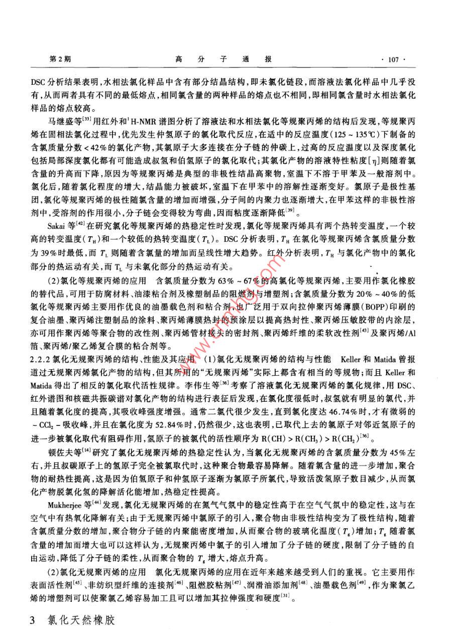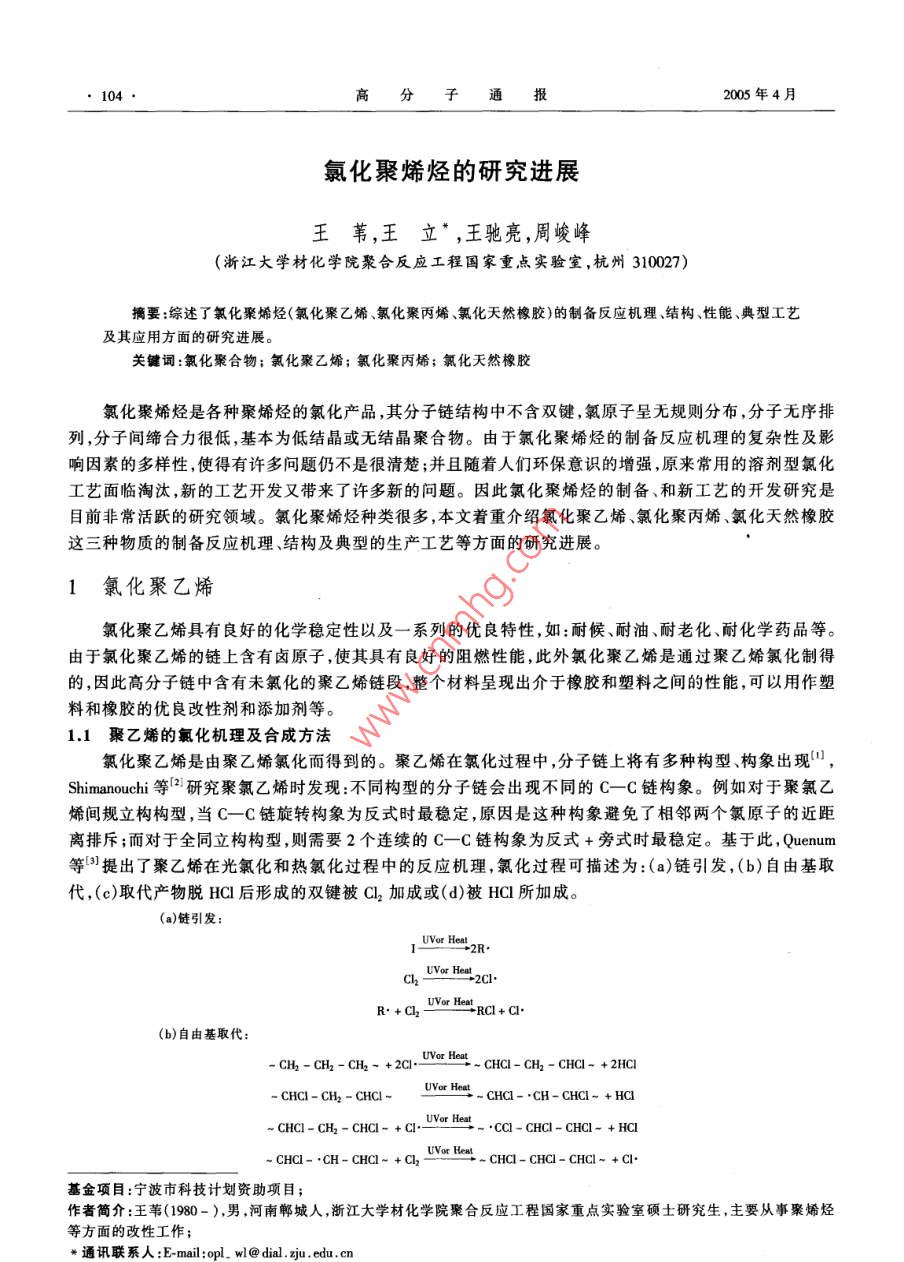 104.高分振2005年4月氯化聚烯烴的研究進(jìn)展王葦,王 立*,王馳亮,周峻峰(浙江大學(xué)材化學(xué)院聚合反應(yīng)工程國家重點實驗室,杭州310027)摘要:綜述了氯化聚烯烴(氯化聚乙烯、氯化聚丙烯、氯化天然橡膠)的制備反應(yīng)機理、結(jié)構(gòu)、性能、典型工藝及其應(yīng)用方面的研究進(jìn)展。關(guān)鍵詞:氯化聚合物;氯化聚乙烯;氯化聚丙烯;氯化天然橡膠氯化聚烯烴是各種聚烯烴的氯化產(chǎn)品,其分子鏈結(jié)構(gòu)中不含雙鍵,氯原子呈無規(guī)則分布,分子無序排列,分子間締合力很低,基本為低結(jié)晶或無結(jié)晶聚合物。由于氯化聚烯烴的制備反應(yīng)機理的復(fù)雜性及影響因素的多樣性,使得有許多問題仍不是很清楚;并且隨著人們環(huán)保意識的增強,原來常用的溶劑型氯化工藝面臨淘汰,新的工藝開發(fā)又帶來了許多新的問題。因此氯化聚烯烴的制備、和新工藝的開發(fā)研究是目前非常活躍的研究領(lǐng)域。氯化聚烯烴種類很多,本文著重介紹氯化聚乙烯、氯化聚丙烯、氯化天然橡膠這三種物質(zhì)的制備反應(yīng)機理、結(jié)構(gòu)及典型的生產(chǎn)工藝等方面的研究進(jìn)展。1氯化聚乙烯氯化聚乙烯具有良好的化學(xué)穩(wěn)定性以及一-系列的優(yōu)良特性,如:耐候、耐油、耐老化、耐化學(xué)藥品等。由于氯化聚乙烯的鏈上含有鹵原子,使其具有良好的阻燃性能,此外氯化聚乙烯是通過聚乙烯氯化制得的,因此高分子鏈中含有未氣化的聚乙烯鏈段,整個材料呈現(xiàn)出介于橡膠和塑料之間的性能,可以用作塑料和橡膠的優(yōu)良改性劑和添加劑等。.1 聚乙烯的氯化機理及合成方法氯化聚乙烯是由聚乙烯氯化而得到的。聚乙烯在氯化過程中,分子鏈上將有多種構(gòu)型、構(gòu)象出現(xiàn)",Shimanouchi等(2研究聚氯乙烯時發(fā)現(xiàn):不同構(gòu)型的分子鏈會出現(xiàn)不同的C- -C 鏈構(gòu)象。例如對于聚氯乙烯間規(guī)立構(gòu)構(gòu)型,當(dāng)C-C鏈旋轉(zhuǎn)構(gòu)象為反式時最穩(wěn)定,原因是這種構(gòu)象避免了相鄰兩個氯原子的近距離排斥;而對于全同立構(gòu)構(gòu)型,則需要2個連續(xù)的C- -C鏈構(gòu)象為反式+旁式時最穩(wěn)定?;诖?Quenum .等[3]提出了聚乙烯在光氯化和熱氯化過程中的反應(yīng)機理,氯化過程可描述為:(a)鏈引發(fā),(b)自由基取代,(c)取代產(chǎn)物脫HCl后形成的雙鍵被Cl2加成或(d)被HCl所加成。(a)鏈引發(fā): .1 UVor H2R.1, UYor H2c1.R.+ah VrHe-RCl+a.(b)自由基取代:.- CH2- CH2-CH2- +2Cl.~ CHCI- CH2- CHCI- + 2HCl. CHCl- CH2 - CHCI ~UYarHe - CHa- .CH- CHC1- +HCl~ CHCI- CH - CHCl- +C.-0 +- .CCl- CHCI-CHC1- +HCI- CHCl- .CH- CHC1- +C2WortHeu。cHa- cHc1- CHc1- +a.基金項目:寧波市科技計劃資助項目;作者簡介:王葦(1980-),男,河南鄲城入,浙江大學(xué)材化學(xué)院聚合反應(yīng)工程國家重點實驗室碩士研究生,主要從事聚烯烴等方面的改性工作;*通訊聯(lián)系人:E-mail:opl. wl @ dial. zju . edu.cn第2期商分子通報--CC1- CHCI- CHCI- +C2Ouote-CCl2 - CHh - CHC1- +Cl.(c)取代產(chǎn)物脫除HC1,形成的雙鍵被Cl2 所加成:~ CHCl-CH2 - CHCl- +Cl.Vor Heu_ CHCI-.CH- CHC1- +HC1~ CHC1- .CH- CHCl -WVarHert - CHCI . CH=CH- +a.~ CHCl-CH=CH~ +Cl2 TrOr~ CHCl- CHCl - CHC1-(d)取代產(chǎn)物脫除HCI,形成的雙鍵被HCI所加成:~ CCl- cH, - CHC1---- cIc= CH- CHCI-~ CCI2 -CH2 - CCh~~- CCl2 -CH= CCI~-aIC=CH-CHCl--心-CHCl-CHCl-CHCI~-CCl2- CH=Ca1- . ccl2 - CHCI- CHC1-Chang等[4]通過電鏡和紅外譜圖研究了氯化后的聚乙烯晶體也認(rèn)為,聚乙烯晶體在氯化時,氯原子優(yōu)先取代聚合物鏈折痕處的碳原子上的氫原子且此時取代速度較快,之后取代速度變慢。工業(yè),上主要采用的合成方法有水相懸浮法[5-61、固相氯化法(7-10]和溶液氯化法"1-3。另外,頓佐夫.等[4)還介紹了幾種聚乙烯的特殊氯化方法,包括液氯氯化法,聚合物本體氯化法以及混和氯化法等等。1.2 氯化聚乙烯的結(jié)構(gòu)及性能氯化聚乙烯因聚集態(tài)結(jié)構(gòu)的不同而呈現(xiàn)出塑料和橡膠的各種形態(tài),聚集態(tài)結(jié)構(gòu)則主要取決于氯原子在分子鏈上的分布方式,國內(nèi)外研究者采用NMR和IR等分析手段,對氯原子在分子鏈上的分布方式進(jìn)行了大量的研究['5-18) ,結(jié)果表明,氯化過程中,氯原子的取代是一種受阻型取代,即已取代上去的氯原子影響氯原子進(jìn)一步取代同- 一個碳上或鄰近碳上的氫原子。另外,周子南等[19-20]通過取代效應(yīng)法定量計算了氯化聚乙烯分子鏈上氯原子的序列分布。氯原子在分子鏈上的分布方式對氯化聚乙烯的結(jié)晶,重結(jié)晶以及熔點都有影響。關(guān)于氯原子在分子鏈上的分布方式對氯化聚乙烯結(jié)晶的影響,到目前為止已有較清楚的認(rèn)識,即氯原子在分子鏈上嵌段分布時有利于形成結(jié)晶,均勻分布時不利于形成結(jié)晶。氯化聚乙烯的殘余結(jié)晶度主要由長亞甲基序列形成,長亞甲基序列含量越高越有利于結(jié)晶;含兩個或多個氯原子短序列對結(jié)晶的破壞作用很大,當(dāng)這種短序列在分子鏈上均勻分布時對結(jié)晶的破壞程度最大;氯化聚乙烯的長亞甲基序列可以形成比較完善的共結(jié)晶,長亞甲基序列的亞甲基數(shù)越大越有利于共結(jié)晶的形成[”1。Gaddy等[2]利用公式對鏈上氯原子的無規(guī)分布對氯化聚乙烯熔點的影響作了定量分析。Chai等([3)分析了水相懸浮氣化產(chǎn)物