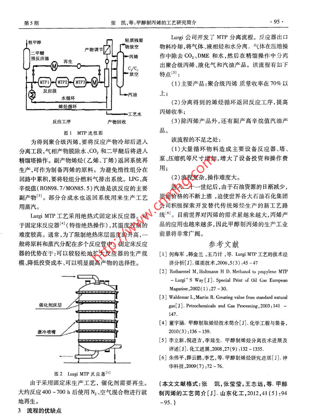 山東化工●94●SHANDONG CHEMICAL INDUSTRY2012年第41卷甲醇制丙烯的工藝簡(jiǎn)介張凱,張瑩瑩,王志遠(yuǎn)1,2 ,仇汝臣'(1青島科技大學(xué)化工學(xué)院,山東青島266042 ;2山東化工技師學(xué)院,山東滕州277500)摘要:簡(jiǎn)要介紹了甲醇制丙烯的工藝技術(shù),分析了德國(guó)Lurgi公司的工藝流程,總結(jié)了該工藝的優(yōu)缺點(diǎn)。關(guān)鍵詞:甲醉惻丙烯; Lurgi MTP;反應(yīng)器中圉分類(lèi)號(hào):TQ221.21*2文獻(xiàn)標(biāo)識(shí)碼:E文章編號(hào):1008 -021X(2012)05 -0094 -02Process Description of Methanol to PropyleneZHANG Kail.2 ,ZHANG Ying - ying 12 ,QIU Ru - chen'(1 College of Chemical Engineering , Qingdao University of Science and Technology , Qingdao266042 , China ;2 Shangdong College of Chemical Technicians , Tengzhou 277500 , China)Abstract: Introduced the technology of methanol to propylene, analyzed the German Lurgi s process,summarized the advantages and disadvantages of the process.Key words : methanol to propylene; Luurgi MTP; reactor我國(guó)“富煤、貧油、少氣”的能源特點(diǎn)決定了國(guó)化石油氣800t,總投資約1.6億元。民經(jīng)濟(jì)的可持續(xù)性發(fā)展需要調(diào)整和優(yōu)化能源結(jié)構(gòu),2 MTP流程降低對(duì)石油進(jìn)口的依賴(lài),充分利用煤炭資源優(yōu)勢(shì),大Lurgi MTP工藝流程圖見(jiàn)圖1。主要是由三個(gè)力發(fā)展煤化工產(chǎn)業(yè),以煤化工產(chǎn)品代替石油化工產(chǎn)絕熱固定床反應(yīng)器組成,可兩個(gè)同時(shí)使用,一個(gè)再生品。近年來(lái),煤基甲醇制烯烴( MTP/MTO)技術(shù)備受備用,這樣可以連續(xù)性地生產(chǎn)作業(yè)并保持催化劑的青睞?;钚浴7磻?yīng)器內(nèi)有六個(gè)催化劑床層,各床層分布若MTP技術(shù)干激冷噴嘴,定量注入低溫的CH,OH - H20-二甲甲醇制丙烯( MTP)工藝是由德國(guó)Lurgi公司開(kāi)醚物料來(lái)控制催化劑床層的溫度,以獲得最大的丙發(fā)的,該過(guò)程的主產(chǎn)物為丙烯,同時(shí)得到市場(chǎng)容量巨烯收率。MTP反應(yīng)的壓力接近常壓,反應(yīng)溫度723大的副產(chǎn)物汽油、液化石油氣(LPG)以及燃料氣~753K(2]。從上步工序送來(lái)的甲醇經(jīng)過(guò)預(yù)熱氣化后進(jìn)入預(yù)在國(guó)內(nèi),對(duì)MTP工藝的開(kāi)發(fā)研究也一直在進(jìn)反應(yīng)器,先合成二甲醚和水,該反應(yīng)的轉(zhuǎn)化率幾乎達(dá)行。由新--代煤(能源)化工產(chǎn)業(yè)技術(shù)創(chuàng)新戰(zhàn)略聯(lián)到熱力學(xué)平衡程度。CH3OH - H2O -二甲醚物料進(jìn)盟成員-中國(guó)化學(xué)工程集團(tuán)公司、清華大學(xué)、安徽淮人分凝器,氣相溫度升溫至反應(yīng)溫度后進(jìn)入MTP反化集團(tuán)有限公司合作開(kāi)發(fā)的流化床甲醇制丙烯應(yīng)器(圖2)。液相經(jīng)流量計(jì)作為控溫介質(zhì)通過(guò)激冷(FMTP)工業(yè)化試驗(yàn)項(xiàng)目在淮化集團(tuán)開(kāi)工。該項(xiàng)目噴嘴人MTP反應(yīng)器。CH,OH -二甲醚的轉(zhuǎn)化率約規(guī)模為年處理甲醇3萬(wàn)t,年產(chǎn)丙烯近1萬(wàn)t,副產(chǎn)液99% , 主要產(chǎn)物是丙烯。收稿日期:2012-04-11作者簡(jiǎn)介:張凱( 1984- -) ,山東棗莊人,青島科技大學(xué)在職碩士,zhangk365@ 126. com;仇汝臣( 1963- -) ,教授,指導(dǎo)教師。.第5期張凱,等:甲醇制丙烯的工藝研究簡(jiǎn)介●95●I 粗甲醇輕質(zhì)殘留Lurgi公司開(kāi)發(fā)了MTP分離流程。反應(yīng)器出口產(chǎn)物調(diào)節(jié)廣物放空物料冷卻將氣體、液相烴和水分離。氣體在壓縮操二甲醚預(yù)反應(yīng)器丙烯作中除去CO2、DME和水,然后在精餾操作中分離再生四-C/C3出聚合級(jí)丙烯、液化氣和汽油產(chǎn)品。該流程有如下'放空.特點(diǎn)(5):(1)主要產(chǎn)品:聚合級(jí)丙烯質(zhì)量收率在70%以反應(yīng)段一汽油上;水循環(huán)(2)分離得到的烯烴循環(huán)返回反應(yīng)工序,提高烯烴循環(huán)L-I藝水丙烯收率;反應(yīng)工序產(chǎn)物回收(3)除丙烯產(chǎn)品外,還有副產(chǎn)高辛烷值汽油產(chǎn)圖1MTP流程圖品。為得到聚合級(jí)丙烯,要將反應(yīng)產(chǎn)物冷卻后進(jìn)人該流程的不足之處:分離工段,氣相產(chǎn)物脫除水CO2和二甲醚后將進(jìn)人(1)大量循環(huán)物料造成主要設(shè)備反應(yīng)器、塔、精餾塔操作。副產(chǎn)物烯烴(乙烯、丁烯)返回系統(tǒng)再泵、壓縮機(jī)等尺寸增加,增大了設(shè)備投資和操作費(fèi)生產(chǎn),可作為制備丙烯的原料。為避免惰性組分在用;回路中累積,要將輕組分燃料氣排出系統(tǒng)。LPG、高(2)流程復(fù)雜,操作難度大。辛烷值( RON98. 7/MON85. 5)汽油是該反應(yīng)的主要進(jìn)入二十一世紀(jì)后,由于石油資源的日漸減少,副產(chǎn)物)。部分合成水也返回系統(tǒng)用來(lái)生產(chǎn)工藝原油價(jià)格的不斷上漲,迫使世界各大石油石化集團(tuán)用蒸汽。公司積極探索開(kāi)發(fā)替代傳統(tǒng)烯烴生產(chǎn)的新工藝路Lurgi MTP工藝采用絕熱式固定床反應(yīng)器。對(duì)線')。目前世界對(duì)丙烯的需求量越來(lái)越大,丙烯產(chǎn)于固定床反應(yīng)器(4)(特指絕熱操作) ,其溫度控制的品的應(yīng)用也越來(lái)越多,因此甲醇制丙烯的生產(chǎn)工業(yè)難度較高。通常,為了限制絕熱床層溫度的升高,一前景將非常廣闊。般將原料和蒸汽分配在多個(gè)反應(yīng)管中。固定床反應(yīng)參考文獻(xiàn)器的