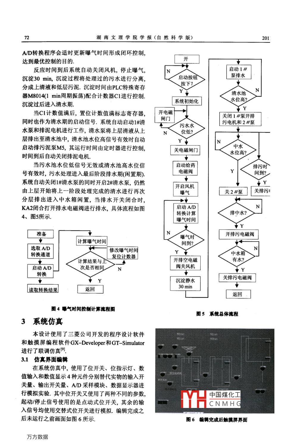第23謄第2期湖南文理學院學報(自然科學版)VoL 23 No.22011年6月Journal of Hunan University of Arts and ScienceQNatural Science Edition)Jun. 2011doi: 10.3969/jissn.1672- -6146.2011.02.020基于PLC的城市污水處理系統(tǒng)設(shè)計敖章洪.(湖南文理學院電氣與信息工程學院,湖南常德, 415000)摘要: 為了解決城市生活污水處理問題,實現(xiàn)生態(tài)環(huán)境的良性循環(huán),以三菱可編程控制器為核心,結(jié)合先進的SBR(間歇式活性污泥法)工藝設(shè)計了一-個由廢水處理池、清水池、中水水箱、電氣控制箱以及水泵、羅茨風機、電動閥門和電磁閥等部分組成的生活污水處理控制系統(tǒng).利用GT Simulator 軟件進行了系統(tǒng)的調(diào)試和仿真分析.調(diào)試結(jié)果表明,系統(tǒng)能按照設(shè)定的工藝流程可靠運行,達到了預期目標.關(guān)鍵詞:污水處理;可編程控制器; SBR工藝中圈分類號: TP273*.5文聿編號: 1672- -6146(2011)02- 0069 -05Design of city sewage treatment system based on PLCAO Zhang hong(College of Communication and Electric Engineering, Hunan University of Arts and Science, Changde 415000, China)Abstract: To solve the problem of the city life sewage treatment and realize positive cycle of ecological environment,this paper used the Mitsubishi PLC as the control core, combined with the advanced SBR (Sequencing Batch ReactorActivated Sludge Process) process, designed the life sewage treatment control system which is composed of a wastewatertreatment pond, clean water tank, water tank, electrical control box, as well as pump, Roots blower, electric valves andsolenoid valves and so on. The paper used GT Simulator carry out a system simuation analysis. The debugging resultsshowed that the system can run in accordance with a reliable operation as the set technical process and achieveanticipated target.Key words: sewage treatment; programmable controllers; SBR process的過程是按時序來運行的,一個操作過程分5個階1 SBR 工藝簡介段:進水、反應(yīng)、沉淀、清水、閑置. SBR在運行過SBR(Sequencing Batch Reactor, 間歇式活性污程中,各階段的運行時間、反應(yīng)器內(nèi)混合液體積的泥法)是最早(1893年)的活性污泥法,,但由于存在對變化以及運行狀態(tài)等都可以根據(jù)污水的性質(zhì)、出水水質(zhì)變化的適應(yīng)能力不強、所供的氧不能充分利用水質(zhì)與運行功能要求靈活變化[4-5].等問題,運行管理極不方便I-21. 20世紀80年代前后,2系統(tǒng)設(shè)計由于自動化、計算機等高新技術(shù)的迅速發(fā)展以及在污水處理領(lǐng)域的普及與應(yīng)用(電動閥、氣動閥、溶解2.1 主電路設(shè)計氧傳感器、水位傳感器等),使得間歇活性污泥法的本系統(tǒng)采用三相交流電供電,三相空氣開關(guān)運行管理也逐漸實現(xiàn)了自動化,開發(fā)出了一系列新QF控制整個系統(tǒng)的電源通斷,既可完成主電路的型的SBR工藝,較有代表性的包括: ICEAS、CASS、短路保護又可方便日常的維護(6-81. FU1至FU7熔斷CAST、UNIT-ANK. DAT- _IAT等工藝3)] SBR工藝器起過流中國煤化工發(fā)生短路現(xiàn)象;YHCNMHG收稿日期: 2010-10-27作者簡介:敖章洪(1977-),男,講師,碩士研究生,研究方向為電力電子與電力傳動. E-mail: 86638262@qq.com70湖南文理學院學報(自然科學版)2011年FR1至FR5熱繼電器對負載電機M1至M5起過載起/停.通過電動閥門拖動電機的正反轉(zhuǎn)完成電動保護作用,消除了主要的安全隱患.3個接觸器.閥門的開啟和關(guān)閉,具體電路設(shè)計如圖1所示.KM1/ KM2/KM3控制2個水泵和羅茨風機的獨立、Q中中FU1中中中Fu2中中中FU3中中中FU5中中中FU4中中中FU6FU7KM1KM2KM3KM6KM4」」.KM5.L1| L2FR1FR2FR3FR5FR42ζ|2引2222ζζζ1#泵(污水)2#泵(清水)羅茨風機 排泥電機電動閥門拖動電機圈1污水處理系統(tǒng)主電路圖2.2交流控制電路 設(shè)計水電磁閥、排空電磁閥、排泥電機工作指示燈.5臺交流控制回路電路如圖2所示,控制回路使電機分別由FRI、FR2、FR3、FR4、FR5五個熱繼用220 V交流電進行供電.圖2中HL1為回路工作電器進行過載保護,將其常開觸點并聯(lián)后與中間繼電源指示燈. HL2、HL3、 HL4分別為1#泵、2#泵、電器KA1的線圈串聯(lián),其觸點輸出24 V直流過載羅茨風機工作指示燈,由交流接觸器KM1、KM2、報警信號至控制器.TC選用1: 1隔離變壓器,將KM3的觸點進行控制. YA1、YA2 分別為排水電磁220 V電源經(jīng)TC隔離,使控制系統(tǒng)回路與供電回路閥和排空電磁閥的控制線圈,中間繼電器KA2、之間進行電氣隔離后,再為控制器提供電源,提高KA3觸點控制其通斷電, HL5、HL6、HL7分別為排電源質(zhì)量,防止電網(wǎng)干擾控制系統(tǒng)可靠工作.LI一220VN- AC電源工作指示-&HL1KM1V> HL2污水泵工作指示KM2-1。.&HL3.清水泵工作指示KM3-1。g HL4tC: 1隔離變壓器風機工作指示排水電磁閥KA2-1。-o- YA1排空電磁閥KA2-2& HLS|N田|排水電磁閥工作指示KA3-1。o YA2開關(guān)電源排空電磁閥工作指示KA3-2。& HL6排泥電機工作指示KA6-1 a心HL7|COMFR1工。24VDCFR2王。FR3亞。-oKA1FR4嚴。中國煤化工FRS。JYHCNMHG圈2控制系統(tǒng)交流控制回路電路圖第2期敖章洪基于PLC的城市污水處理系統(tǒng)設(shè)計712.3控制系統(tǒng)設(shè)計0 INPUToutpuT為完成控制系統(tǒng)所需工藝流程,需要控制器能有較強的浮點運算能力和掉電保持的能力,根據(jù)開DC 24VN220V AC關(guān)和其他設(shè)備的需要并考慮10%~15%的裕量, 本L系統(tǒng)采用三菱FXzN- 48MR可編程控制器. I/O分配COM如表1所示,硬件電路圖見圖3._HIXY0KMIKM2表1 /0口分配