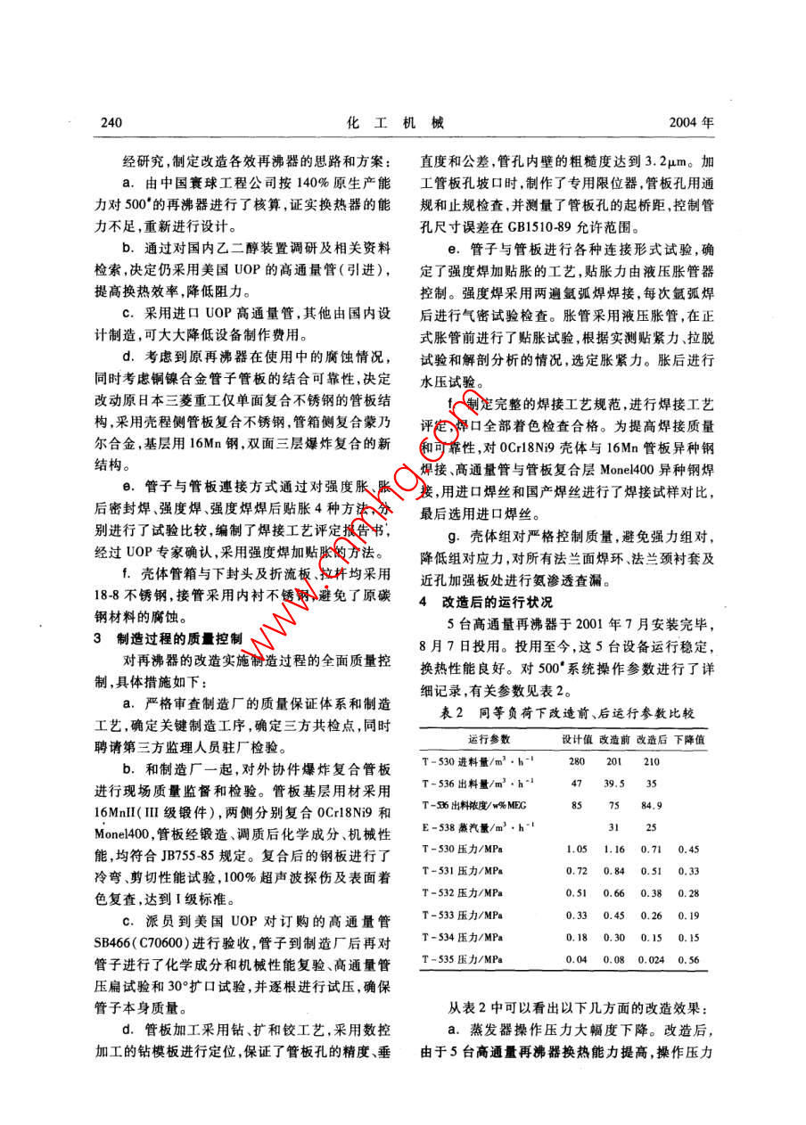 第31卷第4期化工機(jī)乙二醇裝置中高通量再沸器的改造石祥利·范根方倪東源(揚(yáng)子石化股份有限公司烯烴廠)犢要針對原500°再沸器存在的問題選用進(jìn)口高通量管,使用雙面三層爆炸復(fù)合管板,管子管板進(jìn)行4種試驗(yàn)比較,采用強(qiáng)度焊加貼脹方法,制造過程使用了多種創(chuàng)新工藝方法,消除了原500°再沸器換熱能力不足和腐蝕的問題。關(guān)詞乙二醇裝置高通量管再沸器國產(chǎn)化改造中圖分類號(hào)TQ051.65文獻(xiàn)標(biāo)識(shí)碼B文章編號(hào)02546094(2004)04023903揚(yáng)子石化烯烴廠500蒸發(fā)單元原再沸器Ed.高通量管內(nèi)側(cè)燒結(jié)多孔金屬膜表面污垢530~535用于200kta的乙二醇裝置,于1987年較多7月正式投用。1999年裝置擴(kuò)容改造(原生產(chǎn)能.列管與管板連接處大面積滲漏。力的140%)時(shí)考慮到原設(shè)計(jì)余量及400°環(huán)氧乙1.2生產(chǎn)負(fù)荷不足烷精制系統(tǒng)對生產(chǎn)負(fù)荷的調(diào)節(jié)作用,500再沸器500生產(chǎn)的最大負(fù)荷只達(dá)到原設(shè)計(jì)的未做變動(dòng)。但是在改造開車后,由于裝置總體生115%,已無任何調(diào)節(jié)的余地。根據(jù)目前的產(chǎn)品結(jié)產(chǎn)能力的提高和400環(huán)氧乙烷負(fù)荷的調(diào)整,500構(gòu)500°及后系統(tǒng)的負(fù)荷如能達(dá)到原設(shè)計(jì)再沸器的效率下降問題就顯得尤為突出,500°的130%是較為理想的,考慮到今后EO及EG可能生產(chǎn)能力只達(dá)到原生產(chǎn)能力的115%,嚴(yán)重制約出現(xiàn)的產(chǎn)品生產(chǎn)價(jià)格,最好該系統(tǒng)能力達(dá)到了裝置的高負(fù)荷生產(chǎn),成為裝置進(jìn)一步擴(kuò)大生產(chǎn)140%左右,因此擴(kuò)大該系統(tǒng)的生產(chǎn)能力是必要的瓶頸。為此,決定對5臺(tái)高通量再沸器進(jìn)行技的,也是迫切的術(shù)攻關(guān)。1.3傳熱系數(shù)降低1500再沸器原狀況500換熱器換熱效果下降是造成生產(chǎn)負(fù)荷上1.1設(shè)備本身的缺陷不去的主要原因。專利商美國SD公司對500°系E530、E532、E533、E534、E5355臺(tái)高通量統(tǒng)核算的結(jié)果(表1)也能充分說明這一問題。換熱器,均是由日本三菱重工制造,換熱管采用美表15臺(tái)換熱器的傳熱系數(shù)K的比較國UCC(UOP)公司生產(chǎn)的高通量Cu、N合金管,1.163W/(m2·℃)管板為碳鋼和不銹鋼復(fù)合鋼板換熱管與管板采用項(xiàng)目E-530E-532E-533E-534E-535脹接結(jié)構(gòu),1987年7月投用。從近幾年大修情況來應(yīng)達(dá)到的K值531049948750263216看,這5臺(tái)高效換熱器存在一些共同的問題:實(shí)際的K值49104520410148031866a.原碳鋼(Ss41)殼體因系統(tǒng)介質(zhì)腐蝕,多原設(shè)計(jì)的K值57105307527753084552次泄漏造成裝置停車,1994、1995年分批更換成從表1中提供的核算數(shù)據(jù)可以看出,各效再不銹鋼殼體;沸器的傳熱系數(shù)均有不同程度的下降,其中三b.管板內(nèi)側(cè)碳鋼部分已明顯減薄五效再沸器的傳熱效率下降明顯。C.中間折流板腐蝕損壞拉桿大部分已斷裂;2設(shè)備改造思路和方案石祥利,男,1963年2月生,助理工程師。江蘇省南京市,210048。240化工機(jī)械2004年經(jīng)研究,制定改造各效再沸器的思路和方案:直度和公差,管孔內(nèi)壁的粗糙度達(dá)到32um。加a.由中國寰球工程公司按140%原生產(chǎn)能工管板孔坡口時(shí),制作了專用限位器,管板孔用通力對50°的再沸器進(jìn)行了核算,證實(shí)換熱器的能規(guī)和止規(guī)檢查,并測量了管板孔的起橋距,控制管力不足,重新進(jìn)行設(shè)計(jì)??壮叽缯`差在GB1510-89允許范圍。b.通過對國內(nèi)乙二醇裝置調(diào)研及相關(guān)資料e.管子與管板進(jìn)行各種連接形式試驗(yàn),確檢索決定仍采用美國UOP的高通量管(引進(jìn)),定了強(qiáng)度焊加貼脹的工藝,貼脹力由液壓脹管器提高換熱效率,降低阻力??刂?。強(qiáng)度焊采用兩遍氬弧焊焊接,每次氬弧焊c.采用進(jìn)口UOP高通量管,其他由國內(nèi)設(shè)后進(jìn)行氣密試驗(yàn)檢查。脹管采用液壓脹管,在正計(jì)制造,可大大降低設(shè)備制作費(fèi)用。式脹管前進(jìn)行了貼脹試驗(yàn),根據(jù)實(shí)測貼緊力、拉脫d.考慮到原再沸器在使用中的腐蝕情況,試驗(yàn)和解剖分析的情況,選定脹緊力。脹后進(jìn)行同時(shí)考慮銅鎳合金管子管板的結(jié)合可靠性,決定水壓試驗(yàn)。改動(dòng)原日本三菱重工僅單面復(fù)合不銹鋼的管板結(jié)t.制定完整的焊接工藝規(guī)范,進(jìn)行焊接工藝構(gòu)采用殼程側(cè)管板復(fù)合不銹鋼管箱側(cè)復(fù)合蒙乃評(píng)定,焊口全部著色檢查合格。為提高焊接質(zhì)量爾合金基層用16Mn鋼雙面三層爆炸復(fù)合的新和可靠性,對0cl!N9殼體與16Mn管板異種鋼結(jié)構(gòu)。焊接、高通量管與管板復(fù)合層 Monel400異種鋼焊管子與管板連接方式通過對強(qiáng)度脹、脹接,用進(jìn)口焊絲和國產(chǎn)焊絲進(jìn)行了焊接試樣對比,后密封焊、強(qiáng)度焊、強(qiáng)度焊焊后貼脹4種方法,分最后選用進(jìn)口焊絲。別進(jìn)行了試驗(yàn)比較,編制了焊接工藝評(píng)定報(bào)告書g.殼體組對嚴(yán)格控制質(zhì)量,避免強(qiáng)力組對經(jīng)過UOP專家確認(rèn),采用強(qiáng)度焊加貼脹的方法。降低組對應(yīng)力,對所有法蘭面焊環(huán)、法蘭頸襯套及t.殼體管箱與下封頭