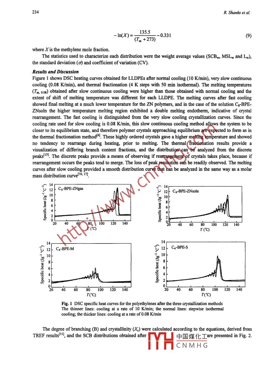 Chinese Journal of Polymer Science Vol. 21, No. 2, (2003), 231-239Chinese Journal ofPolymer Science92003 Springer-VerlagANALYSIS OF BRANCHING DISTRIBUTION IN POLYETHYLENES BYDIFFERENTIAL SCANNING CALORIMETRYRobert Shanks', Fei Chen and Gandara AmarasingheApplied Chemistry, RMIT University, GPO Box 2476V, Melbourne, 3001, AustraliaAbstract Short chain branching has been characterized using thermal fractionation, a stepwise isothermal crystallizationtechnique, followed by a melting analysis scan using differential scanning calorimetry. Short chain branching distributionwas also characterized by a continuous slow cooling crystallization, followed by a melting analysis scan. Four differentpolyethylenes were studied: Zicgler-Natta gas phase, Ziegler-Natta solution, metallocene, constrained-geometry single sitecatalyzed polyethylenes. The branching distribution was calculated from a calibration of branch content with meltingtemperature. The lamellar thickness was calculated based on the thermodynamic melting temperature of each polyethyleneand the surface free energy of the crystal face. The branching distribution and lamellar thickness distribution were used tocalculate weight average branch content, mean lamellar thickness, and a branch dispersity index. The results for the branchcontent were in good agreement with the known comonomer content of the polyethylenes. A limitation was that high branchcontent polyethylenes did not reach their potential crystallization at ambient temperatures. Cooling to sub-ambient wasnecessary to equilibrate the crystallization, but melting temperature versus branch content was not applicable after cooling tobelow ambient because the calibration data were not performed in this way.Keywords Polyethylene, Short chain branching, Lamellar thickness, Branch distribution, Thermal fractionation, DSCINTRODUCTIONEthylene copolymers are made by polymerization of ethylene with a-olefins, such as 1-butene, 1-hexene or 1-octene. These polymers contain short chain branches (SCB) along the polymer backbone and exhibit broadmelting ranges indicating the presence of broad lamellar thickness distributions. The properties and performanceof a polymer depend on the short chain branch content and its distribution in the polymer chain. The distributionof SCB depends on the conditions used for polymerization. Zeigler-Natta (ZN) catalysis gives a broad branchingdistribution, particularly when the solution or slurry method is used. This method must be used for 1-octenecomonomer, because of its relatively high boiling temperature. The ZN gas phase polymerization gives lesshighly branched molecules and is suitable for 1-butene or 1-hexene comonomers. Single site catalysts, such asmetallocene and constrained geometry types, provide narrow distributions of SCB of the polymerslPolyethylenes form a chain folded crystal structure where the lamellar thickness is determined by thenumber of methylenes between the folds. Branch points are excluded from the crystals. When the branchesconsist of less than about 20 methylenes they cannot take part in crystallization, so for most short branchedpolyethylenes the branches are excluded from the crystals. When the branches are methyl groups then they can beaccommodated in the crystals as defects, but ethyl, butyl and hexyl branches are excluded, except under veryrapid quench cooling rates4. The analysis of the thickness of the lamella is possible when a polyethylenecrytallization is limited by the SCB distribution. Another way of considering the branching distribution is themean sequence length MSL) of methylenes between branches. There will be a minimum MSL for a chain'Corresponding author: Robert Shanks, E-mail: Robert.shanks@rmit.edu.aPresented at the Intermational Symposium on Polymer Plhysics, 2002, Qing中國煤化工Received August 31, 2002YHCNMHG232R Shanks et al.segment to join a particular lamella.The widely used method to analyze short chain branch distibution of ethylene copolymers is temperaturerising elution fractionation (TREF)P. Since TREF requires long fractionation times with solvent, an altermativefaster and more definitive method is preferred. Thermal fractionation (TF) (segregation) as an alternative tool forqualitative SCB distribution analysis of ethylene copolymers has recently been reported4. Thermal fractionationcan segregate molecules with intramolecular branch distributionsl. 5, whereas TREF can only separateintermolecular branch distributions. TF provides a visual way of studying the branch distribution, whereas foranalysis of the distribution it is not necessary to have segregated fractions. In the present research, a simplifednew method, very slow continuous cooling, that can be used as an altermative for comonomer distributionanalysis with enough accuracy and minimum time using differential scanning calorimetry (DSC) is proposed. Inaddition, this method can be used as an alternative method to obtain lamellar thickness distribution for somebranched polyethylenes. Another DSC method for segregation of the crystals of a polymer is successive self-nucleation/annealinglo. Other experimental methods, which have been used to determine the lamellar thicknessdistribution, are transmission electron microscopy", small angle X-ray sattering and atomic force microscopy'8.DSC has previously been used to measure lamellar thickness distributions using the Thomson-Gibbsequation9. A constraint is that the polyethylene crystals must not rearrange during the DSC scan. In thisresearch, the polyethylene has been cooled very slowly to ensure that the formed crystals are stable. Anotherlimitation is that copolymers cannot reach the equilibrium melting temperature. They are restricted by the molefraction of branches in addition to the need to use realistic crystallization temperatures. The thermodynamicmelting temperature of the ethylene copolymers is the quantity applicable to copolymers that is used in themethod presented.Polyethylenes show both a