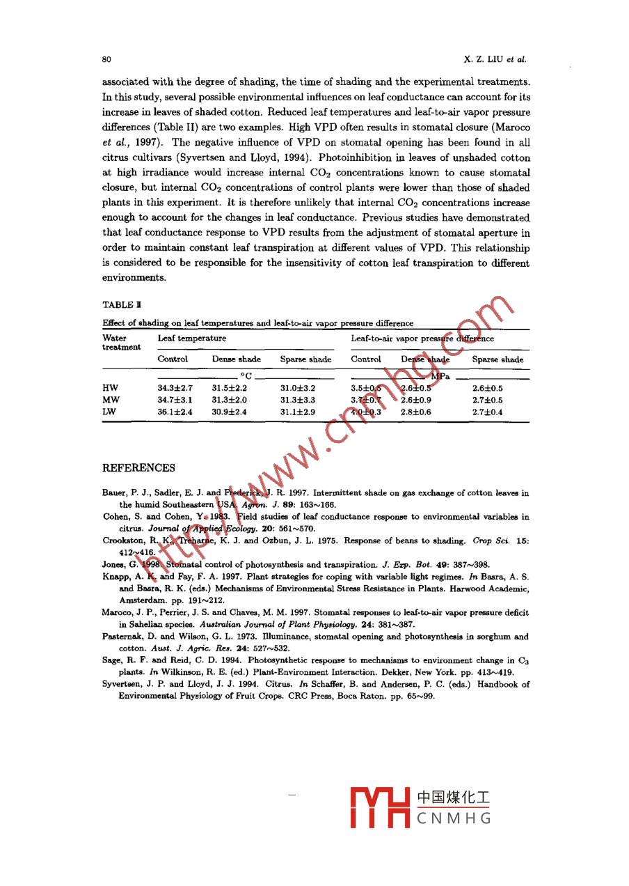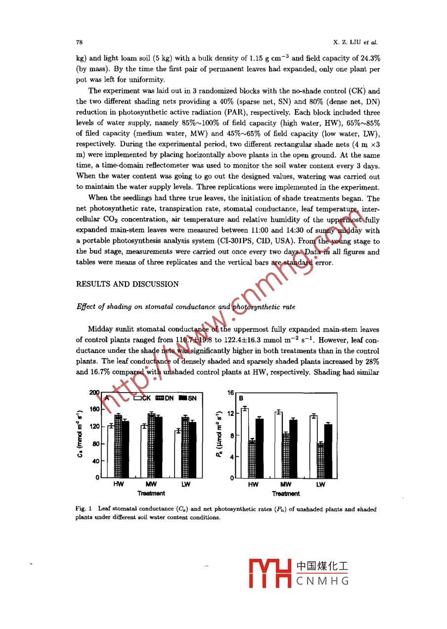 Pedosphere 10(1): 77~80, 200017ISSN 1002-0160/CN 32- L315/P回2000 SCIENCE PRESS, BEIJING有Efect of Shading on Gas Exchange of Cotton LeavesUnder Conditions of Diferent Soil Water Contents*1LIU XIANZHAO, KANG SHAOZHONG and SHAO MINGANInstitute of Soil and Water Conservation, the Chinese Academy of Sciences and the Ministry of WaterResounces, Yangling 712100 (China)(Received October 25, 1999; revised December 15, 1999)ABSTRACTEffect of diferent shading levels (no shading, 80% shading, and 40% shading) on pbotosynthetic andstomatal responses in cotton leaves were investigated under conditions of different soil water contents insummer midday. All cotton leavea exhibited similar basic responses to shading, including decreased netphotoaynthetic rates, a tendency to decrease in transpiration rates, and increased stomatal conductance andintercellular COz concentration. The leaf conductance of 80% shaded and 40% shaded plants increased by28% and 16.7% compared with po-shaded plants at high water, reepectively, but the net photoeyntheticrates of 80% shaded and 40% shaded plants declined by 50% and 14.73%, respectively. Results showed thatcombined efect of soil moisture and shading on photosynthetic and stomatal responses in coton leavas wasvery remarkable.Key Words: gas exchange, leaf conductance, shading, transpirationPlant growth depends mainly on photosynthetic carbon that is dependent on resourceavailability. Sunlight and water are the most variable and essential resources for plants. Cloudcover and within-canopy shading are two major factors making sunlight intensity variableto individual leaves (Knapp and Fay, 1997). Reduction in solar radiation (e.g., man-madeshading) usually reduces leaf photosynthesis and causes rapid stomatal closure that decreasesleaf transpiration. However, little is known about the effect of reduced solar radiation byshading in summer midday on leaf conductance. The objectives of this work were to study theeffect of shade on cotton leaf photosynthetic rate, stomatal conductance and transpirationrate, etc, under conditions of different soil water contents in summer midday.MATERIALS AND METHODSFive or six cotton seeds were sown in each pot (18 cm in diamneter and 21 cm in depth)after the seeds were surface sterilized in a 980 g kg~ 1 sulfuric acid solution. The pots wereplaced in a greenhouse with temperature of 25/15 °C (day/night), photoperiod of 14/10 h(day/night), relative humidity of 70% and light intensity of 250 pumol m-2 s-1. Each potwas flled with exact 6 kg of a mixture of dry sand (0.45 kg), gravel (0.5 kg), compost (0.05+1 Project (No. 49725102) eupported by the National Outstanding Youth Science Foundation of China.中國煤化工MYHCNMHG78x. Z. LIU et al.kg) and light loam soil (5 kg) with a bulk density of 1.15 g cm-3 and field capacity of 24.3%(by mass). By the time the first pair of permanent leaves had expanded, only one plant perpot was left for uniformity.The experiment was laid out in 3 randomized blocks with the no-shade control (CK) andthe two different shading nets providing a 40% (sparse net, SN) and 80% (dense net, DN)reduction in photosynthetic active radiation (PAR), respectively. Each block included threelevels of water supply, namely 85%~100% of field capacity (high water, HW), 65%~85%of fled capacity (medium water, MW) and 45%~65% of field capacity (low water, LW),respectively. During the experimental period, two different rectangular shade nets (4 m x3m) were implemented by placing horizontally above plants in the open ground. At the sametime, a time-domain reflectometer was used to monitor the soil water content every 3 days.When the water content was going to go out the designed values, watering was carried outto maintain the water supply levels. Three replications were implemented in the experiment.When the seedlings had three true leaves, the initiation of shade treatments began. Thenet photosynthetic rate, transpiration rate, stomatal conductance, leaf temperature, inter-cellular CO2 concentration, air temperature and relative humidity of the uppermost fullyexpanded main-stem leaves were measured between 11:00 and 14:30 of sunny midday witha portable photosynthesis analysis system (CI 301PS, CID, USA). From the young stage tothe bud stage, measurements were carried out once every two days. Data in all figures andtables were means of three replicates and the vertical bars are standard error.RESULTS AND DISCUSSIONEffect of shading on stomatal conductance and photosynthetic rateMidday sunlit stomatal conductance of the uppermost fully expanded main-stem leavesof control plants ranged from 110.7+19.8 to 122.4+16.3 mmol m~ 2 s-1. However, leaf con-ductance under the shade nets was significantly higher in both treatments than in the controlplants. The leaf conductance of densely shaded and sparsely shaded plants increased by 28%and 16.7% compared with unshaded control plants at HW, respectively. Shading had similar200口CK DN■ISN1601204(HWMWWLWTreatmentToatmentFig. 1 Leaf stomatal conductance (Ca) and net photosynthetic rates (Pn) of unshaded plants and shadedplants under diferent soil water content conditions.中國煤化工MYHCNMHGEFFECT OF SHADING ON COTTON LEAF GAS EXCHANGE79effect on leaf conductance under otber soil water treatments (Fig. 1A). However, the netphotosynthetic rate of shaded plants was not increased by the large increases in leaf conduc-tance in the shaded cotton. In contrast, at HW, MW and LW after initiation of shading, thenet photosynthetic rates of densely shaded plants declined by 50%, 30% and 40% comparedwith unshaded plants (Fig. 1B).Effect of shading on tmanspiration rate and interellular CO2 concentrationThe data in Table I showed clearly that the leaves of shaded plants exhibited a higherintercellular CO2 concentrations than the unshaded control plants at all treatments. Thetranspiration rates under three diferent water levels showed a tendency to decrease in shadedplants compared with controlled plants (