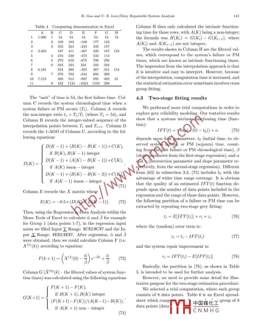 Grey Repairable System AnalysisRenkuan Guo*Department of Statistical Sciences, University of Cape Town, Cape Town, South AfricaCharles Ernie LoveFaculty of Business Administrations, Simon Fraser University, Burnaby, B. C. V5A 1S6, CanadaAbstract: In this paper, we systematically discuss the basic concepts of grey theory, particularly the grey differential equa-tion and its mathematical foundation, which is essentially unknown in the reliability engineering community. Accordingly,we propose a small-sample based approach to estimate repair improvement effects by partitioning system stopping timesinto intrinsic functioning times and repair improvement times. An industrial data set is used for ilustrative purposes in astepwise manner.Keywords: Grey theory, grey differential equation, intrinsic functioning times, repair improvement effects.1 Introductionhidden behind the collected data, and not the under-lying distribution. As long as a dynamic rule, even aDifferent from a mathematician, a statistician mustlocal and imprecise one is discovered, why should we beanalyze data collected from the real world and extractconcerned what distribution governs the data? In sum-rule(s) about reality from the data. Quite often, statis-mary, the adequateness of information depends uponticians luse existing sample distributions as a guidelinethe way we extract dynamics from the data. It may beto fit data and perform statistical hypothesis testing. Adistribution in mind is a priori knowledge in nature. Itby statistician's distributional thinking. Such a think-is often the exercise that for given data, according to re-ing logic has dominated statisticians for more than alated literature or his/ her own experience, a researchercentury, and has created today's large-sample statisti-estimates parameters according to a class of distribu-cal theory empire. A realistic data analyst should betion and an asymptotic variance-covariance matrix forconcerned with the final destination - the dynamicsestimators. As long as the statistical significance levelunderlying the data rather than the route of thinking.is satisfactory, most researchers will happily report andIn this paper, we are trying to engage in an effortpublish their findings. Therefore, a critical requirementto extract dynamics information underlying a discreteto facilitate statistical data analysis is that a sampledata sequence in terms of grey thinking, typically withsize be large enough. Such a prerequisite makes clas-a small sample size (as little as four). For this rea-sical statistics powerless whenever facing a small datason, we will use the next section to introduce the basicsample. It is obvious that statistical thinking - i.e.concepts of grey system theoryl1.drawing a conclusion from data, be corrected, but sucha correct intention is often haunted by small sample2 Grey processessize, which is often regarded as inadequate information.How much information is adequate is a matter to .2.1 Grey theory in generalbe debated. According to standard statistical thinking,a dynamic rule underlying collected data is discoveredA methodology to solve random uncertainty is prob-by distribution-fitting; therefore, large sample theoryability and statistics, i.e. to treat data in terms of sta-is inevitably employed. In this thinking pattern, onlytistical laws and prior (probability) laws. Since statis-information contained in a large enough sample is ad-tical laws are established via large samples, the moreequate. However, what is critical is the dynamic lawthe data the better will be the analysis. Therefore,straightforward statistical modeling is often dificult toManuscript received September 27, 2005; revised January 8,perform, and som中國煤化工°cost con-2006.siderations). If VYHCNMH and lok at* Corresponding author. E-mail address: rguo@stats.uct.ac.zathe real world froSxample by132International Journal of Automation and Computing 2 (2006) 131-144looking at system dynamics from the viewpoint of thelished based on discrete data, ie. a grey diferentialdegree of information availability, we will walk out fromequation.the shadow of large sample statistics.Researchers often believe that the time sequence ofIn modern control theory, system dynamics are clas-a single dimension can only provide very limited in-sified by the degree of information completeness, andformation. Some researchers believe there is a limi-accordingly diferent methodologies are developed fortation to treating data containing large relational sys-each. Table 1 offers a general picture for three dynamictems based on a“1-dimensional”point of view. How-systems classified using information adequacy criterion.ever,researchers of grey theory believe that a timesequence contains extremely rich information, whichTable 1 Three systems classifed via informationBlackGreyWhitepate in a dynamic system process. For example, letInformationindistinguishablebright and{Xo(t)} be a set taken from a variables time series. Inppearance:learthe real world, it is hard to assume a variable playingProcessnewreplacementold andits role alone, and rather some other p variables, saybetween new and old known{Zk(t),k: = 1,2,.,p}, also actively participate in aPropertychaotic and multi- levelpurespecific dynamic process. A common exercise in theignorant knowledgeMethodology negation sublimateconfirmation)ast was to select j principal control factors to buildAttitudeindulgence tolerancerigorousa mathematical model, while the exercise in grey the-Resultno solution no uniqueuniqueory is try to rebuild a dynamic process according tosolutioninformation contained in {Xo(t)}. .A critical feature of a grey system is informationNow let us state the two basic principles in greyincompleteness. The task of establishing a model un-theory. A grey concept is one whose connotationder the guidance of grey system theory is inevitably tois hazy and vague, but which has a clear bound-seek model built based on a small size data sample. Itsary an