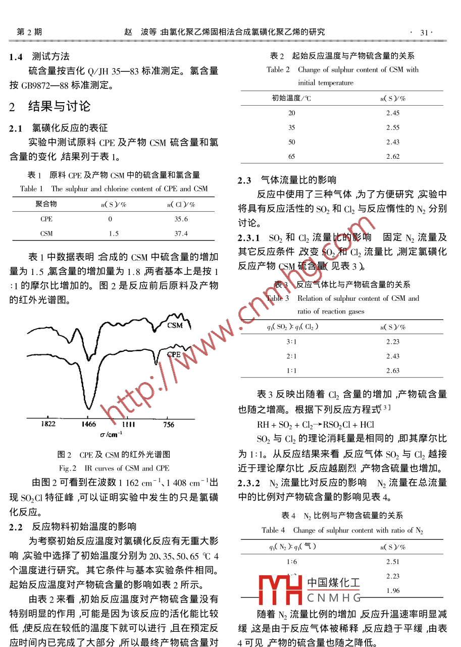 第28卷第2期北京化工大學(xué)學(xué)報(bào)Vol.28 ,No.22001年JOURNAL OF BEIJING UNIVERSITY OF CHEMICAL TECHNOLOGY2001由氯化聚乙烯固相法合成氯磺化聚乙烯的研究X波周明義喬輝焦翠云丁筠(北京化工大學(xué)材料科學(xué)與工程學(xué)院,北京100029)摘要:研究了由氯化聚乙烯( CPE固相法合成氯磺化聚乙烯CSM )的反應(yīng)條件對(duì)反應(yīng)過(guò)程和最終產(chǎn)物CSM硫含量的影響。結(jié)果表明利用固相法可將CPE合成為CSM其硫含量可在小于3.2%(質(zhì)量分?jǐn)?shù))的范圍內(nèi)調(diào)節(jié),且具有方法簡(jiǎn)單工藝合理,合成時(shí)間短等優(yōu)點(diǎn)。關(guān)鍵詞:氯化聚乙烯;氯磺化聚乙烯;硫含量中圖分類號(hào):TQ 325. 12 ;TQ 33.92氯磺化聚乙烯( CSM )作為特種合成橡膠在建量并在混合器中混合、預(yù)熱,由熱電偶和控溫裝置筑、電線電纜、汽車零部件、工業(yè)等方面都有重要用控制然后進(jìn)入反應(yīng)器在紫外光引發(fā)下與達(dá)到預(yù)定;途1。杜邦公司在1952年率先實(shí)現(xiàn)工業(yè)化生產(chǎn)采溫度的氯化聚乙烯反應(yīng)預(yù)熱混合氣體的溫度及反用的是溶液法2]即將PE溶解在鹵代烴中通入Cl2應(yīng)溫度由相應(yīng)的熱電偶檢測(cè)和控制。氯磺化反應(yīng)到和SO2氣體來(lái)合成,但污染嚴(yán)重。固相法合成工藝達(dá)預(yù)定的反應(yīng)時(shí)間后,停 供氯氣和二氧化硫并自然具有反應(yīng)時(shí)間短成本低污染少工藝簡(jiǎn)單合理對(duì)降溫繼續(xù)以氮?dú)獯党龤埩舻姆磻?yīng)氣體。反應(yīng)的尾設(shè)備腐蝕性小等優(yōu)點(diǎn)是目前合成CSM的一個(gè)重要?dú)庥蓧A液吸收后排空。研究方向。流量計(jì)倉(cāng)挖壓閥由PE固相法合成CSM分兩步比較合理3],首先由聚乙烯( PE冶成氯化聚乙烯CPE) ,由于PE的tr 向高結(jié)晶性這-步需在較高溫度下進(jìn)行然后在相對(duì)燈燈四較低溫度下由CPE再合成CSM這樣副反應(yīng)較少,Yo網(wǎng)反應(yīng)易于控制。固相法合成CPE的研究較多而且2已有小規(guī)模工業(yè)化生產(chǎn)但由CPE進(jìn)-步反應(yīng)制得troCSM的研究很少。本文旨在討論由CPE合成CSM反應(yīng)過(guò)程中的工藝參數(shù)為工業(yè)化生產(chǎn)CSM提供基TE-熱電偶;TI-溫度表;PI- -壓力表;礎(chǔ)數(shù)據(jù)。PSV-壓力安全閥;TC-溫度控制儀圖1氯磺化合成反應(yīng)的實(shí)驗(yàn)裝置圖1實(shí)驗(yàn)部分Fig.1Installation of the chlorosulfonated synthesis process1.1原料實(shí)驗(yàn)中確定了合適的氣體總流量,以使物料沸氯化聚乙烯( CPE ) ,CPE135A ,濰坊亞星集團(tuán);騰效果較好保證反應(yīng)均勻進(jìn)行。C2工業(yè)級(jí),北京化工二廠;氣體SO2 ,工業(yè)級(jí),北京本實(shí)驗(yàn)設(shè)備較接近工業(yè)化條件研究結(jié)果可為氦普北分氣體有限公司普N2工業(yè)級(jí)北京電子管以后工業(yè)化生產(chǎn)CSM提供參考依據(jù)。廠。1.3實(shí)驗(yàn)過(guò)程1.2實(shí)驗(yàn)裝置中國(guó)煤化工基礎(chǔ)根據(jù)研究需要,圖1是氯磺化合成反應(yīng)的實(shí)驗(yàn)裝置示意圖。.改變MYHCNMHG研究各因素對(duì)反應(yīng)的Cl2、SO2和N2由儲(chǔ)存鋼瓶經(jīng)過(guò)減壓和流量計(jì)控制流影響。反應(yīng)起始溫度為50 C ;氣體體積流量比為SO2:Cl2:N2= 3:1:2 ;反應(yīng)時(shí)間30 min ;反應(yīng)全程紫外收稿日期:2000-09-28光照射波長(zhǎng)λ=253.7nm;預(yù)熱混合氣體溫度與起第一作者:男,1970年生工學(xué)碩士始反應(yīng)溫度相同。第2期趙波等:由氯化聚乙烯固相法合成氯磺化聚乙烯的研究31.1.4測(cè)試方法表2起始反應(yīng)溫 度與產(chǎn)物硫含量的關(guān)系硫含量按吉化Q/JH 35- -83 標(biāo)準(zhǔn)測(cè)定。氯含量Table 2 Change of sulphur content of CSM with按GB9872- -88 標(biāo)準(zhǔn)測(cè)定。initial temperature初始溫度/Cu(S)%2結(jié)果與討論2(2.452.1氯磺化反 應(yīng)的表征352.55實(shí)驗(yàn)中測(cè)試原料CPE及產(chǎn)物CSM硫含量和氯5(2.43含量的變化結(jié)果列于表1。62.62表1原料CPE 及產(chǎn)物CSM中的硫含量和氯含量2.3氣體流 量比的影響Table 1 The sulphur and chlorine content of CPE and CSM反應(yīng)中使用了三種氣體為了方便研究實(shí)驗(yàn)中聚合物u( C1)%將具有反應(yīng)活性的SO2和Cl2與反應(yīng)惰性的N2分別CPE35.6討論。CSM1.537.42.3.1 SO2 和Cl2流量比的影響固定N2流量及.表1中數(shù)據(jù)表明合成的CSM中硫含量的增加其它反應(yīng)條件,改變SO2和Cl2流量比測(cè)定氯磺化量為1.5氯含量的增加量為1.8兩者基本上是按1反應(yīng)產(chǎn)物CSM硫含量(見(jiàn)表3):1的摩爾比增加的。圖2是反應(yīng)前后原料及產(chǎn)物表3反應(yīng)氣體比與產(chǎn) 物硫含量的關(guān)系的紅外光譜圖。Table 3 Relation of sulphur content of CSM andratio of reaction gasescsMhq( SO2):q(C2)3:12.232:11:2.63表3反映出隨著Cl2含量的增加,產(chǎn)物硫含量也隨之增高。根據(jù)下列反應(yīng)方程式3]1822111756RH + SO2 + Cl2- >RSO2Cl + HClσ/cm ISO2與C2的理論消耗量是相同的,即其摩爾比圖2CPE及CSM的紅外光譜圖為1:1。從反應(yīng)結(jié)果來(lái)看反應(yīng)氣體S02與Cl2越接Fig.2 IR curves of CSM and CPE近于理論摩爾比反應(yīng)越劇烈產(chǎn)物含硫量也增加。由圖2可看到在波數(shù)1 162 cm-'、1 408 cm-'出.2.3.2 N2 流量比對(duì)反應(yīng)的影響N2 流量在總流量現(xiàn)SO2Cl特征峰,可以證明實(shí)驗(yàn)中發(fā)生的只