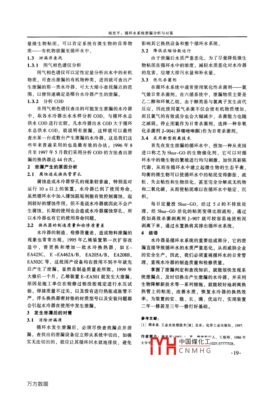 INDUSTRIAL WATER WASTEWATER工業(yè)用水與廢水Vol 35 No. 1 2004循環(huán)水系統(tǒng)泄漏分析與對(duì)策姚里平(南京揚(yáng)子石化烯烴廠循環(huán)水車間,江蘇南京210048)摘要:分析了循環(huán)水系統(tǒng)產(chǎn)生泄漏的原因和危害,提出了泄漏的判定查找方法、解決系統(tǒng)泄漏的對(duì)策,并得到了實(shí)踐的驗(yàn)證,對(duì)其它棄在泄漏的循環(huán)水系統(tǒng)有一定的借鑒作用。關(guān)鍵詞:循環(huán)水;泄漏;分析;對(duì)策中圖分類號(hào):TU9914文獻(xiàn)標(biāo)識(shí)碼:B文章編號(hào):1009-2455(2004)01-0018-02循環(huán)水系統(tǒng)或多或少都存在著泄漏問(wèn)題,特別值的1倍以上。揚(yáng)子烯烴廠二循正常情況下總鐵維是運(yùn)行時(shí)間較長(zhǎng)的循環(huán)冷卻水系統(tǒng)容易產(chǎn)生泄漏。持在0.05~0.10mg/L之間,1996年8月至1997筆者通過(guò)長(zhǎng)期的觀察,總結(jié)了泄漏判斷的方法和處年5月間曾發(fā)生過(guò)水換熱器大面積泄漏,造成水理措施。質(zhì)極度惡化。總鐵最高達(dá)05mg/L,濁度最高達(dá)1泄漏的判定與查找22mg/L,監(jiān)測(cè)試管腐蝕率高達(dá)06mg/L。循環(huán)水系統(tǒng)產(chǎn)生泄漏,必然會(huì)引起循環(huán)水水質(zhì)1.23余氯以及它的各項(xiàng)分析指標(biāo)發(fā)生異變,水冷器換熱效果循環(huán)水系統(tǒng)一般都采用氯氣殺菌。當(dāng)有機(jī)物泄的降低,因而可以通過(guò)觀察水質(zhì),以及取樣分析等漏時(shí),微生物藻類大量繁殖,氯氣消耗就增加,另來(lái)研判水質(zhì)狀況,通過(guò)對(duì)以下各項(xiàng)指標(biāo)在泄漏時(shí)產(chǎn)外有機(jī)物也與氯氣產(chǎn)生化學(xué)反應(yīng),消耗氯氣,所以生的異變綜合分析,判斷系統(tǒng)是否泄漏在裝置發(fā)生泄漏時(shí)測(cè)得的余氯比正常值低了許多1.1循環(huán)水水質(zhì)觀察若泄漏量大,甚至可能測(cè)不到余氯。當(dāng)有機(jī)物質(zhì)泄漏至循環(huán)水中,微生物大量繁1.24細(xì)菌總數(shù)與粘泥量殖,藻類快速滋生,水就變得腥臭,顏色變成黃褐循環(huán)水系統(tǒng)細(xì)菌總數(shù)一般在1×105個(gè)/mL以色或深褐色,且可以觀察到水中漂浮著許多絮狀或下,粘泥量控制在3mLm3以下。如實(shí)測(cè)值遠(yuǎn)遠(yuǎn)鵝毛片狀懸浮物。大于該指標(biāo),說(shuō)明細(xì)菌獲得了充足營(yíng)養(yǎng),細(xì)菌繁殖1.2日常報(bào)表數(shù)據(jù)分析活躍,有泄漏的可能。烯烴廠六循在2000年3月1.2.1旁濾池進(jìn)、出口濁度的有機(jī)物泄漏中,粘泥量最高曾達(dá)到80ml/m3。所由于泄漏產(chǎn)生大量微生物,造成旁濾池濾料嚴(yán)以粘泥量的異常大幅上升是判斷循環(huán)水系統(tǒng)有泄漏重污染,過(guò)濾效果變差,就造成了旁濾池的出口濁的重要參考指標(biāo)。度與進(jìn)口濁度幾乎相等,甚至大于進(jìn)口濁度。1.2.5垢樣分析1.2.2總鐵與濁度在日常分析報(bào)表中發(fā)現(xiàn)以上水質(zhì)指標(biāo)有異常變大多數(shù)微生物都會(huì)對(duì)金屬產(chǎn)生腐蝕,硫酸鹽還化,可以從冷卻塔池取粘泥或取水中的漂浮物進(jìn)行原菌會(huì)對(duì)金屬(鐵)產(chǎn)生較大的腐蝕,被腐蝕下來(lái)的垢樣分析。如六循2000年3月,從水質(zhì)分析報(bào)表鐵離子在氧氣作用下氧化生成Fe(OH)3中和塔池循環(huán)水水質(zhì)觀察中發(fā)現(xiàn)異常,可初步判斷Fe(OH)3為黃色或褐色沉淀物,會(huì)造成循環(huán)水發(fā)生了泄漏,為了證實(shí)我們的判斷,取塔池粘泥進(jìn)顏色加深,導(dǎo)致濁度升高。另一方面微生物藻類本行化學(xué)分析,結(jié)果發(fā)現(xiàn)550℃灼燒失重量高達(dá)身具有光的散射作用,增大輝濁度。當(dāng)泄漏產(chǎn)生81.70%,50℃-950℃灼燒失重量為2.87%,而時(shí),微生物數(shù)量會(huì)急劇上升,金屬腐蝕加重,循環(huán)PO3,FeO3,ZnO,CaO,Mg0分別只有1.6%%,水中的總鐵就會(huì)大幅上升,濁度也會(huì)上升,達(dá)正常3.86%,461%,607%,1.21%。顯然系統(tǒng)存有大收稿日期:2003-10-22;修回日期:2004-01-05中國(guó)煤化工CNMHG姚里平:循環(huán)水系統(tǒng)泄漏分析與對(duì)策量微生物粘泥??梢钥隙ㄏ到y(tǒng)有微生物的營(yíng)養(yǎng)物影響其它換熱設(shè)備和整個(gè)循環(huán)水系統(tǒng)。質(zhì)——有機(jī)物泄漏至循環(huán)水中。3.2降低濃縮倍數(shù)運(yùn)行1.3泄漏源查找由于泄漏后水質(zhì)嚴(yán)重惡化,為了盡量降低微生1.3.1用氣相色譜儀分析物粘泥在循環(huán)水中的濃度,減輕水質(zhì)惡化對(duì)水冷器用氣相色譜儀可以定性定量分析出水中的有機(jī)的危害,應(yīng)增大排污水量和補(bǔ)水量。物質(zhì),可查出泄漏的有機(jī)物種類,進(jìn)而就可查出產(chǎn)3.3優(yōu)化殺菌漏的那一類水冷器,可大大縮小查找漏點(diǎn)的范在循環(huán)水系統(tǒng)中通常使用氧化性殺菌劑——氯圍,以便快速確定是哪臺(tái)水冷器產(chǎn)生的泄漏。氣做日常殺菌劑。在六循系統(tǒng)中,泄漏物質(zhì)主要是1.3.2分析COD乙二醇和環(huán)氧乙烷,由于醇類易與氯離子發(fā)生鹵代在用氣相色譜儀查出的可能發(fā)生泄漏的水冷器反應(yīng),因此使用氯氣殺菌不僅會(huì)使有機(jī)物質(zhì)增加中,取各水冷器出水水樣分析COD,與循環(huán)水總而且氯氣的有效成分也會(huì)大幅減少,殺菌能力也隨供水CoD進(jìn)行比較,凡水冷器出水COD大于循環(huán)之減弱