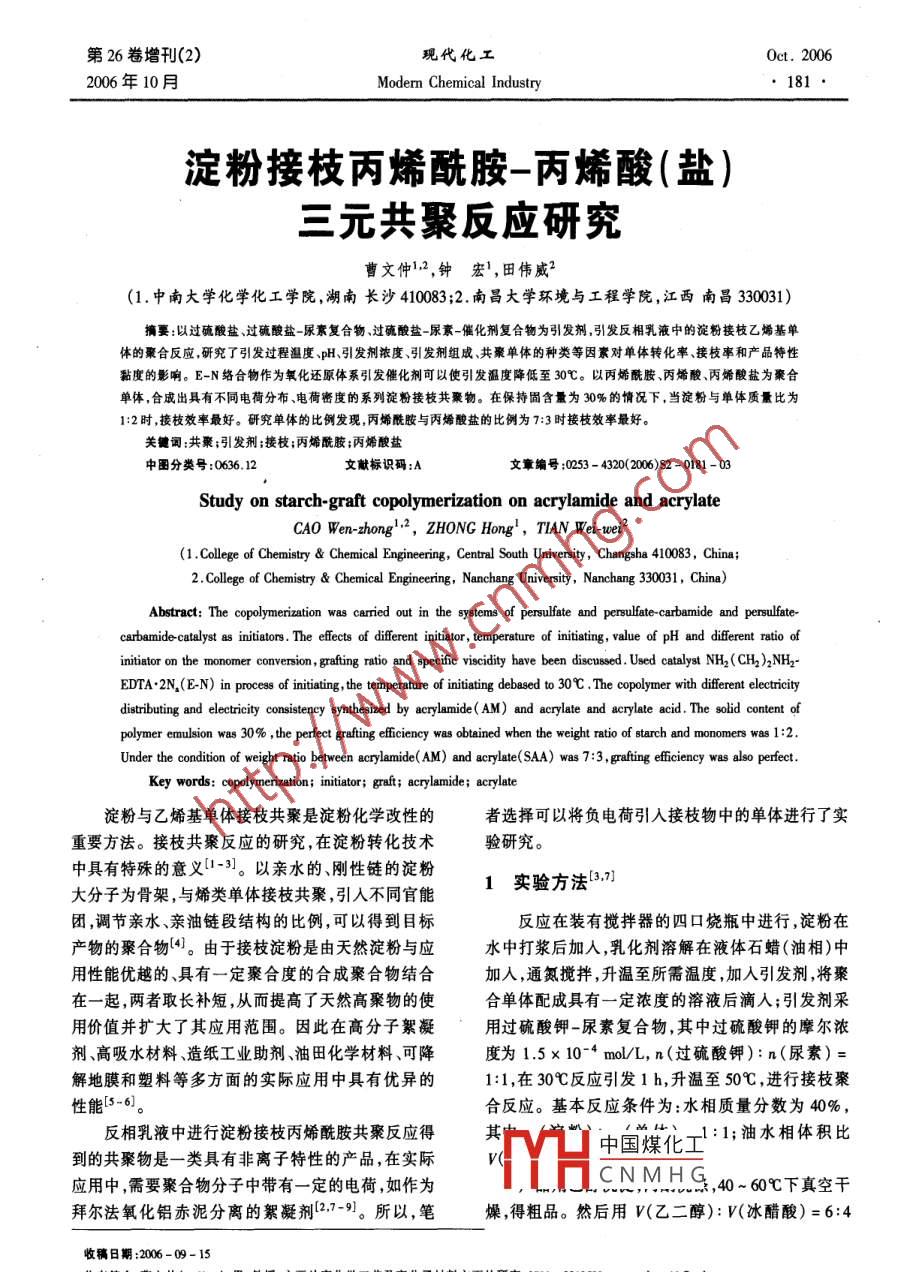第26卷增刊(2)現(xiàn)代化工0ct. 20062006年10月Modem Chemical Industry●181.淀粉接枝丙烯酰胺- -丙烯酸(鹽)三元共聚反應(yīng)研究曹文仲1.2,鐘宏', 田偉威2(1.中南大學(xué)化學(xué)化工學(xué)院,湖南長沙410083;2.南昌大學(xué)環(huán)境與工程學(xué)院,江西南昌330031)摘要:以過硫酸鹽、過硫酸鹽-尿素復(fù)合物、過硫酸鹽-尿素-催化劑復(fù)合物為引發(fā)劑,引發(fā)反相乳液中的淀粉接枝乙烯基單體的聚合反應(yīng),研究了引發(fā)過程溫度.pH、引發(fā)劑濃度、引發(fā)劑組成.共聚單體的種類等因素對單體轉(zhuǎn)化率、接枝率和產(chǎn)品特性黏度的影響。E-N絡(luò)合物作為氧化還原體系引發(fā)催化劑可以使引發(fā)溫度降低至30C。以丙烯酰胺、丙烯酸、丙烯酸鹽為聚合單體,合成出具有不同電荷分布、電荷密度的系列淀粉接枝共橐物。在保持固含量為30%的情況下,當(dāng)?shù)矸叟c單體質(zhì)量比為1:2時,接枝效率最好。研究單體的比例發(fā)現(xiàn),丙烯酰胺與丙烯酸鹽的比例為7:3時接枝效率最好。關(guān)鍵詞:共聚;引發(fā)劑;接枝;丙烯酰胺;丙烯酸鹽中圈分類號:0636.12文獻標(biāo)識碼:A文章編號:0253 - 4320(2006)S2 - 0181-03Study on starch-graft copolymerization on acrylamide and acrylateCAO Wen- zhong'.2, ZHONG Hong' ,TIAN Wei wei?2(1.College of Chemistry & Chemical Engineering, Central South University, Changsha 410083, China;2.College of Chemistry & Chemical Engiering, Nanchang University, Nanchang 330031, China)Abstract: The copolymerization was carried out in the systems of persulfate and persulfate-carbamide and persulfate-carbamidecatalyst as itiaos. The efets of dfferent intiator, temperature of ititig, value of pH and diferent ratio ofinitiator on the monomer conversion, grafting ratio and specific viscidity have been discussed . Used catalyst NH2( CH)2NH2-EDTA.2N.(E-N) in process of initiating, the temperature of initiating debased to 30C .The copolymer with dfferent electricitydistributing and eiecity consistency synthesized by acrylamide(AM) and acrylate and acrylate acid . The solid content ofpolymer emulsion was 30% ,the perfeet grafting eficienecy was obtained when the weight ratio of starch and monomers was 1:2.Under the condition of weight ratio between acrylamide(AM) and acrylate(SAA) was 7:3, gafting eficiency was also perfect.Key words: copolymerization; initiator; graft; acrylamide; acrylate淀粉與乙烯基單體接枝共聚是淀粉化學(xué)改性的者選擇可以將負電荷引人接枝物中的單體進行了實重要方法。接枝共聚反應(yīng)的研究,在淀粉轉(zhuǎn)化技術(shù)驗研究。.中具有特殊的意義[1-3]。以親水的、剛性鏈的淀粉1實驗 方法15371)大分子為骨架,與烯類單體接枝共聚,引人不同官能團,調(diào)節(jié)親水、親油鏈段結(jié)構(gòu)的比例,可以得到目標(biāo)反應(yīng)在裝有攪拌器的四口燒瓶中進行,淀粉在產(chǎn)物的聚合物[4。由于接枝淀粉是由天然淀粉與應(yīng)水中打漿后加入,乳化劑溶解在液體石蠟(油相)中用性能優(yōu)越的、具有一-定聚合度的合成聚合物結(jié)合加人,通氮攪拌,升溫至所需溫度,加入引發(fā)劑,將聚在一起,兩者取長補短,從而提高了天然高聚物的使合單體配成具有一定濃度的溶液后滴人;引發(fā)劑采用價值并擴大了其應(yīng)用范圍。因此在高分子絮凝用過硫酸鉀-尿素復(fù)合物,其中過硫酸鉀的摩爾濃劑、高吸水材料、造紙工業(yè)助劑、油田化學(xué)材料、可降度為1.5x 10-4 mol/L,n(過硫酸鉀):n(尿素) =解地膜和塑料等多方面的實際應(yīng)用中具有優(yōu)異的1:1,在30C反應(yīng)引發(fā)1 h,升溫至50C ,進行接枝聚性能[5-6]。合反應(yīng)?;痉磻?yīng)條件為:水相質(zhì)量分數(shù)為40%,反相乳液中進行淀粉接枝丙烯酰胺共聚反應(yīng)得中國煤化1日;油水 相體積比到的共聚物是- - 類具有非離子特性的產(chǎn)品,在實際應(yīng)用中,需要聚合物分子中帶有一定的電荷,如作為HCH.CN,MHGs,40- 60下真空干拜爾法氧化鋁赤泥分離的絮凝劑[2.7-9]。所以,筆燥,得粗品。然后用V(乙二醇): V(冰醋酸)=6:4收稿日期:2006-09-15作耆箐貨冀痊仲(1963- ),男,教授,主要從事化學(xué)工藝及高分子材料方面的研究,0792 - 83125.cwenbong13@33 yho . co .cn。現(xiàn)代化工第26卷增刊(2)的混合液抽提除去均聚物,干燥后用下式計算單體酸主要以一C00H形式存在,隨pH增大,-C00的轉(zhuǎn)化率(C)和接枝率(G):比例增大,當(dāng)pH大于7時,反應(yīng)速率急劇增加,使得C = [(m,- mo)/m.] x 100%(1)反應(yīng)溫度上升,引發(fā)了丙烯酰胺雙鍵的斷裂反應(yīng),自G = [(m2- m)/mo] x 100%(2)由基濃度增大,丙烯酰胺自聚反應(yīng)加速,使得接枝率式中mo為淀粉質(zhì)量(g);m。為單體質(zhì)量(g);m;為和分子量呈下降趨勢。粗產(chǎn)品質(zhì)量(g); m2為抽提后產(chǎn)品質(zhì)量(g)。共聚物用奧式黏度計測定樣品各稀釋點的7p, .計算特性黏度[η]。器130-共聚物的陰離子度采用將樣品酸化后用乙醇充20 t分洗滌,加入過量的氫氧化鉀溶液使羧酸基成鹽,再11056785用鹽酸標(biāo)準(zhǔn)溶液滴定的方法測定。pH2實驗結(jié)果與討論圖3 pH對接枝率的影響2.1聚合單體配比的影響2.3 丙烯酰胺-淀粉-丙烯酸鈉三元體的催化共聚改變丙烯酰胺(AM)與丙烯酸(AC)的配比,對淀粉接枝丙烯酰胺的聚合,引人羧酸鹽基團,可接枝聚合反應(yīng)的影響見圖1、圖2。以賦予其不同的應(yīng)用性能。因此,對具有典型結(jié)構(gòu)10的淀粉丙烯酰胺和丙烯酸鈉進行共聚研究,對其不80個同功能性