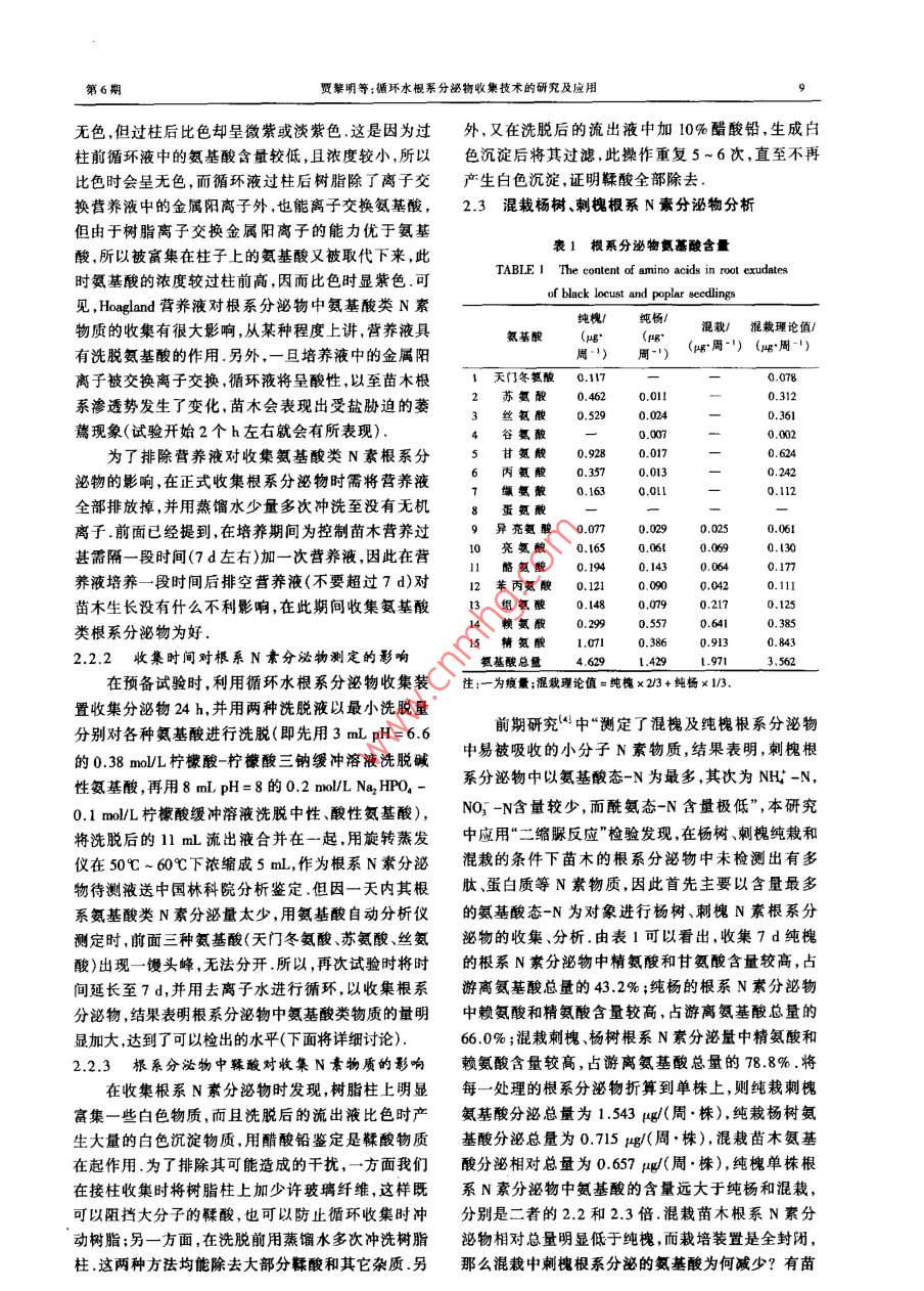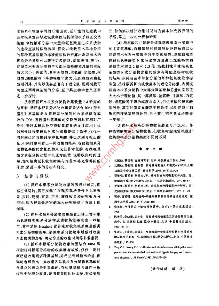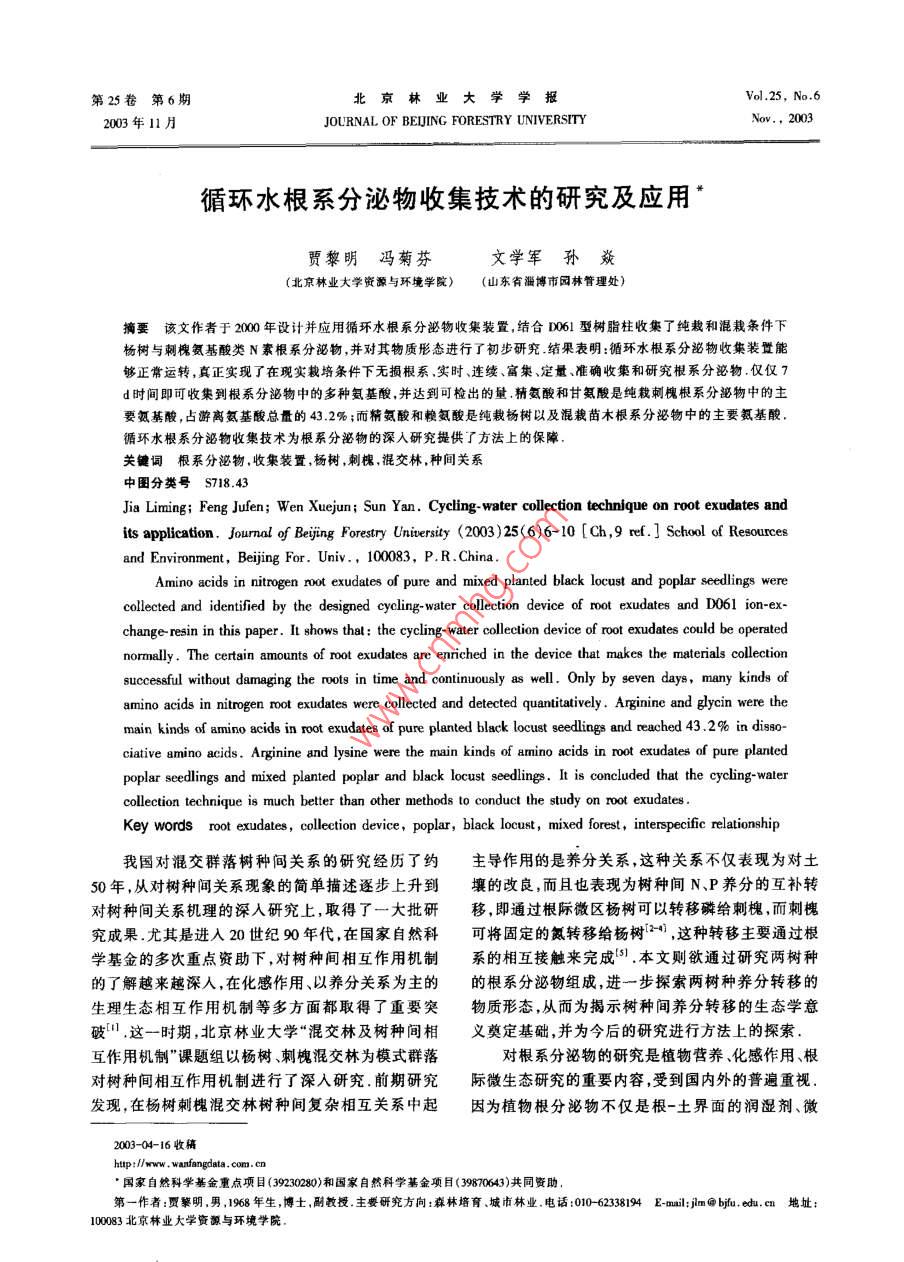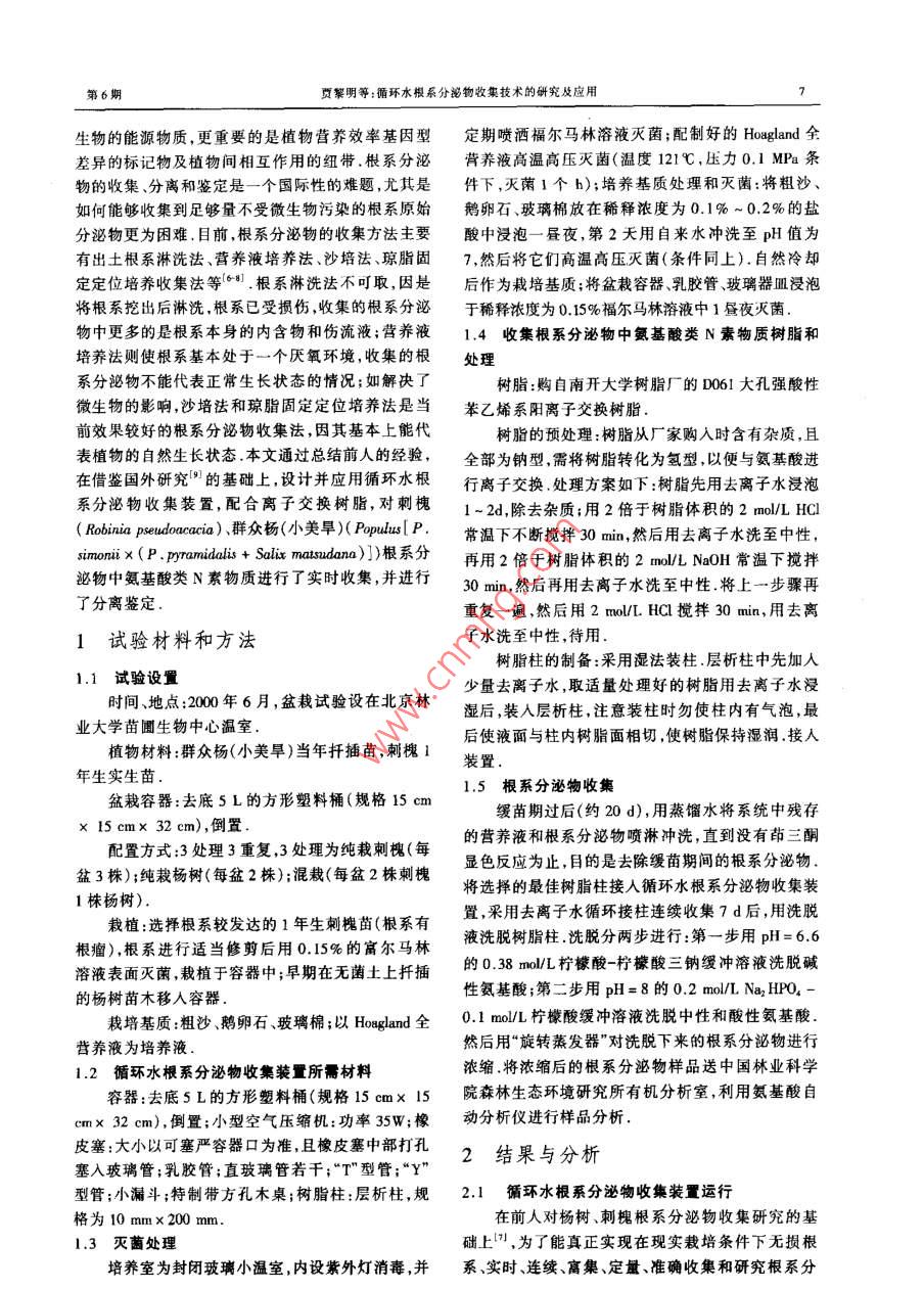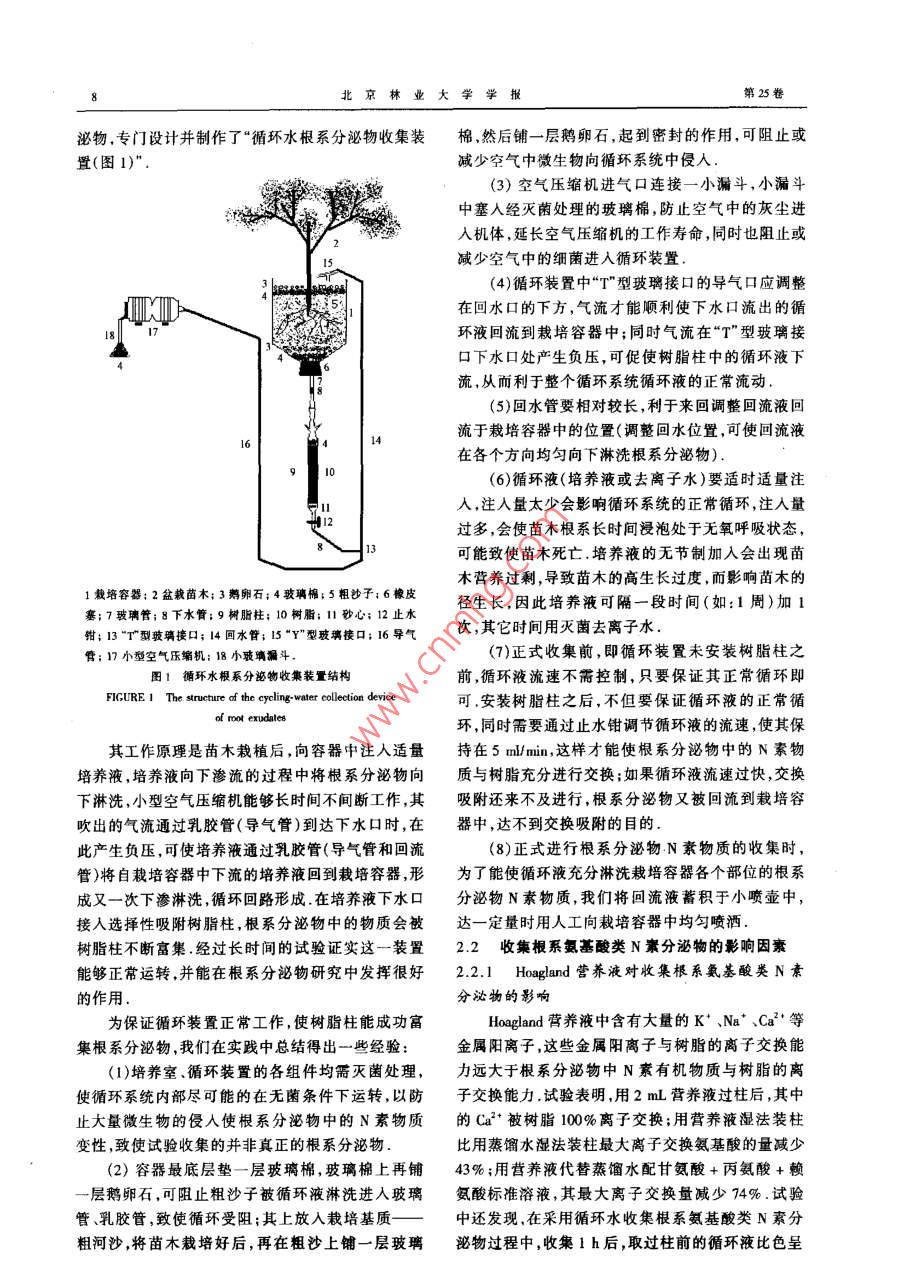 第25卷第6期北京林業(yè)大學(xué)學(xué)報(bào)Vol.25, No.62003年11月JOURNAL OF BEIJING FORESTRY UNIVERSITYNow.. 2003循環(huán)水根系分泌物收集技術(shù)的研究及應(yīng)用*賈黎明馮菊芬文學(xué)軍孫焱(北京林業(yè)大學(xué)資源與環(huán)境學(xué)院) (山東 省淄博市國(guó)林管理處)摘要該文作者于2000年設(shè)計(jì)并應(yīng)用循環(huán)水根系分泌物收集裝置,結(jié)合D061型樹(shù)脂柱收集了純裁和混栽條件下楊樹(shù)與刺槐氨基酸類(lèi)N索根系分泌物,并對(duì)其物質(zhì)形態(tài)進(jìn)行了初步研究.結(jié)果表明:循環(huán)水根系分泌物收集裝置能夠正常運(yùn)轉(zhuǎn),真正實(shí)現(xiàn)了在現(xiàn)實(shí)裁培條件下無(wú)損根系,實(shí)時(shí)、連續(xù)、富樂(lè)定量、準(zhǔn)確收集和研究根系分泌物.僅僅7d時(shí)間即可收集到根系分泌物中的多種氨基酸.并達(dá)到可檢出的量精氨酸和甘氨酸是純裁刺槐根系分泌物中的主要氨基酸,占游離氨基酸總量的43.2%;而精氨酸和賴(lài)氨酸是純裁楊樹(shù)以及混裁苗木根系分必物中的主要氨基酸.循環(huán)水根系分泌物收集技術(shù)為根系分泌物的深入研究提供了方法上的保障.關(guān)鍵詞根系分泌物,收集裝置,楊樹(shù),刺槐,混交林,種間關(guān)系中圖分類(lèi)號(hào)S718.43Jia Liming; Feng Jufen; Wen Xuejun; Sun Yan. Cycling water collection technique on root exudates andits application. Jourmal of Beijing Forestry University (2003)25(6)6-10 [Ch,9 ref.] School of Resourcesand Environment, Beijing For. Univ., 10083, P. R. China. .Amino acids in nitrogen root exudates of pure and mixed planted black locust and poplar seedlings werecollected and identified by the designed cycling water olleetion device of moot exudates and D061 ion-ex-change rsin in this paper. It shows thal: the ecycling- water cllection device of root exudates could be operatednormally. The certain amounts of root exudates are enriched in the device that makes the materials collectionsccessful without damaging the roots in time and continuously as well. Only by seven days, many kinds ofamino acids in nitrogen root exudates were collected and detected quantitatively. Anginine and glycin were themain kinds of amino acids in root exudates of pure planted black locust seedlings and reached 43.2% in disso-ciative amino acids. Anginine and lysine were the main kinds of amino acids in root exudates of pure plantedpoplar seedlings and mixed planted poplar and black locust seedlings. It is concluded that the ecycling- watercollection technique is much better than other methods to conduct the study on root exudates。Key words root exudates,clletion device, poplar, black locust, mixed forest, interspecific relationship我國(guó)對(duì)混交群落樹(shù)種間關(guān)系的研究經(jīng)歷了約主導(dǎo)作用的是養(yǎng)分關(guān)系,這種關(guān)系不僅表現(xiàn)為對(duì)土50年,從對(duì)樹(shù)種聞關(guān)系現(xiàn)象的簡(jiǎn)單描述逐步上升到壤的改良,而且也表現(xiàn)為樹(shù)種間N、P養(yǎng)分的互補(bǔ)轉(zhuǎn)對(duì)樹(shù)種間關(guān)系機(jī)理的深入研究上,取得了一大批研移,即通過(guò)根際微區(qū)楊樹(shù)可以轉(zhuǎn)移磷給刺槐,而刺槐究成果.尤其是進(jìn)入20世紀(jì)90年代,在國(guó)家自然科可將固定的氮轉(zhuǎn)移給楊樹(shù)12-4),這種轉(zhuǎn)移主要通過(guò)根學(xué)基金的多次重點(diǎn)資助下,對(duì)樹(shù)種間相互作用機(jī)制系的相互接觸來(lái)完成5).本文則欲通過(guò)研究?jī)蓸?shù)種的了解越來(lái)越深人,在化感作用、以養(yǎng)分關(guān)系為主的的根系分泌物組成,進(jìn)--步探索兩樹(shù)種養(yǎng)分轉(zhuǎn)移的生理生態(tài)相互作用機(jī)制等多方面都取得了重要突物質(zhì)形態(tài),從而為揭示樹(shù)種間養(yǎng)分轉(zhuǎn)移的生態(tài)學(xué)意破" .這一時(shí)期,北京林業(yè)大學(xué)“混交林及樹(shù)種間相義奠定基礎(chǔ),并為今后的研究進(jìn)行方法上的探索.互作用機(jī)制”課題組以楊樹(shù)、刺槐混交林為模式群落對(duì)根系分泌物的研究是植物營(yíng)養(yǎng)、化感作用、根對(duì)樹(shù)種間相互作用機(jī)制進(jìn)行了深人研究.前期研究際微生態(tài)研究的重要內(nèi)容,受到國(guó)內(nèi)外的普遍重視.發(fā)現(xiàn),在楊樹(shù)刺槐混交林樹(shù)種間復(fù)雜相互關(guān)系中起因?yàn)橹参锔置谖锊粌H是根-土界面的潤(rùn)濕劑、微2003-04-16 收精htp://ww . wanfangdata. com.cn●國(guó)家自然科學(xué)基金重點(diǎn)項(xiàng)目(39230280)和國(guó)家自然科學(xué)基金項(xiàng)目(39870643)共同資助,第一作者:賈繁明,男,1968年生,博士,副教授.主姜研究方向:森林培育、城市林業(yè)。電話:010-62338194 E mljim@bjfu.edu.cn地址:100083北京林業(yè)大學(xué)資源與環(huán)境學(xué)院.第6期賈絮明等:循環(huán)水根系分泌物收類(lèi)技術(shù)的研究及應(yīng)用生物的能源物質(zhì),更重要的是植物營(yíng)養(yǎng)效率基因型定期噴灑福爾馬林溶液滅菌;配制好的Hoagland全差異的標(biāo)記物及植物間相互作用的紐帶.根系分泌背養(yǎng)液高溫高壓滅菌(溫度1219C,壓力0.1 MPa條物的收集、分離和鑒定是一個(gè)國(guó)際性的難題,尤其是件下,滅菌1個(gè)b);培養(yǎng)基質(zhì)處理和滅菌:將粗沙、如何能夠收集到足夠量不受微生物污染的根系原始鵝卵石、玻璃棉放在稀釋濃度為0.1% ~ 0.2%的鹽分泌物更為困難.目前,根系分泌物的收集方法