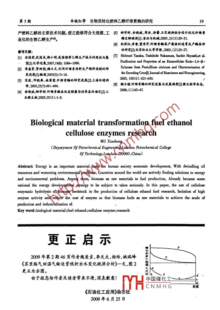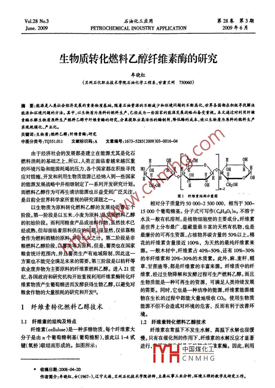 VoL 28 No. 3石油化工應(yīng)用第28卷第3期June 2009PETROCHEMICAL INOUSTRY APPLICATION200年6月生物質(zhì)轉(zhuǎn)化燃料乙醇纖維素酶的研究年曉紅(蘭州石化職業(yè)技術(shù)學(xué)院石油化學(xué)工程系,甘肅蘭州73006摘要:能源是人類社會(huì)經(jīng)濟(jì)發(fā)展的重要物質(zhì)基礎(chǔ)。隨著石油資源的不斷減少和環(huán)境問題的不斷惡化,世界各國都在積極尋找解決能源和環(huán)境問題的方瀆。其中,以生物質(zhì)為原料的燃料生產(chǎn),已經(jīng)成為一些國家的能源發(fā)展戰(zhàn)略而備受重視。本文通過對(duì)利用纖維素酶水解生物質(zhì)原料生產(chǎn)燃料乙醇中纖維素酶的研究,分高提取出高活性的酶制劑降低酶的成本,使以生物質(zhì)為原料的燃料生產(chǎn)實(shí)現(xiàn)規(guī)?;?、產(chǎn)業(yè)化。關(guān)鍵詞:生物質(zhì);燃料乙醇;纖維素酶;研究中圖分類號(hào):TQ35101文獻(xiàn)標(biāo)識(shí)碼A文章編號(hào):1673-5285(2009)03-0016-04由于經(jīng)濟(jì)社會(huì)的發(fā)展都是建立在能源尤其是化石燃料消耗的基礎(chǔ)之上,所以,人類正面臨著越來越沉重的環(huán)境污染和能源耗竭的壓力各個(gè)國家都在積極尋找B/GB應(yīng)對(duì)措施開發(fā)和利用生物質(zhì)能源已經(jīng)納入到一些國家的能源發(fā)展戰(zhàn)略中并相繼制定了一系列開發(fā)研究計(jì)劃CH2OH而燃料乙醇作為可再生清潔能源也日益受到廣泛關(guān)注,是目前全世界科學(xué)家所重視的研究課題之圖1纖維素結(jié)構(gòu)示意圖相對(duì)分子質(zhì)量約500002500000,相當(dāng)于300~以生物質(zhì)為原料轉(zhuǎn)化燃料乙醇的發(fā)展經(jīng)歷著三個(gè)階段。第一階段是以玉米、小麥為原料是發(fā)展燃料乙醇15000個(gè)葡萄糖基。分子式可寫作(CHO5)n。不溶于的初始階段。而利用糧食產(chǎn)品或油料作物雖然技術(shù)已水及一般有機(jī)溶劑。是植物細(xì)胞壁的主要成分纖維素經(jīng)成熟但卻面臨著原料供應(yīng)的問題。很顯然僅依靠糧是世界上分布最廣、蘊(yùn)藏量最豐富的天然有機(jī)物也是食作為燃料酒精的原料,并非長(zhǎng)久之計(jì)。第二階段是非最廉價(jià)的可再生資源,占植物界碳含量的%以上棉糧燃料乙醇階段以薯類等為原料但是薯類也在國家花的纖維素含量接近100,為天然的最純纖維素來糧食統(tǒng)計(jì)范圍內(nèi)并且薯類生產(chǎn)有地域限制因此這源。一般木材中纖維素占40%-50%,還有10%-30%方案也不能完全滿足未來的需要第三階段是以秸稈等的半纖維素和20%-30%的木質(zhì)素。此外麻麥稈、稻農(nóng)業(yè)廢棄物為主要原料的纖維素燃料乙醇。進(jìn)入21世草、甘蔗渣等都是纖維素的豐富來源。纖維質(zhì)中的纖紀(jì)各國政府和研究機(jī)構(gòu)開始重視利用纖維素酶轉(zhuǎn)化纖維素,經(jīng)過生物降解和發(fā)酵過程可生產(chǎn)燃料乙醇。而且維素物質(zhì)產(chǎn)生葡萄糖進(jìn)而發(fā)酵獲得生物乙醇,以避免對(duì)生物質(zhì)能是一種可再生的資源,可滿足人類持續(xù)發(fā)展糧食作物的大量損耗的研究和開發(fā)的需要。同時(shí),它也是一種潔凈的能源,纖維素能源植物在生長(zhǎng)的過程中都能大量地吸收CO2,使用生物質(zhì)1纖維素轉(zhuǎn)化燃料乙醇技術(shù)能源不但不會(huì)造成對(duì)環(huán)境的危害,反而有利于改善環(huán)境11纖維素的結(jié)構(gòu)及特點(diǎn)12纖維素轉(zhuǎn)化燃料乙醇技術(shù)纖維素( cellulose)是一種多糖物質(zhì)每個(gè)纖維素大維素在常溫下不發(fā)生水解,高溫下水解也很緩分子是由n個(gè)葡萄糖?;?葡萄糖酐),彼此以1-4甙慢。只有在催化劑的作用下,纖維素的水解反應(yīng)才顯著鍵(氧橋)聯(lián)結(jié)而形成的。如圖所示進(jìn)行,中國煤化工健素酶。因此利用CNMHG·收稿日期:200804作者簡(jiǎn)介:年曉紅,女(1967-),遼寧大連,蘭州石化技術(shù)學(xué)院講師,主要從事工業(yè)分析、環(huán)境工程的教學(xué)及研究第3期牟曉紅生物質(zhì)轉(zhuǎn)化燃料乙醇纖維素酶的研究纖維素轉(zhuǎn)化生產(chǎn)燃料乙醇的主要工藝為:①預(yù)處理工有的兩家能夠生產(chǎn)纖維素水解酶的公司之一。諾維信藝即通過各種方法,如氣爆法濕氧化法稀酸法或幾公司與美國能源部合作將制造纖維素乙醇中的酶制劑種方法的組合破壞秸稈中的纖維素半纖維素與木質(zhì)成本由2001年的每4546L3725元降低到2004年的素的結(jié)構(gòu),使之松散亦可使半纖維素水解②水解工224元,2005年又降低到每4546Ll35元。中國中糧集藝即通過酶法或酸法把上述物質(zhì)中的纖維素、半纖維團(tuán)生產(chǎn)一噸燃料乙醇需向諾維信支付大概2000元購買素水解成六碳糖和五碳糖;③發(fā)酵工藝選用特殊的共生物酶盡管這個(gè)價(jià)格只相當(dāng)于諾維信給其它燃料乙醇酵菌種對(duì)上述六碳糖和五碳糖進(jìn)行發(fā)酵生產(chǎn)酒精。生廠商的1/5,但仍然太高了。所以只有掌握核心技術(shù)其主要的化學(xué)方程式為研制出價(jià)格低到可以實(shí)現(xiàn)產(chǎn)業(yè)化的纖維素酶才有可能( CoHIdosn+nH4O→催化劑→ nAsH2O在纖維素生產(chǎn)生物乙醇這一未來市場(chǎng)勝出。CH2O6→催化劑→2C2HOH+2C02↑21纖維素酶纖維素水解過程可以采用酸水解和酶水解來實(shí)現(xiàn)。纖維素酶是一種復(fù)合酶屬生物催化劑是水