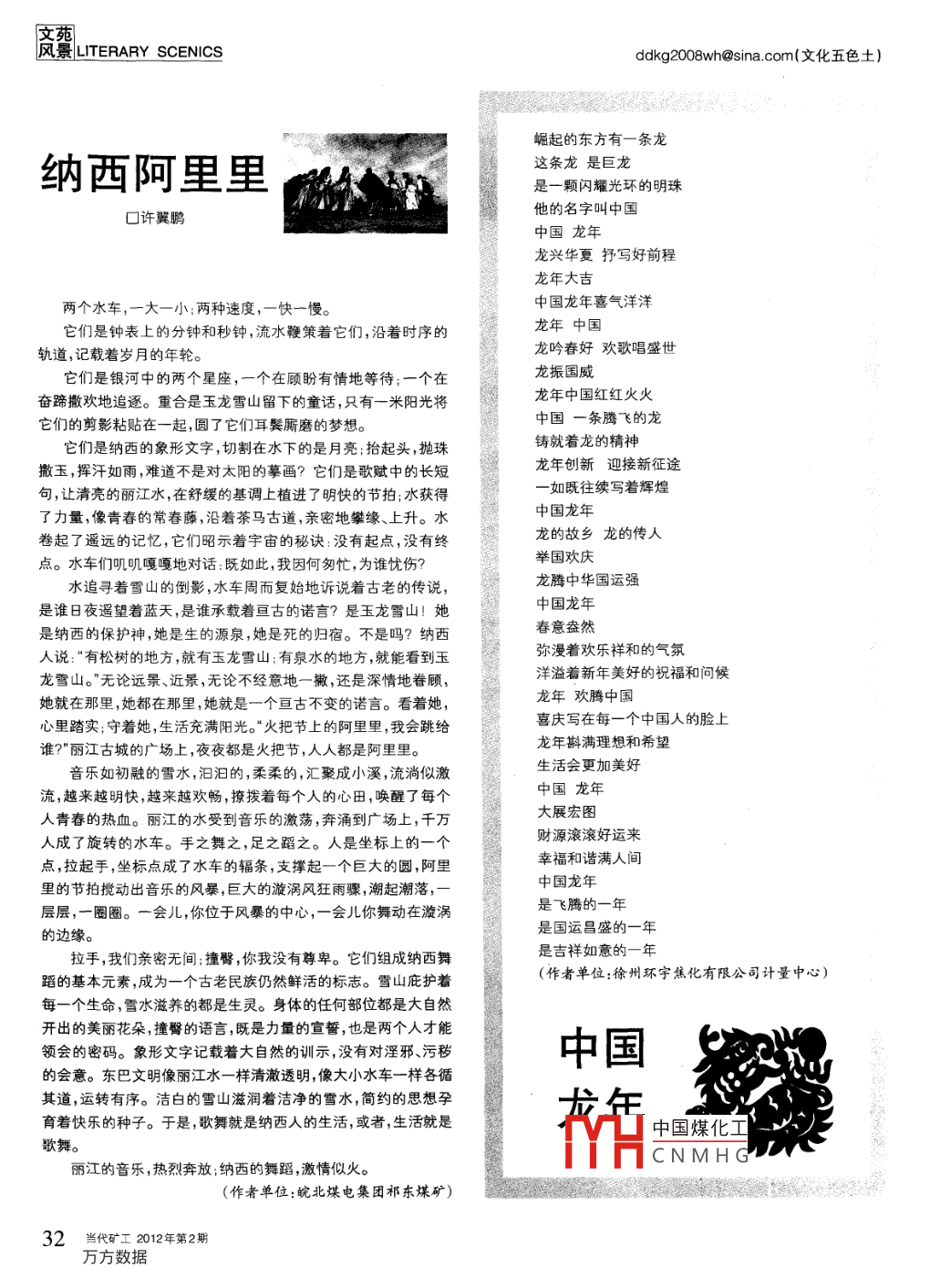 高纛LITERARY SCENICSddkg2008Wh@sIna.com(文化五色土)崛起的東方有一條龍納西阿里里這條龍是巨龍顆閃耀光環(huán)的明珠口許翼鵬他的名字叫中國(guó)中國(guó)龍年龍興華夏抒寫(xiě)好前程龍年大吉兩個(gè)水車(chē),一大一小;兩種速度,一快一慢。中國(guó)龍年喜氣洋洋它們是鐘表上的分鐘和秒鐘,流水鞭策著它們,沿著時(shí)序龍年中國(guó)軌道,記載著歲月的年輪。龍吟春好歡歌唱盛世它們是銀河中的兩個(gè)星座,一個(gè)在顧盼有情地等待;一個(gè)在龍振國(guó)威奮蹄撒歡地追逐。重合是玉龍雪山留下的童話,只有一米陽(yáng)光將腰龍年中國(guó)紅紅火火它們的剪影粘貼在一起,圓了它們耳鬢廝磨的夢(mèng)想中國(guó)一條騰飛的龍它們是納西的象形文字,切割在水下的是月亮;抬起頭,拋珠鑄就著龍的精神撒玉,揮汗如雨,難道不是對(duì)太陽(yáng)的摹畫(huà)?它們是歌賦中的長(zhǎng)短龍年創(chuàng)新迎接新征途句,讓清亮的麗江水,在舒緩的基調(diào)上植進(jìn)了明快的節(jié)拍;水獲得一如既往續(xù)寫(xiě)著輝煌了力量,像青春的常春藤,沿著茶馬古道,親密地攀緣、上升。水中國(guó)龍年卷起了遙遠(yuǎn)的記憶,它們昭示著宇宙的秘訣:沒(méi)有起點(diǎn),沒(méi)有終龍的故鄉(xiāng)龍的傳人點(diǎn)。水車(chē)嘎嘎地對(duì)話:既如此,我因何匆忙,為誰(shuí)忱傷?舉國(guó)歡慶水追尋著雪山的倒影,水車(chē)周而復(fù)始地訴說(shuō)著古老的傳說(shuō)龍騰中華國(guó)運(yùn)強(qiáng)是誰(shuí)日夜遙望著藍(lán)天,是誰(shuí)承載著亙古的諾言?是玉龍雪山!她中國(guó)龍年是納西的保護(hù)神,她是生的源泉,她是死的歸宿。不是嗎?納西春意盎然人說(shuō):“有松樹(shù)的地方,就有玉龍雪山;有泉水的地方,就能看到玉彌漫著歡樂(lè)祥和的氣氛龍雪山。"無(wú)論遠(yuǎn)景、近景,無(wú)論不經(jīng)意地一撇,還是深情地眷顧,洋溢著新年美好的祝福和問(wèn)候她就在那里,她都在那里,她就是一個(gè)亙古不變的諾言??粗?龍年歡騰中國(guó)心里踏實(shí);守著她,生活充滿陽(yáng)光?!盎鸢压?jié)上的阿里里,我會(huì)跳給喜慶寫(xiě)在每一個(gè)中國(guó)人的臉上誰(shuí)?”麗江古城的廣場(chǎng)上,夜夜都是火把節(jié),人人都是阿里里。龍年斟滿理想和希望音樂(lè)如初融的雪水,汩汩的,柔柔的,匯聚成小溪,流淌似激生活會(huì)更加美好流,越來(lái)越明快,越來(lái)越歡暢,撩撥著每個(gè)人的心田,喚醒了每個(gè)中國(guó)龍年人青春的熱血。麗江的水受到音樂(lè)的激蕩,奔涌到廣場(chǎng)上,千萬(wàn)大展宏圖人成了旋轉(zhuǎn)的水車(chē)。手之舞之,足之蹈之。人是坐標(biāo)上的一個(gè)財(cái)源滾滾好運(yùn)來(lái)點(diǎn),拉起手,坐標(biāo)點(diǎn)成了水車(chē)的輻條,支撐起一個(gè)巨大的圓,阿里幸福和諧滿人間里的節(jié)拍攪動(dòng)出音樂(lè)的風(fēng)暴,巨大的漩渦風(fēng)狂雨驟,湖起潮落中國(guó)龍年層層,一圈圈。一會(huì)兒,你位于風(fēng)暴的中心,一會(huì)兒你舞動(dòng)在漩渦是飛騰的一年的邊緣。是國(guó)運(yùn)昌盛的一年拉手,我們親密無(wú)間;撞臀,你我沒(méi)有尊卑。它們組成納西舞是吉祥如意的一年蹈的基本元素,成為一個(gè)古老民族仍然鮮活的標(biāo)志。雪山庇護(hù)著(作者單位:徐州環(huán)宇焦化有限公司計(jì)量中心)每一個(gè)生命,雪水滋養(yǎng)的都是生靈。身體的任何部位都是大自然開(kāi)出的美麗花朵,撞臀的語(yǔ)言,既是力量的宣誓,也是兩個(gè)人才能領(lǐng)會(huì)的密碼。象形文字記載著大自然的訓(xùn)示,沒(méi)有對(duì)淫邪污穢中國(guó)的會(huì)意。東巴文明像麗江水一樣清澈透明,像大小水車(chē)一樣各循其道,運(yùn)轉(zhuǎn)有序。潔白的雪山滋潤(rùn)著潔凈的雪水,簡(jiǎn)約的思想孕龍年育著快樂(lè)的種子。于是,歌舞就是納西人的生活,或者,生活就是中國(guó)煤化歌舞。麗江的音樂(lè),熱烈奔放;納西的舞蹈,激情似火。CNM(作者單位:皖北煤電集團(tuán)祁東煤礦)32當(dāng)代礦工2012年第2期