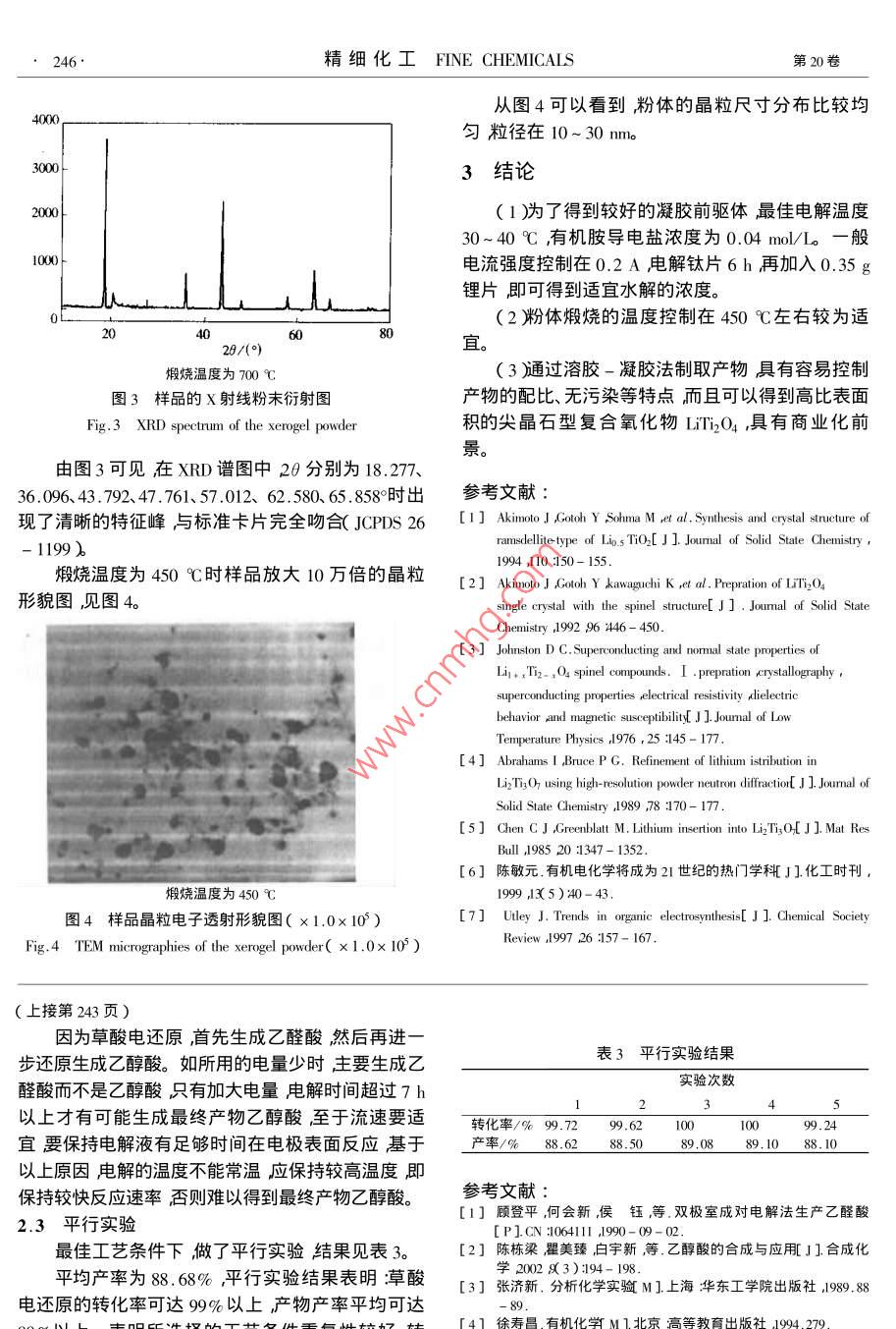第20卷第4期精細(xì)化工Ⅴol.20,No.42003年4月FINE CHEMICALSpr.2003有粗電學(xué)與輯草酸電還原制備乙醇酸李宇展邱麗顧登平河北師范大學(xué)化學(xué)學(xué)院河北石家莊050016)摘要用循環(huán)伏安法確定了草酸可以還原為乙醇酸證明了從草酸硏制乙醇酸的可行性。工藝采用以鉛電極作陰極材料的陽(yáng)離子交換膜電解槽虍解草酸制備乙醇酸并以電流密度、電量、溫度和電解液的流速作了四因素四水平的正交實(shí)驗(yàn)得出最佳工藝條件為電流密度1400A/m2電量1.7F/mo溫度40℃電解液流速0.15m/s產(chǎn)率達(dá)88%以上。關(guān)鍵詞循環(huán)伏安草酸,醇酸電化學(xué)還原中圖分類號(hào)3623.65+1文獻(xiàn)標(biāo)識(shí)碼:A文章編號(hào)1003-52142003)1-0242-03Electroreduction of Oxalic Acid to Glycolic AcidLI Yu-zhan QIu Li GU Deng-pingDepartment of Chemistry Hebei Normal University Shijiazhuang 050016, Hebei, ChinaAbstract Electroreduction of oxalic acid to glycolic acid was confirmed by cyclic voltammetry Glycolic acidwas prepared from oxalic acid at the Pb cathode in an eletrolytic cell with cation-exchange mambrane. Byorthogonal experiments the optimal operating conditions were obtained current density 1400 A/mf ,electricquantity 1.7 F/mol temperature 40C and flowrate of electrolyte 0.15 m/so The yield was over 88%Key words cyclic voltammetry glycolic acid ,oxalic acid electroreduction草酸電還原合成乙醛酸早在20世紀(jì)90年代已裝置如圖1所示。由作者實(shí)現(xiàn)工業(yè)化1。作者仍以廉價(jià)的草酸為原料電還原制備乙醇酸。乙醇酸 glycollic acid)稱羥基乙酸 hydroxyacetic acid)甘醇酸,是最簡(jiǎn)單的α-羥基酸。乙醇酸是一種重要的有機(jī)合成中間體和化工產(chǎn)品其應(yīng)用范圍很廣。國(guó)家在十五”規(guī)劃中把乙醇酸2列為主要基礎(chǔ)化工產(chǎn)品來(lái)開(kāi)發(fā),足以說(shuō)明其在化工生產(chǎn)中的重要性。近年來(lái),由于乙醇酸已開(kāi)發(fā)用于醫(yī)學(xué)工程材料和高分子降解材料等許多領(lǐng)域使得乙醇酸的需求量逐年增加提高乙醇酸的產(chǎn)l—陰極』—陽(yáng)極♂—-陽(yáng)離子交換膜;溫度計(jì)δ—玻璃冷凝管量和開(kāi)發(fā)新的合成路線,降低產(chǎn)品成本成為開(kāi)發(fā)的6—磁力泵7—恒溫槽重點(diǎn)。作者在草酸電還原合成乙醛酸并已工業(yè)化的圖1實(shí)驗(yàn)裝置基礎(chǔ)上研制乙醇酸具有重要意義。1實(shí)驗(yàn)實(shí)驗(yàn)所用原料草酸硫酸均為CP水為去離子水。12實(shí)驗(yàn)條件1裝置陽(yáng)極液為κ(H2SO4)=6%~8%的硫酸溶液陰電解槽由聚丙烯自制而成玥、陽(yáng)極均選用鉛合極液為&(草酸)=1mlL的草酸溶液。電解液中金材料熾、陽(yáng)極之間由陽(yáng)離子交換隔膜隔開(kāi)。實(shí)驗(yàn)草酸的定量3用CaC2溶液在pH=3~4條件下沉淀然后用硫酸溶液溶解再用KMnO4標(biāo)準(zhǔn)溶液滴第4期李宇展等草酸電還原制備乙醇酸43定確定同時(shí)作空白實(shí)驗(yàn)。乙醛酸的定量是在一的電還原呈現(xiàn)3個(gè)還原峰。為了鑒定草酸電還原的定量的電解液中加入溴酚藍(lán)指示劑用標(biāo)準(zhǔn)氬氧化中間產(chǎn)物作者用美國(guó) SIGMA化學(xué)公司出品的分析汭的乙醇溶液滴定到由黃色變?yōu)樗{(lán)綠色然后加入純乙醛酸、乙醇酸作相同條件下的循環(huán)伏安圖。比鹽酸羥氨的乙醇溶液物質(zhì)的量以過(guò)量一倍為好),較這3個(gè)圖冋可清楚地看岀乙醛酸的還原峰電勢(shì)與再用標(biāo)準(zhǔn)氬氧化鈉乙醇溶液滴定至藍(lán)綠色為終點(diǎn)。草酸的第二個(gè)峰電勢(shì)相同乙醇酸的還原峰電勢(shì)與乙醇酸的測(cè)定用鄰苯二甲酸酐?;?草酸的第三個(gè)峰電勢(shì)相同。故可斷定草酸第一步首2結(jié)果與討論先還原生成乙醛酸然后繼續(xù)還原生成乙醇酸。至于第三步的電還原產(chǎn)物可能生成乙醇醛或蘋(píng)果酸2.1循環(huán)伏安曲線有待進(jìn)一步證實(shí)。為了確認(rèn)草酸電還原可以生成乙醇酸作了草2.2結(jié)果和分析酸、乙醛酸和乙醇酸的循環(huán)伏安曲線。實(shí)驗(yàn)證明以通過(guò)分析和初步實(shí)驗(yàn)認(rèn)為影響合成乙醇酸主要草酸為原料可以生成乙醇酸。見(jiàn)圖2~4。因素有溫度(℃)電流密度(A/m2)電量(F/mol)流量(m/s),為此作了四因素四水平正交實(shí)驗(yàn)L(4)以優(yōu)化電解條件實(shí)驗(yàn)數(shù)據(jù)見(jiàn)表1及表2。表1正交實(shí)驗(yàn)的因素與水平取值表3×10-3因素1×10-3A溫度t/℃B電量Q(F/mol)-2.201.40-1.00C電流密度(Am2)800100014000.15草酸)=0.0200mol/L;民掃描速度)=3000mV/s表2L44)交實(shí)驗(yàn)結(jié)果圖2草酸溶液的循環(huán)伏安圖ABCD草的轉(zhuǎn)z嬖的398,0967.3889.6656.633x 1067.6764.321×10·3o1234588.621.40-1.00草酸)=0.0400ml/L;κ掃描速度)=3000mVs14.97258.74273.72圖3乙醛酸溶液的循環(huán)伏安圖K261,18298,49279,43249,42k254.2327435281.44252.44h170.5472.0564.1170.11k270.5472.0564.1170.17×103k365,2974.6269h463.338:9“m0:50從計(jì)算結(jié)果可知汶四種因素中電量對(duì)草酸電1×10-1還原為乙醇酸的轉(zhuǎn)化率和產(chǎn)率的影響最大,為主要的影響因素其次為流量再其次溫度和電流密度。E/v由此得出最佳條件溫度為40℃,電量為1.7草酸)=0.0389mL;掃描速度)=3000mV/sF/mol電流密度1400A/m2流速為0.15m/s圖4乙醇酸溶液的循環(huán)伏安圖下轉(zhuǎn)第246頁(yè))24精細(xì)化工 FINE CHEMICALS第20卷從圖4可以看到粉體的晶粒尺
