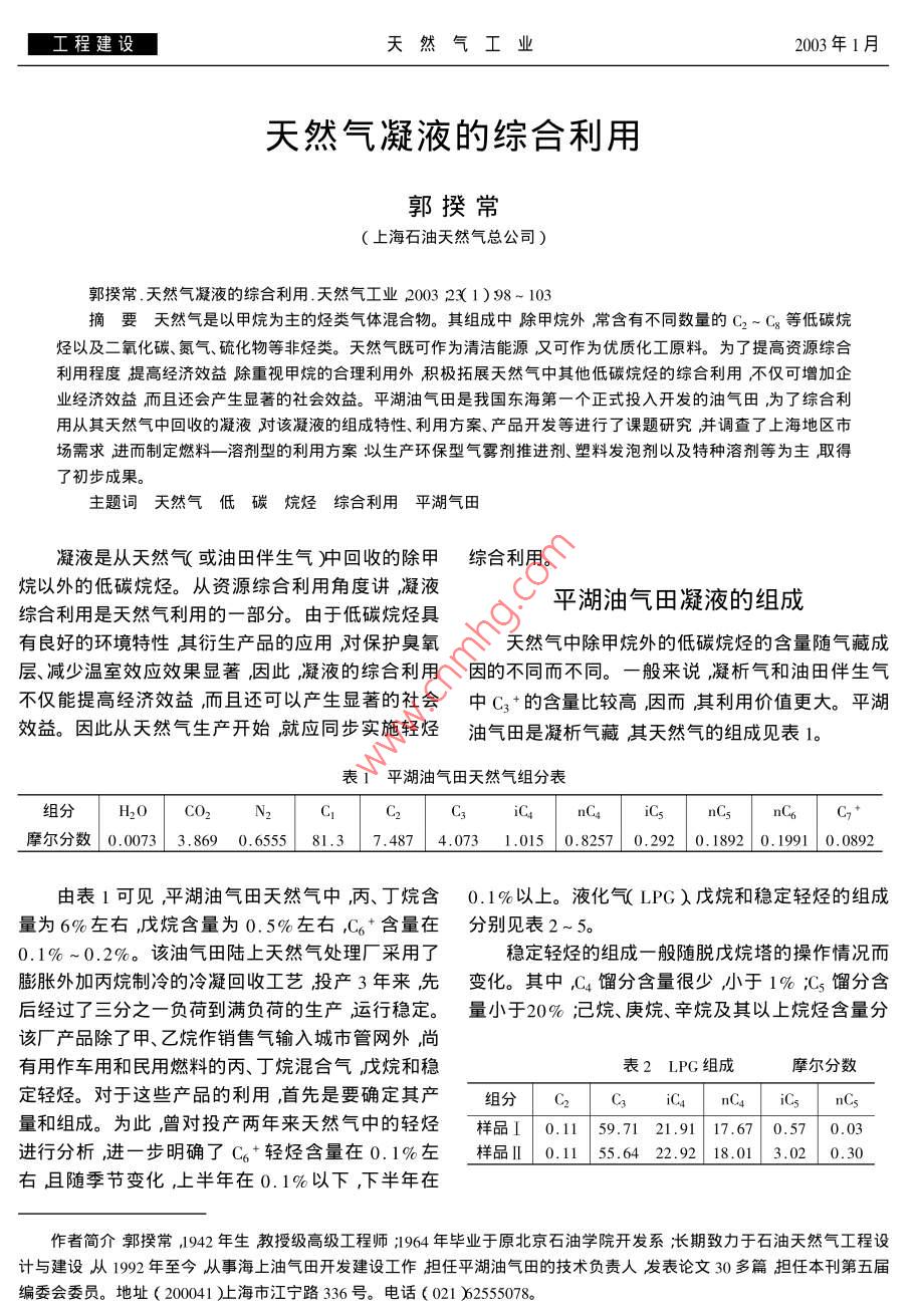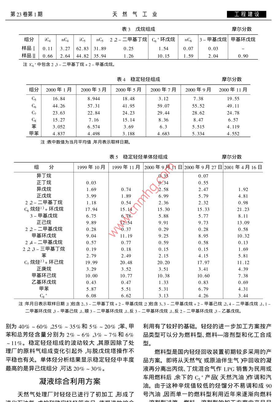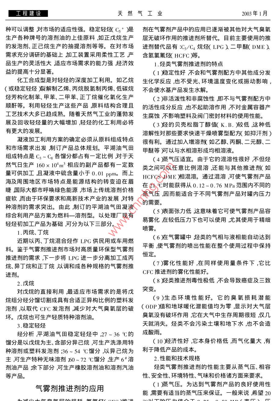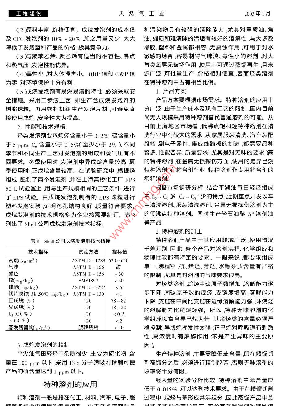 工程建設(shè)天然氣工業(yè)2003年1月天然氣凝液的綜合利用郭揆常上海石油天然氣總公司)郭揆常.天然氣凝液的綜合利用.天然氣工業(yè)20032X1)98-103摘要天然氣是以甲烷為主的烴類氣體混合物。其組成中除甲烷外常含有不同數(shù)量的C2~Cs等低碳烷烴以及二氧化碳、氮?dú)?、硫化物等非烴類。天然氣既可作為清潔能源又可作為優(yōu)質(zhì)化工原料。為了提高資源綜合利用程度提高經(jīng)濟(jì)效益除重視甲烷旳合理利用外積極拓展天然氣中其他低碳烷烴的綜合利用不僅可增加全業(yè)經(jīng)濟(jì)效益而且還會產(chǎn)生顯著的社會效益。平湖油氣田是我國東海第一個正式投入開發(fā)的油氣田,為了綜合利用從其天然氣中回收的凝液對該凝液的組成特性、利用方案、產(chǎn)品開發(fā)等進(jìn)行了課題研究并調(diào)查了上海地區(qū)市場需求進(jìn)而制定燃料—溶劑型的利用方案生產(chǎn)環(huán)保型氣霧劑推進(jìn)劑、塑料發(fā)泡劑以及特種溶劑等為主取得了初步成果。主題詞天然氣低碳烷烴綜合利用平湖氣田凝液是從天然氣或油田伴生氣)回收的除甲綜合利用。烷以外的低碳烷烴。從資源綜合利用角度講,凝液綜合利用是天然氣利用的一部分。由于低碳烷烴具平湖油氣田凝液的組成有良好的環(huán)境特性其衍生產(chǎn)品的應(yīng)用對保護(hù)臭氧天然氣中除甲烷外的低碳烷烴的含量隨氣藏成層、減少溫室效應(yīng)效果顯著因此,凝液的綜合利用因的不同而不同。一般來說凝析氣和油田伴生氣不僅能提高經(jīng)濟(jì)效益而且還可以產(chǎn)生顯著的社會中C3+的含量比較高因而其利用價值更大。平湖效益。因此從天然氣生產(chǎn)開始就應(yīng)同步實(shí)施輕烴油氣田是凝析氣藏其天然氣的組成見表1。表1平湖油氣田天然氣組分表組分H2O摩爾分?jǐn)?shù)0.0733.8690.65581.37.4874.0731.0150.82570.2920.8920.19910.0892由表1可見平湖油氣田天然氣中,、丁烷含0.I%以上。液化氣LPG戊烷和穩(wěn)定輕烴的組成量為6%左右戊烷含量為0.5%左右,C6+含量在分別見表2~5。0.1%~0.2%。該油氣田陸上天然氣處理廠采用了穩(wěn)定輕烴的組成一般隨脫戊烷塔的操作情況而臚脹外加丙烷制冷的冷凝回收工藝投產(chǎn)3年來先變化。其中,C4餾分含量很少小于1%:Cs餾分含后經(jīng)過了三分之一負(fù)荷到滿負(fù)荷的生產(chǎn)運(yùn)行穩(wěn)定。量小于20%汜已烷、庚烷、辛烷及其以上烷烴含量分該廠產(chǎn)品除了甲、乙烷作銷售氣輸入城市管網(wǎng)外尚有用作車用和民用燃料的丙、丁烷混合氣戊烷和穩(wěn)表2LPG組成摩爾分?jǐn)?shù)定輕烴,對于這些產(chǎn)品的利用首先是要確定其產(chǎn)組分C2G量和組成。為此曾對投產(chǎn)兩年來天然氣中的輕烴樣品10.159.1219117.6710.570.03進(jìn)行分析進(jìn)一步明確了C輕烴含量在0.1%左樣品‖011556429218.013.020.30右且隨季節(jié)變化,上半年在0.1%以下,下半年在作者簡介郭揆常,1942年生教授級高級工程師∶1964年畢業(yè)于原北京石油學(xué)院開發(fā)系;期致力于石油天然氣工程設(shè)計與建設(shè)從1992年至今從事海上油氣田開發(fā)建設(shè)工作擔(dān)任平湖油氣田的技術(shù)負(fù)責(zé)人發(fā)表論文30多篇擔(dān)任本刊第五屆編委會委員。地址(200041)海市江寧路336號。電話(021)2555078第23卷第1期天然氣工業(yè)程建設(shè)表3戊烷組成摩爾分?jǐn)?shù)組分C4 cIsNe22-二甲基丁烷C環(huán)戊烷nCn3-甲基戊烷甲基環(huán)戊烷樣品I0.113.2762.8331.890.25樣品Ⅱ0.662.6435.940.90注℃中包含23-二甲基丁烷+2-甲基戊烷表4穩(wěn)定輕烴組成摩爾分?jǐn)?shù)組分2000年1月200年3月2000年5月200年7月200年9月00年11月16.848.487.38C641.9559.049.1123.6324.232924.783.0523.695.5154.119甲苯3.1884.6835.3344.552注表中數(shù)值為當(dāng)月平均值年月表示取樣日期表5穩(wěn)定輕烴單體烴組成摩爾分?jǐn)?shù)199年10月1999年11月2000年9月11日2000年9月27日2001年4月16日異丁烷0.350.07正丁烷0.030.55異戊烷烷3.995.7922-二甲基丁烷0.52.320.98C烷烴)+環(huán)戊烷15.143-甲基戊烷6.78正己烷12.5413.0922-二甲基戊烷0.280.370.280.58甲基環(huán)戊烷2A-二甲基戊烷0.50.770.13223-三甲基丁烷0.190.180.151.69C烷烴2)+環(huán)己烷20.4820.207.97正庚烷3.293.414.39甲基環(huán)己烷10,0010.7710.380.607.38乙基環(huán)戊烷0.431.330.830.69甲苯6.086.62注年月日表示取樣日期迿含2、3-二甲基丁烷+2-甲基戊烷衛(wèi))含3、3-二甲基戊烷+2-甲基己烷2、4-二甲基戊烷,、1二甲基環(huán)戊烷3-甲基己烷,、順3-二甲基環(huán)戊烷,l、反3-二甲基環(huán)戊烷A、反2-二甲基環(huán)戊烷3-乙基戊烷。別為40%~60%,25%~35%和5%~20%;、甲利用有了較好的基礎(chǔ)。輕烴的進(jìn)一步加工方案按產(chǎn)苯和總芳烴含量分別為2%~6%β3%~7%和6%品類型可以分為燃料型、燃料一溶劑型和化工合成11%。穩(wěn)定輕烴組成的波動較大其原因除了處型理廠的原料氣組成變化引起外盧與脫戊烷塔操作不燃料型是國內(nèi)輕烴回收裝置初期較多采用的產(chǎn)平穩(wěn)也有關(guān)。單體烴分析結(jié)果顯示穩(wěn)定輕烴中豐度品方案。即將從天然氣或原油伴生氣沖回收的凝最高的是異己烷組分可達(dá)20%~30%。液再分離出丙烷、丁烷混合氣作LPG銷售為民用或凝液綜合利用方案車用燃料后余下的C+產(chǎn)品天然汽油)作調(diào)和汽油。由于這種辛烷值較低的烴餾分不易調(diào)和成9