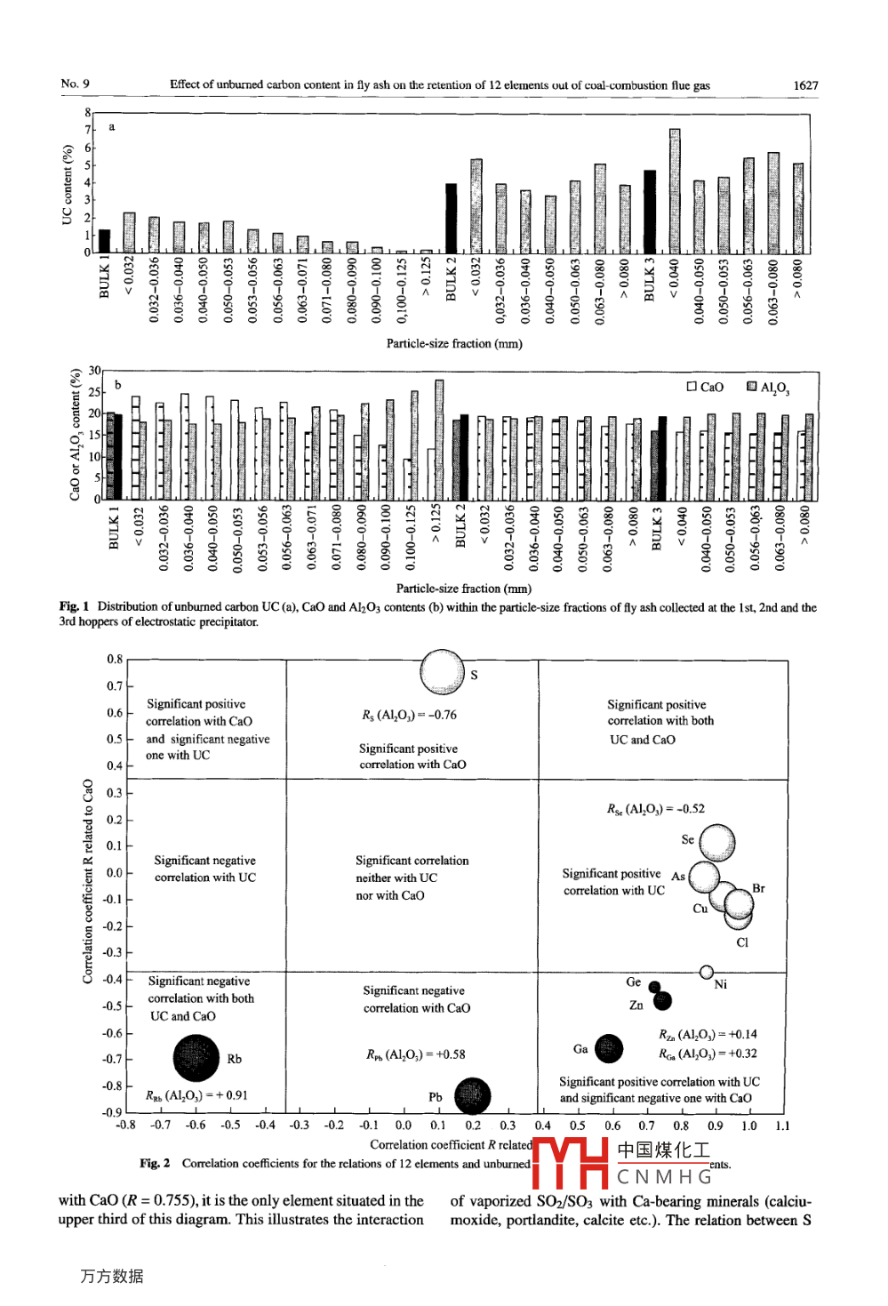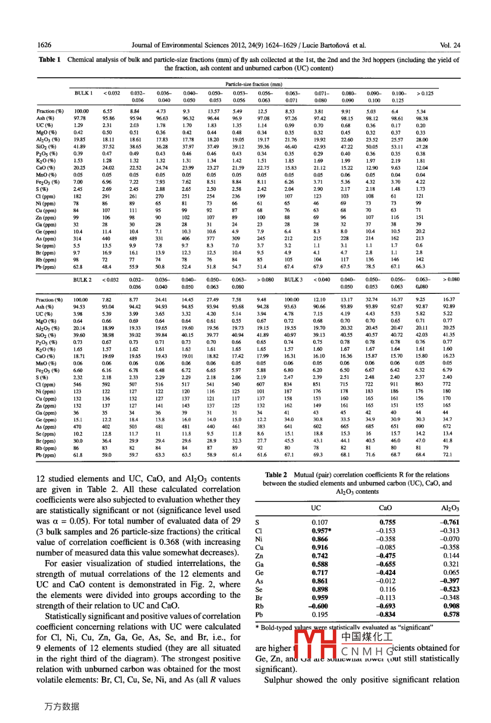 Availableonlineatwww.sciencedirect.coJOURNAL OF。 Science DirectENVIRONMENTALSCIENCESJournal of Environmental Sciences 2012, 24(9)1624-1629Effect of unburned carbon content in fly ash on the retention of 12 elements outof coal-combustion iue gasLucie Bartonova', Bohumir Cech, Lucie Ruppenthalova, Vendula MajvelderovaDagmar Juchelkova, Zdenek KlikaFaculty of metallurgy and Material Engineering, VSB-Technical University of Ostrava, T 17. listopadu 15, 708 33Ostrava- Poruba, Czech RepublicReceived 18 November 2011; revised 02 January 2012; accepted 03 January 2012AbstractThe aim of this study was to evaluate whether unburned carbon particles present in fly ash can help in the retention of S, Cl, Br, As, Se,Cu,Ni, Zn,Ga,Ge, Rb, and Pb out of flue gas during the coal combustion at fluidised-bed power station where the coal was combustedwell to be clear which factor governs behaviour of studied elements. Except of S(with significant association with CaO)and Rb and Pb(with major affinity to Al2O3)the statistically significant and positive correlation coefficients were calculated for the relations betweeunburned carbon content and Br(0.959), Cl(0.957), Cu(0.916), Se(0. 898), Ni(0. 866), As(0.861), Zn(0. 742), Ge(0.717), and Ga(0.588)content The results suggest that the unburned carbon is promising material in terms of flue gas cleaning even if contained inhighly calcareous fly ashesKey words: unburned carbon; coal combustion; fluidised bed; trace elements; emissions; retentionDOI:101016Sl001-0742(11)60981-9Introductionthe elements bound in solid particles are efficiently cap-tured in electrostatic precipitator(ESP) or fabric filterTotal worldwide quantity of coal combustion wastes pro- whereas the gaseous fraction of toxic elements easilyduced in large power stations(estimated in the early 1990s) penetrates through the particulate control device directlyexceeds undoubtedly 550 Mt per year(Adams et al., into atmosphere2005; Manz, 1997). Fraction of unburned carbon(UC)in This concerns above all the most volatile elements,coal ashes varies considerably according to ash character such as Hg, As, Cl, Br, or Se. Depending on the coal(bottom ash, fly ash etc )and mainly depending on coal characteristics and the operational conditions during therank and the type of combustion unit. Estimating average combustion, the fractions of these elements released intounburned carbon content in ash as 3%-there is 16.5 atmosphere in gaseous form can reach in some cases asMt of unburned carbon that is being produced annually. much as 80%-90% or even more( Germani and Zoller,Unburned carbon properties depend mainly upon coal rank 1998; Huang et al., 2004; Klein et al., 1975; Klika et alaccepted that unburned carbon is amaterial win enerally 2001; Meij et al, 1986, 1994; Xu et al, 2004; Yi et aland operational conditions. Nevertheless, it isporous structure which leads to an effort to use this waste This is the reason why many researchers directed theirmaterial as a low-cost adsorbent(Baltrus et al., 2001; effort toward the retention of these vaporized elements onBartohova et al. 2009, 2010: Batra et al., 2008; Bunt et some fly ash constituents or using another adsorbent addedal,2009;Hurt et al., 1995; Izquierdo and Rubio, 2008; during the combustion Polluting gas can be cleaned by flyMaroto-Valer et al., 2001, 2002; Xu et al., 2009)ash(harja et al., 2008 ), promising results were obtainedAnother important problem when fossil fuels are used by unburned carbon particles in fly ash( Bartonova etfor electricity generation is the emissions of toxic pol- 2007; Hassett and Eylands, 1999; Hower et al., 1999, 2000lutants. During the combustion, heavy metals and other 2010; Lopez Anton et al., 2007; Sakulpitakphon et altoxic trace elements originally present in coal are redis- 2000)or by中國煤化工 aluminosilicatetributed among bottom ash, Ay ash and emissions. The adsorbentsHuormost problematic is the distribution of vaporized elements et al., 2000;CNMHZhao et al., 2008)between the flue gas particles and gaseous phase because Serre and Silcox (2000), Hower et al.(1999, 2000,Corresponding author. E-mail: lucie. bartonova @vsb. cz2010), Hassett and Eylands (1999), and SakulpitakphonNo 9Effect of unburned carbon content in fly ash on the retention of 12 elements out of coal-combustion flue gas1625(2000)tested fly ashes from large-scale power stations for ESP hoppers) were further separated into particle-sizee retention of Hg from flue gas concluding that higher fractions using dry separation method on the followingunburned carbon content in fly ash is advantageous for sieves: 0.032, 0.036, 0.040, 0.050, 0.053, 0.056, 0.063,the retention of Hg. Unfortunately, works dealing with the 0.071, 0.080, 0.090, 0.100, and 0. 125 mm and the yieldspossible retention of other elements on unburned carbon of all the fractions were recordedparticles are rather rare(Bartonova et al., 2007; Lopez-In all fly ash samples( three bulks and all the parrticle.Anton et al., 2007; Vassilev et al., 2000)ize fractions) the unburned carbon content was deter-While the effect of unburned carbon is usually studied mined on Leco CS-244(the determination in based onusing real power-station fly ashes, the effect of other infrared absorption measurement). Prior to the measure-adsorbents is usually tested using bench-scale or pilot- ment of carbon content, the samples were leached withscale furnaces due to the possibility of changing more dilute HCI (1: 1, v: v) to dissolve carbonates, which couldparameters and conditions than it is possible in large power otherwise have misrepresented the results. In all ashstations. Based on the bench-scale results the positive samples the contents of major, minor and trace elementsinfluence of some adsorbents( Ca-based adsorbents, kaoli- were determined by polarized-beam X-ray fluorescencenite, alumina etc. on the retention of trace elements were spectrometry on SPECTRO XEPOS. Ash content in allreported Sterling and Helble, 