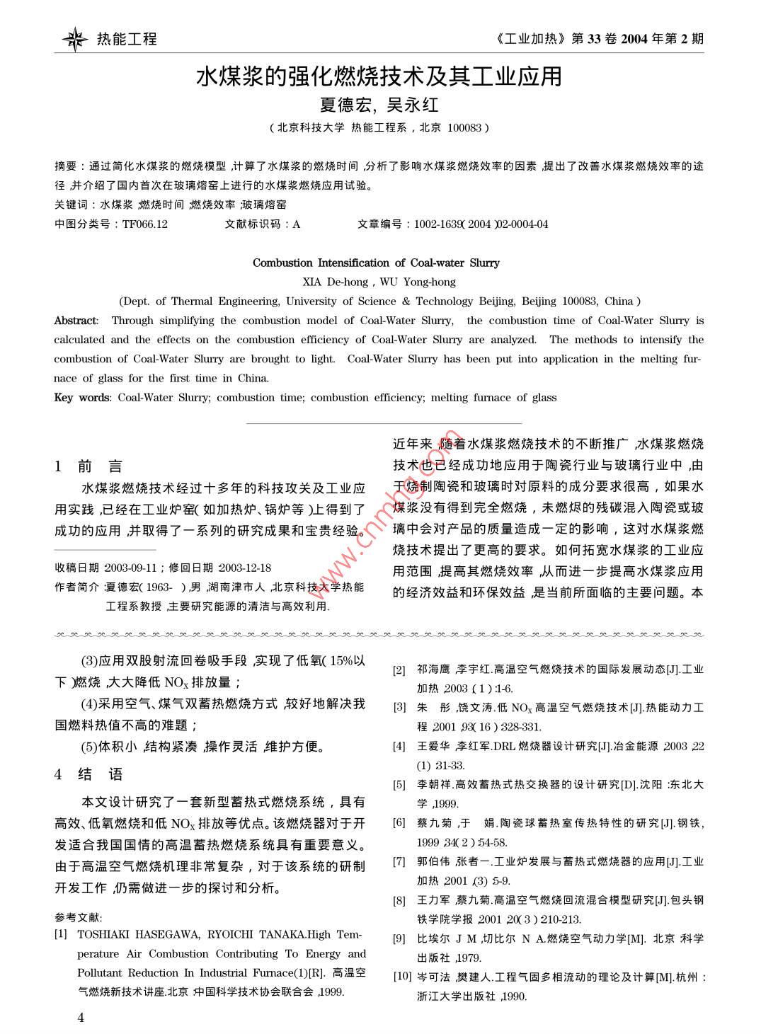 熱能工程《工業(yè)加熱》第33卷2004年第2期水煤漿的強(qiáng)化燃燒技術(shù)及其工業(yè)應(yīng)用夏德宏,吳永紅北京科技大學(xué)熱能工程系,北京10008摘要∶通過(guò)簡(jiǎn)化水煤漿旳燃燒模型計(jì)算了水煤漿的燃燒時(shí)間分析了影響水煤漿燃燒效率旳因素提岀了改善水煤漿燃燒效率的途徑并介紹了國(guó)內(nèi)首次在玻璃熔窯上進(jìn)行的水煤漿燃燒應(yīng)用試驗(yàn)。關(guān)鍵詞:水煤漿燃燒時(shí)間撚燒效率詖璃熔窯中圖分類(lèi)號(hào):TFO66.12文獻(xiàn)標(biāo)識(shí)碼:A文章編號(hào):1002-16392004)2000404Combustion Intensification of Coal-water SlurryXIA De-hong, wU Yong-hong(Dept. of Thermal Engineering, University of Science Technology Beijing, Beijing 100083, ChinaAbstract: Through simplifying the combustion model of Coal-Water Slurry, the combustion time of Coal-Water Slurry iscalculated and the effects on the combustion efficiency of Coal-Water Slurry are analyzed. The methods to intensify thecombustion of Coal-Water Slurry are brought to light. Coal-Water Slurry has been put into application in the melting fur-nace of glass for the first time in China.Key words: Coal-Water Slurry; combustion time; combustion efficiency; melting fumace of glass近年來(lái)隨著水煤漿燃燒技術(shù)的不斷推廣水煤漿燃燒前言技術(shù)也已經(jīng)成功地應(yīng)用于陶瓷行業(yè)與玻璃行業(yè)中由水煤漿燃燒技術(shù)經(jīng)過(guò)十多年的科技攻關(guān)及工業(yè)應(yīng)于燒制陶瓷和玻璃時(shí)對(duì)原料的成分要求很高,如果水用實(shí)踐,已經(jīng)在工業(yè)爐如加熱爐、鍋爐等)上得到了煤漿沒(méi)有得到完全燃燒,未燃燼的殘?zhí)蓟烊胩沾苫蚱鲁晒Φ膽?yīng)用并取得了一系列的研究成果和寶貴經(jīng)驗(yàn)。璃中會(huì)對(duì)產(chǎn)品的質(zhì)量造成一定的影響,這對(duì)水煤漿燃燒技術(shù)提出了更高的要求。如何拓寬水煤漿的工業(yè)應(yīng)收稿日期2003409-11:修回日期20031218用范圍提高其燃燒效率從而進(jìn)一步提高水煤漿應(yīng)用作者簡(jiǎn)介夏德宏(13)男湖南津市人北京科技大學(xué)熱能的經(jīng)濟(jì)效益和環(huán)保效益是當(dāng)前所面臨的主要問(wèn)題。本工程系教授主要研究能源的清潔與高效利用(3)應(yīng)用雙股射流回卷吸手段實(shí)現(xiàn)了低氧(15%以[2]祁海鷹李宇紅高溫空氣燃燒技術(shù)的國(guó)際發(fā)展動(dòng)態(tài)工業(yè)下燃燒大大降低NOx排放量加熱2003(1)1-6(4)采用空氣、煤氣雙蓄熱燃燒方式較好地解決我③]朱彤饒文濤低NO高溫空氣燃燒技術(shù)[熱能動(dòng)力工國(guó)燃料熱值不高的難題;程2001916)328331⑤5)體積小結(jié)構(gòu)緊湊操作靈活維護(hù)方便?!?]王愛(ài)華李紅軍DRL燃燒器設(shè)計(jì)研究[J冶金能源2003224結(jié)語(yǔ)(1)31-335]李朝祥高效蓄熱式熱交換器的設(shè)計(jì)研究[]沈陽(yáng)凍北大本文設(shè)計(jì)研究了一套新型蓄熱式燃燒系統(tǒng),具有學(xué),1999高效、低氧燃燒和低NOκ排放等優(yōu)點(diǎn)。該燃燒器對(duì)于開(kāi)圓6]蔡九菊,于娟.陶瓷球蓄熱室傳熱特性的硏究卩.鋼鐵,發(fā)適合我國(guó)國(guó)情的高溫蓄熱燃燒系統(tǒng)具有重要意義1999342)54-58.由于高溫空氣燃燒機(jī)理非常復(fù)雜,對(duì)于該系統(tǒng)的研制郭伯偉漲耆一工業(yè)爐發(fā)展與蓄熱式燃燒器的應(yīng)用工業(yè)開(kāi)發(fā)工作仍需做進(jìn)一步的探討和分析加熱2001A3)59[8]王力軍票九菊高溫空氣燃燒回流混合模型研究門(mén).包頭鋼參考文獻(xiàn)鐵學(xué)院學(xué)報(bào)2001203)2102131 TOSHIAKI HASEGAWA, RYOICHI TANAKA. High Tem⑨]比埃爾JM,切比爾NA燃燒空氣動(dòng)力學(xué)[M北京科學(xué)erature Air Combustion Contributing To Energy and出版社1979Pollutant reduction in industrial furnace()高溫空100岑可法樊建人工程氣固多相流動(dòng)的理論及計(jì)算M杭州氣燃燒新技術(shù)講座北京中國(guó)科學(xué)技術(shù)協(xié)會(huì)聯(lián)合會(huì)1999浙江大學(xué)出版社,1990熱能工程《工業(yè)加熱》第33卷2004年第2期文旨在分析影響水煤漿燃燒效率的主要因素,提岀強(qiáng)2.2水煤漿的燃燒時(shí)間化燃燒的方法從而拓寬水煤漿的應(yīng)用范圍為了簡(jiǎn)化水煤漿的燃燒模型,計(jì)算水煤漿的燃燒2水煤漿燃燒模型和燃燒時(shí)間時(shí)間從而揭示提高水煤漿燃燒效率的途徑本文將霧化后的水煤漿液滴簡(jiǎn)化為一個(gè)實(shí)心的球形煤粉顆粒2.1水煤漿燃燒過(guò)程及其燃燒模型由于水煤漿中水分蒸發(fā)的時(shí)間占總?cè)紵龝r(shí)間的比例很水煤漿霧化后以霧炬的形式噴入爐膛內(nèi)部,由于小在水煤漿的整個(gè)燃燒過(guò)程中由于高溫的作用水受到高溫?zé)煔獾膶?duì)流及輻射作用,水煤漿以很高的速分蒸發(fā)過(guò)程幾乎在瞬間完成,所以在計(jì)算水煤漿燃燒度被加熱從而達(dá)到著火并燃燒整個(gè)過(guò)程包括霧化、水時(shí)間的時(shí)候水分蒸發(fā)的時(shí)間可以忽略不計(jì)即忽略蒸分蒸發(fā)、揮發(fā)分的析岀與著火和燃燒、焦炭燃燒、灰渣發(fā)對(duì)燃燒過(guò)程的影響。而且經(jīng)過(guò)分析也表明盡管水煤及排放物的形成等階段。水煤漿的燃燒過(guò)程是一個(gè)極漿漿滴中煤粒的結(jié)團(tuán)使粒徑增大以及水煤漿漿滴中的其復(fù)雜的物理和化學(xué)過(guò)程,其燃燒機(jī)理比重油和煤粉水分都使?jié){滴燃