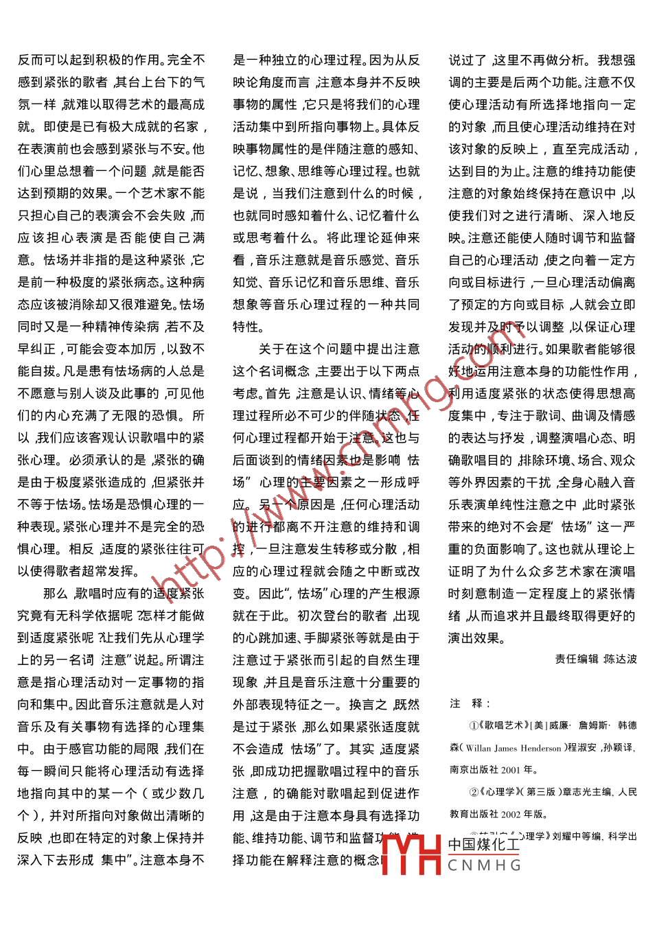 歌唱的心理分析口姜文勝(衢州中等專業(yè)學校浙江衢州324000)摘要:心理學是研究歌唱心理的科學理論依據(jù),歌唱藝術(shù)是人類的一種高級心理活動。從心理學角度進行的歌唱心理研究,是人的主觀能動性的反作用體現(xiàn),其目的是獲得更加優(yōu)美的聲音更加精彩的演唱效果。關(guān)鍵詞:歌唱心理;聲樂藝術(shù)怯場心理中圖分類號J60文獻標識碼 :A文 章編號:1004 -2172( 2004 )04 - 0055 -04歌唱藝術(shù)同時又是人類的一種高是歌唱行為發(fā)生的前提,而音樂活級心理活動。歌唱表演藝術(shù)不僅是動心理動機是因為歌唱者的表演對于歌唱這個詞匯國內(nèi)外給對演唱者技術(shù)技能、藝術(shù)修養(yǎng)等音欲望這一音樂需要和刺激因素而予的界定和認識存在著差異?!稑窐匪囆g(shù)本體多方面的考驗更是對產(chǎn)生。興趣的指向性、情緒性、動力記》云”:凡音之起,由人心生也人歌唱表演者心理素質(zhì)的綜合考性特點使其在歌唱中起著積極的心之動物使之然也感于物而動,驗。心理學是關(guān)于心理現(xiàn)象的科能動作用。譬如盡管人們經(jīng)常講故形于聲"",聲相應故生變變成學,心理現(xiàn)象是腦的機能, 是客觀歌唱的怯場問題,但是,怯場并不方,謂之音此音而樂之及干、戚、現(xiàn)實的反映。從心理學角度進行的等于緊張,相反,適度緊張對歌唱羽、旌,謂之樂?!边@是我國古代對歌唱心理研究是人的主觀能動性應該是有利無弊。歌唱作為- -門主于歌唱的理解。美國學者威廉.詹的反作用體現(xiàn)其目的是獲得更加體表演藝術(shù)而言是演唱者內(nèi)心情姆斯.韓德森在其著作《歌唱藝優(yōu)美的聲音,更加精彩的演唱效感、認識、需求,以聲音為載體的一術(shù)》中認為":歌唱是靠人聲產(chǎn)生的果。而音樂心理學作為音樂學體系種表達、抒解、信息的輸出。這種表樂音對于歌詞的解釋。”0這是西的一個重要分支是一門獨立的學達、抒解、信息的輸出使得歌唱主方人對于歌唱的定義。其實正如科。歌唱的心理研究是很重要的學體取得一定程度的精神滿足 心理人們所了解的那樣歌唱是一門藝術(shù)課題,也是歌唱水平提高的保壓力得到緩解心理平衡在- -定程術(shù)是一門屬于聲音、樂音的藝術(shù),證。度.上得以恢復。因而我們說歌唱是一門在舞臺上展示個人歌唱技中國煤化置唱生理肌體因素的制術(shù)、技藝的表演藝術(shù),是通過演唱[.HC N M H G素的控制與調(diào)整對歌者自身的樂器”對于歌曲作品進心理學是研究歌唱心理的科者的演唱狀態(tài)也起著關(guān)鍵性的作行藝術(shù)再創(chuàng)造的藝術(shù)形式。同時,學理論依據(jù)音樂活動的心理動機用。也就是說嗓音的好壞、歌唱肌5體技術(shù)的發(fā)揮是一方面而心理的為表演欲望,也就是說這種欲望的是歌唱成敗的前提因素。支配作用也是關(guān)鍵的因素。歌唱技存在使歌唱成為可能性。譬如表三、巧的掌握依賴于歌者通過感覺、抽現(xiàn)欲、自信感會促使其產(chǎn)生強烈的象理解去控制發(fā)聲機能。從心理學表演欲望。相反膽怯、自卑會使其我們經(jīng)常說興趣是最好的老的角度對歌唱活動進行心理分析,本來就不強烈的表演欲望再度降師那么什么是興趣沁理學中是是自覺科學的認識歌唱原理的新低。這樣也就產(chǎn)生了兩種區(qū)別明顯這樣給興趣下的定義"興趣是個思維。其產(chǎn)生的影響和作用是把理的音樂活動心理動機。產(chǎn)生動機的體積極探究某種事物的認識傾論的研究用于歌唱實踐的指導之另-種因素是刺激。當刺激和個體向?!?因此,音樂興趣是指人在積.中是讓歌唱者把歌唱心理作為一需要相聯(lián)系時,刺激才能引起活極探究音樂時,對音樂的認識傾個客觀存在的實體去充分發(fā)揮其動,從而形成活動的動機。也就是向。這種認識傾向使人對音樂及相功能性、能動性。具有良好的歌唱說在演唱者有表演欲望的同時給關(guān)事物給予優(yōu)先注意,并有了強心理狀態(tài)對每個聲樂學習者和歌予其刺激, -般指鼓勵、暗示等正烈明確的指向性和探究性。演唱唱者而言都很重要,良好的心理狀面刺激。如果根本沒有表演欲望,者對于聲 樂表演深入地了解對此態(tài)能夠增強學習與表演者成功的即使給予演唱者再多的刺激音樂音 樂對象產(chǎn)生濃厚的興趣,從而領(lǐng)信心。.活動的心理動機仍不能產(chǎn)生。良好會它,掌握它,使音樂興趣這一心音樂活動心理動機是人們在的演唱動機應該是將自己艱苦努理(因素對歌唱行為產(chǎn)生積極的能音樂活動需要的刺激下激起并欲力排練好的精神產(chǎn)品,負責地、精動作用。在這里興趣的能動作用.維持其音樂活動的一種音樂心理心地再現(xiàn)于觀眾面前。表演時以新是由自身的特點決定的。因此我活動傾向。這種心理活動傾向具有鮮體驗和創(chuàng)造使自己進入角色和們對于興趣的分析應該全面地進鼓舞、干預和指導音樂活動方向的演唱內(nèi)容,從而使觀眾受到藝術(shù)感能動作用。那么音樂活動的心理動染得到藝術(shù)享受.事實上在培養(yǎng)首先我們認為興趣具有指向機是如何產(chǎn)生的呢?古人宴飲、奏良好的演唱動機之前演唱者必須性的特點。任何一種興趣總是針對樂,有交友明志的目的,也有獲取有良好的學習動機。學習動機是直-定事件,為實現(x