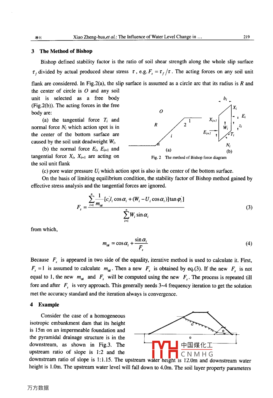 第38卷增刊上海交通大學(xué)學(xué)報Vol.38 sup.2004年6月JOURNAL OF SHANGHAI JIAOTONG UNIVERSITYJun. 2004文章編號: 1006-2467(2004)S1-0217-06The Influence of Water Level Change in Slope Stability of Earth DamXiao Zheng-hua 12, Han Bo1'b, Liao Hong-jian1'c and Gao Xiao-yu1,d'Department of Civil Engineering, Xi'an Jiaotong University, Xi'an 710049, ChinaCollege of Architectural Engineering, Xinjiang University, Urumqi 830008, Chinaxzh-70@ 163.com, "han_ _bo961 @ 163.com, hjliao@ mail.xjtu.edu.cn, dycgao@ mail.xjtu.edu.cnAbstract: The analysis of seepage flow and slope stability to earth dam in water level change isperformed. FEM is used to analyzing the influence of percolation and the results including the porewater head of any point, seepage discharge and so on are obtained. The method of slices isintroduced to calculating the slope stability of the earth dam. Through an example it is separatelydiscussed the influence of seepage flow when water level is changed in earth dam slope and theeffects of percolation in the stability of the earth dam slope. Some helpful conclusions are gained.This can be making the best of the tow methods and the results can be used in engineering forreference.Key word: seepage flow; stability factor; FEM; the method of Bishop1 IntroductionEarth dam is a rapidly development type of dam and be widely used in internal and overseas.Because it can be constructed by a rolling compaction local earth materials and the constructiontechnique is simple and shortcut, so it is adopted broadly. This type of dam can be foundeverywhere in our hydraulic engineering. But most of them had been constructed in 1950s and thestandard of flood protection was low level in that time and its quality was poor. The current states ofthese dams are in maintenance, overhaul and reinforcement. After the standards of flood control towater-storage are established, the main tasks of the reinforced earth dam projects are the analysis ofseepage flow and slope stability. Before the earth dam had happened catastrophic events, majorityof them belong to infiltration flow and seepage deformation problems, so the approach of theregularities of leak through liquid field distribution is an important means to analyze the reasonswhy dangerous condition happened and evaluate secure states of dam body and design and optimizethe dam. But the acting head, the dam body section, property of the earth fll, geologic conditions,soil structure and feature, terrain condition and so forth of practicable projects are myriads ofchanges, to reflect the general rule, this paper aims at the mentioned above factors, generalizes thetypical conditions and studies the slope stability when water level of the dam is changed dam.The analysis of infiltration flow and slope stability to homogeneous earth dam in water leveldepression is performed by an example in the paper. FEM'I is used to calculating the efects ofseepage flow and we can achieve the hydraulic head of any point in the dam body and the otherelement factors concermed. The method of Bishop2] is中國煤化工pe stability on thebasis of pore water pressure field gained by the FENYHCNMHGbest of the towmethods and the results may be helpful in actual engine_218上海交通大學(xué)學(xué)報第38卷2 FEM Fundament of Calculating the Action of Seepage FlowThe mathematic model of infiltration flow numerical computation is divided two classes, i.e.thetwo-dimensional plane and the-dimensional space seepage flow. Because the length of dykebuilding is far greater than its widh, the two-dimensional plane seepage flow model is used. Theinfiltration flow caused by water level is depression in dam body is unsteady seepage.Unsteady seepage flow differential equation. Isotropic soil differential equation appliedtwo-dimensional unsteady seepage model isdH_耿aH+8H、(1)可μax2+ayz)Boundary condition. Boundary condition of groundwater movement is divided three classesin response to flow mathematic model:(a) head boundary is that in the borderthe position and head are specified and thenormal stream speed is unknown, e.g. inhyFig.1 the border ae and cd.Ie(b) discharge boundary is that in thedTborder the normal lead number of headFig.1 Boundary condition of groundwater movementfunction is known and the head is unknown,e.g. in Fig.1 the border ed.(c) free face boundary is that in the border the head is equal to the height, e.g. in Fig.1 theborder ab.Initial condition. The general initial condition is the head boundary, i.e. the head distributionin flow field and it has dominant action to whole flow field at zero hour t=0. When we do unsteadyseepage flow computation or experiment, we first gain the head distribution in seepage flow field atzero hour and specify it as initial condition (generally, the seepage flow field is steady seepage flowfield at zero hour); or we can use the infilration flow state at any time as initial condition. Only inparticular cases the initial condition is the discharge or free face boundary.Finite element method. The key task to calculate the action of seepage flow used FEM issolving the head function to determine the free face and seepage discharge in seepage flow field.The main thought is transforming the seepage flow differential equation (eq. 1), boundary conditionand initial condition into computing functional and extremeness according to variation principle.First, the seepage flow field is diverged to finite unit body, then unit seepage flow matrix is formedand total seepage flow matrix is assembled by it, finally the unknown node head values are gainedby derivation the linear system of equation through computer. The head values in unit body can becomputed by difference equation and the head function at any point in the seepage flow field isachieved. FEM can be expressed by following matrix to total seepage flow field:[K]{H}={F} .(2)中國煤化工[K] expresses total seepage flow matrix, {H} expresses.MYHCN M H Gumn vetor, {F}presents 