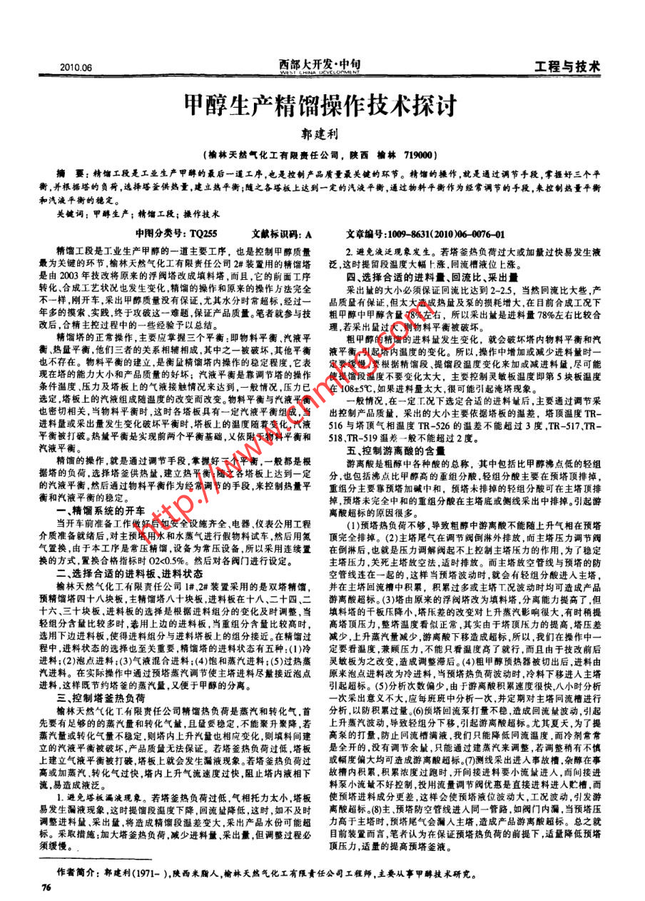2010.06西部大開發(fā)中旬工程與技術甲醇生產(chǎn)精餾操作技術探討郭建利(榆林天然氣化工有限責任公司,陜西榆林719000)摘要:精餾工段是工業(yè)生產(chǎn)甲醇的最后一道工序 ,也是控制產(chǎn)品質量最關鍵的環(huán)節(jié)。精餾的操作,就是通過調節(jié)手段,掌握好三個平衡,并根據(jù)塔的負荷,選擇塔釜供熱量,建立熱平衡;隨之各塔板上達到一定的汽液平衡,通過物料平衡作為經(jīng)常調節(jié)的手段,來控制鵝量平衡和汽液平衡的穩(wěn)定。關鍵詞;甲醇生產(chǎn);精餾工段;操作技術中圖分類號: TQ255文獻標識碼: A文章編號:1009- -8631(2010)06 0076-01精餾工段是工業(yè)生產(chǎn)甲醇的一道主要工序,也是控制甲醇質量2.避免液泛現(xiàn)象發(fā)生。若塔釜熱負荷過大或加量過快易發(fā)生液最為關鍵的環(huán)節(jié),榆林天然氣化工有限責任公司2#裝置用的精餾塔泛,這時提留段溫度大幅上.漲.回流槽液位上漲。是由2003年技改將原來的浮閥塔改成填料塔,而且,它的前面工序四選擇合適的進料t、回流比、采出量轉化、合成工藝狀況也發(fā)生變化,精餾的操作和原來的操作方法完全采出量的大小必須保證回流比達到2-2.5,當然回流比大些,產(chǎn)不一樣剛開車,采出甲醇質量沒有保證,尤其水分時常超標,經(jīng)過一品質量有保證,但太大造成熱量及泵的損耗增大,在目前合成工況下年多的摸索、實踐,終于攻破這一難題,保證產(chǎn)品質量。筆者就參與技粗甲醇中甲醇含量78%左右,所以采出量是進料量78%左右比較合改后,合精主控過程中的一- 些經(jīng)驗予以總結。理,若采出量過大,則物料平衡被破壞。精餾塔的正常操作,主要應掌握三個平衡:即物料平衡,汽液平粗甲醇的精餾的進料量發(fā)生變化,就會破壞塔內物料平衡和汽衡、熱量平衡,他們三者的關系相輔相成,其中之-被破壞,其他平衡 液平 衡,引起塔內溫度的變化。所以,操作中增加或減少進料量時一也不存在。物料平衡的建立,是衡盤精餾塔內操作的穩(wěn)定程度,它表定要緩慢,要根據(jù)精餾段、提餾段溫度變化來加或減進料量,盡可能現(xiàn)在塔的能力大小和產(chǎn)品質量的好壞:汽液平衡是靠調節(jié)塔的操作使提餾段溫度不要變化太大,主要控制靈敏板溫度即第5塊板溫度條件溫度、壓力及塔板上的氣液接觸情況來達到,一-般情況,壓力已在108+5C,如果進料量太大,很可能引起淹塔現(xiàn)象。選定,塔板上的汽液組成隨溫度的改變而改變。物料平衡與汽液平衡一般情況,在一定工況下選定合適的進料量后,主要通過調節(jié)采也密切相關,當物料平衡時,這時各塔板具有一定汽液平衡組成,當出控制產(chǎn)品質量,采出的大小主要依據(jù)塔板的溫差,塔頂溫度TR-進料量或采出量發(fā)生變化破壞平衡時,塔板上的溫度隨著變化,汽液516與塔頂氣相溫度TR-526的溫差不能超過3度,TR-517.TR-平衡被打破。熱量平衡是實現(xiàn)前兩個平衡基礎,又依附于物料平衡和518.TR-519 溫差一般不能超過2度。汽液平衡。精餾的操作 ,就是通過調節(jié)手段,掌握好三個平衡,一般都是根五、控制游離酸的含l據(jù)塔的負荷,選擇塔釜供熱量,建立熱平衡;隨之各塔板上達到一定游離酸是粗醇中各種酸的總稱,其中包括比甲醇沸點低的輕組的汽液平衡,然后通過物料平衡作為經(jīng)常調節(jié)的手段,來控制熱量平分,也包括佛點比甲醉高的重組分酸.輕組分酸主要在預塔頂排掉,.重組分主要靠預塔加堿中和,預塔未排掉的輕組分酸可在主塔頂排衡和汽液平衡的穩(wěn)定。掉,預塔未完全中和的重組分酸在主塔底或側線采出中排掉。引起游-、精餾系統(tǒng)的開車離酸超標的原因很多。當開車前準備工作做好后如安全設施齊全、電器儀表公用工程(1)預塔熱負荷不夠,導致粗醇中游離酸不能隨上升氣相在預塔介質準備就緒后,對主預塔用水和水蒸氣進行假物料試車,然后用氮頂完 全排掉。(2)主塔尾氣在調節(jié)閥倒淋外排放,而主塔壓力調節(jié)閥氣置換,由于本工序是常壓精餾,設備為常壓設備,所以采用連續(xù)置在倒淋后,也就是壓力調解閥起不上控制主塔壓力的作用,為了穩(wěn)定換的方式,置換合格指標時02<0.5%。然后對各閥門進行設定。主塔壓力,關死主塔放空法,適時排放。而主塔放空管線與預塔的防二、選擇合適的進料板進料狀態(tài)空管線連在一起的,這樣當預塔波動時,就會有輕組分酸進入主塔,榆林天然氣化工有限責任公司1# .2#裝置采用的是雙塔精餾,并在主塔回流槽中積累,積累過多或主塔T.況波動時均可造成產(chǎn)品預精餾塔四十八塊板,主精餾塔八十塊板,進料板在十八、二十四、二游離酸超標。(3)塔由原來的浮閥塔改為填料塔,分離能力提高了,但十六、三十塊板,進料板的選擇是根據(jù)進料組分的變化及時調整,當填料塔的干 板壓降小,塔氐差的改變對上升蒸汽影響很大,有時稍提輕組分含量比較多時,選用上邊的進料板.當重組分含量比較高時,高塔頂壓力,整塔溫度看似正常,其實由于塔頂壓力的提高,塔壓差選用下邊進料板,使得進料組分與進料塔板上的組分接近。在精餾過減少,上升蒸汽量減少,游離酸下移造成超標,所以,我們在操作中一程中,進料狀態(tài)的選擇也至關重要,精餾塔的進料狀態(tài)有五種:(1)冷定要看溫度,兼顧壓力,不能只看溫度高了就行,而且由于技改前后進料;(2)泡點進料;(3)氣