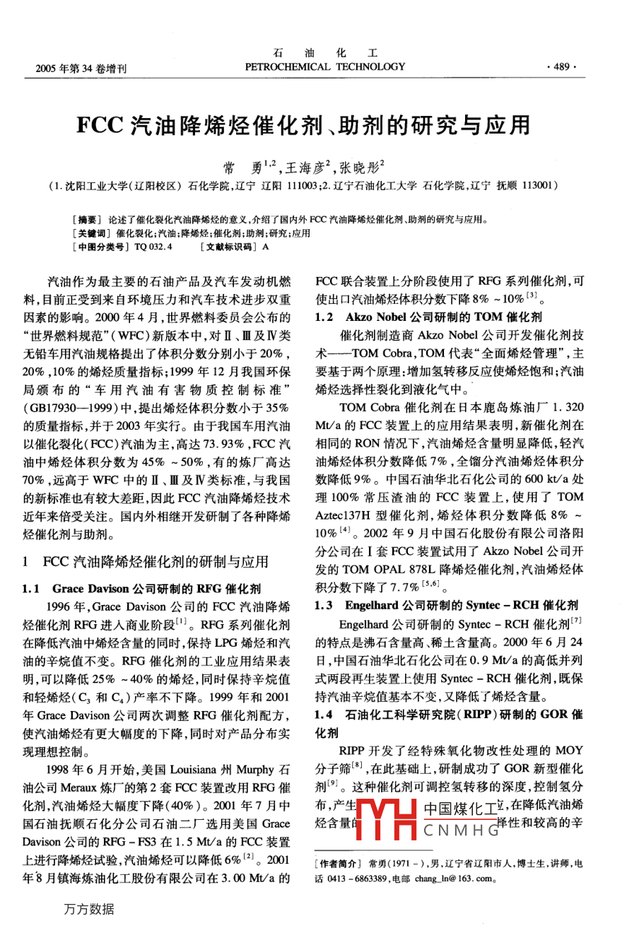 石油化工2005年第34卷增刊PETROCHEMICAL TECHNOLOGYFCC汽油降烯烴催化劑、助劑的研究與應(yīng)用常勇2,王海彥2,張曉彤2(1.沈陽工業(yè)大學(xué)(遼陽校區(qū))石化學(xué)院,遼寧遼陽110;12.遼寧石油化工大學(xué)石化學(xué)院,遼寧撫順113001)[摘要]論述了催化裂化汽油降烯烴的意義,介紹了國(guó)內(nèi)外FCC汽油降烯烴催化劑、助劑的研究與應(yīng)用[關(guān)鍵詞]催化裂化;汽油;降烯烴;催化劑;助劑;研究;應(yīng)用[中圖分類號(hào)]TQ0324[文獻(xiàn)標(biāo)識(shí)碼]A汽油作為最主要的石油產(chǎn)品及汽車發(fā)動(dòng)機(jī)燃FCC聯(lián)合裝置上分階段使用了RFG系列催化劑,可料,目前正受到來自環(huán)境壓力和汽車技術(shù)進(jìn)步雙重使出口汽油烯烴體積分?jǐn)?shù)下降8%-10%3。因素的影響。2000年4月,世界燃料委員會(huì)公布的1.2Akz0 Nobel公司研制的TOM催化劑“世界燃料規(guī)范”(WFC)新版本中,對(duì)Ⅱ、Ⅲ及Ⅳ類催化劑制造商 Akzo Nobel公司開發(fā)催化劑技無鉛車用汽油規(guī)格提出了體積分?jǐn)?shù)分別小于20%,術(shù)— TOM Cobra,TOM代表“全面烯烴管理”,主20%,10%的烯烴質(zhì)量指標(biāo);1999年12月我國(guó)環(huán)保要基于兩個(gè)原理:增加氫轉(zhuǎn)移反應(yīng)使烯烴飽和;汽油局頒布的“車用汽油有害物質(zhì)控制標(biāo)準(zhǔn)”烯烴選擇性裂化到液化氣中(GB17930-1999)中,提出烯烴體積分?jǐn)?shù)小于35%TOM Cobra催化劑在日本鹿島煉油廠1.320的質(zhì)量指標(biāo),并于2003年實(shí)行。由于我國(guó)車用汽油Mt/a的FCC裝置上的應(yīng)用結(jié)果表明,新催化劑在以催化裂化(FC)汽油為主,高達(dá)73.93%,FCC汽相同的RON情況下,汽油烯烴含量明顯降低,輕汽油中烯烴體積分?jǐn)?shù)為45%~50%,有的煉廠高達(dá)油烯烴體積分?jǐn)?shù)降低7%,全餾分汽油烯烴體積分70%,遠(yuǎn)高于WFC中的Ⅱ、Ⅲ及Ⅳ類標(biāo)準(zhǔn),與我國(guó)數(shù)降低9%。中國(guó)石油華北石化公司的600kt/a處的新標(biāo)準(zhǔn)也有較大差距,因此FCC汽油降烯烴技術(shù)理100%常壓渣油的FC裝置上,使用了TOM近年來倍受關(guān)注。國(guó)內(nèi)外相繼開發(fā)研制了各種降烯 Aztec37H型催化劑,烯烴體積分?jǐn)?shù)降低8%烴催化劑與助劑。10%。2002年9月中國(guó)石化股份有限公司洛陽1FCC汽油降烯烴催化劑的研制與應(yīng)用分公司在I套FCC裝置試用了 Akzo nobel公司開發(fā)的 TOM OPAL878L降烯烴催化劑,汽油烯烴體11 Grace Davison公司研制的RFG催化劑積分?jǐn)?shù)下降了7.7%,6。1996年, Grace Davison公司的FCC汽油降烯1.3 Engelhard公司研制的 Syntec-RCH催化劑烴催化劑RFG進(jìn)入商業(yè)階段。RFG系列催化劑Engelhard公司研制的 Syntec-RCH催化劑在降低汽油中烯烴含量的同時(shí),保持LPG烯烴和汽的特點(diǎn)是沸石含量高、稀土含量高。2000年6月24油的辛烷值不變。RFG催化劑的工業(yè)應(yīng)用結(jié)果表日,中國(guó)石油華北石化公司在0.9Ma的高低并列明,可以降低25%-40%的烯烴,同時(shí)保持辛烷值式兩段再生裝置上使用 Syntec-RCH催化劑,既保和輕烯烴(C3和C4)產(chǎn)率不下降。1999年和2001持汽油辛烷值基本不變,又降低了烯烴含量。年 Grace Davison公司兩次調(diào)整RFG催化劑配方,1.4石油化工科學(xué)研究院(RPP)研制的GOR催使汽油烯烴有更大幅度的下降,同時(shí)對(duì)產(chǎn)品分布實(shí)化劑現(xiàn)理想控制。RIPP開發(fā)了經(jīng)特殊氧化物改性處理的MOY19980年6月開始,美國(guó) Louisiana州 Murphy石分子篩),在此基礎(chǔ)上,研制成功了GOR新型催化油公司 Meaux煉廠的第2套FCC裝置改用RFG催劑。這種催化劑可調(diào)控氫轉(zhuǎn)移的深度,控制氫分化劑,汽油烯烴大幅度下降(40%)。2001年7月中布,產(chǎn)國(guó)石油撫順石化分公司石油二廠選用美國(guó) Grace烴含量H中國(guó)煤化工立,在降低汽油烯CNMHG擇性和較高的辛Davison公司的RFG-FS3在1.5Mt/a的FCC裝置上進(jìn)行降烯烴試驗(yàn)汽油烯烴可以降低6%21。2001作者簡(jiǎn)介】常勇(191-),男,遼寧省遼陽市人,博士生,講師,電年8月鎮(zhèn)海煉油化工股份有限公司在3.00Ma的0413-6863389,電郵chang_In@163.com。石油化工490PETROCHEMICAL TECHNOLOGY2005年第34卷烷值。數(shù)達(dá)到50%以上,使用LBO-16H催化劑后,烯烴19909F10月18日洛陽石油化工總廠煉油廠體積分?jǐn)?shù)降至3105%-35.0%。2003年3月在I套FCC裝置上開始使用RIPP開發(fā)研制的中國(guó)石油錦西石化分公司煉油一廠,在FCC裝置中GOR-C催化劑,當(dāng)GOR-C催化劑占系統(tǒng)藏量使用了改進(jìn)型LBO-16H催化劑,在摻煉焦化蠟油66%、劑油比達(dá)到7.0左右時(shí),烯烴體積分?jǐn)?shù)由情況下,汽油中烯烴體積分?jǐn)?shù)降低了10%1。45.25%降低至31.5%。高橋石化公司煉油廠也1.6RPP研制的DOCO催化劑試用了該催化劑,汽油中烯烴體積分?jǐn)?shù)下降8%DOCO催化劑是RIPP研制開發(fā)的第二代降烯10%。2000年5月15日揚(yáng)子石化公司開始使用烴催化劑,它采用高硅鋁比的ZRP-5超穩(wěn)分子篩GOR-C催化劑,至2000年6月5日催化劑占系統(tǒng)為主活性組元,并引用了新型基質(zhì)材料,可合理地調(diào)藏量30%左右,汽油中烯烴體積分?jǐn)?shù)由原來的52%節(jié)酸性分布,使催化劑具有優(yōu)良的可擴(kuò)散性能。同降到40%,后經(jīng)工藝調(diào)整烯烴體積分?jǐn)?shù)降到35%以時(shí)由于裂化活性和氫轉(zhuǎn)移活性的有效匹配,使催化下。2001年2月大慶煉化公司林源生
