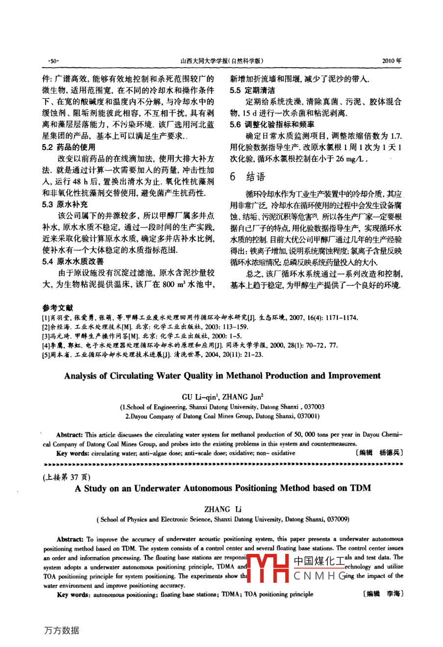 第26卷第6期山西大同大學(xué)學(xué)報自然科學(xué)版)Vol26. No 62010年12月Joumal of Shanxi Datong University(Natural Science)Dec 2010文章編號:16740874201006-004803甲醇生產(chǎn)循環(huán)水水質(zhì)分析及改進(jìn)谷麗琴1,張軍2(1山西大同大學(xué)工學(xué)院,山西大同0370002大同煤礦集團(tuán)大優(yōu)公司,山西大同037001)摘要:對大同煤礦集因大優(yōu)化工有限公司煤氣聯(lián)產(chǎn)5萬L年甲醇生產(chǎn)循環(huán)水系統(tǒng)介紹,對因有循壞水系統(tǒng)存在的問題進(jìn)行分析并探討解決方法關(guān)鍵詞:循環(huán)水系統(tǒng)抗藻劑阻垢劑氧化性非氧化性中圖分類號:TB6文獻(xiàn)標(biāo)識碼:A甲醇在我國經(jīng)濟(jì)發(fā)展中占有重要地位,不論是持較好的冷卻效果,此過程稱循環(huán)水的冷卻;二是化工原料還是新型能源方面.目前甲醇市場十分火使循環(huán)水水質(zhì)穩(wěn)定,防止換熱設(shè)備與管路結(jié)垢和腐爆,需求增長強(qiáng)勁,因此,發(fā)展甲醇生產(chǎn)有著廣闊的蝕.雖然循環(huán)水每次使用物理性狀變化很小,但長期前景,但甲醇生產(chǎn)又是高能耗高水耗的生產(chǎn),無疑循環(huán)使用后,會使某些物質(zhì)濃縮或散失,塵土積累,使其發(fā)展空間受到了一定的制約微生物滋生等,造成設(shè)備內(nèi)垢物沉積或金屬設(shè)備表隨著日益嚴(yán)重的水環(huán)境污染問題,為緩解水資面腐蝕.為防止循環(huán)冷卻水系統(tǒng)中垢物沉積或設(shè)備源的供需矛盾,迫切需要研究開發(fā)回用技術(shù).因此腐蝕對冷卻水進(jìn)行處理的過程稱為循環(huán)水處理污水再生處理與利用受到了國內(nèi)外的重視和關(guān)注叫節(jié)約用水、廢水回用是可持續(xù)發(fā)展的戰(zhàn)略要求,工1循環(huán)水生產(chǎn)系統(tǒng)工藝流程業(yè)冷卻水占工業(yè)用水的80%以上,對冷卻水實(shí)行工藝流程見圖1.同煤集團(tuán)大優(yōu)化工有限公司循環(huán)利用具有顯著的環(huán)境效益、經(jīng)濟(jì)效益和社會效是用城市煤氣聯(lián)產(chǎn)甲醇,該系統(tǒng)循環(huán)冷卻水采用的益.然而冷卻水在循環(huán)使用過程中會出現(xiàn)結(jié)垢腐蝕是密閉式循環(huán)冷卻,水在一個閉合回路中循環(huán)而不和微生物滋生等危害,需要妥善處理.要使工業(yè)冷暴露于空氣中,以一定類型的換熱設(shè)備用其他的冷卻水形成正常的循環(huán)系統(tǒng),需要采取兩項關(guān)鍵技術(shù)卻介質(zhì)進(jìn)行冷卻,冷卻水損失極小,基本上不濃縮措施:一是使高溫的水冷卻到可回用的溫度,以保因此,對于蒸發(fā)的影響、暴露在大氣中的影響和其冷卻水或空氣令卻后受熱后補(bǔ)充水的循環(huán)水的循環(huán)水冷卻后的循環(huán)水排污1-貯水槽:2泵:3-換熱器;4二次冷卻器圖1密閉式循環(huán)冷中國煤化工收稿日期:2010-06-12CNMHG作者簡介:谷麗琴(1963-),女,山西大同人,副教授研究方向:煤化T教學(xué)與研究2010年谷麗琴等:甲醇生產(chǎn)循環(huán)水水質(zhì)分析及改進(jìn)他能夠改變系統(tǒng)中水的化學(xué)性質(zhì)的影響都可以忽略機(jī)物為微生物滋生帶來養(yǎng)分,菌藻大量滋生,造成不計系統(tǒng)中,被交換下來的熱量首先傳到密閉的冷生物粘泥的危害卻水回路,然后冉由第二個換熱器從密閉冋路中傳入使用冷卻循環(huán)水主要有三個方面的問題一因溶解第二個冷卻回路系統(tǒng)第二個冷卻回路是蒸發(fā)式的,氧的低飽和等造成金屬電化學(xué)腐蝕;二因蒸發(fā)濃縮需要高濃度的處理藥劑,通常只需補(bǔ)加少量補(bǔ)充水,含鹽量增加造成結(jié)垢傾向;因與空氣接觸吸收了大補(bǔ)充水必須是含鹽量低的水,這樣才能使冷卻系統(tǒng)達(dá)量的灰塵、泥沙、微生物加上塔內(nèi)適宜的光照溫度、到最佳操作狀態(tài)大優(yōu)公司是2006年9月投入生產(chǎn),氧氣、養(yǎng)分下大量菌藻滋生,系統(tǒng)污泥增加造成生物原水由高莊水廠1號、4號深水井提供,屬地下水系.粘泥的危害而且污垢微生物會大大增加腐蝕的機(jī)率原水先進(jìn)入800m3和300m3兩個水池沉淀后,由潛微生物粘泥對光滑的金屬表面腐蝕也會加劇污垢沉積水泵打入生產(chǎn)區(qū)水處理車間進(jìn)行凈化后,注入到500因此運(yùn)行中的冷卻循環(huán)水系統(tǒng)主要是防結(jié)垢、防腐蝕m3循環(huán)水池,經(jīng)過三臺大功率冷水泵進(jìn)入到生產(chǎn)裝置防閑藻俗稱水處理的“三要素”所以水體的凈化預(yù)處區(qū)的壓縮機(jī)、精餾工段、變換τ段合成T段的冷卻器理、微生物控制、緩蝕阻垢必須統(tǒng)籌考慮,否則會影響循環(huán)回到500m3循環(huán)水池,定期對循環(huán)池投入阻垢整個冷卻循環(huán)水系統(tǒng)安全運(yùn)行循環(huán)水因蒸發(fā),含鹽量劑、絮凝劑、抗藻劑用以改善循環(huán)水水質(zhì)不斷增加,經(jīng)濃縮的循環(huán)水含鹽量和補(bǔ)充的新鮮水含2循環(huán)水的冷卻原理鹽量不同,兩者的比值就是濃縮增數(shù)一個現(xiàn)場或一種特殊情況,選擇多大的濃縮倍數(shù)為合適,應(yīng)首先分析濃換熱后溫度升高的冷卻水,其冷卻是通過水與縮后的水質(zhì)情況,若水中有害離子增多,產(chǎn)生結(jié)垢或腐空氣接觸,由蒸發(fā)散熱、接觸散熱和輻射散熱三個蝕傾向,就要調(diào)整濃縮倍數(shù)過程共同作用的結(jié)果蒸發(fā)散熱是水在冷卻設(sh