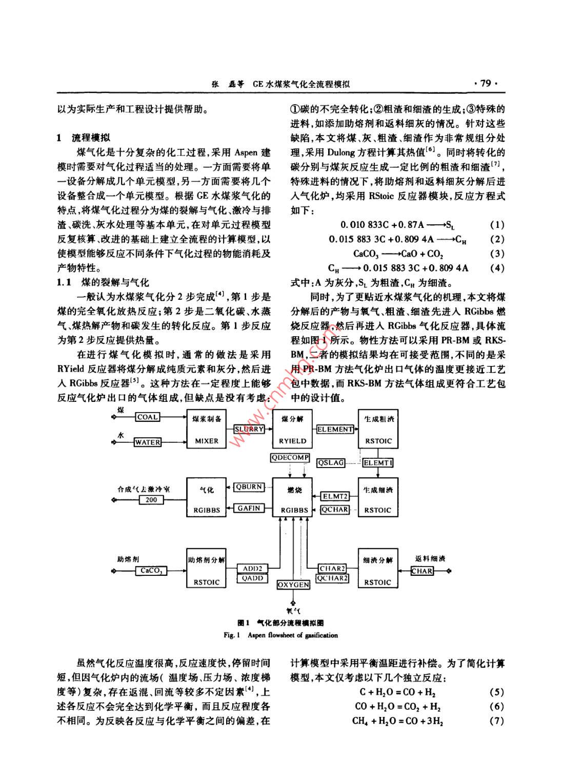 第39卷第7期化學(xué)工程Vol. 39 No.72011 年7月CHEMICAL ENGINEERING( CHINA)l. 2011GE水煤漿氣化全流程模擬張磊,汪根寶,謝東升,許兆廣(中國石化集團(tuán)南京工程公司,江蘇南京211100)摘要:GE水煤漿氣化工藝是目前廣泛采用的煤氣化技術(shù)。通過對(duì)GE水煤漿氣化全過程的模擬,可以加深對(duì)工藝包的理解,對(duì)氣化爐進(jìn)行優(yōu)化控制,同時(shí)為工藝設(shè)計(jì)和生產(chǎn)操作提供指導(dǎo)。文中根據(jù)GE水煤漿氣化的T.藝特點(diǎn),將水煤漿氣化過程分為煤的裂解與氣化激冷與排渣、碳洗、閃蒸與灰水處理等基本單元過程,在對(duì)單元過程模型反復(fù)核算改進(jìn)的基礎(chǔ)上采用Aspen Plus建立了GE水煤漿氣化全流程的計(jì)算模型。通過校核計(jì)算與設(shè)計(jì)計(jì)算2種方式分別進(jìn)行了模型驗(yàn)證,2種計(jì)算結(jié)果均與工藝包數(shù)據(jù)較為吻合,證明所建立的模型適用于CE氣化過程的計(jì)算,可以對(duì)GE氣化爐的氣化過程作出相對(duì)合理的預(yù)測(cè)。關(guān)鍵詞:Aspen Plus;冰煤漿;氣化;激冷;灰水處理;碳洗;模擬中圖分類號(hào):TQ 054文獻(xiàn)標(biāo)識(shí)碼:A文章編號(hào):1005-9954(2011 )07-0078-05Simulation of whole GE water-coal slurry gasification processZHANG Lei, WANG Gen-bao, XIE Dong-sheng, XU Zhao-guang(Sinopee Nanjng Engineering & Construction lnc.,Nanjing 21100 , Jiangsu Province, China)Abstract :GE water coal slumy gasification process is one of the commonly-used advanced gasification technologies.The simulation of whole GE gasification can improve the understanding of the process and be used 8s a predictivetool at the optimization stage, and also provide guidance for process design and production operation. The featuresof CE slurry gasification were analyzed, which can be divided into several units of coal pyrolysis and gasification,quench and slag handing, syngas scrubbing, fash, and black water handling. The calculation model of whole CEwater- coal slury gasification process was set up with Aspen Plus based on the testing and verifying section models.The model was verified through rating and designing calculations. Two calculation results are in agreement with thedata in process design package( PDP). It indicates that the developed model is feasible to calculate and predict theGE gasification.Key words: Aspen Plus; water-coal slurry; gasification; quench; black water handling; syngas scrubbing; simulation立足于中國的能源結(jié)構(gòu)及國家宏觀發(fā)展戰(zhàn)略的擬分析,可以更深人地了解其工藝,并對(duì)氣化爐進(jìn)行轉(zhuǎn)變,潔凈煤技術(shù)作為可持續(xù)發(fā)展和實(shí)現(xiàn)2個(gè)根本優(yōu)化控制",提高整個(gè)過程的熱效率;同時(shí)可以預(yù)轉(zhuǎn)變的戰(zhàn)略措施之一,得到了 政府的大力支持。煤測(cè)不同條件下氣化爐出口煤氣的成分及污染物的排氣化技術(shù)是實(shí)現(xiàn)煤炭潔凈利用的關(guān)鍵共性技術(shù),是放,為工程設(shè)計(jì)提供指導(dǎo)。發(fā)展煤基化學(xué)品煤基液體燃料、煤氣化聯(lián)合循環(huán)發(fā)煤氣化的模擬工作得到許多研究人員的重電多聯(lián)產(chǎn)等過程工業(yè)的龍頭和基礎(chǔ)。其中,GE公視[23),但大部分的工作僅集中在氣化部分,對(duì)包括司開發(fā)的水煤漿氣化(原德士古水煤漿加壓氣化技激冷、排渣洗滌、閃蒸等工序在內(nèi)的整個(gè)水煤漿氣術(shù))具有煤種適應(yīng)性強(qiáng)、碳轉(zhuǎn)化率高、適合作化工合化流程模擬卻很少關(guān)注。而這些T序?qū)饣到y(tǒng)的成原料氣、三廢處理方便、操作穩(wěn)定等優(yōu)點(diǎn),成為迄物料消耗能量消耗及利用起著重要作用。因此,本今為止工業(yè)化較好的煤氣化技術(shù),在國內(nèi)得到了廣文開展了氣化全流程的模擬計(jì)算工作,通過對(duì)氣化泛應(yīng)用。工藝的分析,將氣化過程分為若干子過程進(jìn)行模擬,通過Aspen Plus對(duì)整個(gè)水煤漿氣化過程進(jìn)行模并與工藝包提供的數(shù)據(jù)對(duì)比,取得了理想的結(jié)果,可收稿日期:2010-12-24作者簡介:張磊( 1981- -),男,碩士,工程師、從事化工設(shè)計(jì)工作,E-mail:hanglei01. snei@ sinopec. com。張磊等GE水煤漿氣化全流程模擬●79.以為實(shí)際生產(chǎn)和工程設(shè)計(jì)提供幫助。①碳的不完全轉(zhuǎn)化;②粗渣和細(xì)渣的生成;③特殊的進(jìn)料,如添加助熔劑和返料細(xì)灰的情況。針對(duì)這些1流程模擬缺陷,,本文將煤、灰、粗渣細(xì)渣作為非常規(guī)組分處煤氣化是十分復(fù)雜的化工過程,采用Aspen 建理,采用Dulong方程計(jì)算其熱值'°]。同時(shí)將轉(zhuǎn)化的模時(shí)需要對(duì)氣化過程適當(dāng)?shù)奶幚怼?-方面需要將單碳分別與煤灰反應(yīng)生成--定比例的粗渣和細(xì)渣["),一設(shè)備分解成幾個(gè)單元模型,另一方面需要將幾個(gè)特殊進(jìn)料的情況下,將助熔劑和返料細(xì)灰分解后進(jìn)設(shè)備整合成-一個(gè)單元模型。根據(jù)GE水煤漿氣化的人氣化爐,均采用RSloic反應(yīng)器模塊,反應(yīng)方程式特點(diǎn),將煤氣化過程分為煤的裂解與氣化、激冷與排如下:渣碳洗、灰水處理等基本單元,在對(duì)單元過程模型0.010 833C +0.87A-→+S(1)反復(fù)核算、改進(jìn)的基礎(chǔ)上建立全流程的計(jì)算模型,以0.015 883 3C +0.809 4A--→Cp(2)使模型能夠反應(yīng)不同條件下氣化過程的物能消耗及CaCO,一→CaO + CO2(3)產(chǎn)物特性。Cp-→ 0.015 883 3C