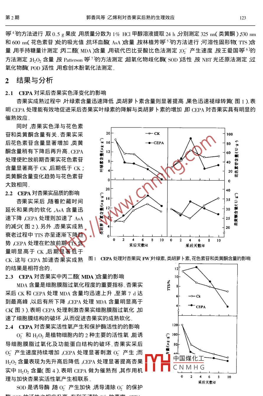 2001年6月河南農(nóng)業(yè)大學(xué)學(xué)報(bào)Jun.2001第35卷第2期Journal of Henan Agricultural UniversityVol.35 No.2文章編號(hào):1000- 2340 2001 )2 - 0122-03乙烯利對(duì)杏果實(shí)后熟的生理效應(yīng)郭香鳳'張國海'史國安梁臣?張益民'張桂蓮3( 1.洛陽農(nóng)業(yè)高等??茖W(xué)校河南洛陽471003 2.洛陽市林業(yè)科學(xué)研究所河南洛陽471002 ;3.鄭州綠文廣場(chǎng)管理處河南鄭州450002 )摘要:以綠熟轉(zhuǎn)色期的仰韶黃杏為試材研究了乙烯利CEPA促杏果實(shí)后熟的生理效應(yīng).結(jié)果表明,100 mg kg-'CEPA 能加速杏果實(shí)葉綠素和AsA的降解、類胡蘿卜素和花色素苷的積累、02和HO2產(chǎn)生、也能抑制SOD和POD酶活性認(rèn)為CEPA加速杏果實(shí)成熟與促進(jìn)細(xì)胞脂質(zhì)過氧化代謝有關(guān).關(guān)鍵詞杏果實(shí)XCEPA處理后熟中圖分類號(hào)S662.2文獻(xiàn)標(biāo)識(shí)碼APhysiological effect of ethephon in ripening in postharvestPrunus armeniace fruitGUO Xiang-feng' , ZHANG Guo-hai' , SHI Guo-an' . ,LIANG Chen2 , ZHANG Yi-min' et al .( 1. Luoyang Agricultural College ,Luoyang 471003 China 2. Luoyang Forestry Research Institute Luogang 471002 China )Abstract : Yangshao yellow apricots at the coler changing ripening stage from green were used as experimental subjectto study the physiological effect of Ethephor( CEPA ) on ripening and senescence in postharvest apricot fruit. The re-sults show that pastharvest treatment with CEPA at 100 mg kg~ 1 can promote chlorophyll and AsA degradation ,carotenoid and anthocy anin accumulation during apricot fruit ripening and senescence process. Also ,CEPA can in-crease the production of 02 and H2O2 ,and inhibit the activity of SOD and POD in apricot fruits after harvesting. Thisfact suggests that the CEPA treatment causing the membrance lipid peroxidation rainforcement might be the neason fopromoting apricot fruiits ripening and senescence .Key words :Prunus armeriace fruit ; CEPA treatment ; ripening杏果實(shí)是我國北方夏季上市較早的優(yōu)質(zhì)水果加速杏果實(shí)成熟提早上市具有重要的經(jīng)濟(jì)意義,果實(shí)成熟是一個(gè)非常復(fù)雜的生理過程進(jìn)入成熟階段以后,內(nèi)源乙烯含量不斷提高達(dá)到生理有效水平便誘發(fā)果實(shí)成熟1.乙烯利是公認(rèn)的催熟激素能夠誘導(dǎo)和促進(jìn)杏果實(shí)的成熟2]為了探討外源乙烯加速杏果實(shí)成熟發(fā)育的生理效應(yīng)作者進(jìn)行了此項(xiàng)研究.1材料與方法1.1 材料及其處理試驗(yàn)于1994~1998年進(jìn)行.仰韶杏(PrunusarmeniaceL采自河南澠池縣杏試驗(yàn)基地為無病蟲害、無機(jī)械損傷、果皮黃綠處于轉(zhuǎn)色期的、大小基本一致的果實(shí). 每袋果重2.5 kg每處理重復(fù)4次.用100 mgkg~'乙烯利( CEPA)+質(zhì)量分?jǐn)?shù)為0.1%多菌靈的溶液浸果3 min裝入厚度為0.03 mm的聚乙烯薄膜袋(不扎口)在(26士1)C的控溫室內(nèi)貯存對(duì)照取同樣數(shù)量的果實(shí)用質(zhì)量分?jǐn)?shù)為0.1%多菌靈處理.定期取果測(cè)定各項(xiàng)生理指標(biāo).1.2 測(cè)定項(xiàng)目與方法中國煤化工葉綠素和類胡蘿卜素含量按沈偉其介紹的混合液提取MYHcNMHG:黃酮含量按郭香鳳收稿日期2001-01- 14基金項(xiàng)目河南省科技攻關(guān)項(xiàng)目( 91050000 )作者簡介郭香鳳(1964-)男河南澠池人洛陽農(nóng)業(yè)高等??茖W(xué)校講師主要從事果蔬貯藏保鮮技術(shù)研究.第2期郭香鳳等:乙烯利對(duì)杏果實(shí)后熟的生理效應(yīng)123等4]的方法進(jìn)行取0.5 g果皮用質(zhì)量分?jǐn)?shù)為1% HCl甲醇溶液提取24 h分別測(cè)定325 nn(類黃酮) 530 nm和600 nn(花色素苷)處的吸光值;抗壞血酸( AsA )含量按林植芳等s的方法進(jìn)行河溶性固形物TTS )冶量用手持糖量計(jì)測(cè)定丙二醛( MDA )含量用硫代巴比妥酸比色法測(cè)定;02產(chǎn)生速度按王愛國等6]的方法測(cè)定H202含量按Ptterson等7的方法測(cè)定超氧化物歧化酶( SOD )活性按NBT光還原法測(cè)定過氧化物酶POD )活性用愈創(chuàng)木酚氧化法測(cè)定.2結(jié)果與分析2.1 CEPA 對(duì)采后杏果實(shí)色澤變化的影響杏果實(shí)成熟過程中葉綠素含量迅速降低類胡蘿卜素含量則顯著提高果色迅速褪綠轉(zhuǎn)黃(圖1).表明CEPA處理能有效地促進(jìn)采后杏果實(shí)葉綠素的降解與類胡蘿卜素的增加即CEPA對(duì)杏果實(shí)具有明顯的催熟效應(yīng).同時(shí),杏果實(shí)色澤與花色素苷和類黃酮含量有關(guān).杏果實(shí)采-CK后花色素苷含量顯著增加,類黃-●CEPA酮含量稍有下降后再升高.CEPA2| 60處理使貯放前期杏果實(shí)花色素苷8- 40含量顯著高于CK后期低于CK ;類黃酮含量變化趨勢(shì)與花色素苷HC大致相同.0FH 402.2 CEPA 對(duì)杏果實(shí)品質(zhì)的影響杏果實(shí)采后隨著貯藏時(shí)間6-H 3:延長和果肉的軟化,AsA含量迅2-t 3{速下降,CEPA處理則加速了AsA的減少圖2).另外,杏果實(shí)成熟.20衰老過程中TTS亦呈逐漸下降趨勢(shì)CEPA處理在貯放前期TTS含采后天數(shù)k采后天數(shù)f量明顯高于CK后期顯著低于cK.這與CEPA加速杏果實(shí)成熟圖1 CEPA 處理對(duì)杏果實(shí)rw財(cái)綠素、類胡蘿卜素花色素苷和類黃酮含量的影響的結(jié)果是相符合的.122.3 CEPA 對(duì)杏果實(shí)中丙二醛( MDA含量的影響10-MDA含量是細(xì)胞膜脂過氧化程度的重要指標(biāo).杏果實(shí)采后CK和CEPA處理MDA含量均迅速上升至第7d達(dá)6 --Ck到最高峰,以后有所下降,CEPA處理MDA含量明顯高