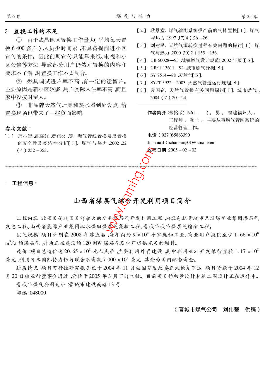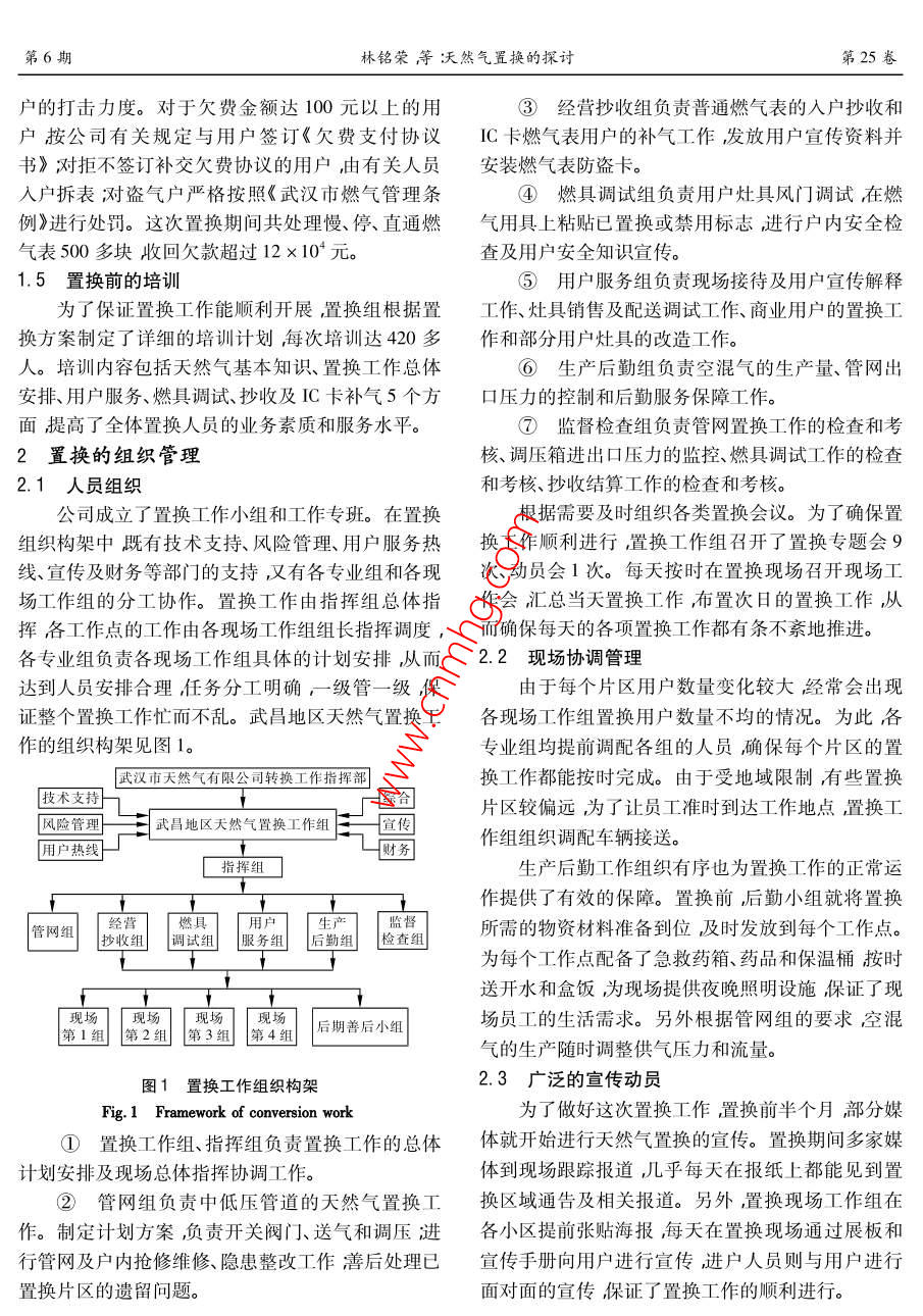 笫25卷第6期煤氣與熱力Vol 25 No 62005年6月gas heatJun.2005天然氣置換的探討林銘榮,傅占明,邵小蘭(武漢市天然氣有限公司,湖北武漢430022)摘要:以武昌地區(qū)為例從管網(wǎng)、燃具、燃?xì)獗淼确矫嫣接懥颂烊粴庵脫Q分析了置換過(guò)程的組織管理。關(guān)鍵詞:燃?xì)廪D(zhuǎn)換;天然氣置換;工程管理中圖分類號(hào):TU996文獻(xiàn)標(biāo)識(shí)碼:B文章編號(hào):1000-4416(200506-0049-04Discussion on Natural Gas ConversionLIN Ming-rong, FU Zhan-ming, SHAO Xiao-lan( Wuhan Natural Gas Co., Ltd., Wuhan 430022, ChinaAbstract: Taking Wuchang region for example the natural gas conversion in the aspects ofnetwork, gas appliances, gas meter etc. is discussed. The organization and management of the conver-sion process are analyzedKey words: gas conversion natural gas conversion; project management在燃?xì)廪D(zhuǎn)換過(guò)程中,置換是燃?xì)廪D(zhuǎn)換的重要環(huán)換現(xiàn)場(chǎng)條件非常惡劣。b.置換工作量大地域較廣,節(jié)=3。武昌地區(qū)約13×104戶LPG混空氣(以下用戶分散,作難度較大。c.廣大用戶一直認(rèn)為天簡(jiǎn)稱空混氣)用戶,于2004年12月29日開始天然然氣進(jìn)漢可直接使用安全意識(shí)較淡薄。氣置換工作歷時(shí)33d實(shí)際置換時(shí)間22d)置換工公司針對(duì)武昌地區(qū)的實(shí)際情況精心編制了置作全部順利完成。換方案并明確了置換工作的要求和目標(biāo),對(duì)工作人這次置換工作投入人力共9840人共置換空員進(jìn)行了合理的分工以保證置換工作規(guī)范有序地混氣用戶約13×10戶(其中使用普通燃?xì)獗淼木舆M(jìn)行民用戶約占56.3%使用C卡燃?xì)獗淼木用裼脩?.1氣源的互換性約占43%,商業(yè)用戶約占0.7%),置換高壓管道如表1所示武昌地區(qū)的空混氣和四川忠縣的186km、中壓管道308km、低壓管道312km、閥門天然氣2種氣源互換性的主要指標(biāo)—一華白數(shù)在燃976座、凝水缸1328座、調(diào)壓箱2580座。置換期氣置換的規(guī)定范圍內(nèi)←6]。另外公司還委托華中科間共調(diào)試燃具83930臺(tái)銷售燃具2510臺(tái)技大學(xué)對(duì)武昌地區(qū)空混氣燃具對(duì)四川忠縣天然氣的1置換方案適應(yīng)性進(jìn)行了課題研究實(shí)驗(yàn)室實(shí)驗(yàn)結(jié)果表明這2武昌地區(qū)天然氣置換工作是川氣進(jìn)漢后首次大種氣源可以互換。公司以此依據(jù)來(lái)制定武昌地區(qū)管規(guī)模的置換工作既存在有利條件也存在不利因素。網(wǎng)及燃具的置換方案。①有利條件。a.用戶基本都使用空混氣燃表12種氣源的主要特性具及相關(guān)設(shè)施一般不需改造管網(wǎng)供氣壓力也不需Tab. 1 Main properties of two gas sources進(jìn)行大的調(diào)整。b,天然氣價(jià)格比空混氣低,用戶易項(xiàng)目低熱值相對(duì)華白數(shù)M.密度(M,m-3)于接受。四川忠縣的天然氣33.490.5843.97②不利因素。a.冬季氣溫低雨雪天氣多,置武昌地區(qū)的空混氣50.461.3942:80第6期煤氣與熱力第25卷1.2管網(wǎng)系統(tǒng)的置換確保了置換方案的可操作性。①對(duì)于新建的天然氣高中壓管網(wǎng),主要采用1.3燃具的置換間接置換法即使用惰性氣體N2先將管內(nèi)的空氣置①民用燃具。這次置換公司一般只做燃具調(diào)換然后再輸入天然氣。試(略微調(diào)大灶具風(fēng)門)和新燃具的更換工作,而對(duì)②根據(jù)武昌地區(qū)管網(wǎng)分布的實(shí)際情況將中于需要更換配件或需要改造的燃具由用戶直接與低壓管網(wǎng)分成20個(gè)片區(qū)按每小片1天完成置換以廠家聯(lián)系改造公司負(fù)責(zé)監(jiān)督檢查。為了驗(yàn)證空混及每大片2天完成置換的計(jì)劃向前推進(jìn)。氣和天然氣的互換性置換前公司將不同品牌、不同③由于武昌地區(qū)的管道及附屬設(shè)施均是按空使用年限的空混氣灶具及部分改造灶具進(jìn)行了2次混氣進(jìn)行設(shè)計(jì)施工的埋地燃?xì)夤艿乐饕獮闊o(wú)縫鋼天然氣試燒試燒結(jié)果較好為灶具的調(diào)試工作提供管、螺旋縫鋼管和PE管,戶內(nèi)及室外管道主要為鍍了有力的保障。從這次置換調(diào)試的實(shí)際情況來(lái)看鋅鋼管。閥門主要為油密封旋塞閥、球閥和閘嵌入式灶及2000年以后生產(chǎn)的部分品牌灶在天然閥,調(diào)壓器為樓棟調(diào)壓箱或戶內(nèi)調(diào)壓器。經(jīng)分氣置換后能正常點(diǎn)火僅對(duì)風(fēng)門稍作調(diào)整就能達(dá)到析,上述管道及附屬設(shè)施能滿足天然氣的運(yùn)行要求。較好的燃燒效果對(duì)于2000年以前生產(chǎn)的灶具及部從近期的供氣能力看經(jīng)過(guò)理論計(jì)算不需要馬上進(jìn)分舊品牌灶,置換后也存在不能正常打火的現(xiàn)象其行管網(wǎng)升維持0.14MPa)因此在這次置換過(guò)主要原因是點(diǎn)火噴嘴孔徑過(guò)大等。程中按照實(shí)際情況采取了2種不同的置換方式。a.②商業(yè)用戶燃具。由天然氣公司提前與用戶前3片按置換方案先將管網(wǎng)降壓至0.03MPa再送聯(lián)系由用戶直接聯(lián)系其設(shè)備生產(chǎn)廠家或?qū)I(yè)廠家入天然氣。采取“氣頂氣”的置換方式將空混氣頂上門調(diào)試和改造。至管網(wǎng)末端放散在末端用可燃?xì)怏w檢漏儀測(cè)試合1.4燃?xì)獗淼闹脫Q格即為管網(wǎng)置換完成。b.從第4片開始,根據(jù)前3目前武昌地區(qū)居民用戶使用的燃?xì)獗頌镚1.6片置換用戶灶具