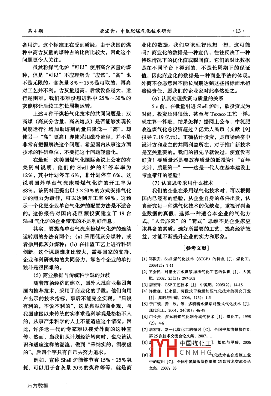 第4期中氮肥No.42007年7月M-Sized Nitrogenous Fertilizer ProgressJul. 2007中氮肥煤氣化技術(shù)研討唐宏青(中國石化寧波工程有限公司,浙江寧波315207)[摘要] 提出未來中氮企業(yè)的發(fā)展方向和規(guī)模;介紹了適用于中氮企業(yè)的幾種煤氣化技術(shù);對.中氮企業(yè)選擇何種煤氣化技術(shù)做了討論。[關(guān)鍵詞]中氮肥;煤氣化技術(shù);研討[中圖分類號] TQ 546[文獻標識碼] A [文章編號] 10-93200)0009-05Deliberating on Coal Gasification Technologies forM-sized Nitrogenous Fertilizer PlantsTANG Hong qing(Sinopec Ningbo Engineering Co., Ltd, Ningbo 315207, China)Abstract: In this paper, the author puts forward the development orientation and scale of M-sized nitroge-nous fertilizer plants, presents several suitable coal gasification technologies, and discusses some points thatshould be considered by M sized nitrogenous fertilizer plants when selecting.Key words: M-sized nitrogenous fertilizer plant, coal gasification technology, deliberating0引言[收稿日期] 2007-01-30[作者簡介]唐宏青(1941- ).男,上海人,教授級高工,中國幾十年來,隨著技術(shù)的進步,經(jīng)濟的發(fā)展,石化集團蘭州設計院原副總工程師。國內(nèi)中型氮肥裝置(簡稱中氮肥,下同)的規(guī)模焦爐氣甲醇補碳流程方案見圖5。氣化爐壓力NHD 脫碳;雙甲工藝采用安淳公司最新技術(shù)。1.0 MPa (或0.5 MPa);直接低壓耐硫變換(補碳流程不需耐硫變換);選用離心壓縮機(人口壓[ CACCM ] -[耐硫究溫中變] +[ 脫碗脫碳力0.8 MPa); 3.0 MPa脫碳脫硫;低壓合成?!焙铣桑琀雙甲壓縮▼氨i副產(chǎn):甲醇CAGGTM耐硫抗硫離心壓縮醚烴燃料寬溫中變圖6配套方案五甲醇◆-H離心壓縮+t脫硫脫碳補碳4結(jié)束語圖5配套方案四隨著國家化肥政策的調(diào)整以及企業(yè)原料煤價3.2.5配套方案五格、由價的不斷L業(yè)化明由本不斷增加,企業(yè)新建80~ 120 kt/a和120~ 180 kt/a合成氨效益H中國煤化工合企業(yè)承受能力,雙甲工藝配套方案如圖6。氣化爐壓力1.0 MPa選擇C N M H G術(shù)進行氣頭改造,(或0.5 MPa); Co-Mo系寬溫變換催化劑;脫硫?qū)⑹蛊髽I(yè)的原材料成本大幅下降,為企業(yè)帶來巨脫碳考慮原料硫含量可選用NHD或栲膠脫硫、大的經(jīng)濟效益,大大提高企業(yè)的市場生存能力?!?0●中氮肥第4期也在變大。回顧20世紀60年代初中期,50 kt/a流程的工業(yè)化裝置用于IGCC。迄今國內(nèi)已經(jīng)與合成氨裝置已經(jīng)是大型裝置了; 70 年代初開始Shell簽訂的15個合同19臺爐子中,已經(jīng)有2建設300 kt/a合成氨裝置;至90年代中期,國套1000t/d和3套2000t/d的氣化爐加廢熱鍋內(nèi)已有31套300kt/a合成氨裝置,55套100爐流程的工業(yè)化裝置投產(chǎn)。從目前開車的情況來kt/a合成氨裝置;到90年代后期,在建單套裝看,還需要- -段時間才能穩(wěn)定成熟。置的規(guī)模已達450 kt/a,原300 kt/a 裝置也相繼(2) Texaco水煤漿加壓氣化[2]改造為450 kt/a規(guī)模。德士古水煤漿加壓氣化工藝是美國德士古石近年來,在- -股甲醇熱中,正在建設的甲醇油公司Texaco在重油氣化的基礎上發(fā)展起來的。單系列裝置從100 kt/a快速飆升到210 kt/a。裝1945年德士古公司在洛杉磯近郊蒙特貝洛建成置大型化成為提高企業(yè)經(jīng)濟效益的主要手段。第1套中試裝置。20世紀70年代開發(fā)的加壓水.氮肥和甲醇的情況有所區(qū)別。主要是氮肥工煤漿氣化工藝已于 80年代初完成示范工作并實藝流程比較長,產(chǎn)品要后加工等原因,其規(guī)模還現(xiàn)工業(yè)化生產(chǎn),成為具有代表性的第二代煤氣化不能“瘋長”。但是可以預計未來10a內(nèi),大氮技術(shù)。德士古水煤漿氣化技術(shù)包括煤漿制備、灰肥裝置的規(guī)模將變?yōu)?50~900 kt/a合成氨,而渣排除、水煤漿氣化等,其核心和關(guān)鍵設備是氣中氮肥裝置的規(guī)模會變成200~ 400 kt/a合成化爐。經(jīng)國內(nèi)多年的運行實踐證明,德士古加壓氨。如果從煤化工的角度考慮,中氮肥煤氣化的水煤漿氣化技術(shù)是先進并成熟可靠的??偼睹毫繛?00~1 800t/d,采用(2+1) 臺氣國外已經(jīng)實現(xiàn)了單線2000 t/d的氣化爐加化爐。激冷流程的工業(yè)化運行。國內(nèi)最大規(guī)模為單線大型煤氣化技術(shù)在中氮企業(yè)使用是可能的,1 000 t/d,技術(shù)成熟。這是因為未來的中氮肥規(guī)模就是現(xiàn)在的大氮肥規(guī)(3) GSP粉煤氣化[3]模。曾經(jīng)有人提出用現(xiàn)在的小氮肥技術(shù),通過并GSP煤氣化過程是在高溫加壓下進行的,聯(lián)方式(例如采用幾十臺UGI爐并聯(lián)和低壓多是原民 主德國開發(fā)的較為先進的第二代煤氣化工次脫硫脫碳技術(shù)等)直接將小氮裝置變成中氮裝藝之一,屬氣流床氣化。與其他煤氣化工藝一置。很明顯,這是不可取的,不僅投資高,而且樣,GSP氣化工藝過程主要是由給料系統(tǒng)、氣能耗高、污染大,不利于高度自動化控制。化爐、粗煤氣洗滌組成,即由備煤、氣化、除渣由此可見,隨著規(guī)模的增長,氮肥技術(shù)要與3部分組成。時俱進,中氨肥的技術(shù)也要相應變化。我們曾經(jīng)支持過GSP技術(shù),原因是GSP氣化爐的設計理念比較合理,這種技術(shù)比較容易實1煤氣化技術(shù)現(xiàn),能出現(xiàn)比較好的效果。但是,由于外商欠缺世界上煤氣化技術(shù)有上百種,不是任何一-種在工程方面的經(jīng)驗,也不了解中國的國情,使這都可以隨便拿來使用。考慮國內(nèi)具體情況,適合種技