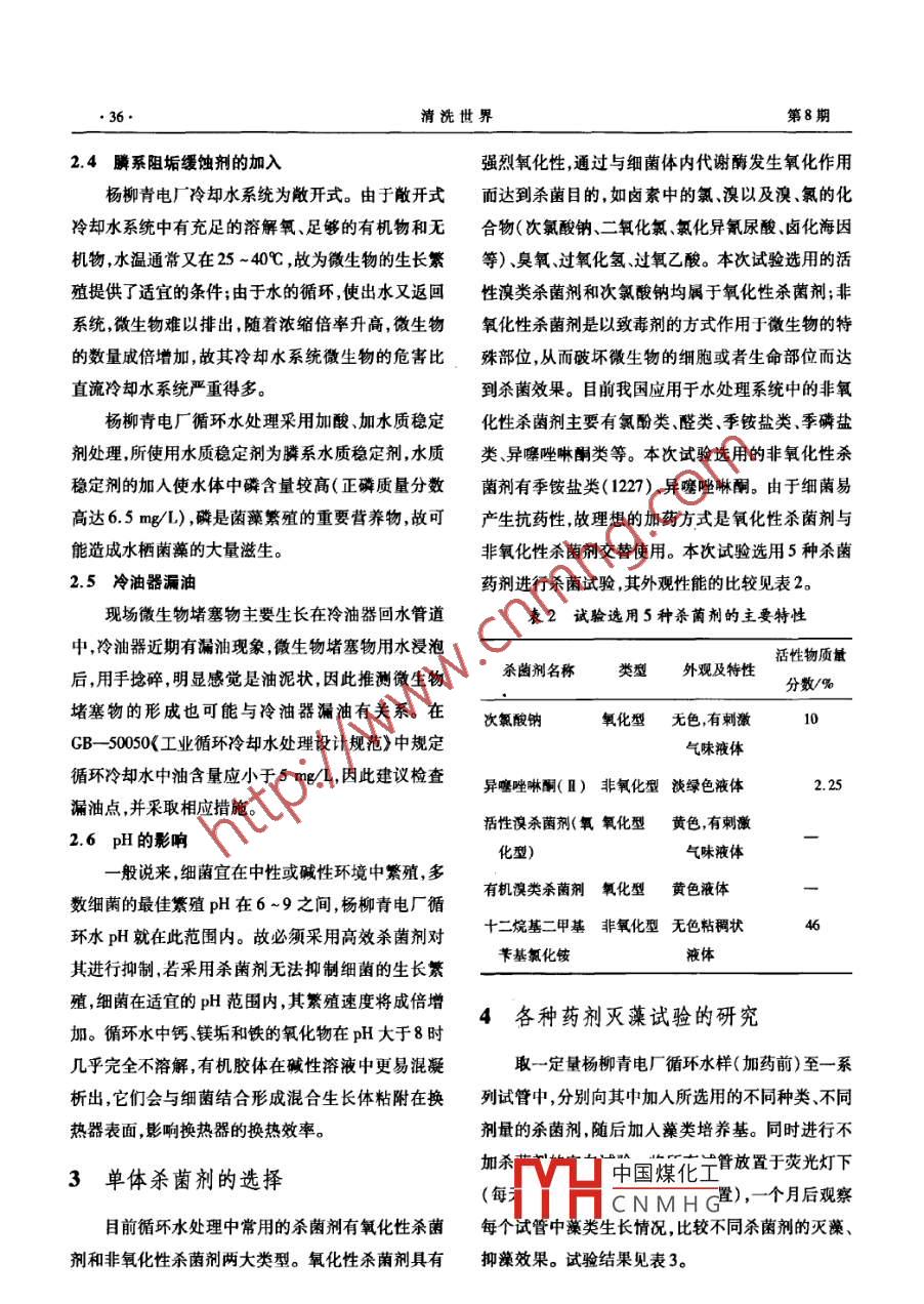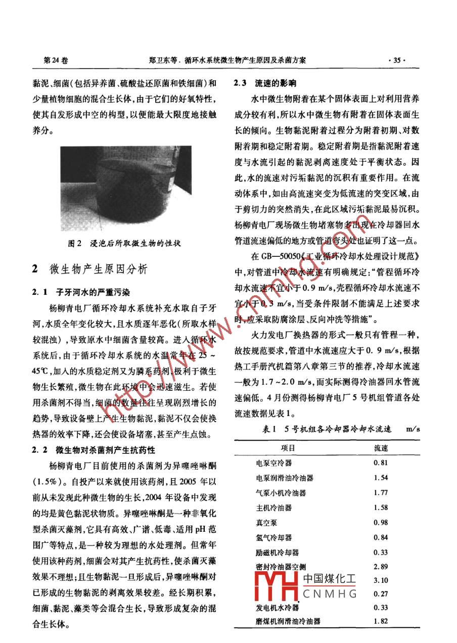 清洗世界第24卷第8期他山之石Cleaning World2008年8月文章編號:1671 - 8909(2008)08 -0034 -06循環(huán)水系統(tǒng)微生物產(chǎn)生原因及殺菌方案鄭衛(wèi)東'馮梅堂'田利2(1.華能楊柳青發(fā)電廠,天津300380; 2. 西安熱工研究院有限公司,陜西西安710032)商要:對楊柳青電廠循環(huán)水系統(tǒng)微生物堵塞物進行了菌種分析,并對微生物堵塞物形成的原因進行了探討,針對分析出的菌種(主要為異養(yǎng)菌)進行殺菌試驗,并提出了系統(tǒng)運行殺菌處理方案。關(guān)鍵詞:微生物;菌種分析;殺菌試驗中圖分類號:TQ 085*.4文獻標識碼:B楊柳青電廠地處天津市近郊,有2臺300 MW發(fā)電機組。該廠循環(huán)冷卻水系統(tǒng)補充水取自子牙1微生物種類的確定河,水質(zhì)全年變化較大,且逐年惡化。為節(jié)約用水、,管道微生物污堵情況示于圖1。堵物外觀呈黑降低水耗,循環(huán)水系統(tǒng)處理采用加酸.加水質(zhì)穩(wěn)定劑褐色絲 帶狀物集合生長體,經(jīng)水浸泡后,絲狀物變?yōu)樘幚?并采用1.5%的異噻唑啉酮進行殺菌處理,循中空的桿狀物,見圖2。用手輕捻泡開的桿狀物,立環(huán)冷卻水的排污水通過反滲透處理后回用,循環(huán)水即松散為油泥狀,未感覺有植物纖維,鏡檢(400倍)水質(zhì)有一定改善。全廠輔機設備用水均采用循環(huán)清楚地看到鐵細菌、寄生蟲卵和少量植物細胞。水,2006年5號機組小修設備解體后發(fā)現(xiàn),汽機側(cè)冷經(jīng)過顯微鏡鏡檢和細菌種類分析,堵塞物中含卻器回水部分管道(尤其是水平管道和管道的轉(zhuǎn)彎有大量的異養(yǎng)菌、硫酸鹽還原菌和鐵細菌,生物體為處)有微生物及黏泥堵塞現(xiàn)象。冷卻塔的分水槽內(nèi)也發(fā)現(xiàn)此類微生物。如果這一問題不解決,長期發(fā)展下去,微生物黏泥附著在管道中,會降低熱交換能力:同時,黏泥若不及時去除,日積月累會造成管道的堵塞及造成垢下微生物腐蝕等。西安熱工研究院有限公司和楊柳青電廠合作,對循環(huán)水系統(tǒng)微生物堵寨物進行了細菌種類鑒別試驗殺菌劑篩選及動態(tài)試驗,并提出了循環(huán)水殺菌滅圍1管道中微生物污 堵情況藻的處理方案。中國煤化工JYHCNMHG作者簡介:鄭衛(wèi)東( 1962 - )男,高工,現(xiàn)主要從事電廠技術(shù)管理工作。第24卷鄭衛(wèi)東等.循環(huán)水系統(tǒng)微生物產(chǎn)生原因及殺菌方案●35.黏泥、細菌(包括異養(yǎng)菌硫酸鹽還原菌和鐵細菌)和2.3 流速的影響少量植物細胞的混合生長體,由于它們的好氧特性,水中微生物附著在某個固體表面上對利用營養(yǎng)使其自發(fā)形成中空的構(gòu)型,以便能最大限度地接觸成分較有利,所以水中微生物有附著在固體表面生養(yǎng)分。長的傾向。生物黏泥附著過程分為附著初期、對數(shù)附著期和穩(wěn)定附著期。穩(wěn)定附著期是指黏泥附著速度與水流引起的黏泥剝離速度處于平衡狀態(tài)。因此,水的流速對污垢黏泥的沉積有重要作用。在流動體系中,如由高流速突變?yōu)榈土魉俚耐蛔儏^(qū)域,由于剪切力的突然消失,在此區(qū)域污垢黏泥最易沉積。楊柳青電廠現(xiàn)場微生物堵塞物多出現(xiàn)在冷卻器回水圖2浸泡后所取微 生物的性狀管道流速偏低的地方或管道彎頭處也證明了這一一點。在GB- -50050<工業(yè)循環(huán)冷卻水處理設計規(guī)范》2微生物產(chǎn)生原因分析中,對管道中冷卻水流速有明確規(guī)定:“管程循環(huán)冷卻水流速不宜小于0.9 m/s,殼程循環(huán)冷卻水流速不2.1子牙河水的嚴重污染楊柳青電廠循環(huán)冷卻水系統(tǒng)補充水取自子牙宜小于0.3 m/s,當受條件限制不能滿足上述要求河,水質(zhì)全年變化較大,且水質(zhì)逐年惡化(所取水樣時,應采取防腐涂層、反向沖洗等措施"。較混濁) ,導致原水中細菌含量較高。進入循環(huán)水火力發(fā)電廠換熱器的形式- -般只有管程一種,系統(tǒng)后,由于循環(huán)冷卻水系統(tǒng)的水溫常年在25 ~故按規(guī)范要求,管道中水流速應大于0.9 m/s,根據(jù)45C ,加人的水質(zhì)穩(wěn)定劑又為膦系藥劑,極利于微生熱工手冊汽機篇第八章第三節(jié)的推薦,冷卻水流速物生長繁殖,微生物在此環(huán)境中會迅速滋生。若使一般為1.7~2.0 m/s, 而實際測得冷油器回水管流用殺菌劑不得當,細菌的數(shù)量往往呈現(xiàn)劇烈增長的速偏低。4月份測得楊柳青電廠5號機組管道各處趨勢,導致設備壁上產(chǎn)生生物黏泥,黏泥不僅會使換流速數(shù)據(jù)見表1。表15 號機組各冷卻器冷卻水流速m/s熱器的效率下降,還會使設備堵塞,甚至產(chǎn)生點蝕。2.2微生物對殺菌劑產(chǎn)生抗藥性項目流速楊柳青電廠目前使用的殺菌劑為異噻唑啉酮,電泵空冷器0.81(1.5%)。自投產(chǎn)以來就使用該藥劑,且2005年以電泵潤滑油冷油器1.54前從未發(fā)現(xiàn)此種微生物的生長,2004年設備中發(fā)現(xiàn)氣泵小機冷油器1.77的均是黃色黏泥狀物質(zhì)。異噻唑啉酮是-種非氧化主機冷油器1.58型殺菌滅藻劑,它具有高效、廣譜、低毒、適用pH范真空泵0.98圍廣等特點,是一種較為理想的水處理劑。但常年氫氣冷卻器0.84勵磁機冷卻器0.33使用該種藥劑,細菌會對其產(chǎn)生抗藥性,使殺菌滅藻密封冷油器空側(cè)2.89效果不理想;且生物黏泥- -旦形成后,異噻唑啉酮對中國煤化工3. 10已形成的生物黏泥的剝離效果較差。經(jīng)長期積累,YHCNMHG0.
