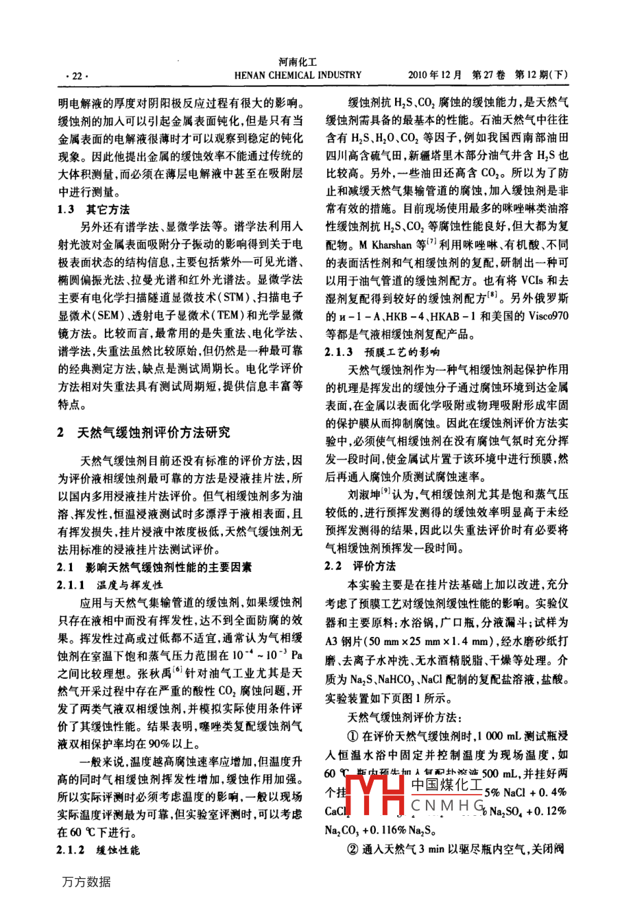 河南化工2010年12月第27卷第12期(下)HENAN CHEMICAL INDUSTRY天然氣緩蝕劑評價方法研究劉清云,高峰2,熊新民2,羅躍,趙豢娟(1長江大學化學與環(huán)境工程學院,湖北荊州434023;2塔里木油田分公司,新疆庫爾勒84000)【摘要】天然氣緩蝕劑目前還沒有標準的評價方瀆,大多用浸液掛片法評價;但油溶、揮發(fā)性的氣相緩蝕劑浸液測試時多瀮浮于液相表面,且揮發(fā)損失嚴重,掛片浸液中濃度極低,無法正確測試評價。本文揮討了天然氣緩蝕劑評價必須考慮的各種因素,例如溫度、濃度、揮發(fā)性、預膜工藝對緩蝕性能的彩響,以及抗H2SCO2等酸性氣體腐蝕的性能評價等問題。設計了天然氣緩蝕劑評價試驗裝置及評價方法。評價實際應用誣明該裝暹及評價方法能較好的反應緩蝕劑的性能差別?!娟P鍵詞】天然氣緩蝕劑;評價方法;失重法;電化學法【中圖分類號】TE644【文獻標識碼】A【文章編號】1003-3467(2010)24-0021-03石油天然氣中普遍含有H2、CO2等腐蝕性物失重法是一種可靠的直接測量方法,一直以來質,在集輸、儲運過程中常對管線設施造成嚴重的腐都被廣泛應用。除了直接用來評價、篩選緩蝕劑之蝕破壞,添加緩蝕劑是目前應用最普遍且經濟特效外,而且還被用來驗證其它測試方法的準確性。目的腐蝕抑制措施。對于天然氣集輸用緩蝕劑,大多前以失重法為基礎評價氣相緩蝕劑緩蝕性能的標準是易揮發(fā)的油溶性緩蝕劑,屬于氣相緩蝕劑。目前很多,如美軍標準Mil-85062、日本工業(yè)標準JlsZ并沒有用于天然氣緩蝕劑評測的國家標準,雖然評1519-1973、國內機械行業(yè)標準JB/T4050.2、價氣相緩蝕劑的方法很多,如20世紀50年代初美JB/T4051.2-99、JB/T6067-92、JB/T6071l國就頒布了氣相緩蝕劑和用氣相緩蝕劑處理過的多923。 W Skinner提出了新型評價方法“。其優(yōu)點種氣相緩蝕材料的軍用標準和聯(lián)邦標準,我國也于在于模擬大氣腐蝕狀態(tài)下氣相防銹劑的作用過程,20世紀80年代初參照國外先進標準開始制定和頒重現性好,能得到定量的結果。布相關部門的行業(yè)標準,對研究和發(fā)展氣相緩蝕劑萬紅敬改進實驗將傳統(tǒng)垂直掛片的方式改產品和技術起到了積極的推動作用,但是有關氣相為將試片在裝置頂部水平放置,使加熱揮發(fā)出的水緩蝕劑的性能評價測試儀器和方法,并不完全適應蒸氣均勻冷凝在試片表面減少引起試片銹蝕的偶天然氣集輸環(huán)境面臨的腐蝕問題測試周期也較長,然因素;將原來對裝置進行整體加熱改為只在裝置無法滿足現代化大生產的需要。研究一種全面評價底部加熱,試片水平位于燒杯頂部,使試片與電解質天然氣緩蝕劑性能的實用方法具有重要意義。溶液所在位置溫差較大,因此加熱揮發(fā)出的水蒸氣氣相緩蝕劑評價方法概述更容易冷凝在試片表面。改進后的方法與原方法相比,重現性好,試樣腐蝕形狀特征明顯,加速性好。緩蝕劑評價最經典的是失重法,此外還有電1.2電化學法化學方法譜學法顯微學等2,天然氣緩蝕劑一般電化學方法主要包括動電位極化曲線法、Tael是易揮發(fā)的油溶性緩蝕劑難溶于水相測試液,無法曲線外推法恒電量法和交流阻抗法(Es),主要通以標準的浸液掛片失重法評價,而且長時間恒溫時,過自腐蝕電位明陽極Tae斜率、自腐蝕電流極化氣相緩蝕劑大都揮發(fā),液相濃度很低,測試評價結果電阻和ES解析等電化學數據對緩蝕劑的電化學性極不準確。能進中國煤化工:和薄層法研究了1.1經典失重法CNMHG蝕機制。結果表收稿日期:2010-12-01作者簡介:劉清云(1964-),男副教授從事油田應用化學研究工作,E- mail: liu9845@sina,com。河南化工HENAN CHEMICAL INDUSTRY2010年12月第27卷第12期(下)明電解液的厚度對陰陽極反應過程有很大的影響。緩蝕劑抗H2S、CO2腐蝕的緩蝕能力是天然氣緩蝕劑的加入可以引起金屬表面鈍化,但是只有當緩蝕劑需具備的最基本的性能。石油天然氣中往往金屬表面的電解液很薄時才可以觀察到穩(wěn)定的鈍化含有H2S、H2O、CO2等因子,例如我國西南部油田現象。因此他提出金屬的緩蝕效率不能通過傳統(tǒng)的四川高含硫氣田,新疆塔里木部分油氣井含H2S也大體積測量,而必須在薄層電解液中甚至在吸附層比較高。另外,一些油田還高含CO2。所以為了防中進行測量。止和減緩天然氣集輸管道的腐蝕,加入緩蝕劑是非1.3其它方法常有效的措施。目前現場使用最多的咪唑啉類油溶另外還有譜學法、顯微學法等。譜學法利用人性緩蝕劑抗H2S、CO2等腐蝕性能良好,但大都為復射光波對金屬表面吸附分子振動的影響得到關于電配物。 M Kharshan等利用咪唑啉、有機酸、不同極表面狀態(tài)的結構信息,主要包括紫外—可見光譜、的表面活性劑和氣相緩蝕劑的復配,研制出一種可橢圓偏振光法拉曼光譜和紅外光譜法。顯傚學法以用于油氣管道的緩蝕劑配方。也有將Vs和去主要有電化學掃描隧道顯微技術(STM)掃描電子濕劑復配得到較好的緩蝕劑配方。另外俄羅斯顯微術(SEM)透射電子顯微術(TEM)和光學顯微的H-1-A、HKB-4、HKAB-1和美國的 Visco970鏡方法。比較而言最常用的是失重法電化學法、等都是氣液相緩蝕劑復配產品。譜學法失重法雖然比較原始但仍然是一種最可靠2.1.3預膜工藝的影響的經典測定方法,缺點是測試周期長。電化學評價天然氣緩蝕劑作為一種氣相緩蝕劑起保護作用方法相對失重法具有測試周期短,提供信息豐富