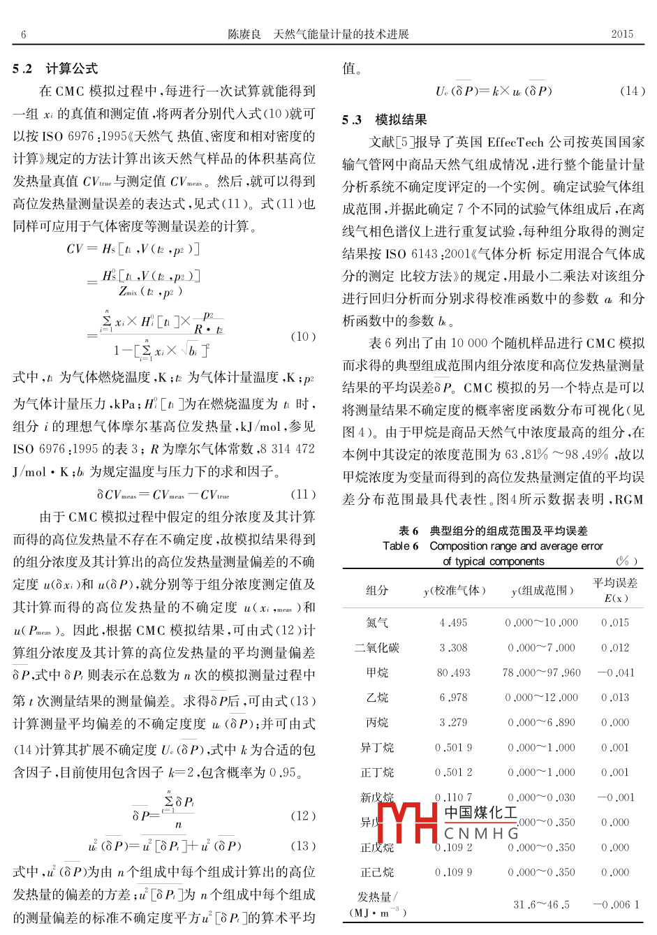 石油與天然氣化工第44卷第1期CHEMICAL ENGINEERING OF OIL gas本期我天然氣能量計量的技術(shù)進(jìn)展陳賡良中國石油西南油氣田公司天然氣研究院摘要我國自2008年底發(fā)布GB/T22723-2008《天然氣能量的測定》以來,開展了大量實(shí)驗(yàn)研究與現(xiàn)場測定工作,取得了一系列成果。但由于近年來國際上發(fā)布的一系列重要標(biāo)準(zhǔn)在我國尚未轉(zhuǎn)化并貫徹,故在溯源準(zhǔn)則建立、分析系統(tǒng)測量誤差及其不確定度評估,以及蒙特卡洛模擬及其在能量計量中的應(yīng)用等方面尚存在缺陷。最后對今后能量計量的技術(shù)開發(fā)提出了4點(diǎn)建議關(guān)鍵詞天然氣能量計量測量誤差分析偏差不確定度蒙特卡洛模擬中圖分類號:TE863.1文獻(xiàn)標(biāo)志碼:ADOI:10.3969ss.10073426.2015.01.001Progress of natural gas energy measurement technologyChen gengliang(Research Institute of Natural Gas TechnologyPetro China Southwest Oil Gasfield Company, Chengdu 610213, China)Abstract: Since GB/T 22723-2008 Energy Determination for Natural Gas was issued, a lot of laboratory researches and field tests have been developed as well as many scientific and technological achievements are acquired. Because a series of IsO and foreign advanced standards are not transformedso far, there are some flaws in our technological development of natural gas energy measurement system, such as establishing traceability guideline of natural gas analysis evaluating measurement errorand uncertainty for analysis system, and Monte-Carlo simulation for uncertainty evaluation. Foursuggestions about technological development in future are presenteKey words: natural gas, energy measurement, measurement error, analy tical bias, uncertainty,Monte- Carlo simulation發(fā)展背景確定度對能量結(jié)算有重大影響,且流量Q測定結(jié)果不天然氣能量計量過程中,分析系統(tǒng)的準(zhǔn)確性與確定度的影響也是同樣的。因此,進(jìn)人新世紀(jì)以來,國致性關(guān)系到巨大的經(jīng)濟(jì)利益。根據(jù)英國 EffecTech公際法制計量組織(OML)國際標(biāo)準(zhǔn)化組織天然氣技司估計,座規(guī)模為50MW的燃?xì)怆娬?當(dāng)電價為術(shù)委員會(SO/TC193)和氣體分析技術(shù)委員會0.06歐元W,h時,如果能量計量系統(tǒng)的擴(kuò)展不確S0TC158)分別發(fā)布或修訂了一系列重要標(biāo)準(zhǔn)。定度(U)為1%,對年產(chǎn)值的影響將達(dá)到270000歐例如,TH中國煤化工建議》(以下簡稱《國際元(見圖1)。根據(jù)天然氣供出能量計算公式E=H建議》CNMH⑤發(fā)熱量與沃泊指數(shù)的Q,不僅測定發(fā)熱量H的分析系統(tǒng)測量誤差及其不測定》、SO15796:2005《氣體分析分析偏差的調(diào)查和作者簡介:陳賡良(1940—),男,教授級高工。1961年畢業(yè)于山東大學(xué)化學(xué)系,原任中國石油西南油氣田公司天然氣研究院院長,現(xiàn)任全國天然氣標(biāo)準(zhǔn)化技術(shù)委員會顧問,已發(fā)表論文170余篇,專著8部。E- mail: Chengengliang@ petrochina,com.cr陳賡良天然氣能量計量的技術(shù)進(jìn)展2015處理》、ISO6974-2:2012《天然氣在一定不確定度下用評價與不確定度評價結(jié)合一體氣相色譜法測定組成第2部分:測量系統(tǒng)的特性和統(tǒng)(3)能量計量系統(tǒng)不確定度評定的核心問題是偏計》、IsO16664:2004《氣體分析校準(zhǔn)氣體及校準(zhǔn)氣體差型誤差分析與評定,且此類評定并非針對個別系統(tǒng)混合物的處理指南》與2012年發(fā)布的新版ⅠSO而是針對整個體系10723:2012《天然氣在線分析系統(tǒng)的性能評定》等。這(4)在測量模型不宜進(jìn)行線性近似的場合,以蒙些標(biāo)準(zhǔn)在大量工業(yè)實(shí)踐基礎(chǔ)上,對能量計量涉及測量特卡洛模擬法替代GUM法( ISO/IEC Guide98方法的溯源準(zhǔn)則、測定系統(tǒng)的操作性能評價、測定結(jié)果2008《測量不確定度表示指南》進(jìn)行不確定度評定。的誤差處理及不確定度評定等重大技術(shù)關(guān)鍵均作出了2計量系統(tǒng)的分級及其準(zhǔn)確度明確規(guī)定,并針對天然氣能量計量系統(tǒng)存在大量非線性輸入的特點(diǎn),規(guī)定了以概率密度傳播法(即蒙特卡洛國際法制計量組織發(fā)布的《國際建議》對天然氣計模擬, Monte Carlo simulation)評定整個系統(tǒng)不確定量系統(tǒng)的分級及其配置要求可以歸納為以下4個方度的原則與程序,從而奠定了按《國際建議》規(guī)定的以最大允許誤差(MPE)表示能量計量系統(tǒng)擴(kuò)展不確定(1)計量系統(tǒng)的分級:《國際建議》將天然氣計量度的技術(shù)基礎(chǔ)。當(dāng)前,國外正在根據(jù)本國具體情況試系統(tǒng)按準(zhǔn)確度分為A、B、C三個等級,每個等級的最驗(yàn)和/或驗(yàn)證上述國際標(biāo)準(zhǔn)中的有關(guān)要求與規(guī)定,并據(jù)大允許誤差(MPE)又分為能量計量及體積(或質(zhì)量)此制定或修訂本國天然氣能量計量的有關(guān)法規(guī)規(guī)范計量兩種情況(見表1)與標(biāo)準(zhǔn)表1計量系統(tǒng)的最大允許誤差(MPE)Table 1 MPE for measurement system4500.004500典型燃?xì)怆娬咀畲笤试S誤差(MPE)計量系統(tǒng)3500.00電量輸出:500MW電價:60歐元/Mw·hA級B級C級300.0025000能量計量系統(tǒng)轉(zhuǎn)換為體積計量轉(zhuǎn)換典型為質(zhì)量計量或直接進(jìn)±0.%±1.5%±2.0%6行質(zhì)量計量1000.00500.000.20.40.60.81.01.21.41.6(2)有關(guān)功能模塊的MPE:根據(jù)表1規(guī)定的MPEU(能量)/%要求,系統(tǒng)中各功