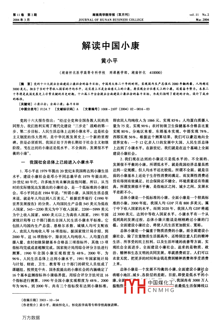 第ll卷第2期湖南商學(xué)院學(xué)報(bào)(雙月刊)2004年3月JOURNAL OF HUNAN BUSINESS COLLEGEMar.2004解讀中國小康黃小平(湖南懷化醫(yī)學(xué)高等??茖W(xué)校兩課教學(xué)部,湖南懷化418000)〔摘要〕黨的十六大提出全面建設(shè)小康社會(huì)的奮斗目標(biāo),中國用大體二十年的時(shí)間,實(shí)現(xiàn)國內(nèi)生產(chǎn)總值比2000年翻兩番,人均超過3000美元,相當(dāng)于當(dāng)時(shí)中等收入國家的平均水平。這實(shí)質(zhì)上不是全面意義上的小康,要實(shí)現(xiàn)全方位意義上的小康,還需奮斗努力。未來二十年將是我國發(fā)展史上非常關(guān)鍵的歷史時(shí)期。十六屆三中全會(huì)提出全面建設(shè)小康社會(huì)的奮斗目標(biāo),為我們指明了前進(jìn)的方向,設(shè)計(jì)了成功的路徑?!碴P(guān)鍵詞〕小康社會(huì);全面小康;奮斗目標(biāo)〔中圖分類號(hào)]F124.7〔文獻(xiàn)標(biāo)識(shí)碼〕A〔文章編號(hào)〕1008-2107(2004)02-0016-03黨的十六大報(bào)告指出:“經(jīng)過全黨和全國各族人民的共即農(nóng)民人均純收入為1066元,實(shí)現(xiàn)85%;人均蛋白質(zhì)攝入同努力,我們勝利實(shí)現(xiàn)了現(xiàn)代化建設(shè)‘三步走’戰(zhàn)略的第一量為75克,實(shí)現(xiàn)90%;農(nóng)村初級(jí)衛(wèi)生保健基本合格縣比重步、第二步目標(biāo),人民生活總體上達(dá)到小康水平。這是社會(huì)實(shí)現(xiàn)80%。分地區(qū)來看,東部基本實(shí)現(xiàn),中部實(shí)現(xiàn)78%,主義制度的偉大勝利,是中華民族發(fā)展史上一個(gè)新的里程西部實(shí)現(xiàn)56%。根據(jù)這個(gè)測算結(jié)果,我們可以豪邁地向全碑。但是必須看到,我國正處于并將長期處于社會(huì)主義初級(jí)世界宣布:一個(gè)12億多人口的發(fā)展中大國,人民生活總體階段,兜在達(dá)到的小康還是低水平、不全面的、發(fā)展很不平上達(dá)到了小康水平。在新世紀(jì),我們就是在這個(gè)基礎(chǔ)上全面衡的小康”。建設(shè)小康社會(huì)。2我們現(xiàn)在達(dá)到的小康還只是低水平的、不全面我國社會(huì)總體上已經(jīng)進(jìn)入小康水平發(fā)展很不平衡的小康。所謂低水平,就是我國經(jīng)濟(jì)總量雖然1.鄧小平在1979年提出20世紀(jì)末我國將達(dá)到小康生活達(dá)到一定規(guī)模,但人均水平還比較低。所謂不全面,就是目水平。建設(shè)小康社會(huì)是鄧小平同志最早在1979年提出的。前的小康基本上還處于生存性消費(fèi)的滿足,而發(fā)展性消費(fèi)還20世紀(jì)80年代,許多地方尚未解決溫飽問題,所以,從當(dāng)沒有得到有效滿足,社會(huì)保險(xiǎn)還不健全,環(huán)境質(zhì)量還有待提時(shí)的實(shí)際情況出發(fā)提出的小康社會(huì),是一個(gè)低標(biāo)準(zhǔn)的小康社高。所謂發(fā)展很不平衡,是指地區(qū)之間、城鄉(xiāng)之間,發(fā)展水會(huì)。鄧小平同志在1984年說:“所謂小康,從國民生活總值平差距不小。來說,就是年人均達(dá)到八百美元?!备鶕?jù)世界銀行《1990年總體小康是一個(gè)低標(biāo)準(zhǔn)的小康,全面小康是一個(gè)較高標(biāo)世界發(fā)展報(bào)告》的分類,人均國民生產(chǎn)總值545美元為低收準(zhǔn)的小康。200年底,我國人均GDP只有800多美元,屬入國家,545220美元為中下收入國家,200599美元于中下收入國家的水平。面到2020年,我國人均GDP將超為中上收入國家,6000美元以上為高收入國家。191年國過3000美元,達(dá)到中等收人國家水平。小康水平有一個(gè)從家統(tǒng)計(jì)局等12個(gè)部門提出全國人民生活小康水平標(biāo)準(zhǔn)。它低到高的發(fā)展過程,總體小康只能說是剛剛跨過小康的門包括人均國內(nèi)生產(chǎn)總值、恩格爾系數(shù)、城鎮(zhèn)人均可支配收檻。全面建設(shè)小康社會(huì),將使人民生活更加殷實(shí)、寬裕入、農(nóng)民人均純收入等16項(xiàng)指標(biāo)。據(jù)國家統(tǒng)計(jì)局介紹,到總體小康是一個(gè)偏重于物質(zhì)消費(fèi)的小康。而全面建設(shè)小2000年,這16項(xiàng)指標(biāo)中,除農(nóng)民人均純收入、人均蛋白質(zhì)康社會(huì),除了注重物質(zhì)生活提高外,還特別注意人們的精神攝入量、農(nóng)村初級(jí)保健基本合格縣三項(xiàng)指標(biāo)外,其他13項(xiàng)生活、所享受的民主權(quán)利,以及生活環(huán)境的改善等方面,實(shí)指標(biāo)均完成或者超額完成。國家統(tǒng)計(jì)局用綜合評(píng)分方法進(jìn)行現(xiàn)社會(huì)全面進(jìn)步。全面建設(shè)小康社會(huì),追求的是物質(zhì)、政測算,1990年全國小康實(shí)現(xiàn)程度為48%。2000年,為治、精神和生態(tài)文明的共同發(fā)展。單就消費(fèi)而言,人們可以96%,人民生活總體上達(dá)到小康水平。1991年國家統(tǒng)計(jì)局衣食無憂,把更多的時(shí)間和金錢花費(fèi)到精神消費(fèi)和享受消費(fèi)與計(jì)劃、財(cái)政、衛(wèi)生、教育等12個(gè)部門的研究人員組成了上來課題組,按照黨中央、國務(wù)院提出的小康社會(huì)的內(nèi)涵確定了總體小康是一個(gè)發(fā)展不均衡的小康全面建設(shè)小康社會(huì)16個(gè)基本監(jiān)測指標(biāo)和小康臨界值。用綜合評(píng)分方法對(duì)這16將縮小地區(qū)、城鄉(xiāng)、各階層的差距。目前,即使是低水平的小個(gè)指標(biāo)進(jìn)行測算,19