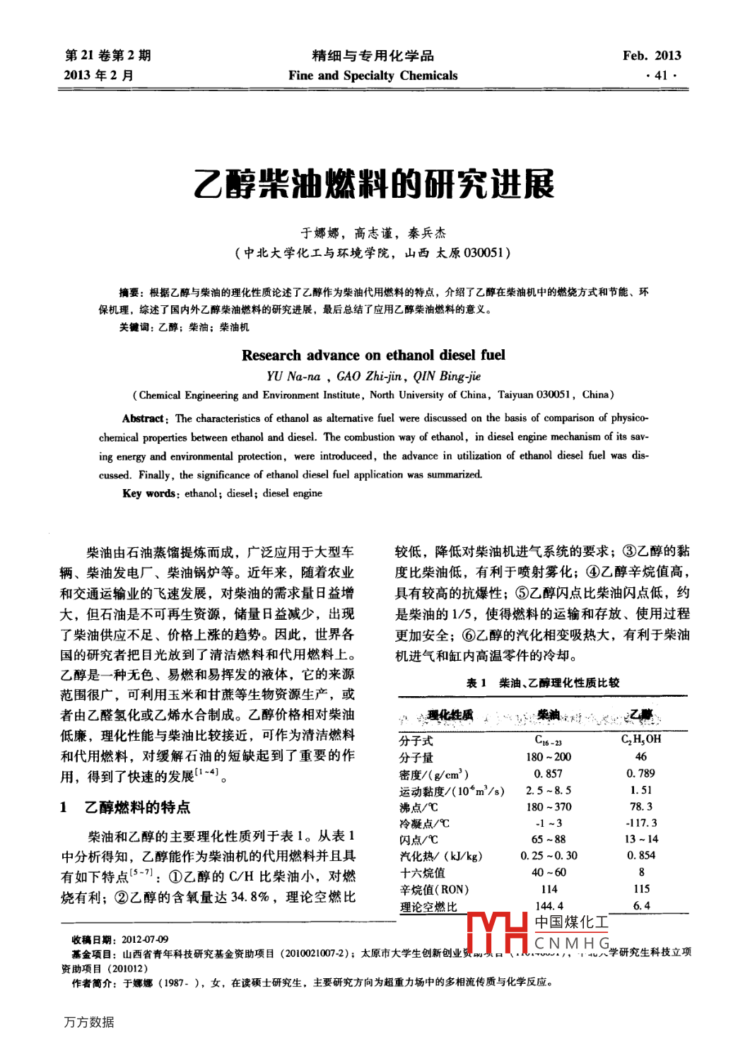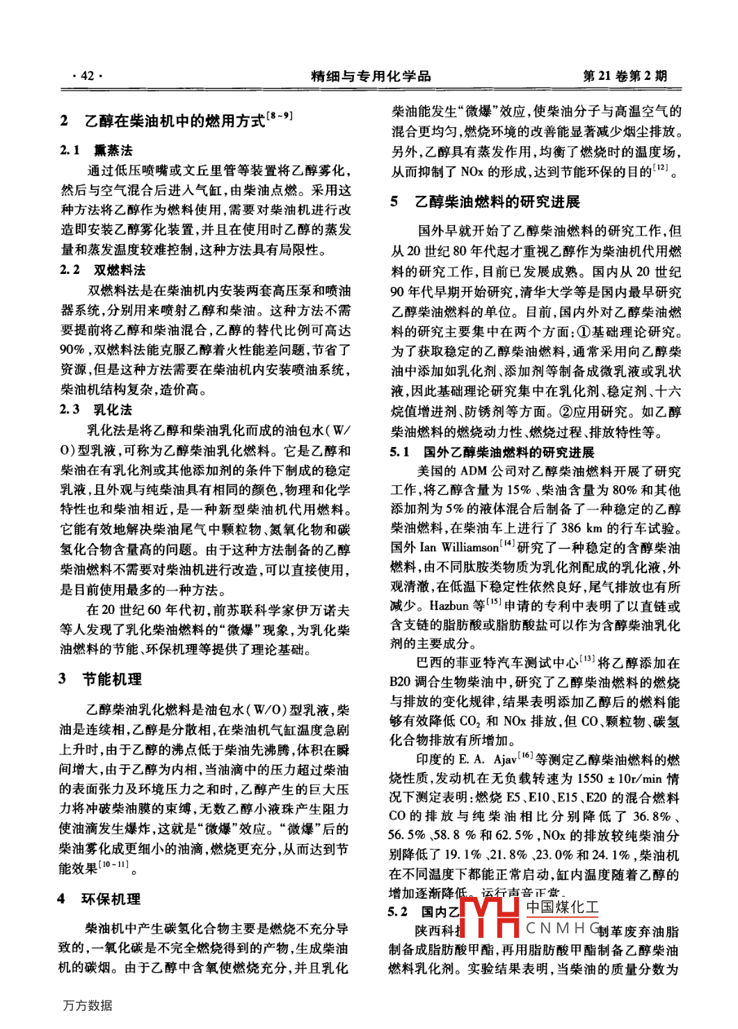 第21卷第2期精細(xì)與專用化學(xué)品Feb.20132013年2月Fine and Specialty Chemicals乙醇柴油燃料的研究進(jìn)展于娜娜,高志謹(jǐn),秦兵杰(中北大學(xué)化工與環(huán)境學(xué)院,山西太原030051)摘要:根據(jù)乙醇與柴油的理化性質(zhì)論述了乙醇作為柴油代用燃料的特點,介紹了乙醇在柴油機中的燃燒方式和節(jié)能、環(huán)保機理,綜述了國內(nèi)外乙醇柴油燃料的研究進(jìn)展,最后總結(jié)了應(yīng)用乙醇柴油燃料的意義關(guān)鍵詞:乙醇;柴油;柴油機Research advance on ethanol diesel fuelYU Na-na, GAO Zhi-jin, QIN Bing-jieChemical Engineering and Environment Institute, North University of China, Taiyuan 030051, China)Abstract: The characteristics of ethanol as altermative fuel were discussed on the basis of comparison of physico-chemical properties between ethanol and diesel. The combustion way of ethanol, in diesel engine mechanism of its sav-ing energy and environmental protection, were introduceed, the advance in utilization of ethanol diesel fuel wascussed. Finally, the significance of ethanol diesel fuel application was summarized.Key words: ethanol; diesel; diesel engine柴油由石油蒸餾提煉而成,廣泛應(yīng)用于大型車較低,降低對柴油機進(jìn)氣系統(tǒng)的要求;③乙醇的黏輛、柴油發(fā)電廠、柴油鍋爐等。近年來,隨著農(nóng)業(yè)度比柴油低,有利于噴射霧化;④乙醇辛烷值高,和交通運輸業(yè)的飛速發(fā)展,對柴油的需求量日益增具有較高的抗爆性;⑤乙醇閃點比柴油閃點低,約大,但石油是不可再生資源,儲量日益減少,出現(xiàn)是柴油的1/5,使得燃料的運輸和存放、使用過程了柴油供應(yīng)不足、價格上漲的趨勢。因此,世界各更加安全;⑥乙醇的汽化相變吸熱大,有利于柴油國的研究者把目光放到了清潔燃料和代用燃料上。機進(jìn)氣和缸內(nèi)高溫零件的冷卻。乙醇是一種無色、易燃和易揮發(fā)的液體,它的來源表1柴油、乙醇理化性質(zhì)比較范圍很廣,可利用玉米和甘蔗等生物資源生產(chǎn),或者由乙醛氫化或乙烯水合制成。乙醇價格相對柴油理化姓質(zhì)1:柴油:對還低廉,理化性能與柴油比較接近,可作為清潔燃料分子式CrHSOH和代用燃料,對緩解石油的短缺起到了重要的作分子量180~200用,得到了快速的發(fā)展4。密度/(g/cm3)0.857運動黏度/(10m3/s)2.5~8.5乙醇燃料的特點沸點/℃180~370冷凝點/℃1~3117.3柴油和乙醇的主要理化性質(zhì)列于表1。從表1閃點/℃13-14中分析得知,乙醇能作為柴油機的代用燃料并且具汽化熱/(k/kg)0.25~0.30有如下特點”:①乙醇的C/H比柴油小,對燃十六烷值40≈60燒有利;②乙醇的含氧量達(dá)34.8%,理論空燃比辛烷值(RON)理論空燃比144.4中國煤化工收稿日期:201207-09CNMHG基金項目:山西省青年科技研究基金資助項目(2010021007-2);太原市大學(xué)生創(chuàng)新創(chuàng)業(yè),心八學(xué)研究生科技立項資助項目(201012)作者簡介:于娜娜(1987-),女,在讀碩士研究生,主要研究方向為超重力場中的多相流傳質(zhì)與化學(xué)反應(yīng)。42精細(xì)與專用化學(xué)品第21卷第2期2乙醇在柴油機中的燃用方式8-”柴油能發(fā)生“微爆”效應(yīng),使柴油分子與高溫空氣的混合更均勻,燃燒環(huán)境的改善能顯著減少煙塵排放。2.1黛蒸法另外,乙醇具有蒸發(fā)作用,均衡了燃燒時的溫度場,通過低壓噴嘴或文丘里管等裝置將乙醇霧化,從而抑制了NOx的形成,達(dá)到節(jié)能環(huán)保的目的121。然后與空氣混合后進(jìn)入氣缸,由柴油點燃。采用這種方法將乙醇作為燃料使用,需要對柴油機進(jìn)行改5乙醇柴油燃料的研究進(jìn)展造即安裝乙醇霧化裝置,并且在使用時乙醇的蒸發(fā)國外早就開始了乙醇柴油燃料的研究工作,但量和蒸發(fā)溫度較難控制,這種方法具有局限性。從20世紀(jì)80年代起才重視乙醇作為柴油機代用燃2.2雙燃料法料的研究工作,目前已發(fā)展成熟。國內(nèi)從20世紀(jì)雙燃料法是在柴油機內(nèi)安裝兩套高壓泵和噴油90年代早期開始研究,清華大學(xué)等是國內(nèi)最早研究器系統(tǒng),分別用來噴射乙醇和柴油。這種方法不需乙醇柴油燃料的單位。目前,國內(nèi)外對乙醇柴油燃要提前將乙醇和柴油混合,乙醇的替代比例可高達(dá)料的研究主要集中在兩個方面:①基礎(chǔ)理論研究。90%,雙燃料法能克服乙醇著火性能差問題,節(jié)省了為了獲取穩(wěn)定的乙醇柴油燃料,通常采用向乙醇柴資源,但是這種方法需要在柴油機內(nèi)安裝噴油系統(tǒng),油中添加如乳化劑添加劑等制備成微乳液或乳狀柴油機結(jié)構(gòu)復(fù)雜,造價高。液,因此基礎(chǔ)理論研究集中在乳化劑、穩(wěn)定劑、十六2.3乳化法烷值增進(jìn)劑、防銹劑等方面。②應(yīng)用研究。如乙醇乳化法是將乙醇和柴油乳化而成的油包水(W/柴油燃料的燃燒動力性燃燒過程排放特性等。O)型乳液,可稱為乙醇柴油乳化燃料。它是乙醇和5.1國外乙醇柴油燃料的研究進(jìn)展柴油在有乳化劑或其他添加劑的條件下制成的穩(wěn)定美國的ADM公司對乙醇柴油燃料開展了研究乳液,且外觀與純柴油具有相同的顏色,物理和化學(xué)工作,將乙醇含量為15%、柴油含量為80%和其他特性也和柴油相近,是一種新型柴油機代用燃料。添加劑為5%的液體混合后制備了一種穩(wěn)定的乙醇它能有效地解決柴油尾氣中顆粒物、氮氧化物和碳柴油燃料,在柴油車上進(jìn)行了386km的行車試驗。氫化合物含量