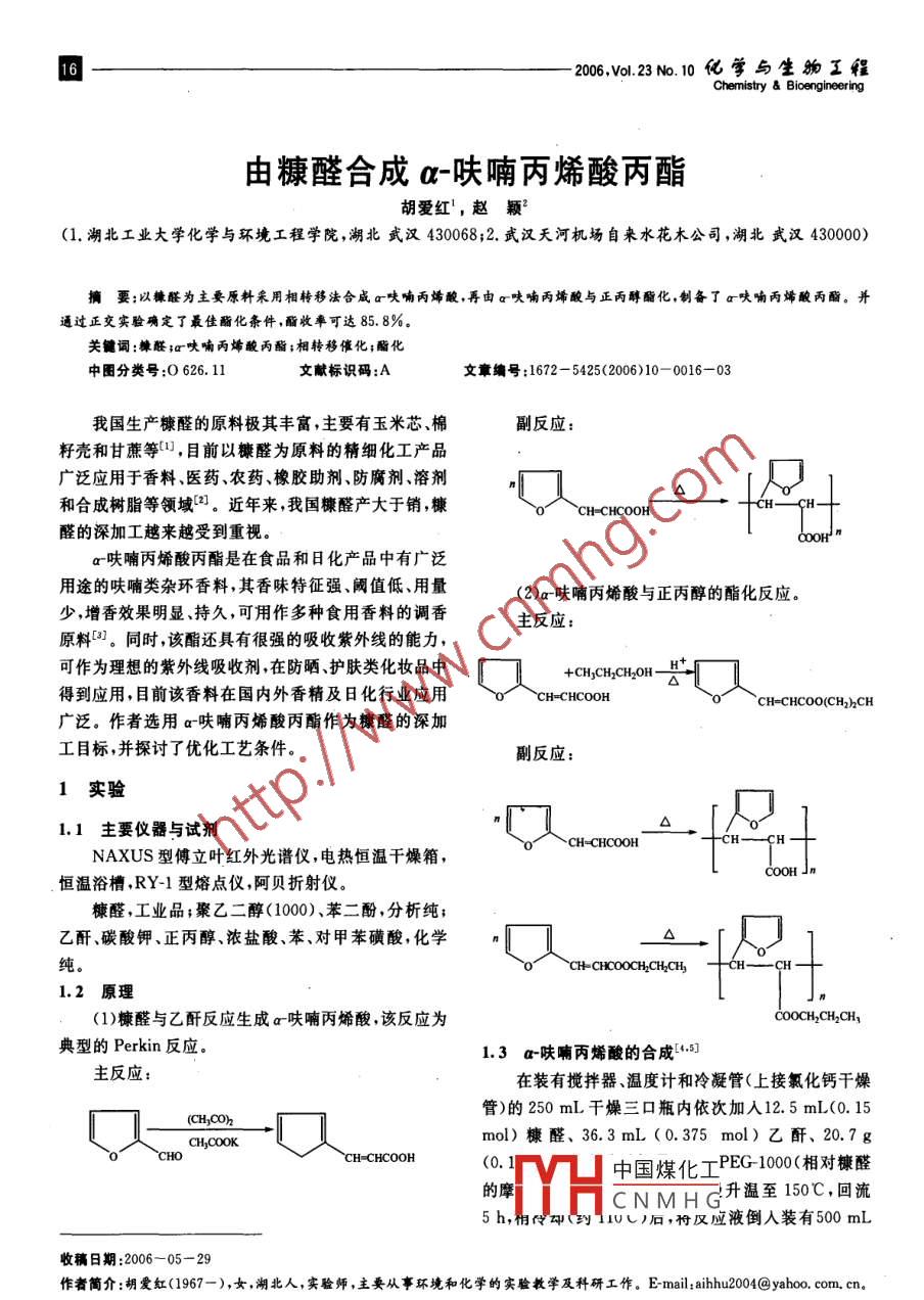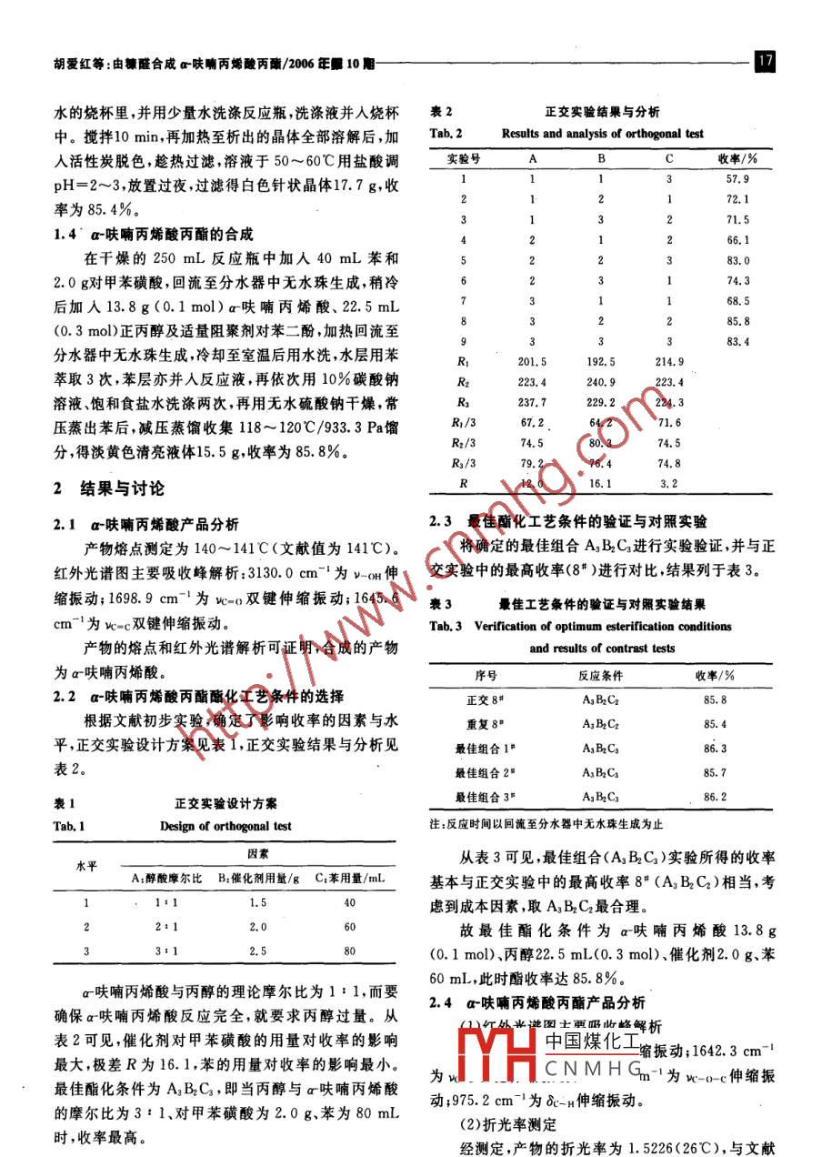 200v423№.10化學與生物工Chemistry Bioengineering由糠醛合成a-呋喃丙烯酸丙酯胡愛紅,趙穎(1.湖北工業(yè)大學化學與環(huán)境工程學院,湖北武漢430068;2.武漢天河機場自來水花木公司,湖北武漢430000要:以糠醛為主要原料采用相轉移法合威α呋喃丙烯酸,再由α呋喃丙烯酸與正丙醇酯化,制備了a呋喃丙烯酸丙酯。并通過正交實驗確定了最佳酯化條件,酯收率可達85.8%關鍵詞:糠醛;a呋喃丙烯酸丙酯;相轉移催化;酯化中圖分類號:0626.11文獻標識碼:A文章編號:1672-5425(2006我國生產糠醛的原料極其豐富,主要有玉米芯、棉副反應:籽殼和甘蔗等1,目前以糠醛為原料的精細化工產品廣泛應用于香料、醫(yī)藥、農藥、橡膠助劑、防腐劑、溶劑和合成樹脂等領域21。近年來我國糠醛產大于銷,糠醛的深加工越來越受到重視。COoa呋喃丙烯酸丙酯是在食品和日化產品中有廣泛用途的呋喃類雜環(huán)香料,其香味特征強、閾值低、用量(2)a呋喃丙烯酸與正丙醇的酯化反應少,增香效果明顯、持久,可用作多種食用香料的調香主反應:原料。同時,該酯還具有很強的吸收紫外線的能力,可作為理想的紫外線吸收劑,在防曬、護膚類化妝品中+CHCH CH2OH得到應用,目前該香料在國內外香精及日化行業(yè)應用CH=CHCOO(CH,hCH廣泛。作者選用a呋喃丙烯酸丙酯作為糠醛的深加工目標,并探討了優(yōu)化工藝條件副反應:實驗1.1主要儀器與試劑CH=CHCOOHNAXUS型傅立葉紅外光譜儀,電熱恒溫干燥箱,CoOH」n恒溫浴槽,RY-1型熔點儀,阿貝折射儀。糠醛,工業(yè)品;聚乙二醇(1000)、苯二酚,分析純;乙酐碳酸鉀、正丙醇濃鹽酸苯對甲苯磺酸化學·[人純CHCHCOOCH2 CH CH,1.2原理(1)糠醛與乙酐反應生成a呋喃丙烯酸,該反應為COOCH,CH2 CH,典型的 Perkin反應1.3a呋喃丙烯酸的合成{主反應:在裝有攪拌器溫度計和冷凝管(上接氯化鈣干燥〔又s管)的250mL干燥三口瓶內依次加入12.5mL(0.15mol)糠醛、36.3mL(0.375mol)乙酐、20.7gCH-CHCOOH(0中國煤化工PG1008對糠醛的摩CNMHG升溫至150℃,回流UL丿后,及應液倒入裝有500mL收稿日期:2006-05-29作者簡介:胡愛紅(1967一),女,湖北人,實驗師,主要從事環(huán)境和化學的實驗教學及科研工作。E-mail:ainu2004@yahoo.com.cn胡愛紅等:由幕醛合成a呋喃丙烯酸丙/2006年10水的燒杯里,并用少量水洗滌反應瓶,洗滌液并入燒杯表2正交實驗結果與分析中。攪拌10min,再加熱至析出的晶體全部溶解后,加Ta2 Results and analysis of orthogonal test人活性炭脫色,趁熱過濾,溶液于50~60℃用鹽酸調實驗號C收率/%pH=2~3,放置過夜,過濾得白色針狀晶體17.7g,收57.9率為85.4%71.51.4a呋喃丙烯酸丙酯的合成31223在干燥的250mL反應瓶中加人40mL苯和83.02.0g對甲苯磺酸,回流至分水器中無水珠生成,稍冷4567后加人13.8g(0.1mol)a呋喃丙烯酸、2.5mL(0.3mol)正丙醇及適量阻聚劑對苯二酚,加熱回流至222333112385.883.4分水器中無水珠生成冷卻至室溫后用水洗,水層用苯9RRR192.5214.9萃取3次,苯層亦并入反應液,再依次用10%碳酸鈉240.9223.4溶液、飽和食鹽水洗滌兩次,再用無水硫酸鈉干燥,常237.7224.3壓蒸出苯后,減壓蒸餾收集118~120℃/933.3Pa餾R1/367.2分,得淡黃色清亮液體15.5g收率為85.8%R2/374.52結果與討論2.1a呋喃丙烯酸產品分析2.3最佳酯化工藝條件的驗證與對照實驗物熔點測定為140~141C(文獻值為141℃)。將確定的最佳組合A3B2C3進行實驗驗證,并與正紅外光譜圖主要吸收峰解析:3130.0cm-為v-o伸交實驗中的最高收率(84)進行對比結果列于表3縮振動;16989cm-為-雙鍵伸縮振動;1645.6裹最佳工藝條件的驗證與對照實驗結果cm-1為w=c雙鍵伸縮振動。Tab 3 Verification of optimum esterification conditions產物的熔點和紅外光譜解析可證明,合成的產物and results of contrast tests為a呋喃丙烯酸。序號反應條件收率/%2.2a-呋喃丙烯酸丙酯酯化工藝條件的選擇正交8甲A3 B, Cu根據文獻初步實驗,確定了影響收率的因素與水重復8A3 B2 C平,正交實驗設計方案見表1,正交實驗結果與分析見最A3 BC3表2。最佳組合2A3 BaC正交實驗設計方案最佳組合3AsBC86.2Tab. 1Design of orthogonal test注:反應時間以回流至分水器中無水珠生成為止水平從表3可見,最佳組合(A3B2C3)實驗所得的收率A:醉酸摩爾比B:催化劑用量/gC:苯用量/mL基本與正交實驗中的最高收率8“(A3B2C2)相當,考慮到成本因素,取A3B2C2最合理故最佳酯化條件為a呋喃丙烯酸13.8g3:1(0.1mol)丙醇22.5mL(0.3mol)、催化劑2.0g、苯60mL,此時酯收率達85.8%a呋喃丙烯酸與丙醇的理論摩爾比為1:1,而要確保α呋喃丙烯酸反應完全就要求丙醇過量。從2.4a呋喃丙烯酸丙酯產品分析謹圓主曲峰解析表2可見,催化劑對甲苯磺酸的用量對收率的影響中國煤化工縮振動;1642.3cm-1最大,極差R為16.1,苯的用量對收率的影響最小。最佳酯化條件為ABC,即當丙醇與a呋喃丙烯酸為wCNMH為w-0c伸縮振的摩爾比為3:1、對甲苯磺酸為2.0g、苯為80mL動;975.2cm-1為8c-H伸縮振動時,收率最高(2)折光率測定經測定,產物的折光率為1.5226(26℃),與文獻胡愛紅等:由糠醛合成c呋喃丙烯酸丙酯/2006E■10值1.5229(20℃)基本相符。60mL,此時酯收率達85.8%(3)沸點測定參考文獻在9333Pa下測定沸點為119℃,與文獻值一致。[1]李美松,馬文展,以糠醛為原料的精細化工產品開發(fā)與應用進展產物的紅外光譜、折光率及沸點分析可證明,合成[J].湖北化工,1999,16(6):68.的產物就是a呋喃丙烯酸丙酯。[2]王修然,周虹屏,葉鐘文等.田糠醛合成a呋哺丙烯酸[J安徽師范大學學報(自然科學版),1999,22(4):345-3463結論[3]徐克勛精細